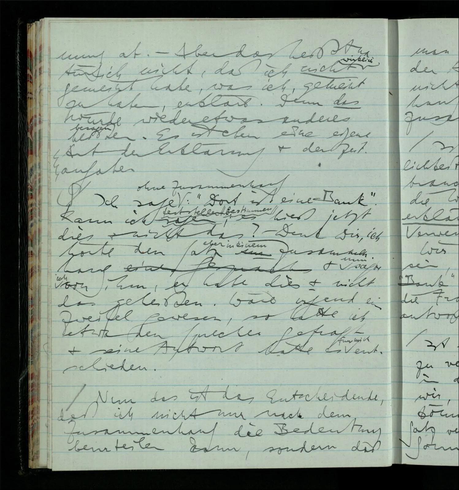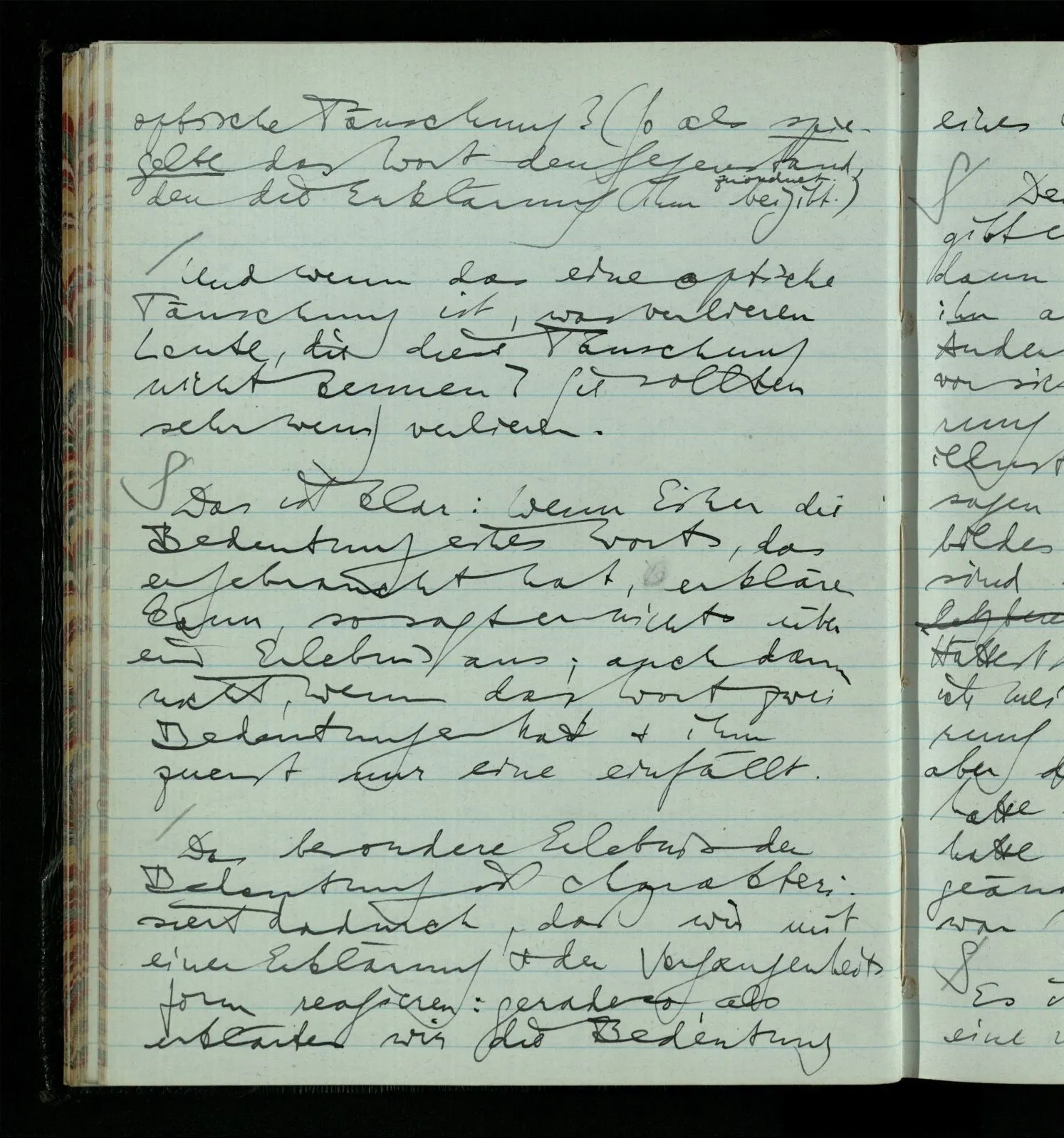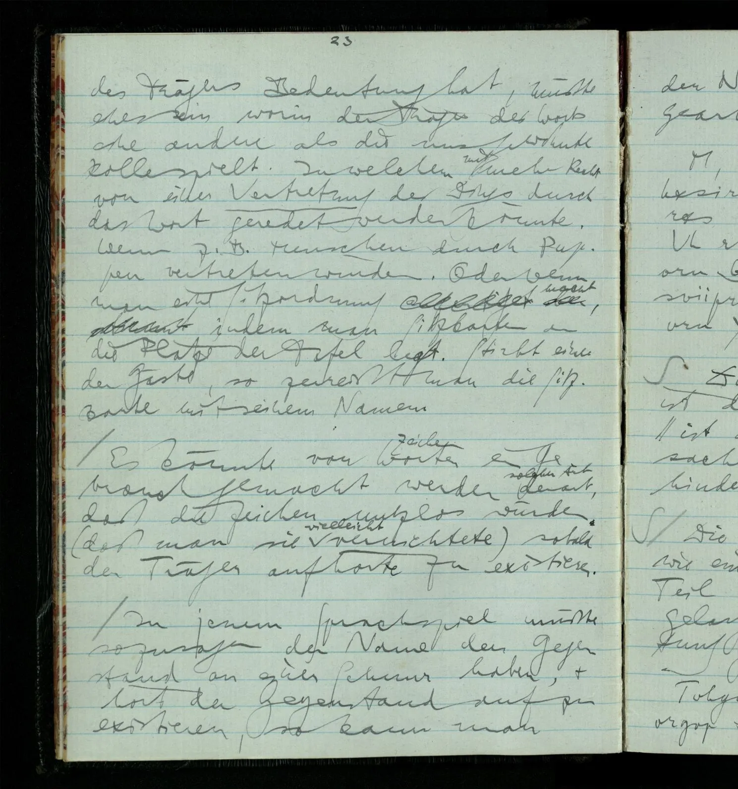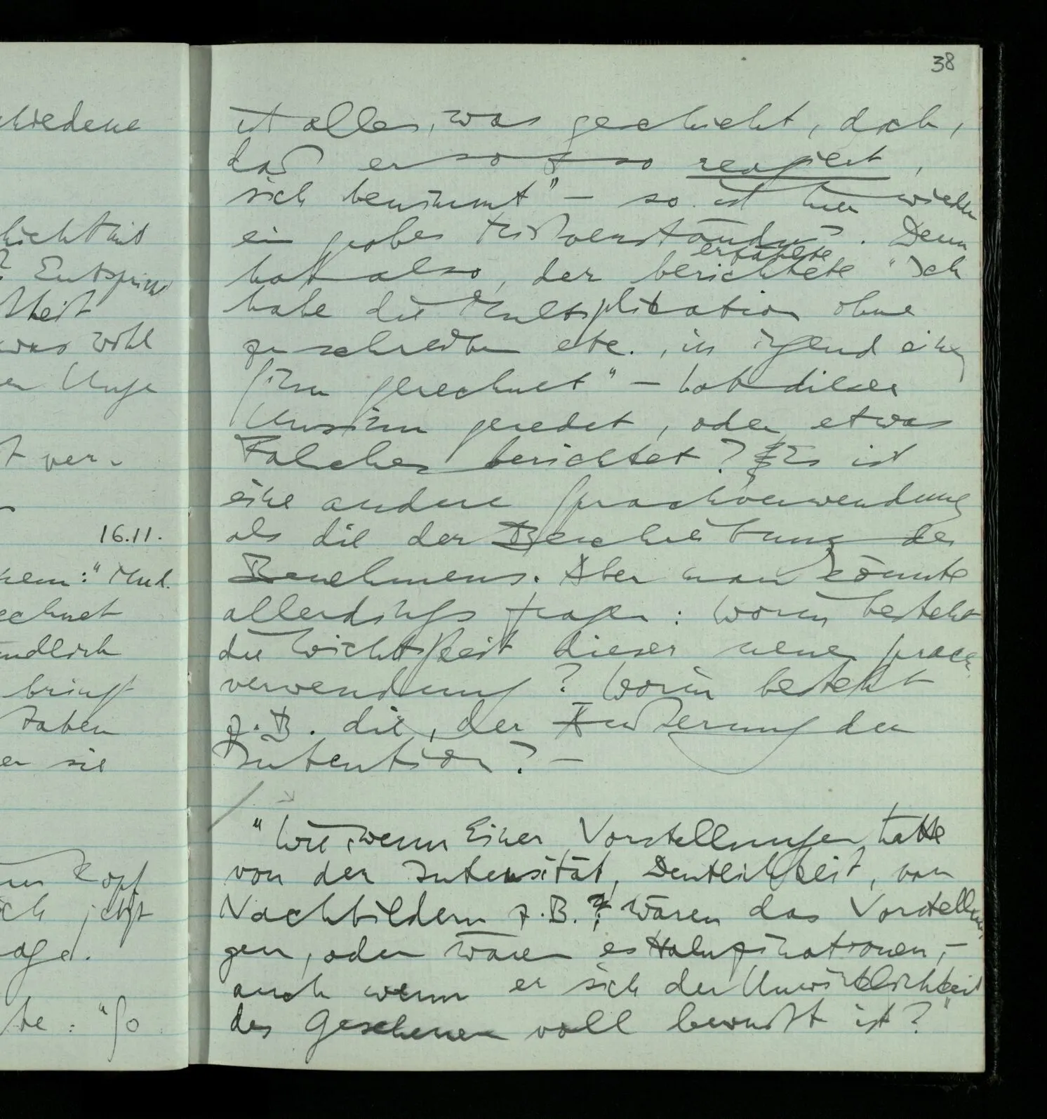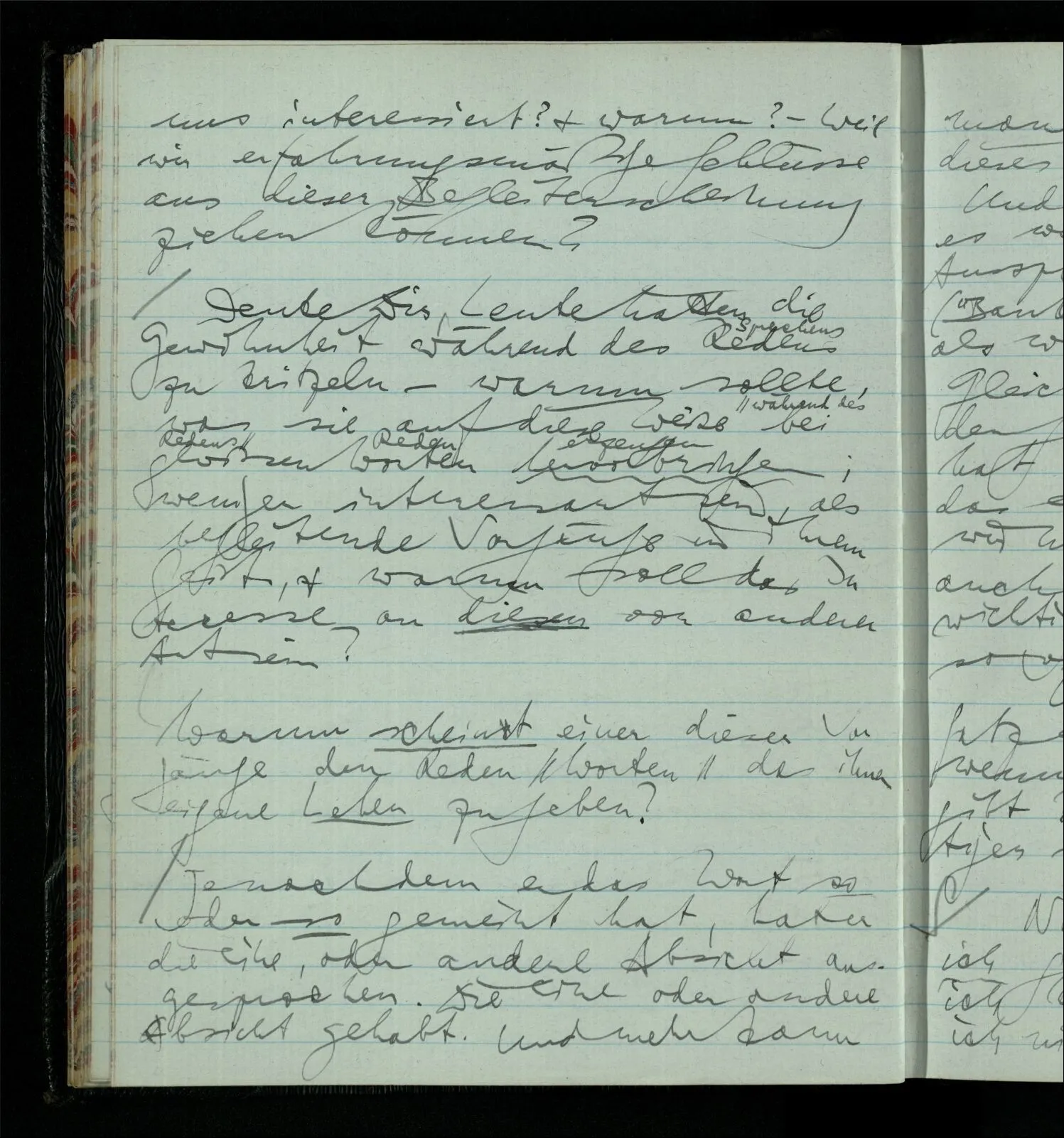 “Der Mensch ist im Stande, in voller Abgeschlossenheit mit sich selbst zu reden; in einer Isolierung, die weit vollkommener ist, als jede körperliche Isolierung.” Wie weiß ich, daß dem N. dies gegeben ist? – Weil er’s sagt & zuverlässig ist? – Und doch sagen wir: “Ich wüßte gerne, was er jetzt bei sich denkt”; ganz so, wie wir sagen könnten: “Ich wüßte gerne, was er jetzt in sein Notizbuch schreibt”. Ja, man könnte eben das sagen & es, sozusagen, als selbstverständlich ansehen, daß er bei sich das denkt, was er in’s