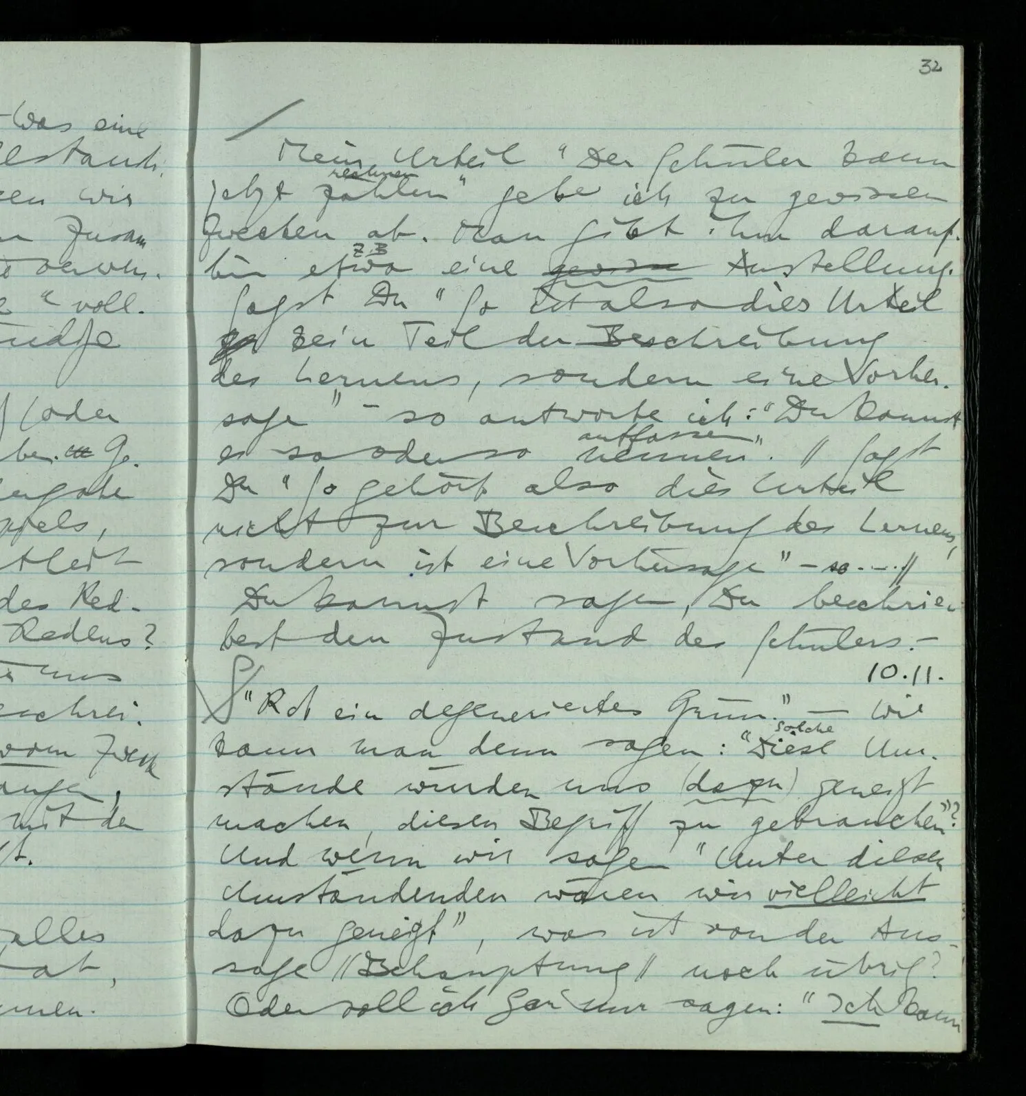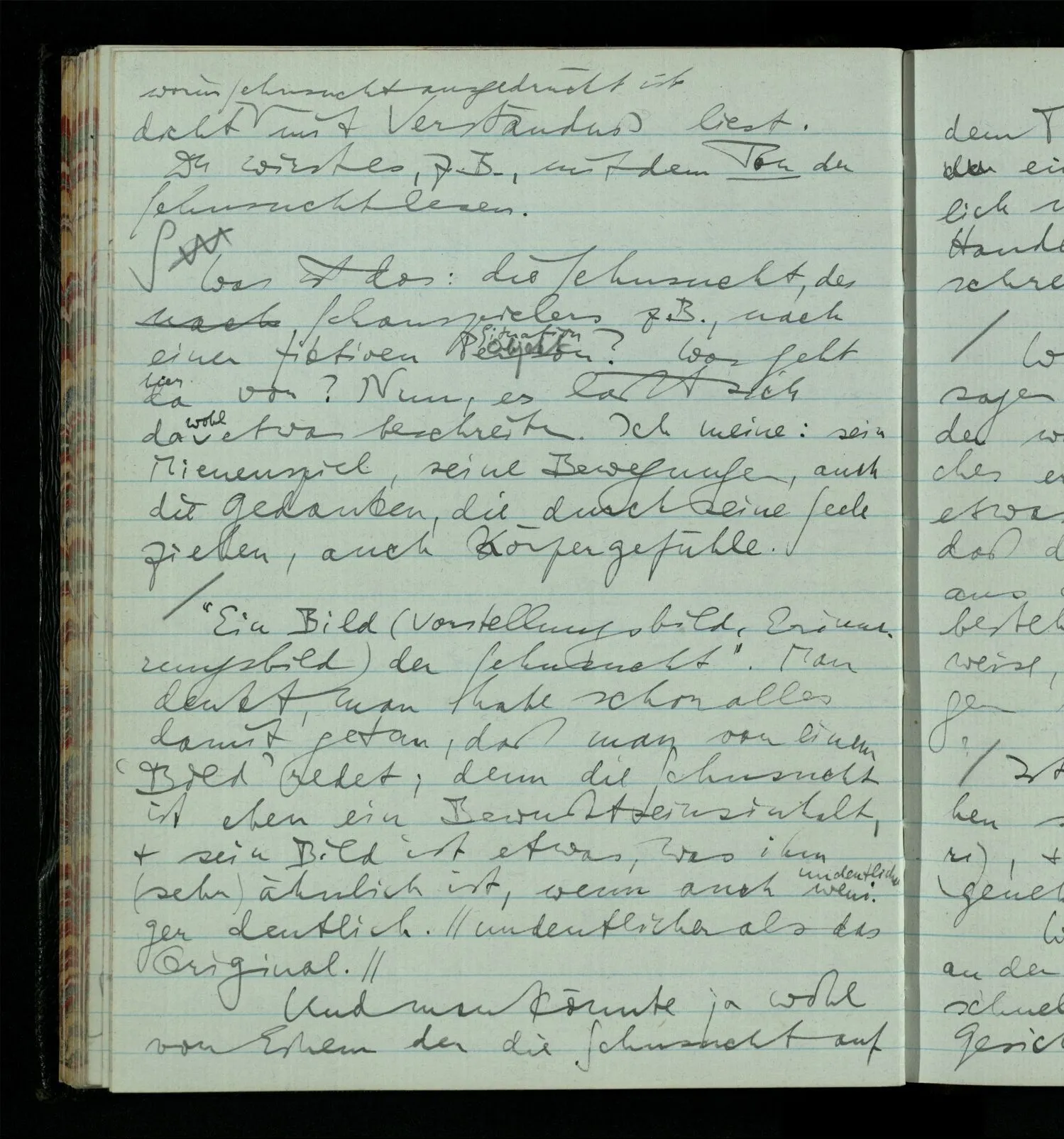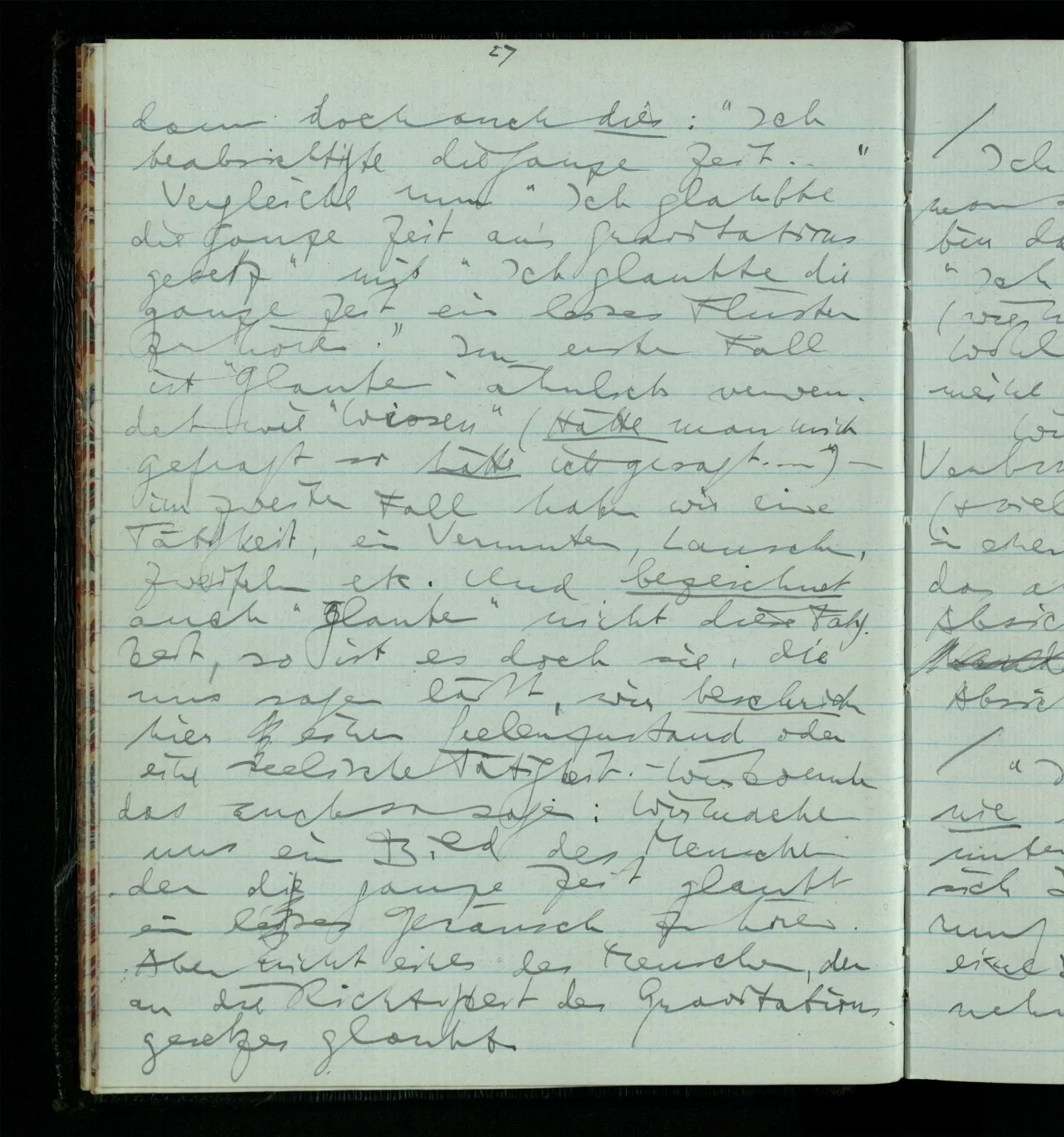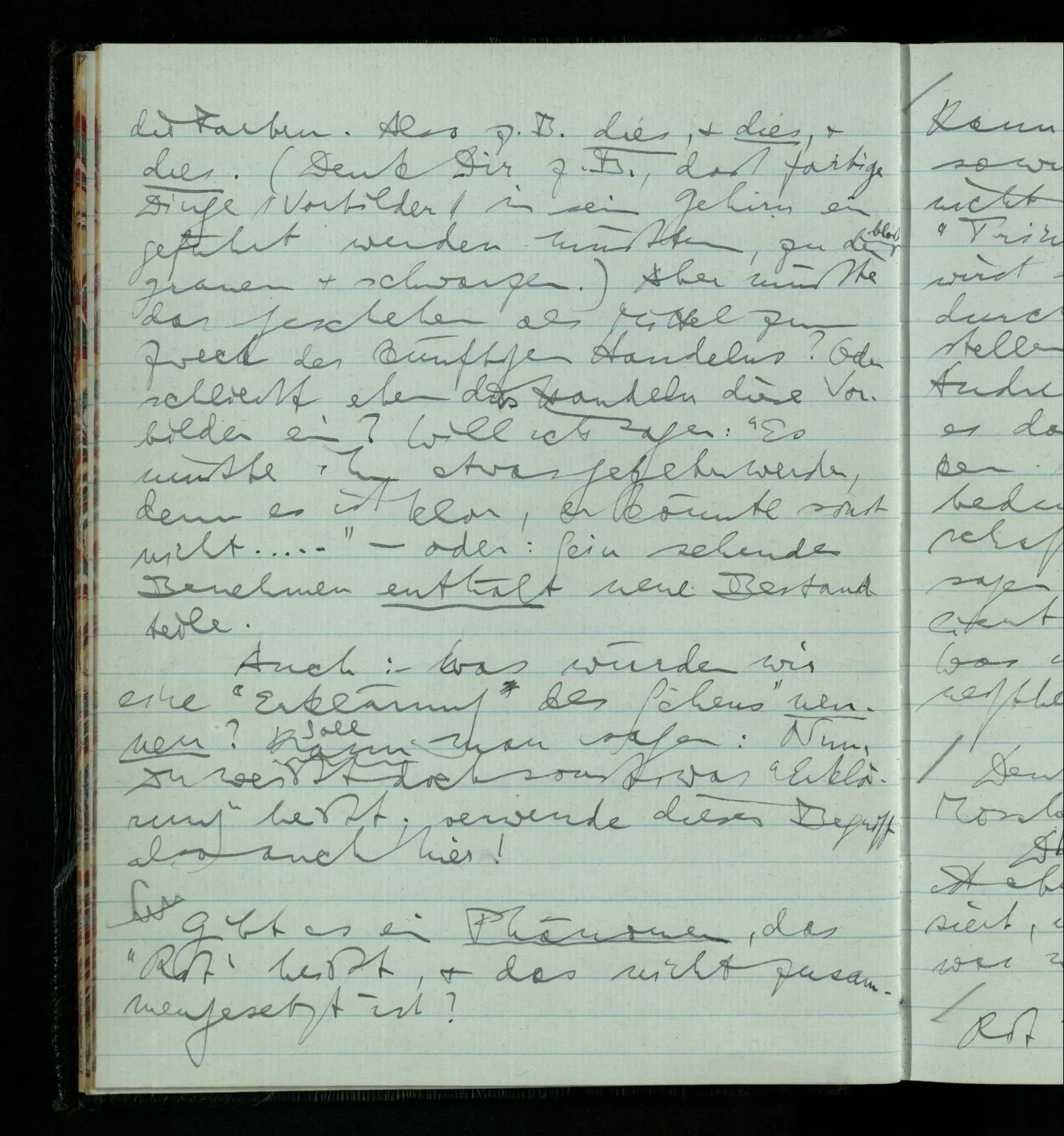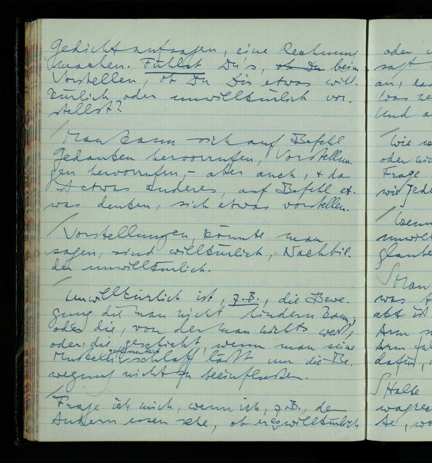 “Der Mensch ist im Stande, in voller Abgeschlossenheit mit sich selbst zu reden; in einer Isolierung, die weit vollkommener ist, als jede körperliche Isolierung.” Wie weiß ich, daß dem N. dies gegeben ist? – Weil er’s sagt & zuverlässig ist? – Und doch sagen wir: “Ich wüßte gerne, was er jetzt bei sich denkt”; ganz so, wie wir sagen könnten: “Ich wüßte gerne, was er jetzt in sein Notizbuch schreibt”. Ja, man könnte eben das sagen & es, sozusagen, als selbstverständlich ansehen, daß er bei sich das denkt, was er in’s