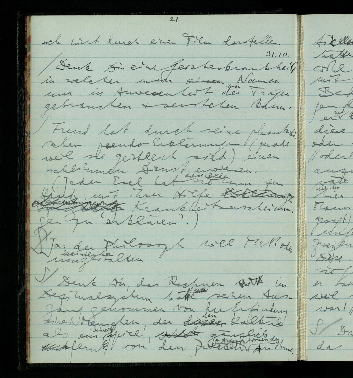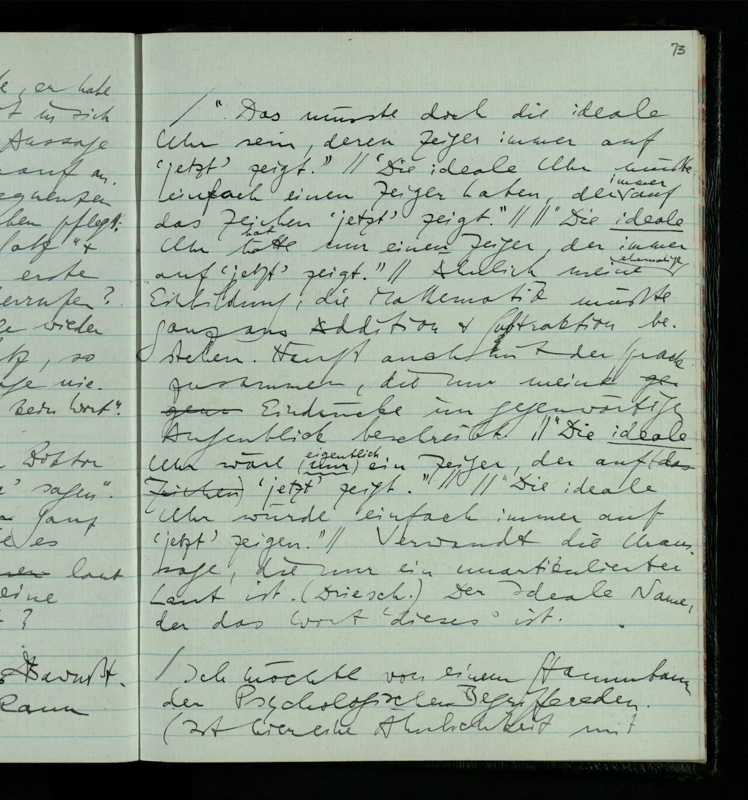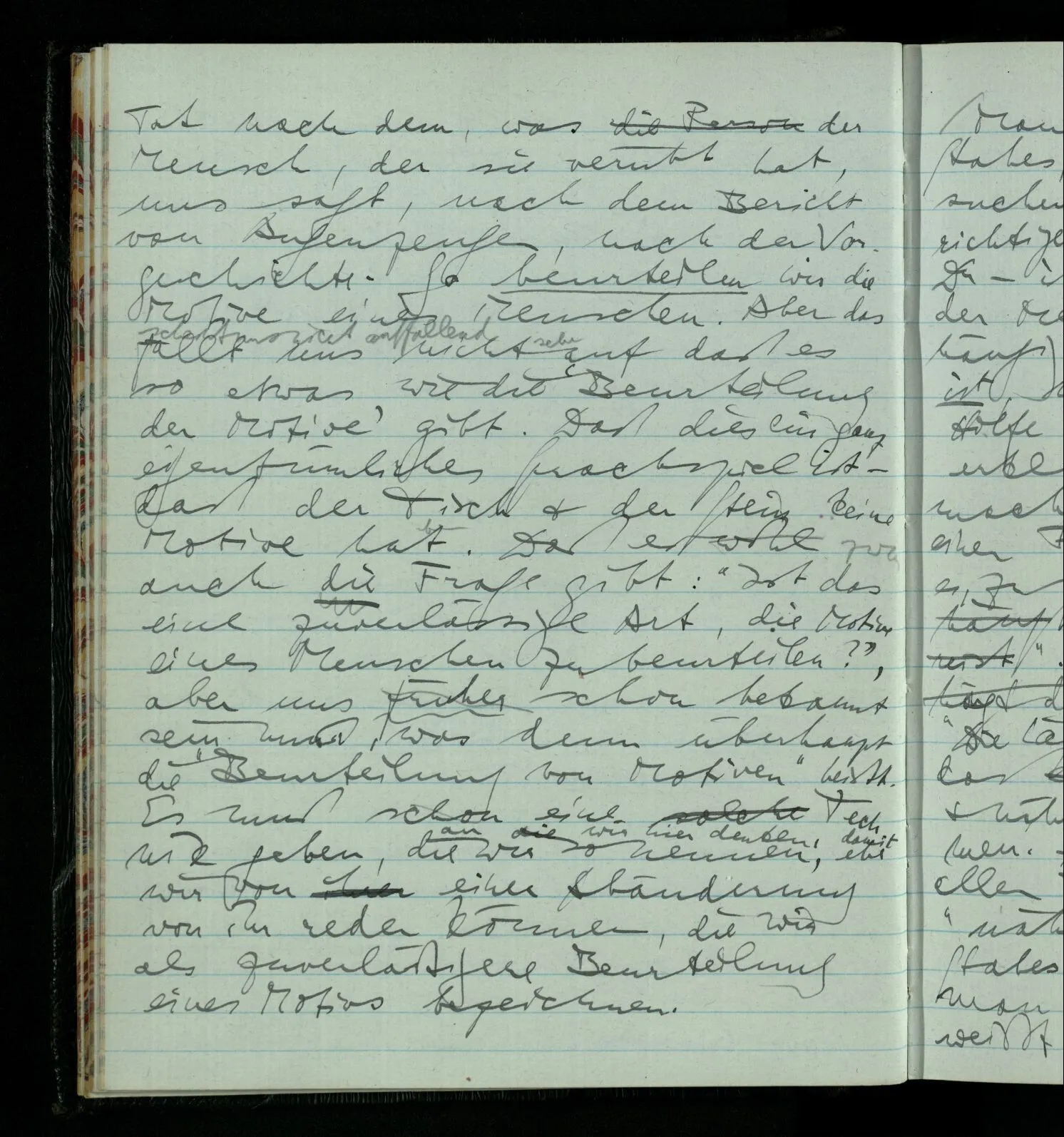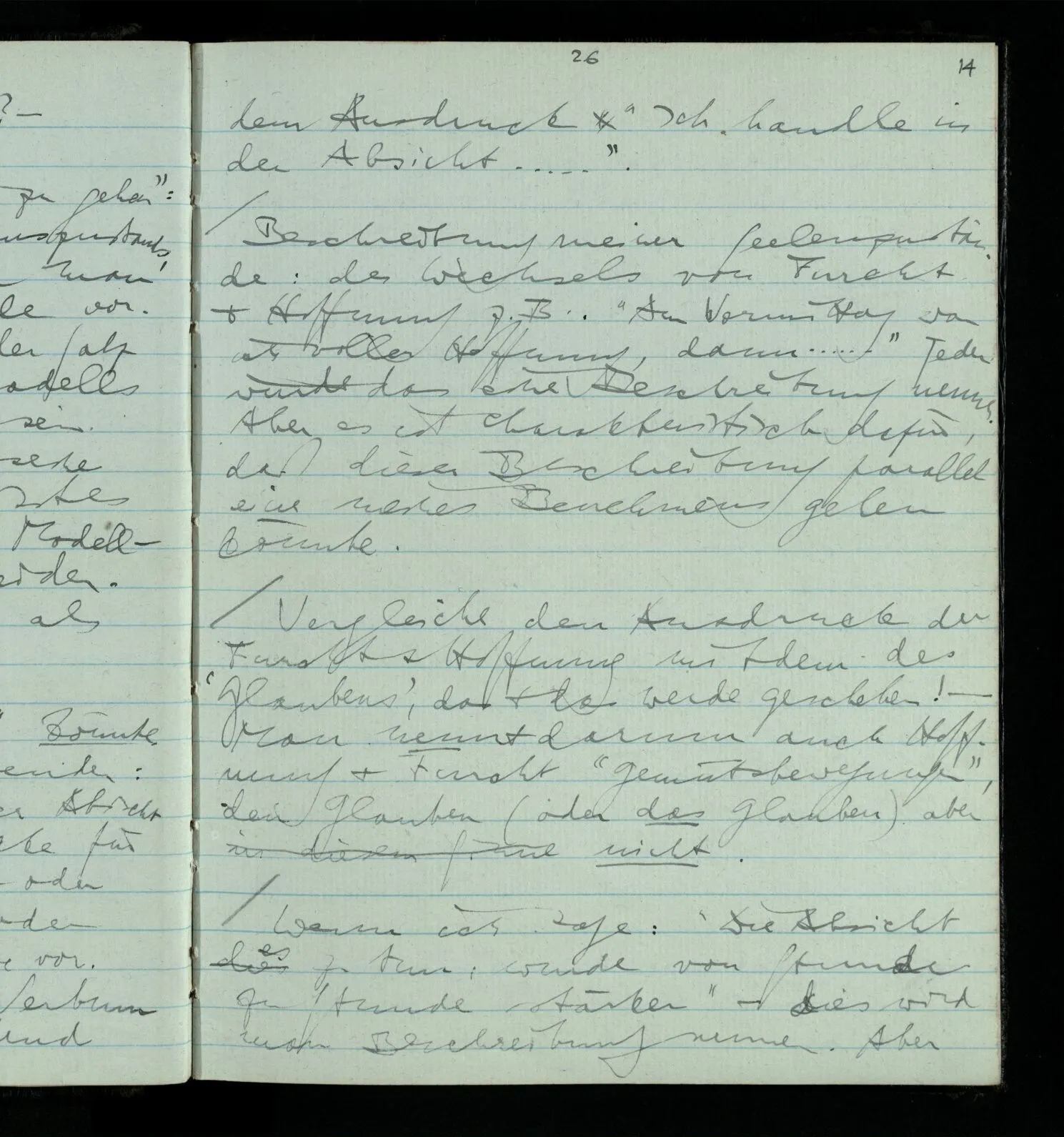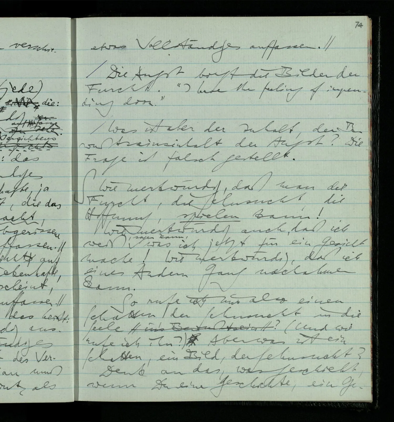 “Der Mensch ist im Stande, in voller Abgeschlossenheit mit sich selbst zu reden; in einer Isolierung, die weit vollkommener ist, als jede körperliche Isolierung.” Wie weiß ich, daß dem N. dies gegeben ist? – Weil er’s sagt & zuverlässig ist? – Und doch sagen wir: “Ich wüßte gerne, was er jetzt bei sich denkt”; ganz so, wie wir sagen könnten: “Ich wüßte gerne, was er jetzt in sein Notizbuch schreibt”. Ja, man könnte eben das sagen & es, sozusagen, als selbstverständlich ansehen, daß er bei sich das denkt, was er in’s