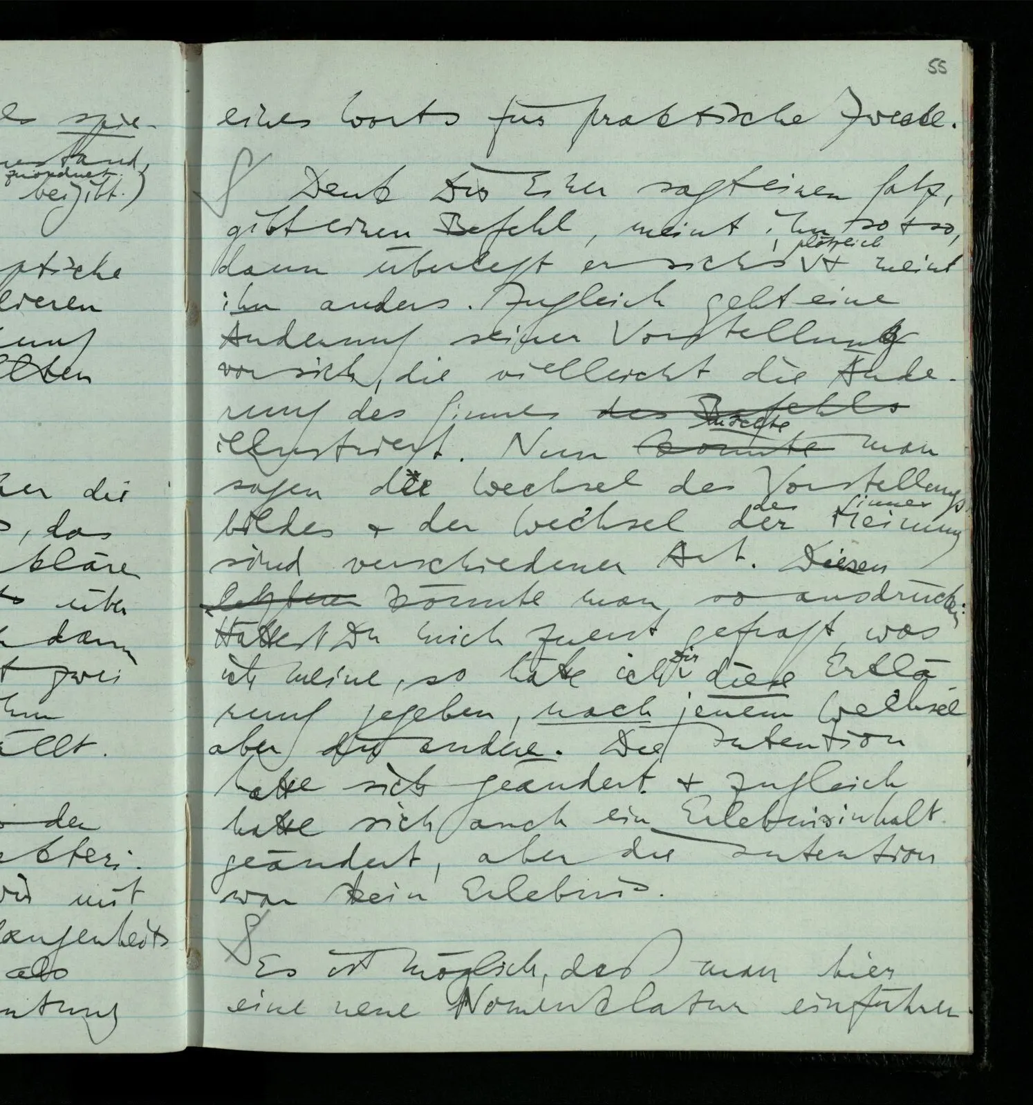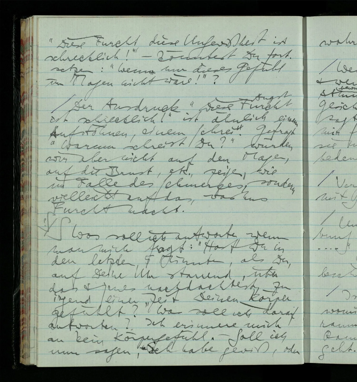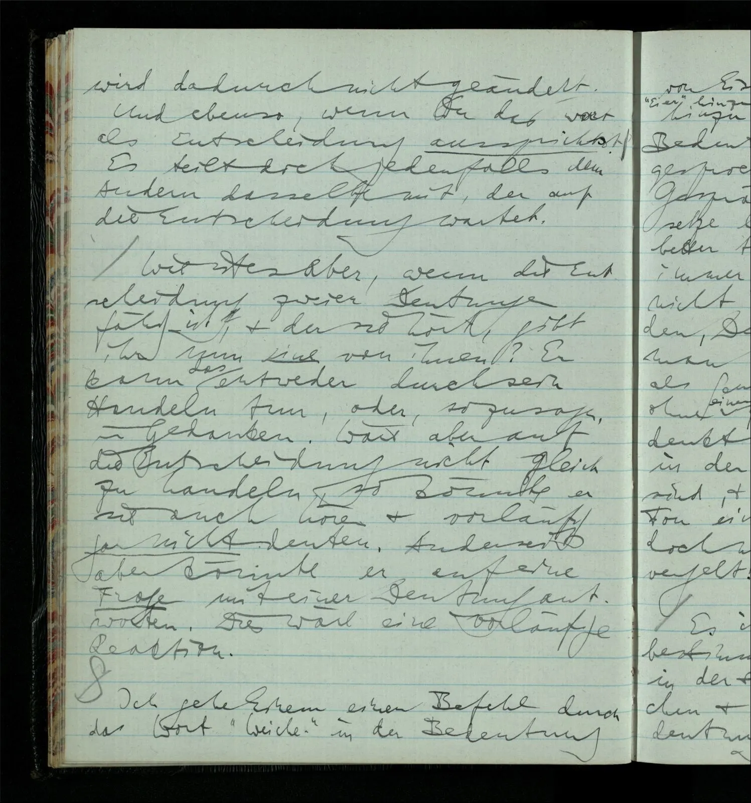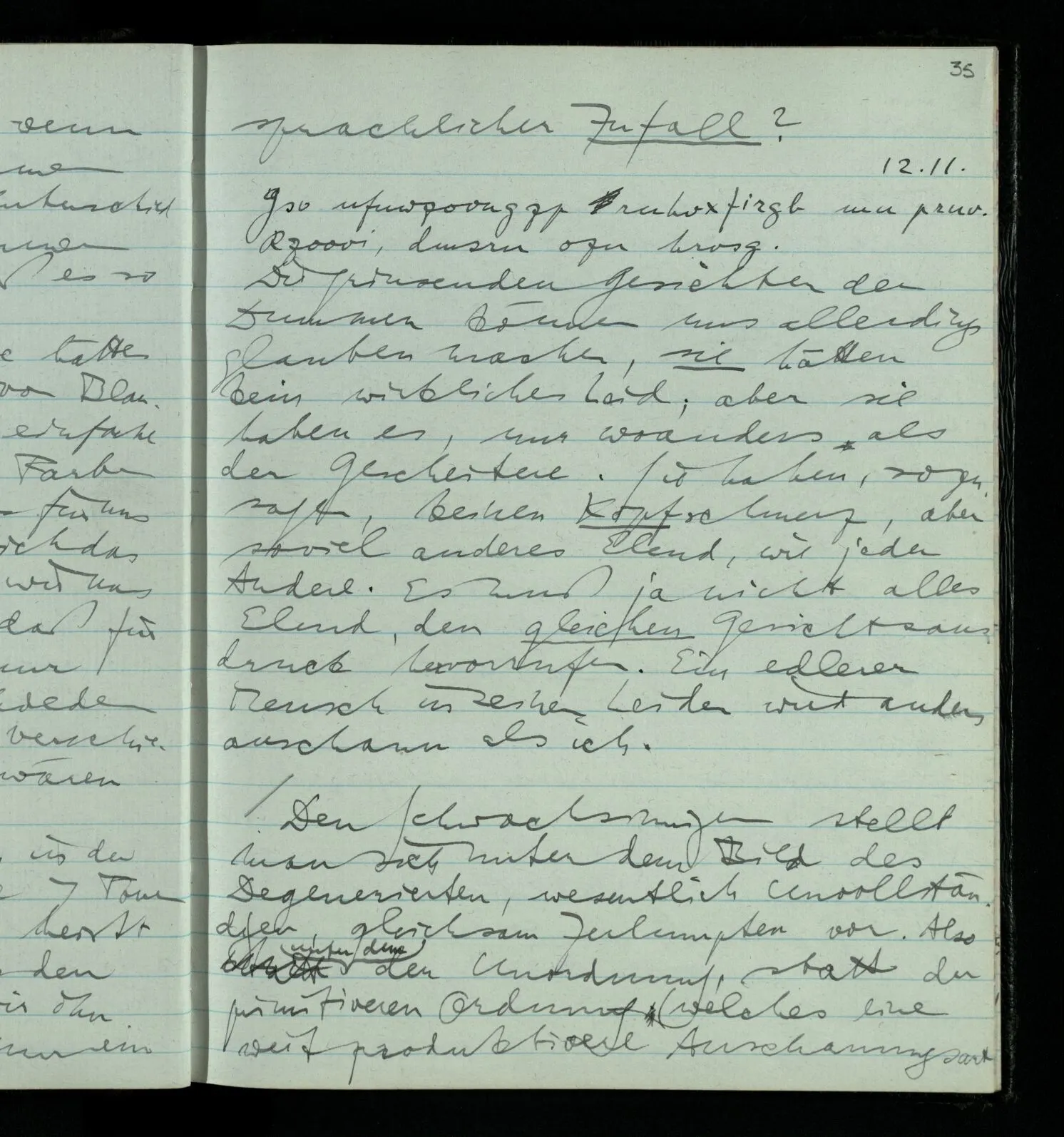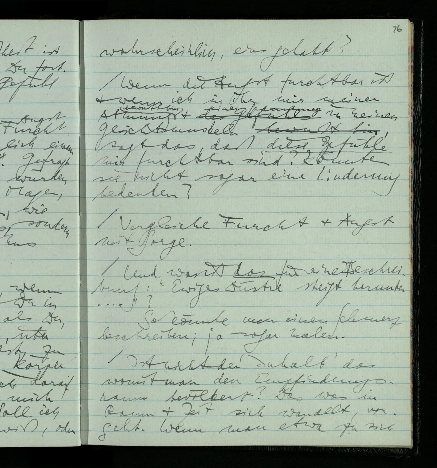 “Der Mensch ist im Stande, in voller Abgeschlossenheit mit sich selbst zu reden; in einer Isolierung, die weit vollkommener ist, als jede körperliche Isolierung.” Wie weiß ich, daß dem N. dies gegeben ist? – Weil er’s sagt & zuverlässig ist? – Und doch sagen wir: “Ich wüßte gerne, was er jetzt bei sich denkt”; ganz so, wie wir sagen könnten: “Ich wüßte gerne, was er jetzt in sein Notizbuch schreibt”. Ja, man könnte eben das sagen & es, sozusagen, als selbstverständlich ansehen, daß er bei sich das denkt, was er in’s