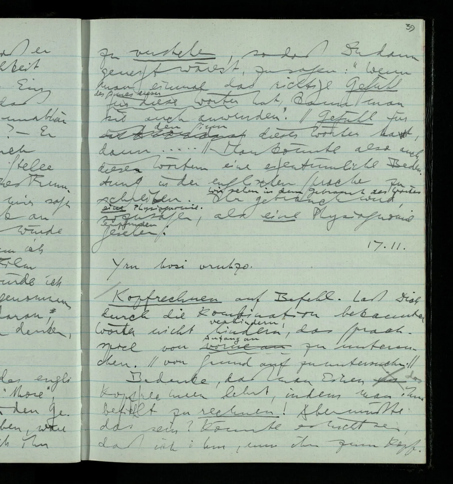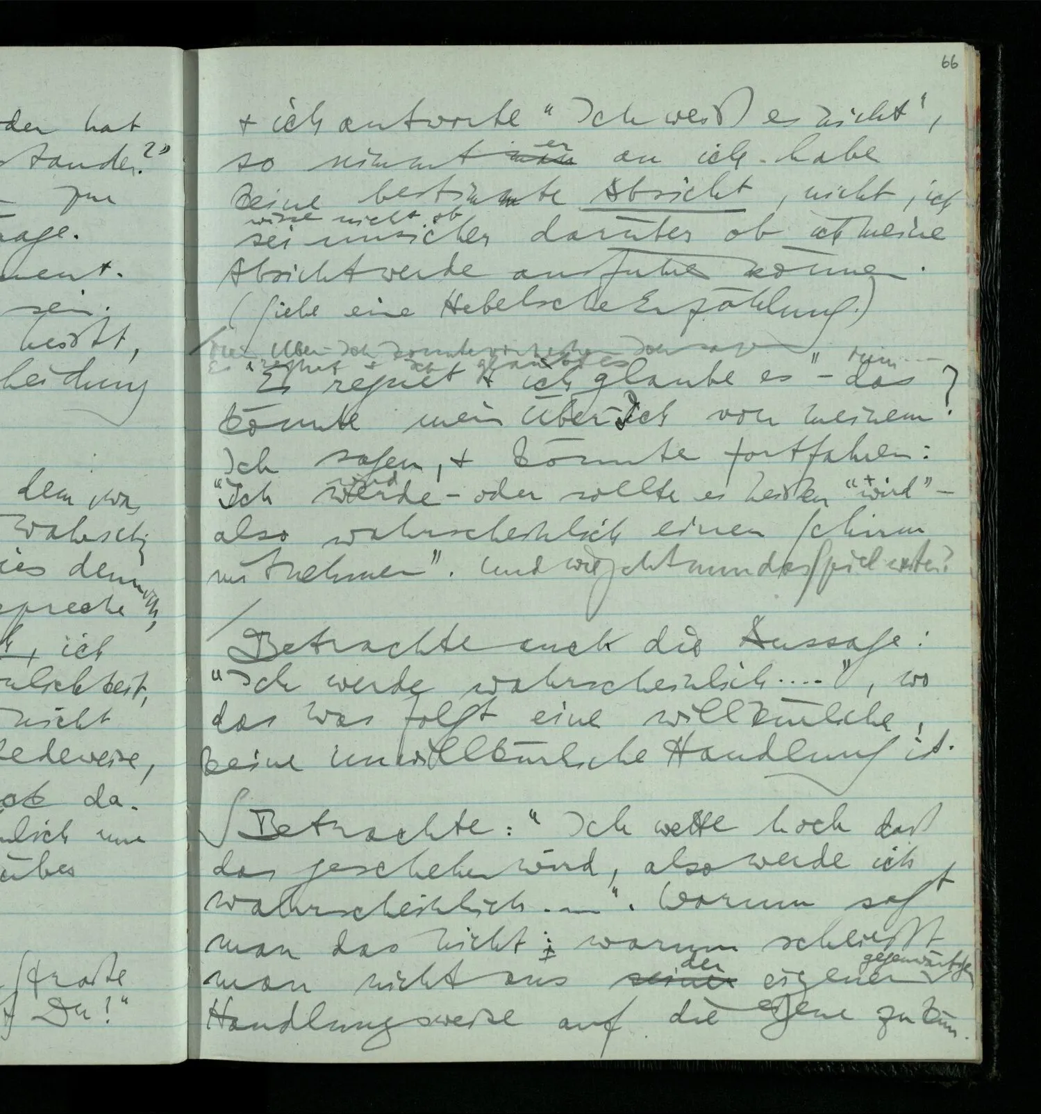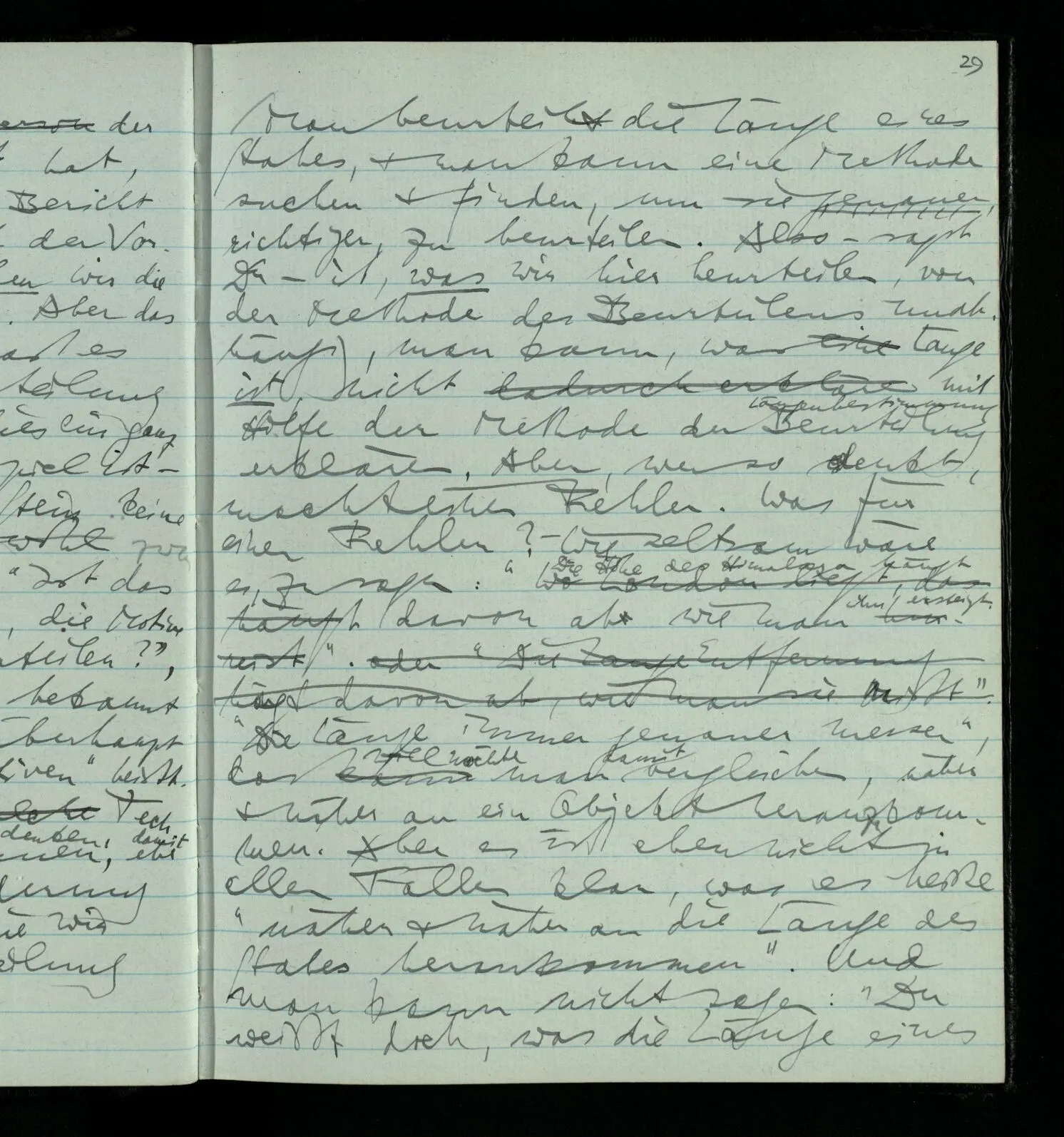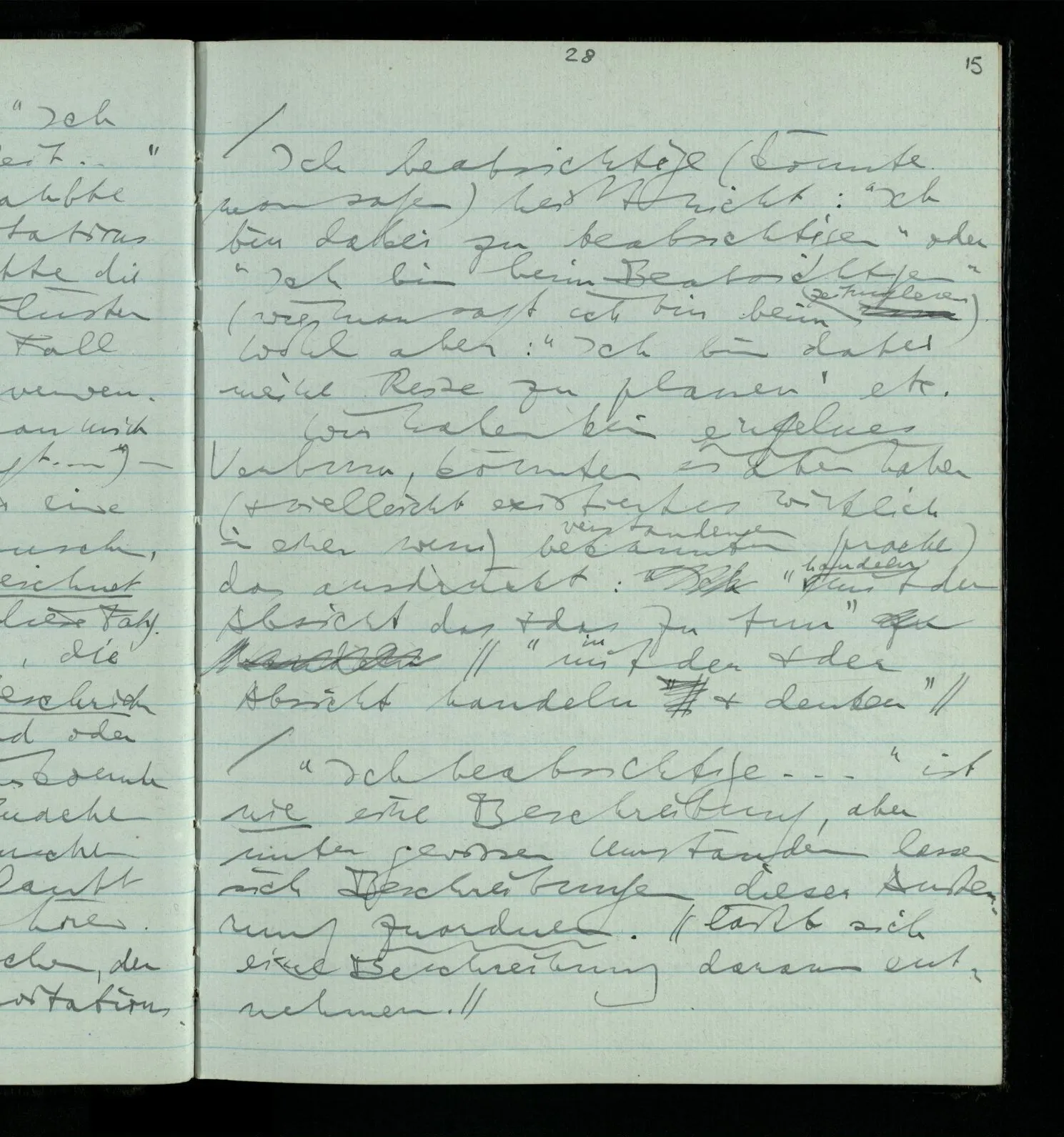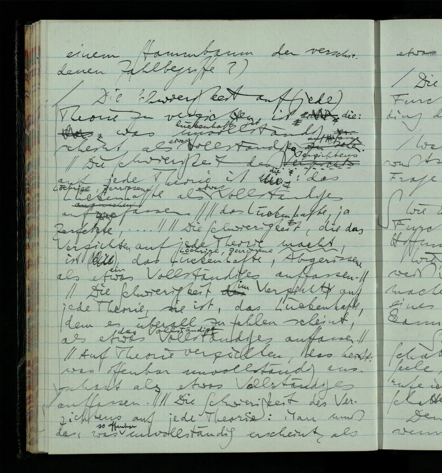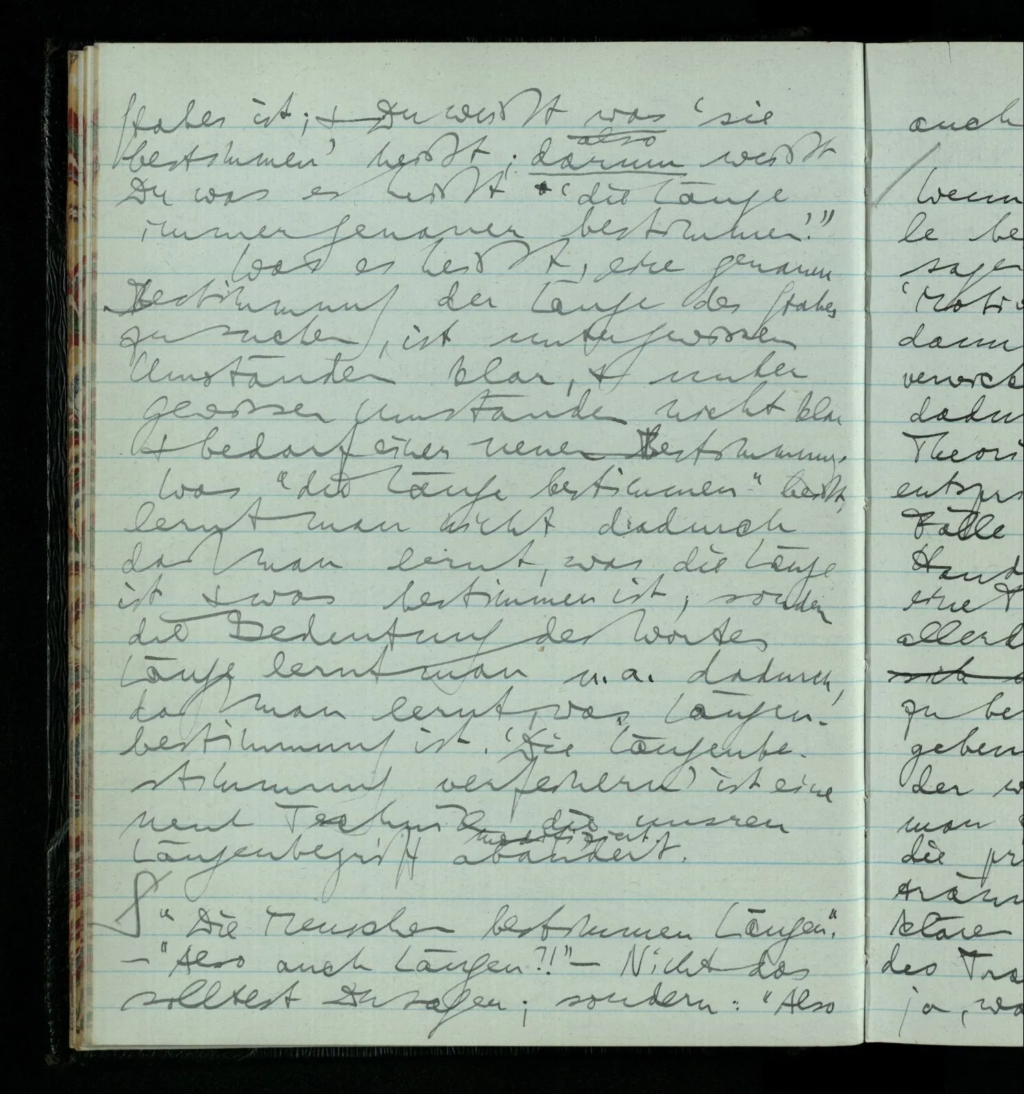 “Der Mensch ist im Stande, in voller Abgeschlossenheit mit sich selbst zu reden; in einer Isolierung, die weit vollkommener ist, als jede körperliche Isolierung.” Wie weiß ich, daß dem N. dies gegeben ist? – Weil er’s sagt & zuverlässig ist? – Und doch sagen wir: “Ich wüßte gerne, was er jetzt bei sich denkt”; ganz so, wie wir sagen könnten: “Ich wüßte gerne, was er jetzt in sein Notizbuch schreibt”. Ja, man könnte eben das sagen & es, sozusagen, als selbstverständlich ansehen, daß er bei sich das denkt, was er in’s