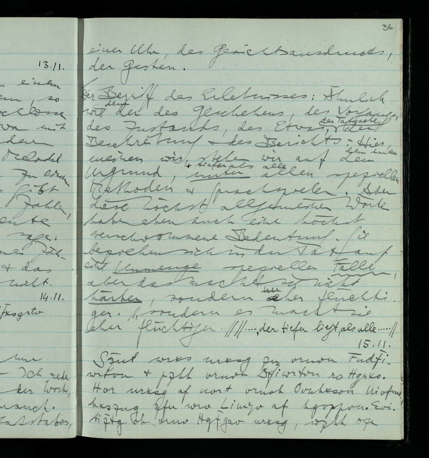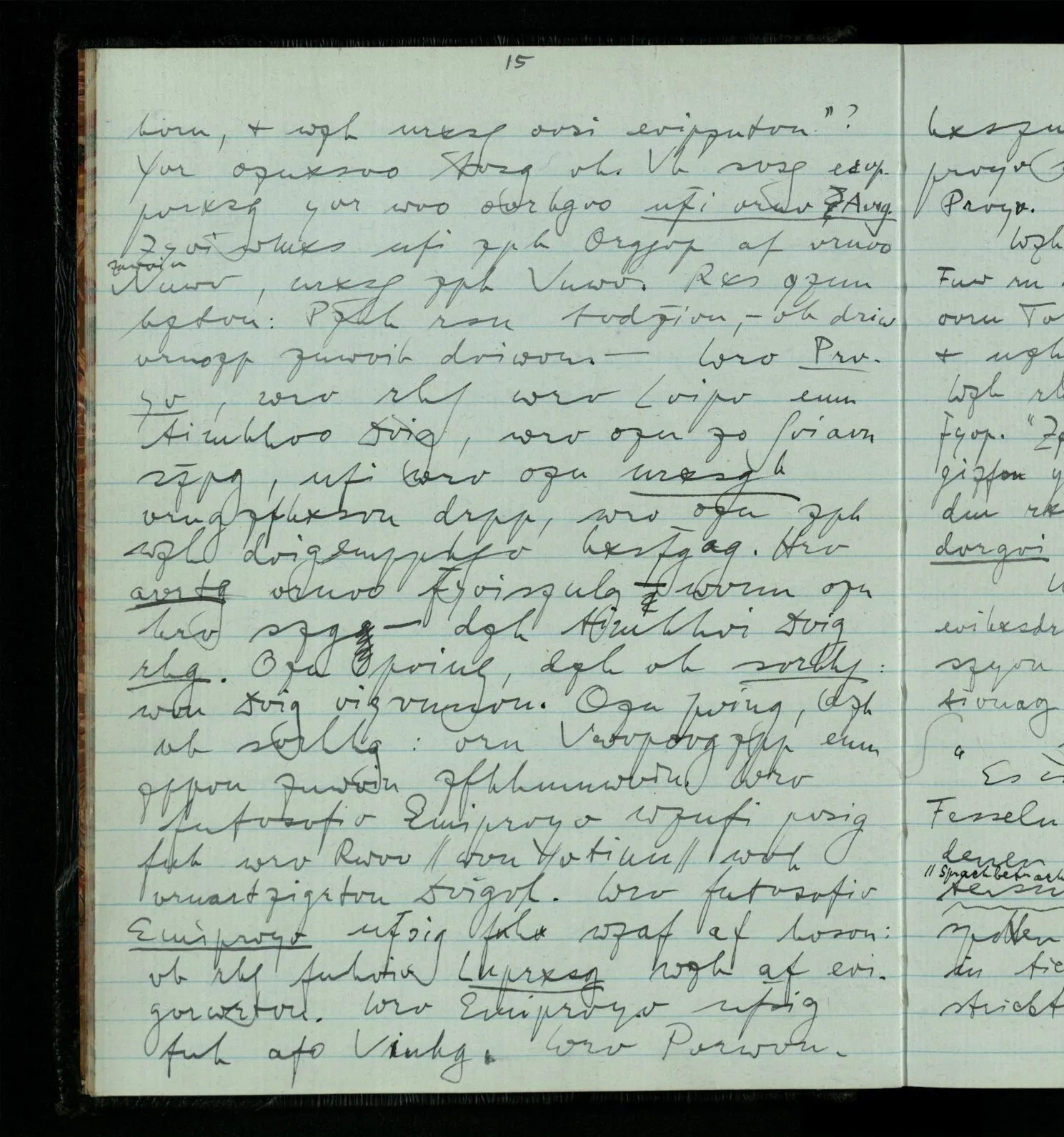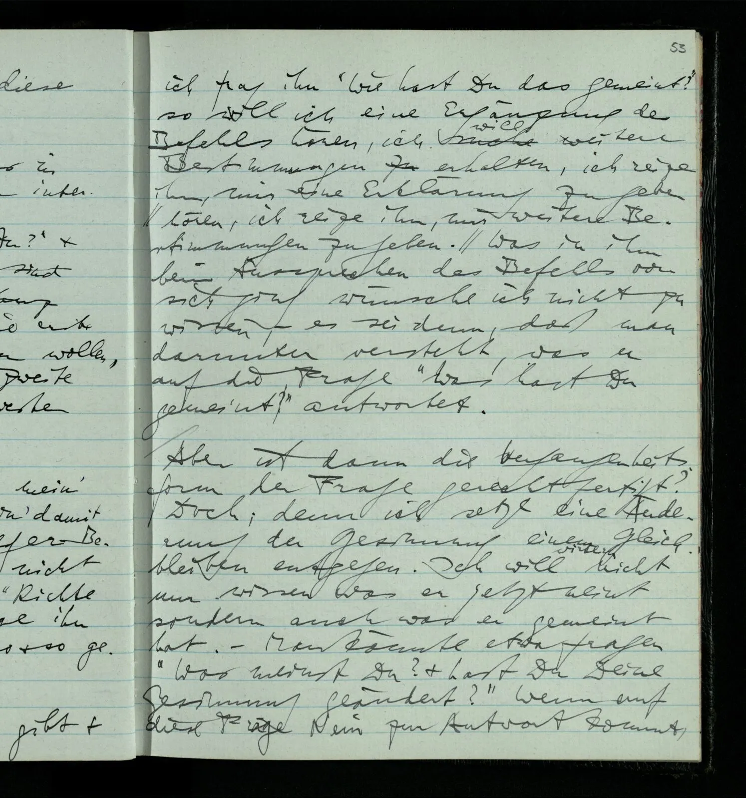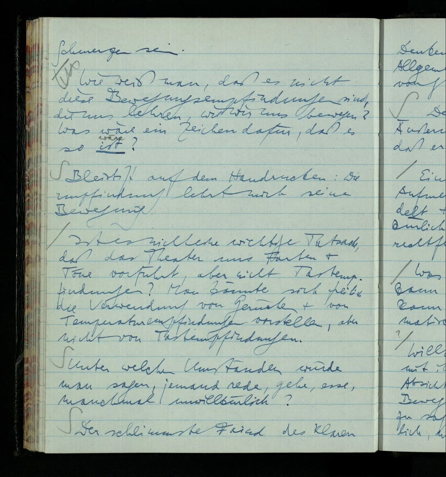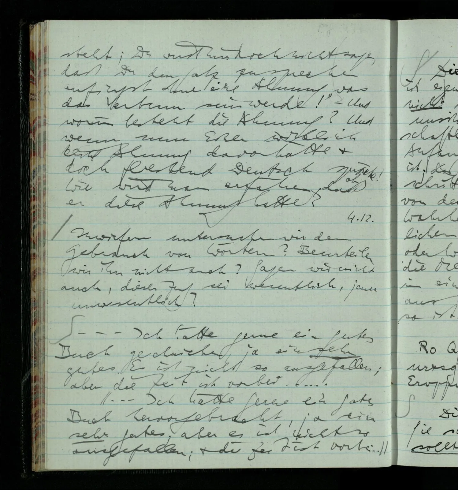 “Der Mensch ist im Stande, in voller Abgeschlossenheit mit sich selbst zu reden; in einer Isolierung, die weit vollkommener ist, als jede körperliche Isolierung.” Wie weiß ich, daß dem N. dies gegeben ist? – Weil er’s sagt & zuverlässig ist? – Und doch sagen wir: “Ich wüßte gerne, was er jetzt bei sich denkt”; ganz so, wie wir sagen könnten: “Ich wüßte gerne, was er jetzt in sein Notizbuch schreibt”. Ja, man könnte eben das sagen & es, sozusagen, als selbstverständlich ansehen, daß er bei sich das denkt, was er in’s