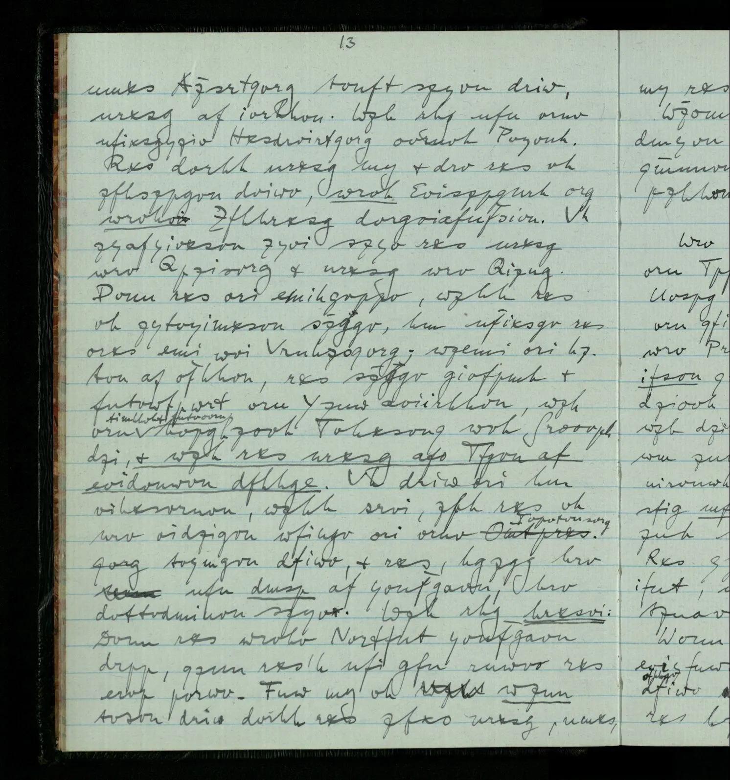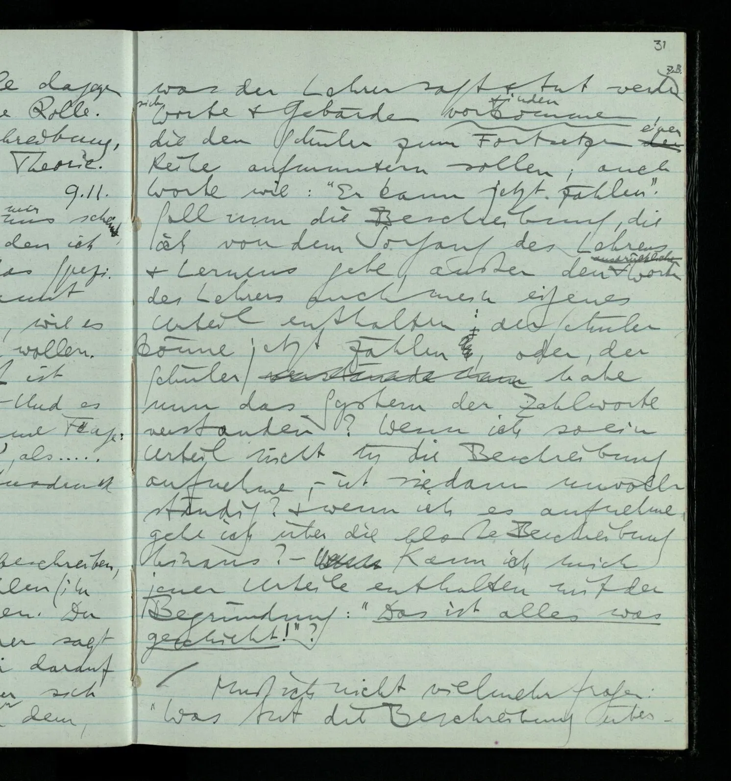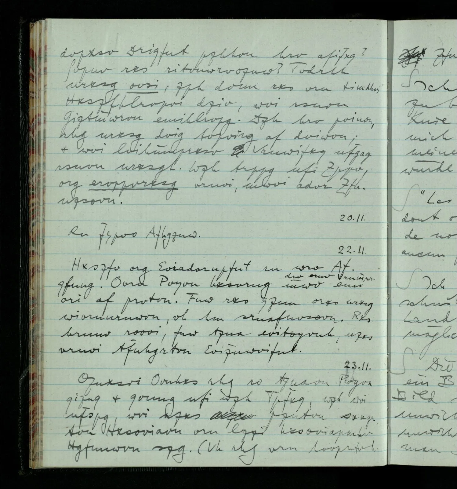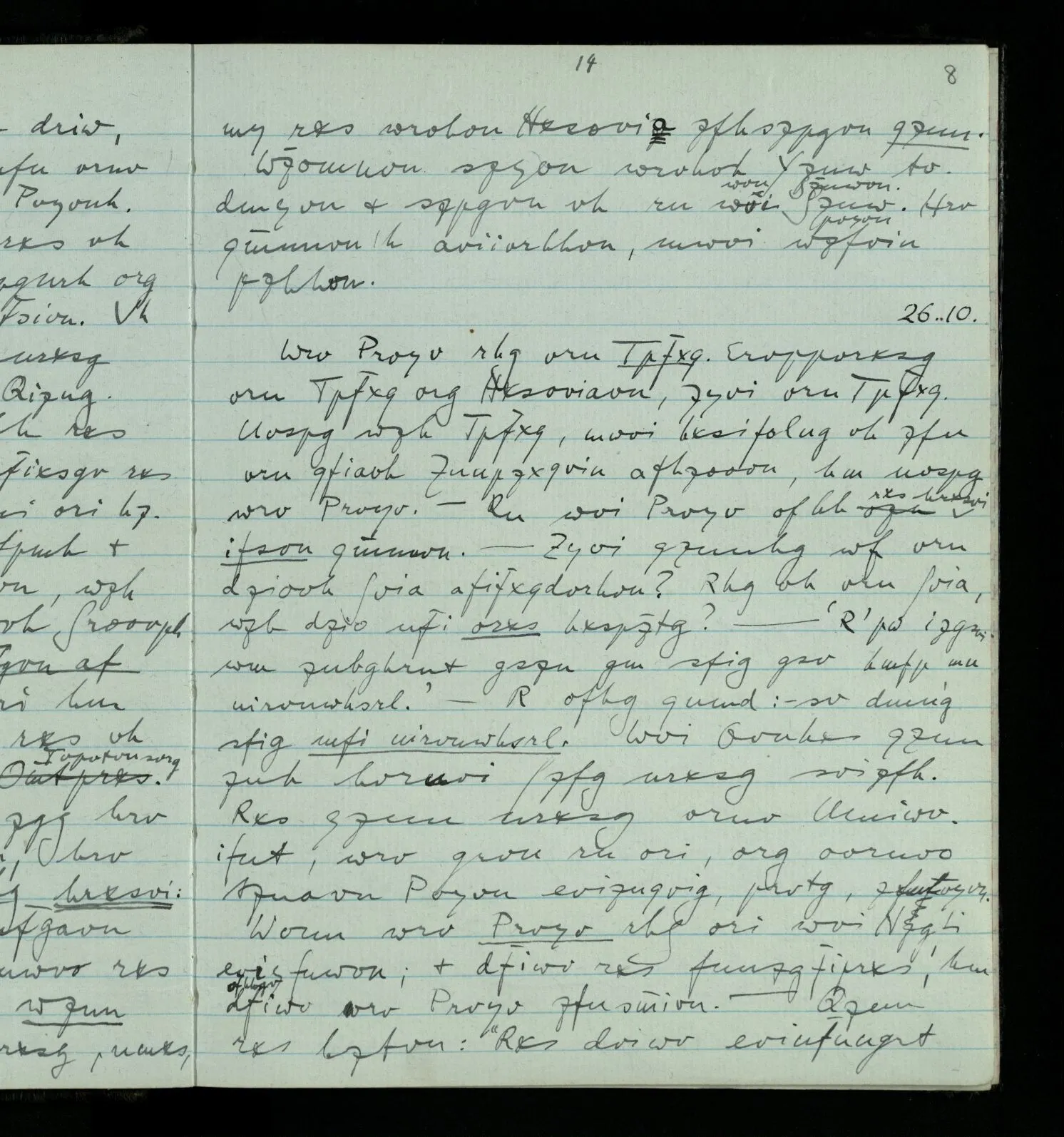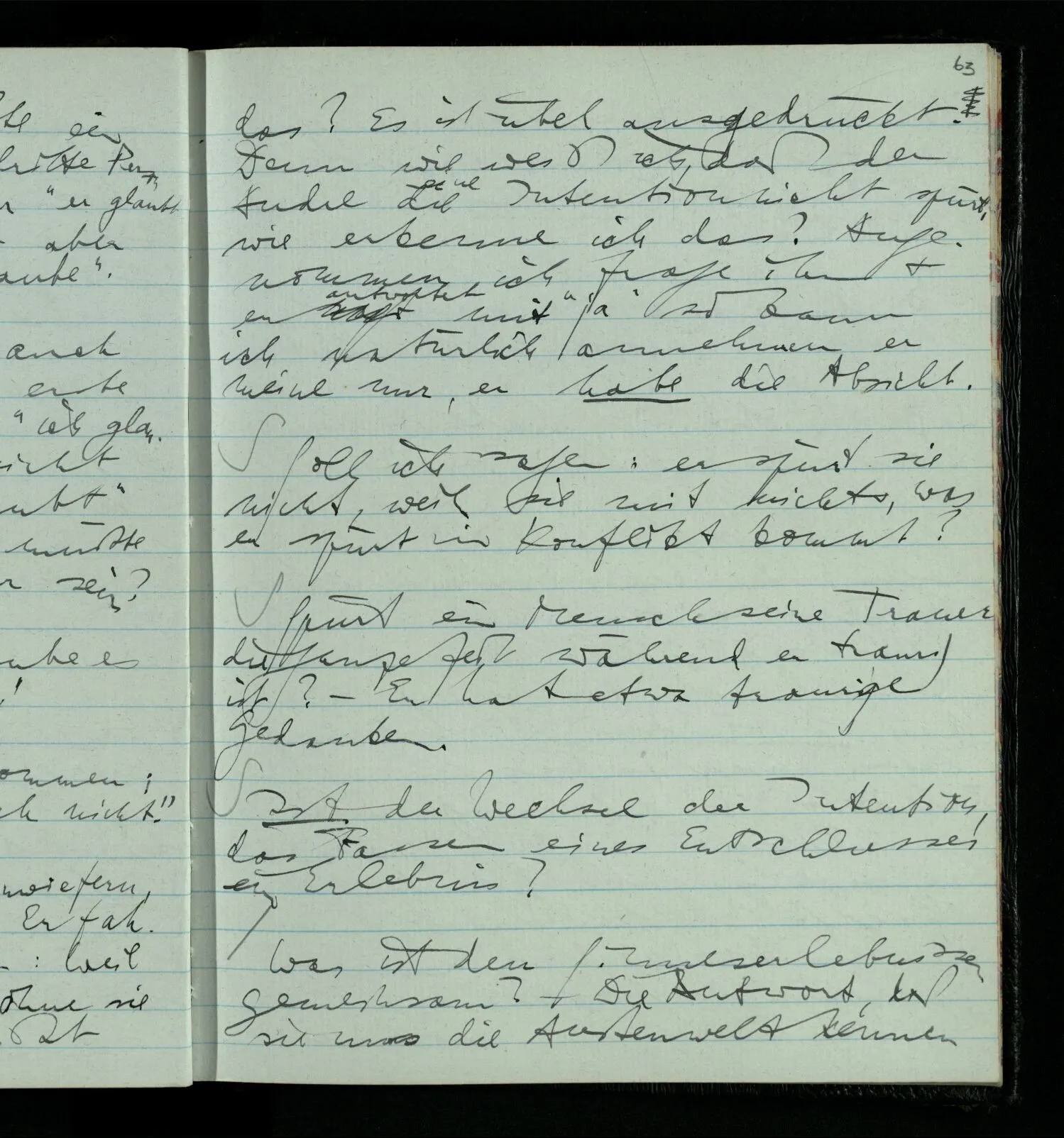 “Der Mensch ist im Stande, in voller Abgeschlossenheit mit sich selbst zu reden; in einer Isolierung, die weit vollkommener ist, als jede körperliche Isolierung.” Wie weiß ich, daß dem N. dies gegeben ist? – Weil er’s sagt & zuverlässig ist? – Und doch sagen wir: “Ich wüßte gerne, was er jetzt bei sich denkt”; ganz so, wie wir sagen könnten: “Ich wüßte gerne, was er jetzt in sein Notizbuch schreibt”. Ja, man könnte eben das sagen & es, sozusagen, als selbstverständlich ansehen, daß er bei sich das denkt, was er in’s