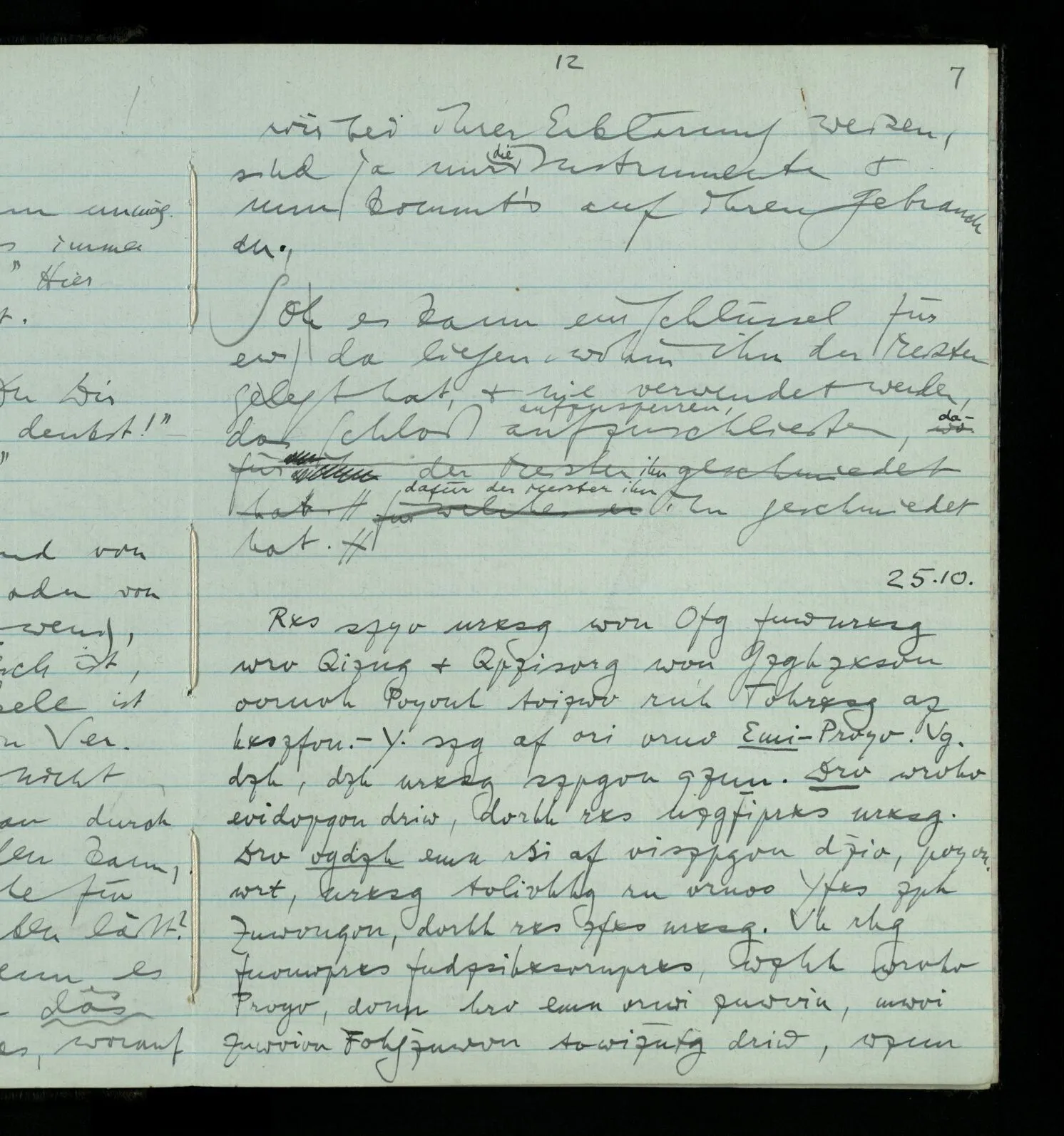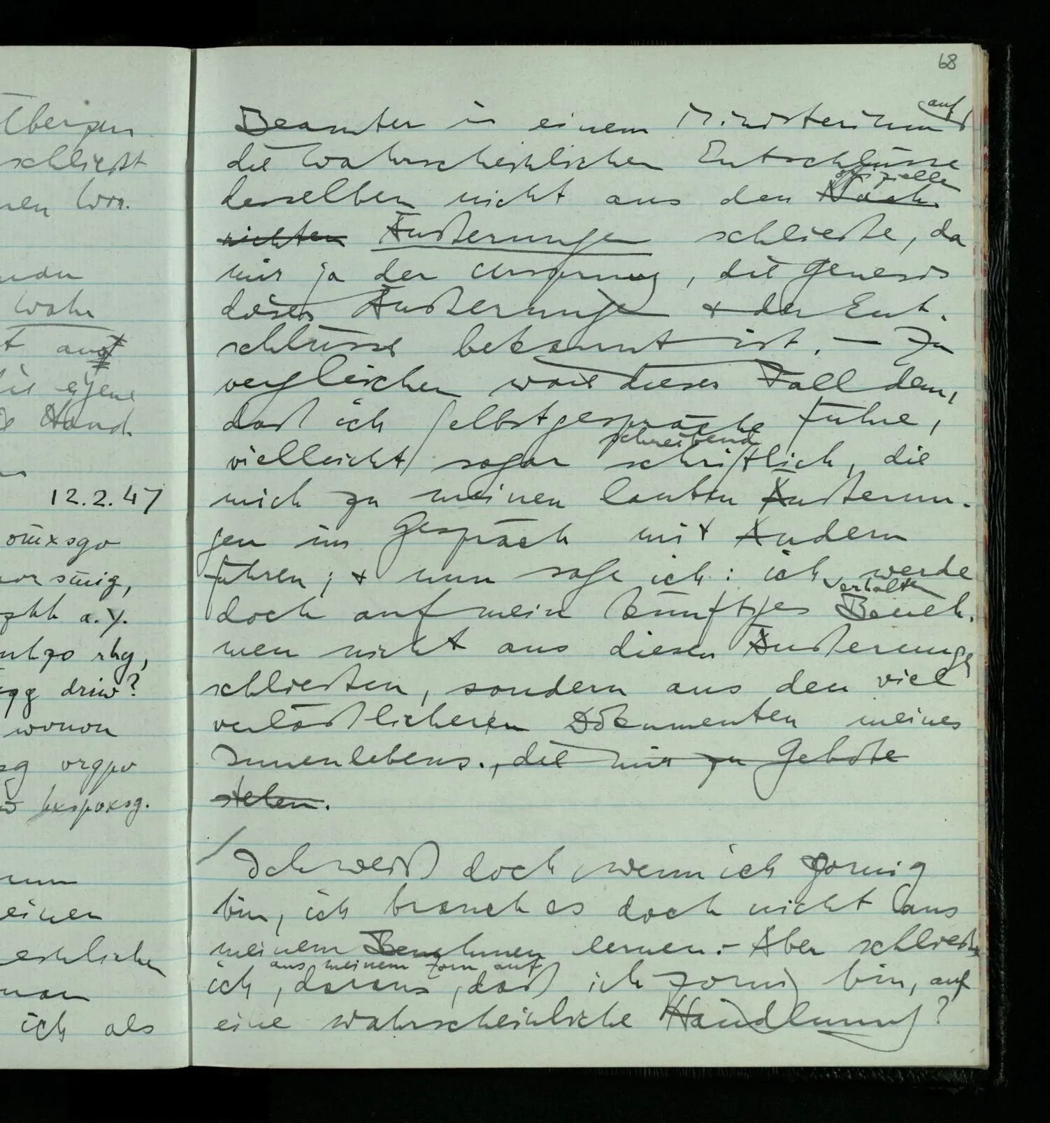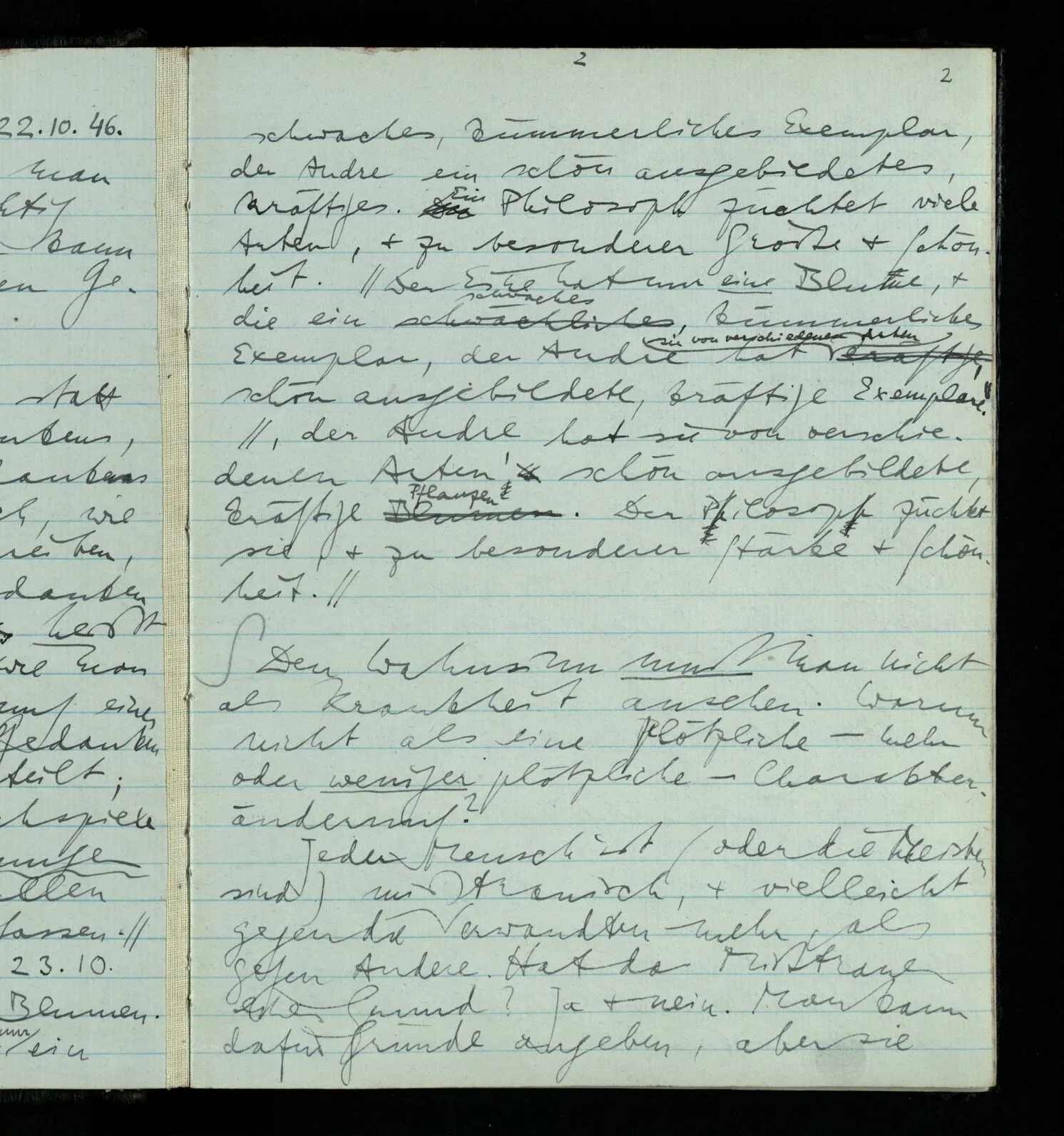 25.10.1946 Ich habe nicht den Mut und nicht die Kraft & Klarheit den Tatsachen meines Lebens gerade in’s Gesicht zu schauen. – B. hat zu mir eine Vor-Liebe. Etwas, was nicht halten kann. Wie diese verwelken wird, weiß ich natürlich nicht. Wie etwas von ihr zu erhalten wäre, lebendig, nicht gepreßt in einem Buch als Andenken, weiß ich auch nicht. Es ist unendlich unwahrscheinlich, daß diese Liebe, wenn sie von einer andern, oder anderen Umständen gedrängt wird, dann noch Zähigkeit genug haben wird, nicht zu reißen. Das ist nun eine furchtbare Schwierigkeit meines Lebens. Ich weiß nicht ob und wie ich es aushalten werde, dies Verhältnis mit dieser Aussicht weiterzunähren. Es abzubrechen aber habe ich nicht die Klarheit und nicht die Kraft. Wenn ich mir vorstelle, daß ich es abgebrochen hätte, so fürchte ich mich vor der Einsamkeit; davor mir sagen zu müssen, ich hätte treulos & ungeduldig ein Band zerrissen, das ein großes & ungemein seltsames Geschenk des Himmels war, und das ich nicht zum Guten zu verwenden wußte. Es wird mir so erscheinen, daß hier, als ich es nie erwarten durfte mir eine Gelegenheit geboten wurde, und ich, statt sie nun wohl zu benützen, sie weggeworfen habe. Das ist schwer: Wenn ich diese Neigung benützen will, kann ich’s nur tun indem ich viel leide. – Und ob es dann gehen wird weiß ich auch nicht, noch, ob ich diesen Schmerz aushalten kann. Dämonen haben dieses Band gewoben und halten es in der Hand. Sie können’s zerreißen, oder dauern lassen.
