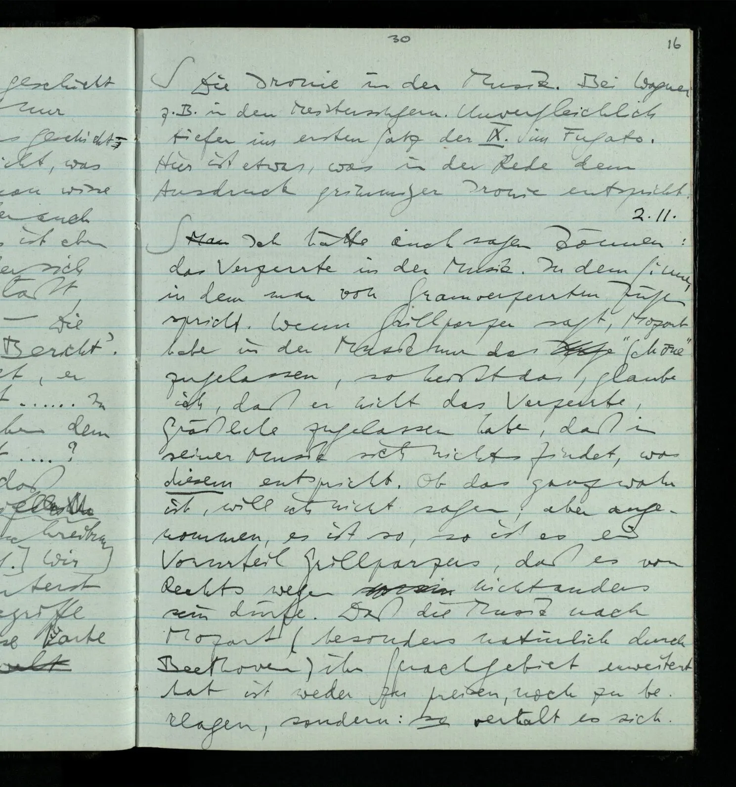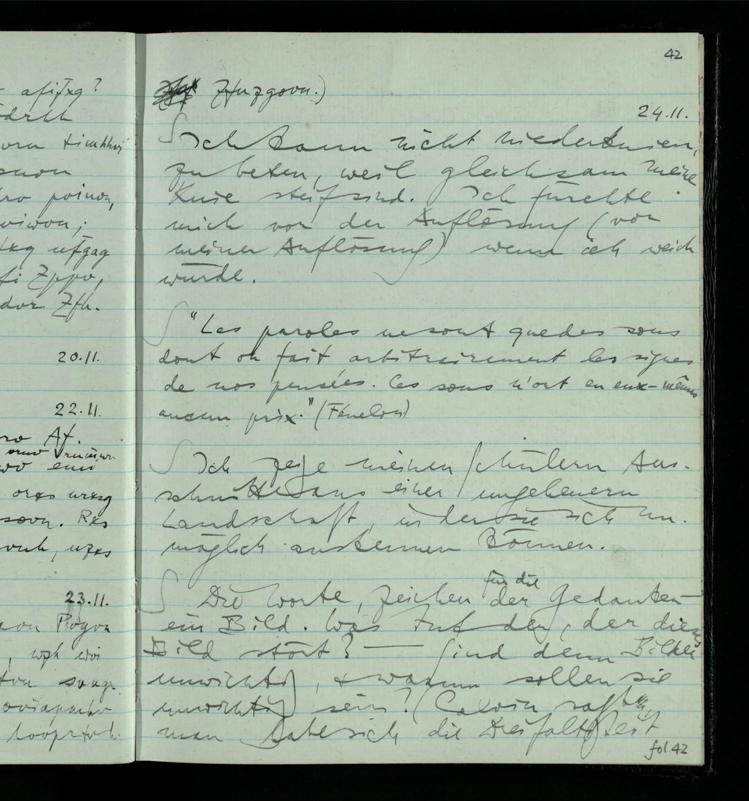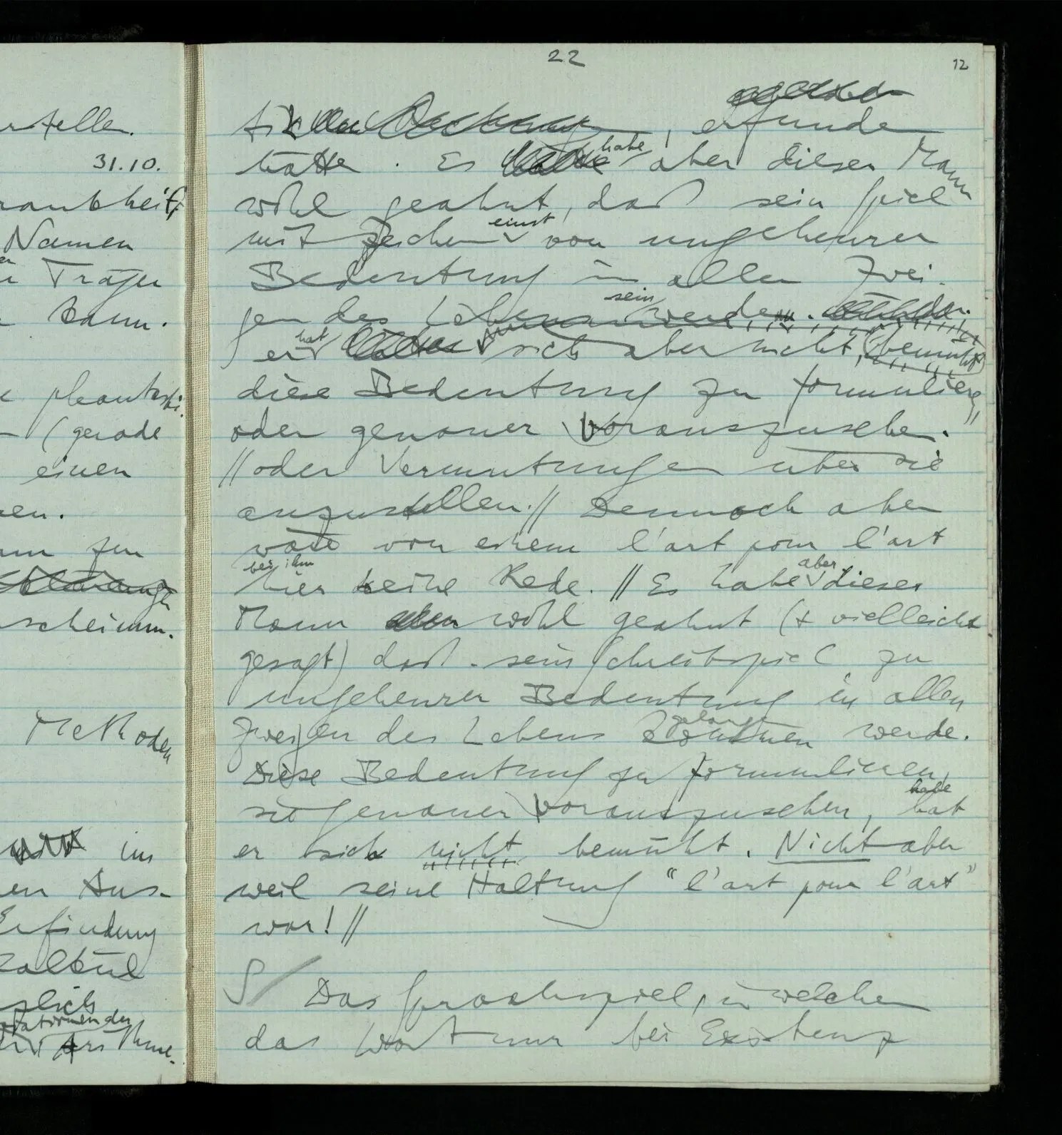 25.10.1946 Ich habe nicht den Mut und nicht die Kraft & Klarheit den Tatsachen meines Lebens gerade in’s Gesicht zu schauen. – B. hat zu mir eine Vor-Liebe. Etwas, was nicht halten kann. Wie diese verwelken wird, weiß ich natürlich nicht. Wie etwas von ihr zu erhalten wäre, lebendig, nicht gepreßt in einem Buch als Andenken, weiß ich auch nicht. Es ist unendlich unwahrscheinlich, daß diese Liebe, wenn sie von einer andern, oder anderen Umständen gedrängt wird, dann noch Zähigkeit genug haben wird, nicht zu reißen. Das ist nun eine furchtbare Schwierigkeit meines Lebens. Ich weiß nicht ob und wie ich es aushalten werde, dies Verhältnis mit dieser Aussicht weiterzunähren. Es abzubrechen aber habe ich nicht die Klarheit und nicht die Kraft. Wenn ich mir vorstelle, daß ich es abgebrochen hätte, so fürchte ich mich vor der Einsamkeit; davor mir sagen zu müssen, ich hätte treulos & ungeduldig ein Band zerrissen, das ein großes & ungemein seltsames Geschenk des Himmels war, und das ich nicht zum Guten zu verwenden wußte. Es wird mir so erscheinen, daß hier, als ich es nie erwarten durfte mir eine Gelegenheit geboten wurde, und ich, statt sie nun wohl zu benützen, sie weggeworfen habe. Das ist schwer: Wenn ich diese Neigung benützen will, kann ich’s nur tun indem ich viel leide. – Und ob es dann gehen wird weiß ich auch nicht, noch, ob ich diesen Schmerz aushalten kann. Dämonen haben dieses Band gewoben und halten es in der Hand. Sie können’s zerreißen, oder dauern lassen.