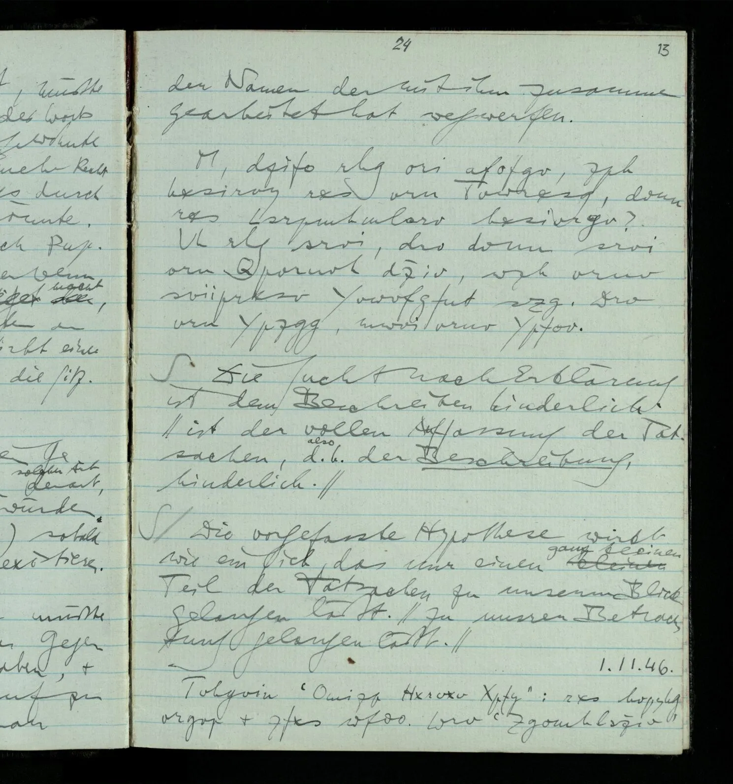31.10.1946 Denk Dir eine Geisteskrankheit, in welcher man Namen nur in Anwesenheit der Träger gebrauchen & verstehen kann.