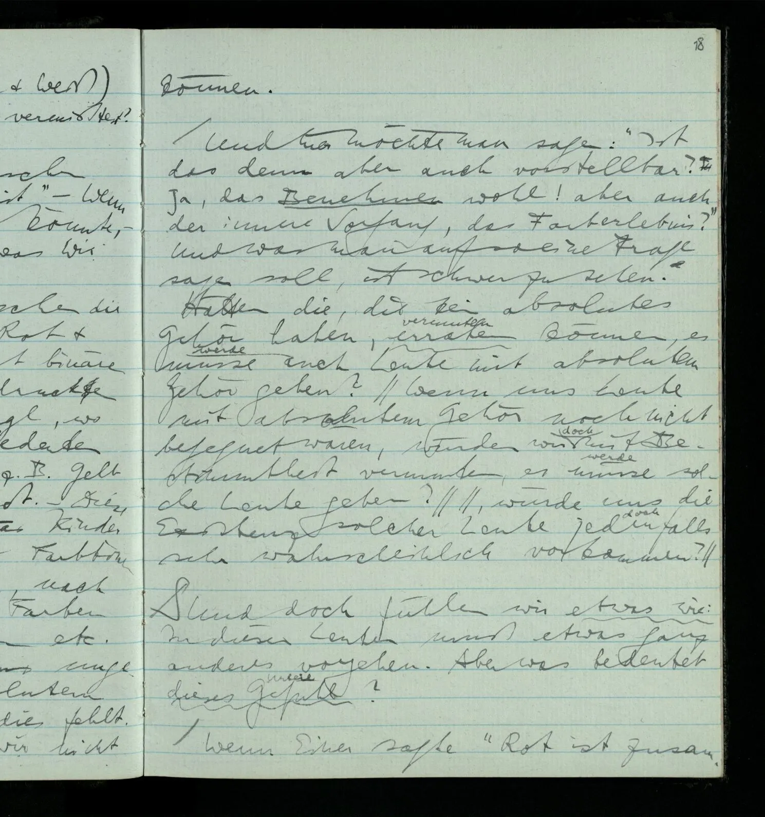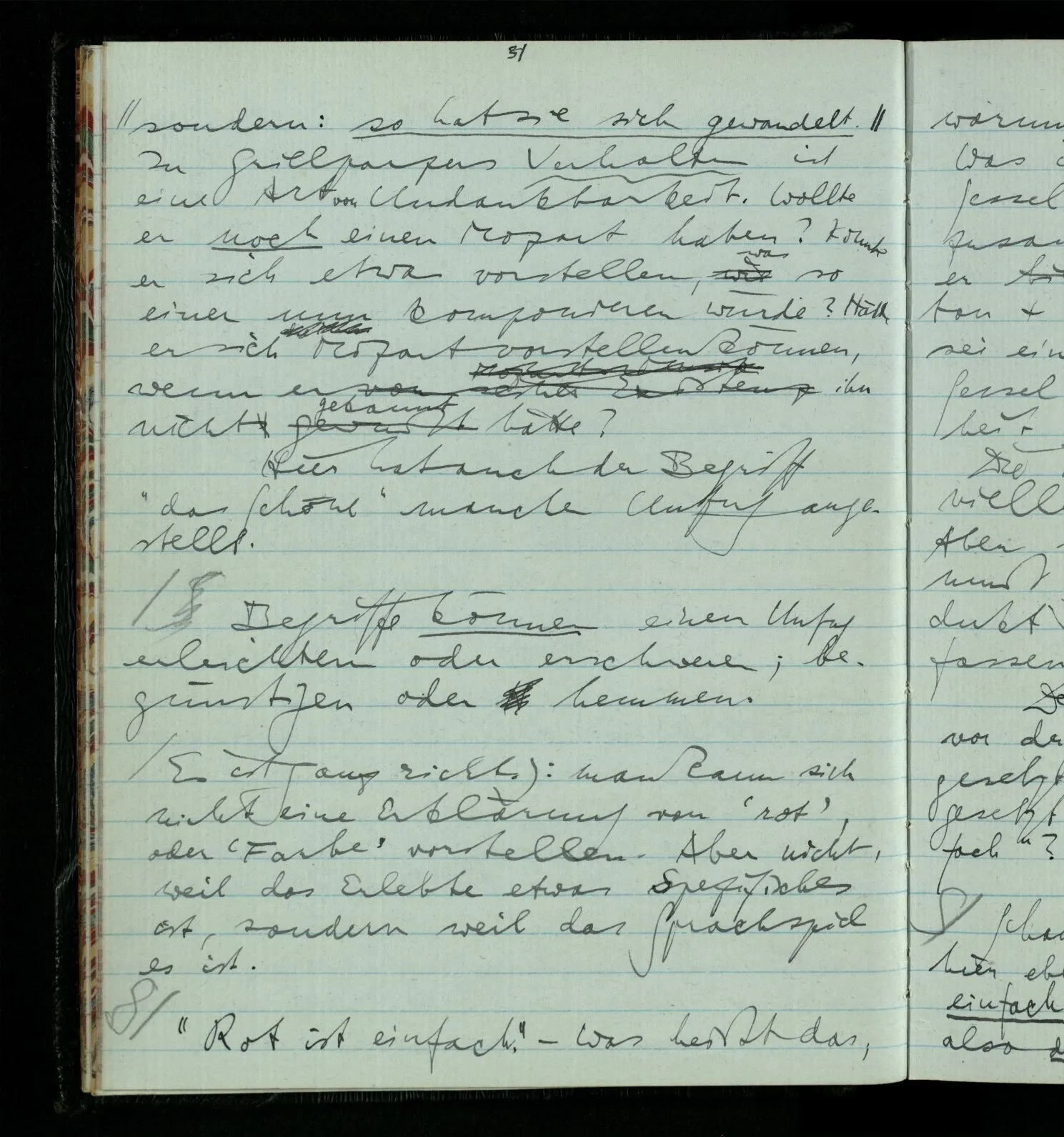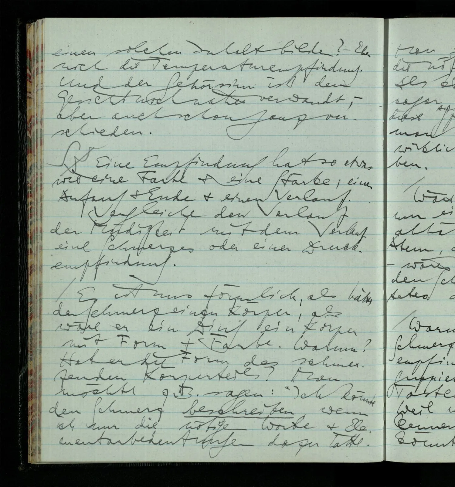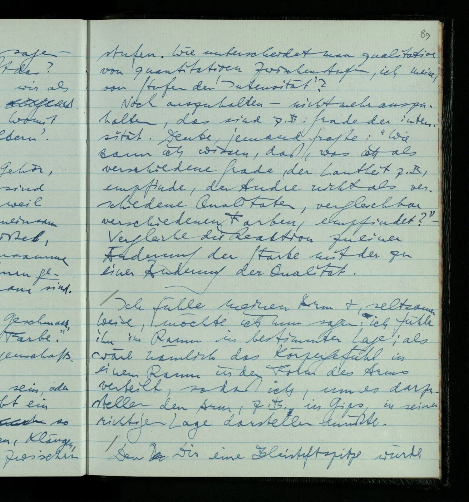 “Der Schmerz, der Ton, der Geschmack, Geruch, hat eine bestimmte Farbe.” Was heißt das? (Qualität. Eigenschaftswort.) Eine Farbe kann grünlich sein, oder bläulich – es gibt ein Gemisch von Farben; & so auch ein Gemisch von Gerüchen, Klängen, Geschmäcken; Qualitative Zwischenstufen. Wie unterscheidet man qualitative von quantitativen Zwischenstufen, ich meine, von Stufen der ‘Intensität’? Noch auszuhalten – nicht mehr auszuhalten, das sind z.B. Grade der Intensität. Denke, jemand fragte: “Wie kann ich wissen, daß, was ich als verschiedene Grade, der Lautheit z.B., empfinde, der Andre nicht als verschiedene Qualitäten, vergleichbar verschiedenen Farben, empfindet?” – Vergleiche die Reaktion zu einer Änderung der Stärke mit der zu einer Änderung der Qualität.