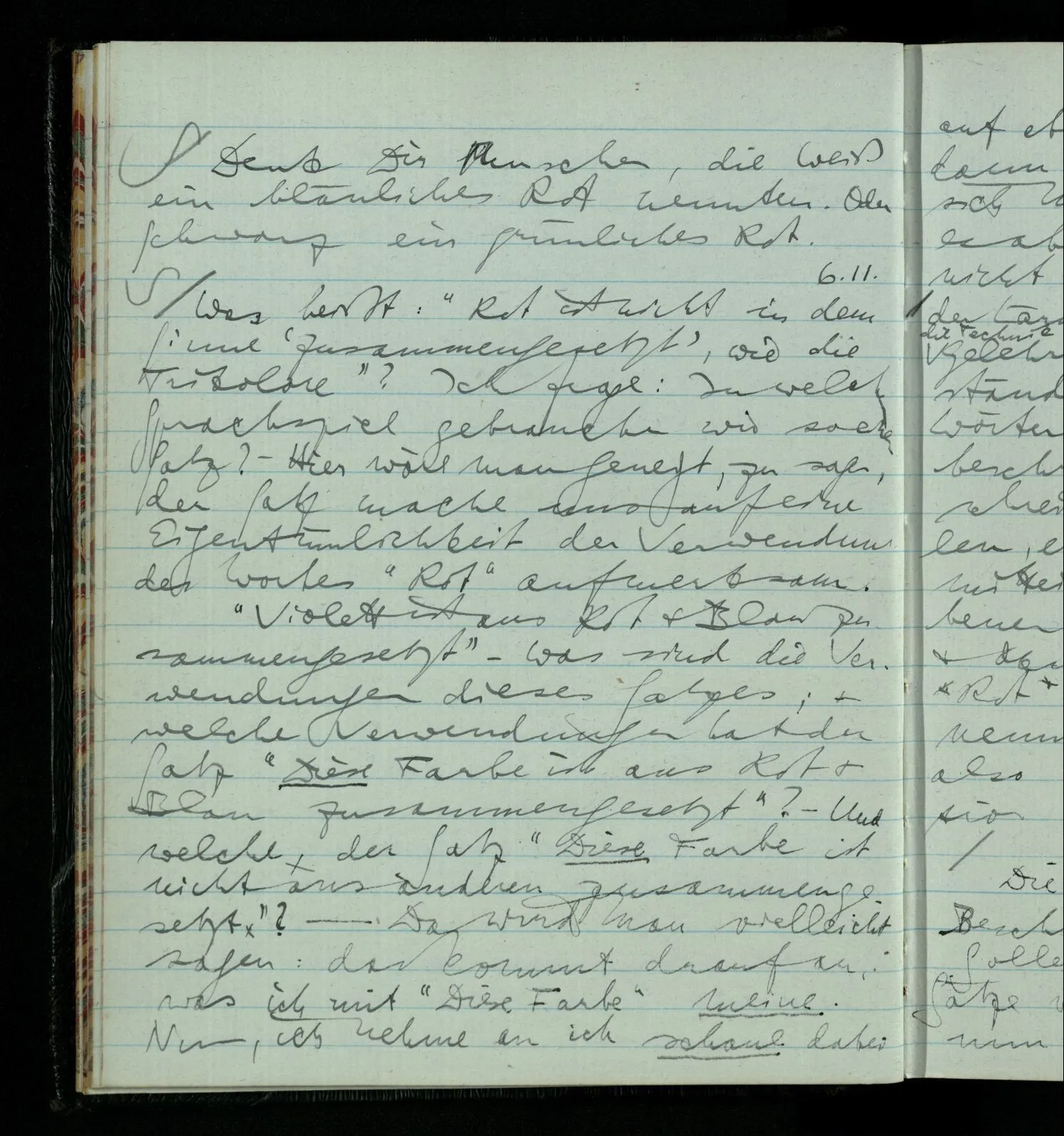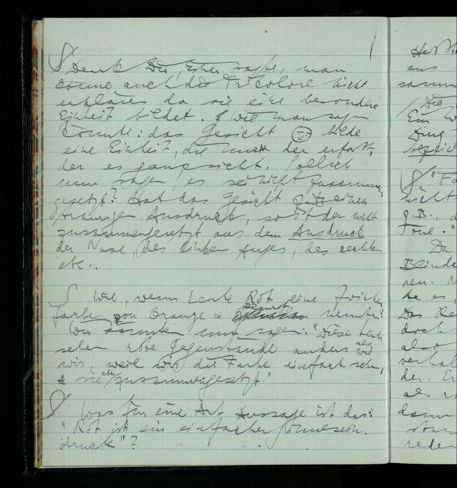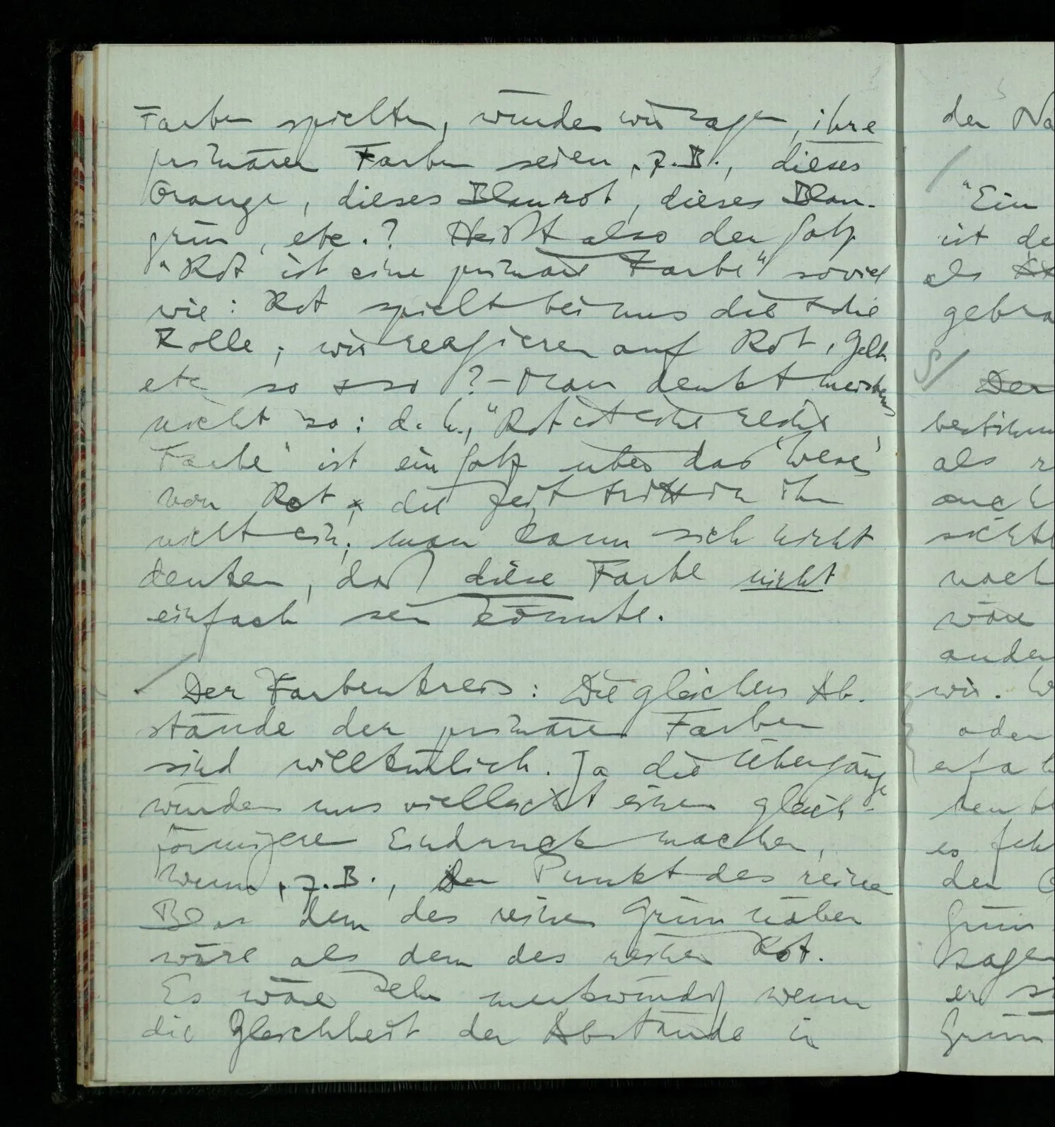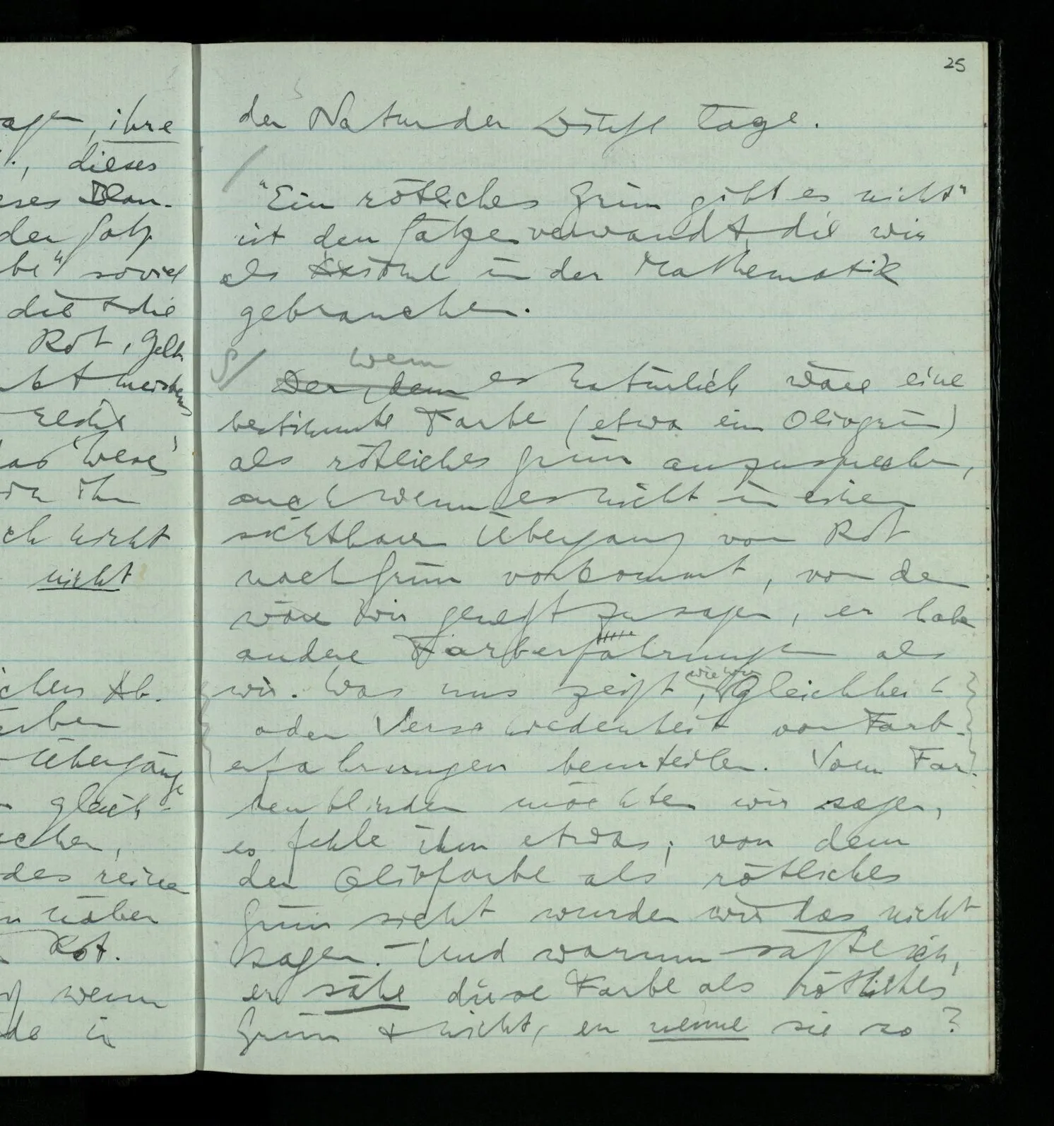 “Der Schmerz, der Ton, der Geschmack, Geruch, hat eine bestimmte Farbe.” Was heißt das? (Qualität. Eigenschaftswort.) Eine Farbe kann grünlich sein, oder bläulich – es gibt ein Gemisch von Farben; & so auch ein Gemisch von Gerüchen, Klängen, Geschmäcken; Qualitative Zwischenstufen. Wie unterscheidet man qualitative von quantitativen Zwischenstufen, ich meine, von Stufen der ‘Intensität’? Noch auszuhalten – nicht mehr auszuhalten, das sind z.B. Grade der Intensität. Denke, jemand fragte: “Wie kann ich wissen, daß, was ich als verschiedene Grade, der Lautheit z.B., empfinde, der Andre nicht als verschiedene Qualitäten, vergleichbar verschiedenen Farben, empfindet?” – Vergleiche die Reaktion zu einer Änderung der Stärke mit der zu einer Änderung der Qualität.