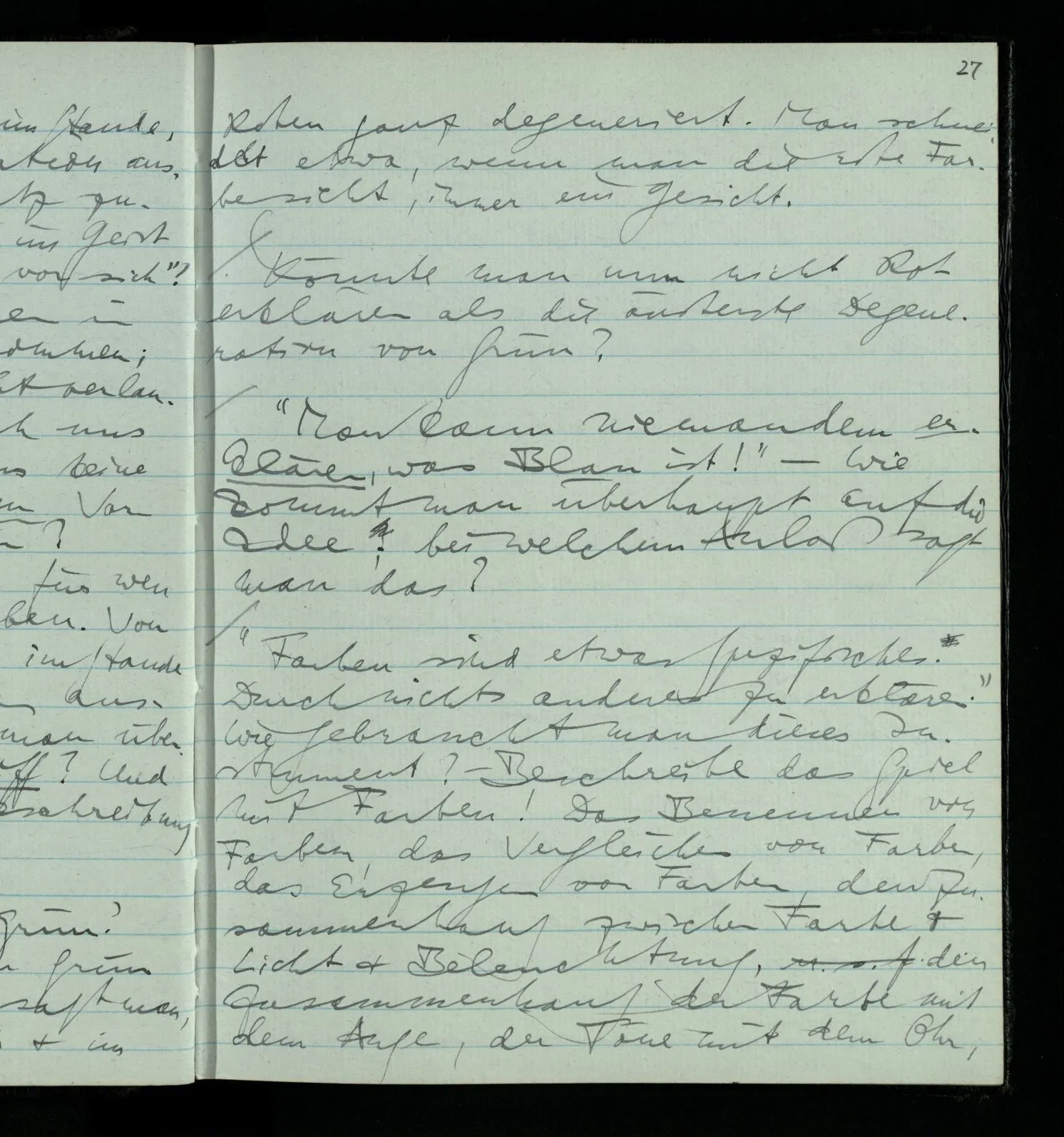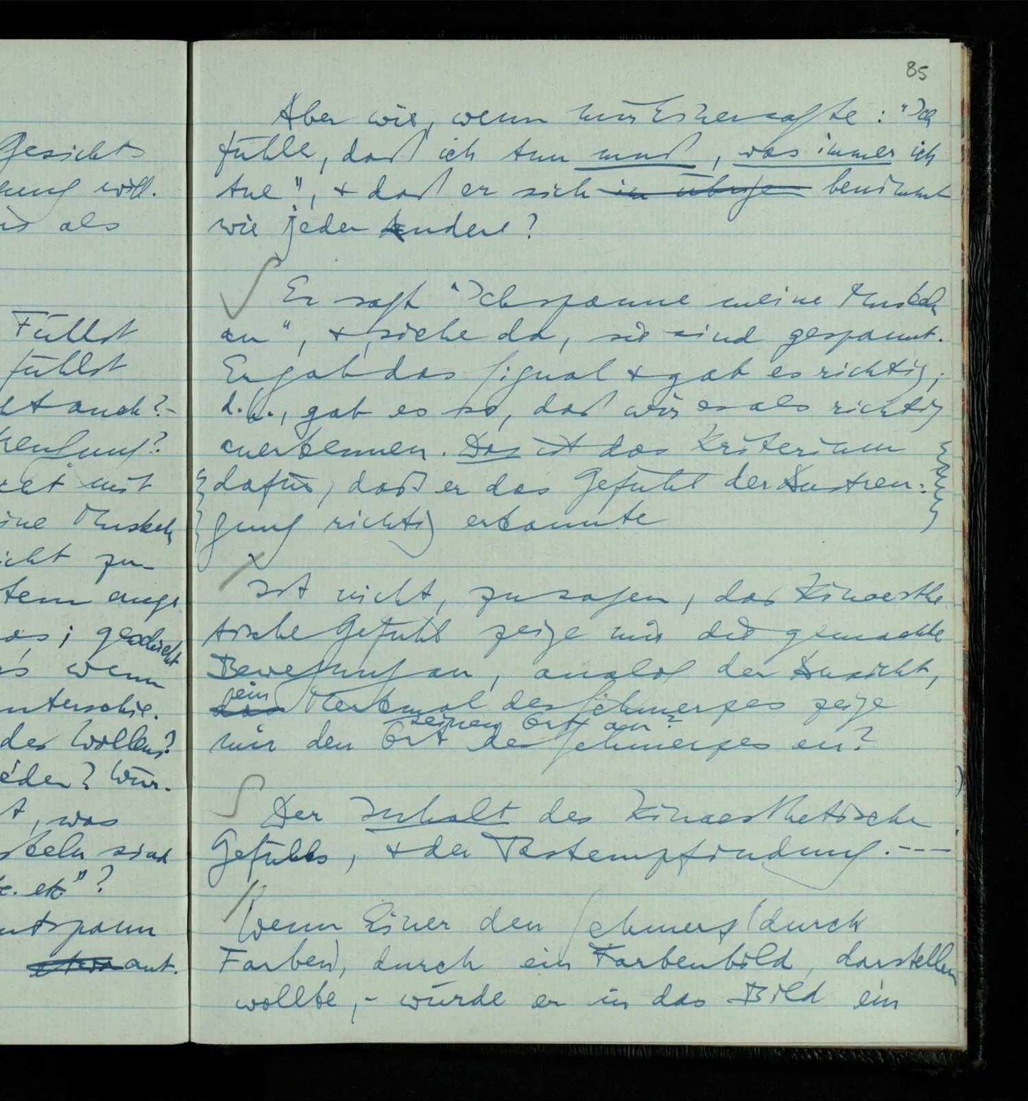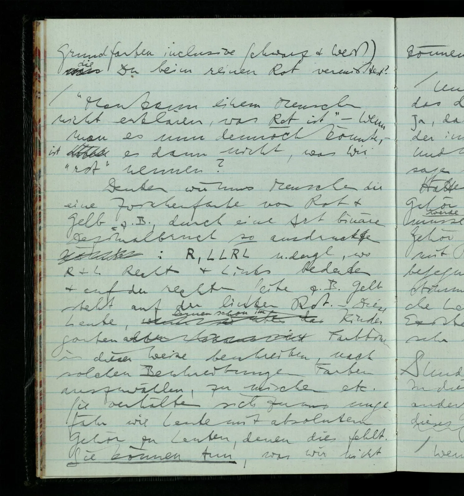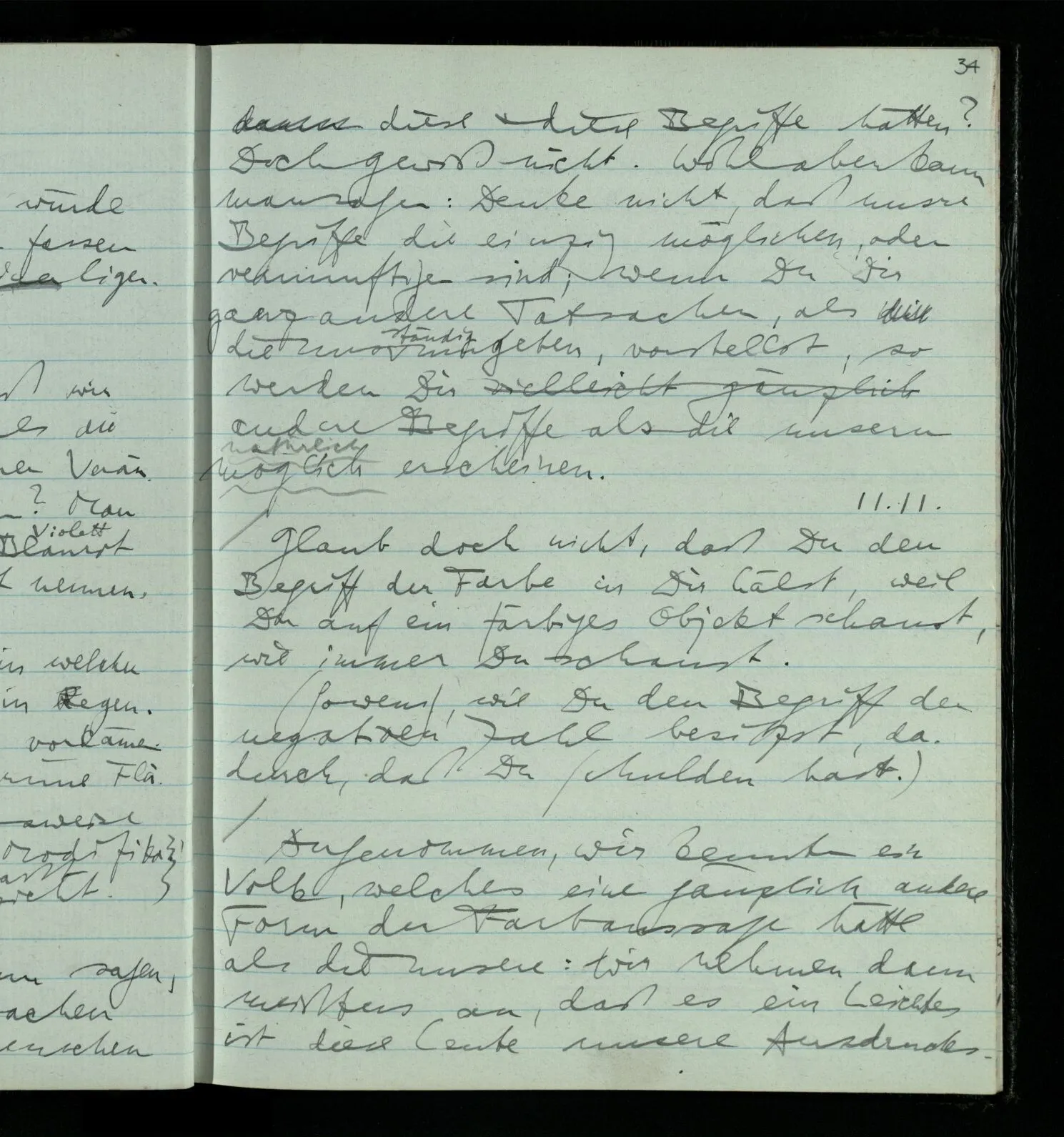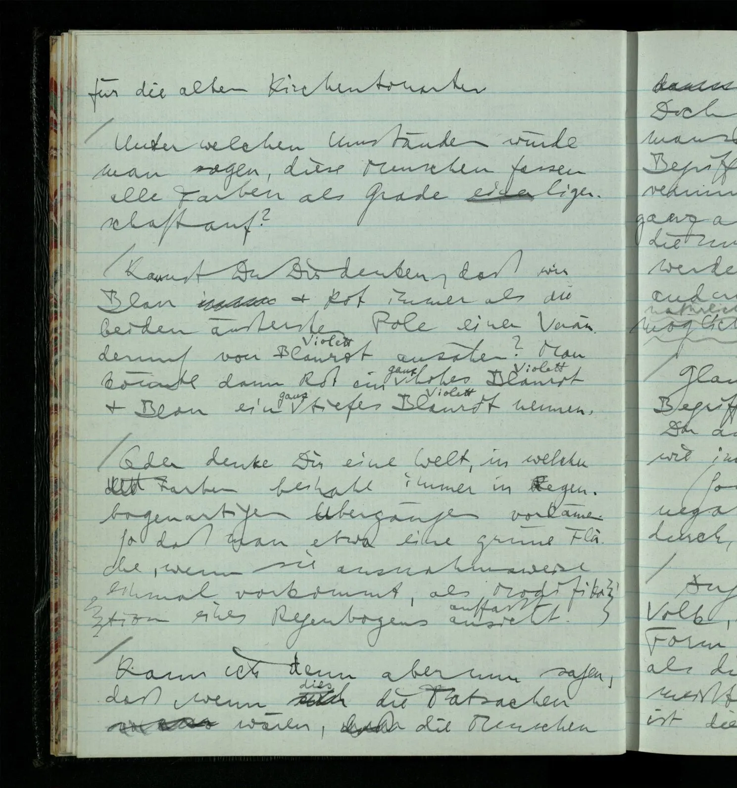 “Der Schmerz, der Ton, der Geschmack, Geruch, hat eine bestimmte Farbe.” Was heißt das? (Qualität. Eigenschaftswort.) Eine Farbe kann grünlich sein, oder bläulich – es gibt ein Gemisch von Farben; & so auch ein Gemisch von Gerüchen, Klängen, Geschmäcken; Qualitative Zwischenstufen. Wie unterscheidet man qualitative von quantitativen Zwischenstufen, ich meine, von Stufen der ‘Intensität’? Noch auszuhalten – nicht mehr auszuhalten, das sind z.B. Grade der Intensität. Denke, jemand fragte: “Wie kann ich wissen, daß, was ich als verschiedene Grade, der Lautheit z.B., empfinde, der Andre nicht als verschiedene Qualitäten, vergleichbar verschiedenen Farben, empfindet?” – Vergleiche die Reaktion zu einer Änderung der Stärke mit der zu einer Änderung der Qualität.