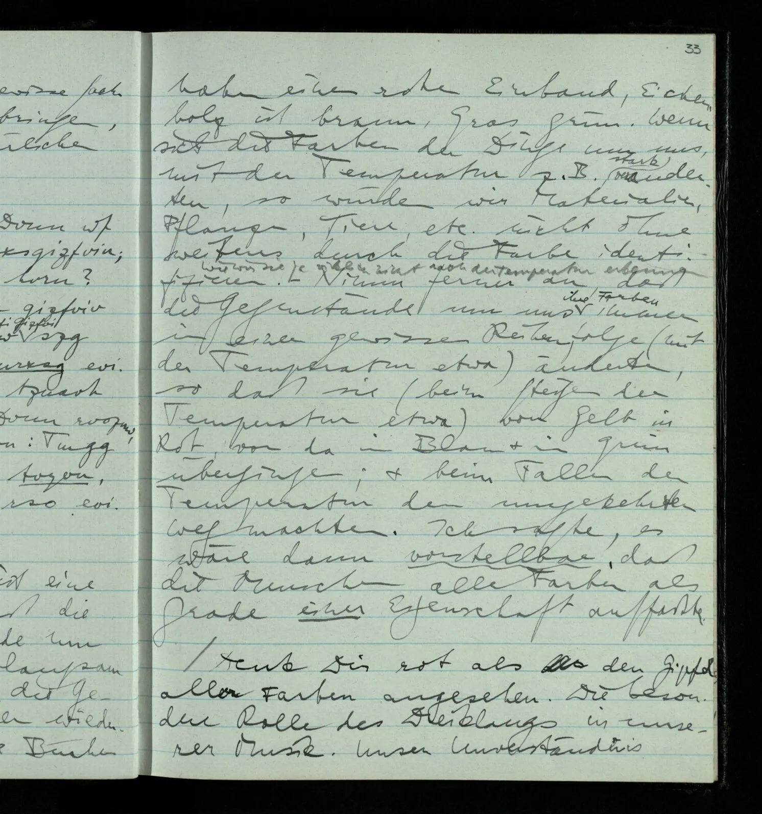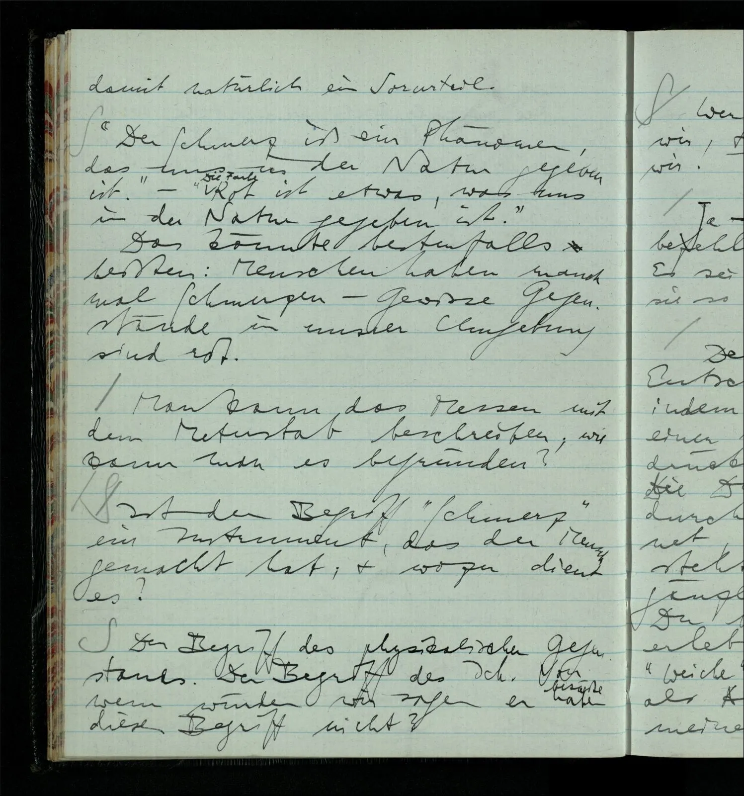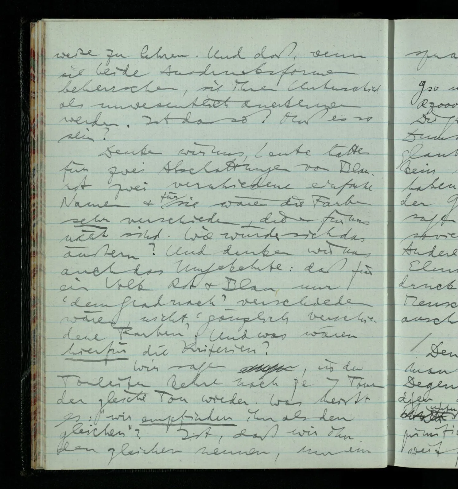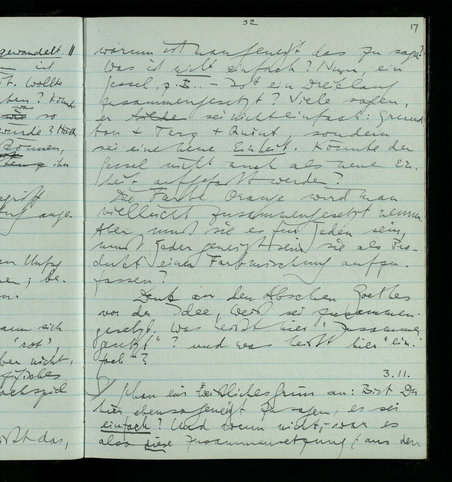 “Der Schmerz, der Ton, der Geschmack, Geruch, hat eine bestimmte Farbe.” Was heißt das? (Qualität. Eigenschaftswort.) Eine Farbe kann grünlich sein, oder bläulich – es gibt ein Gemisch von Farben; & so auch ein Gemisch von Gerüchen, Klängen, Geschmäcken; Qualitative Zwischenstufen. Wie unterscheidet man qualitative von quantitativen Zwischenstufen, ich meine, von Stufen der ‘Intensität’? Noch auszuhalten – nicht mehr auszuhalten, das sind z.B. Grade der Intensität. Denke, jemand fragte: “Wie kann ich wissen, daß, was ich als verschiedene Grade, der Lautheit z.B., empfinde, der Andre nicht als verschiedene Qualitäten, vergleichbar verschiedenen Farben, empfindet?” – Vergleiche die Reaktion zu einer Änderung der Stärke mit der zu einer Änderung der Qualität.