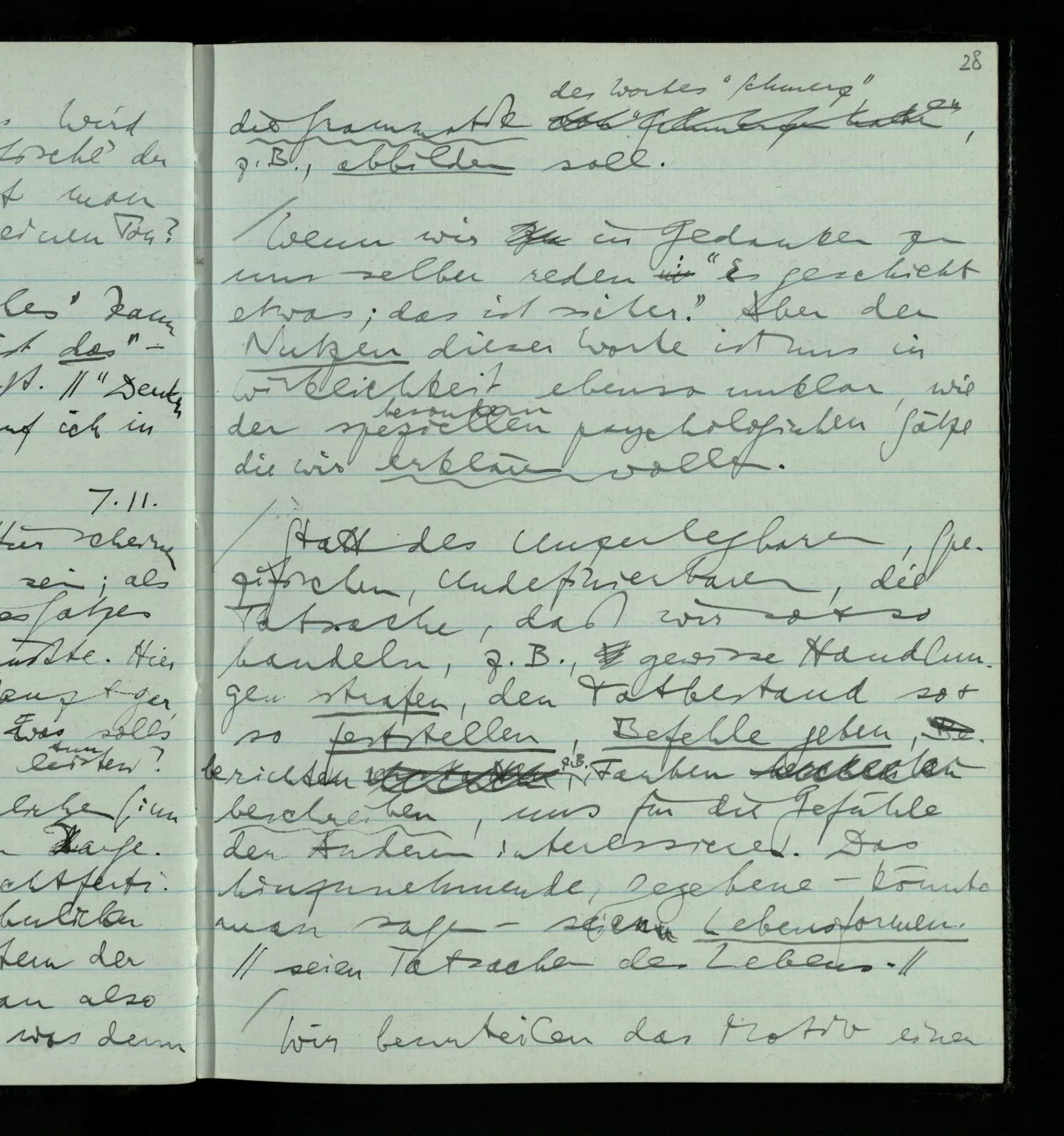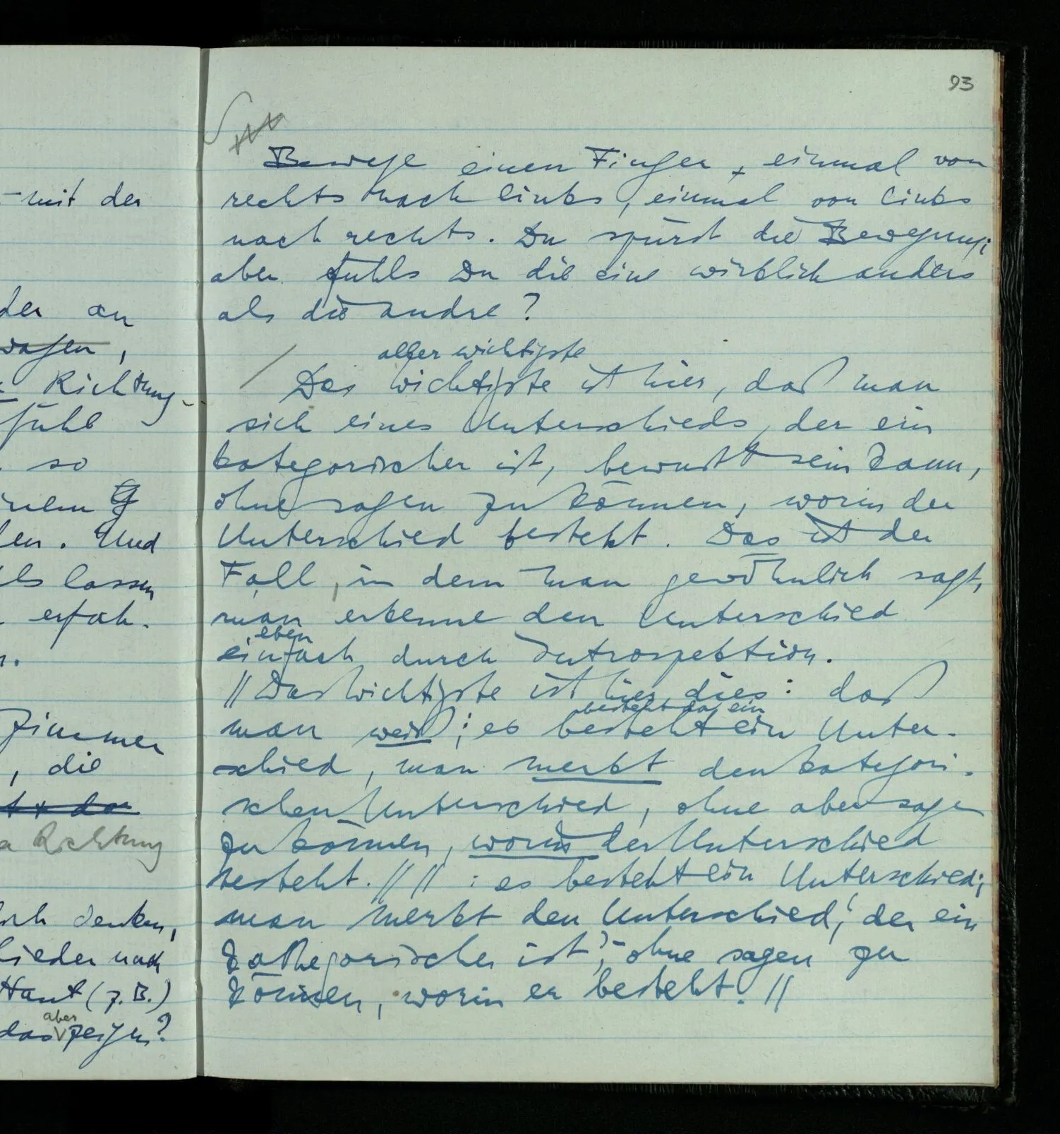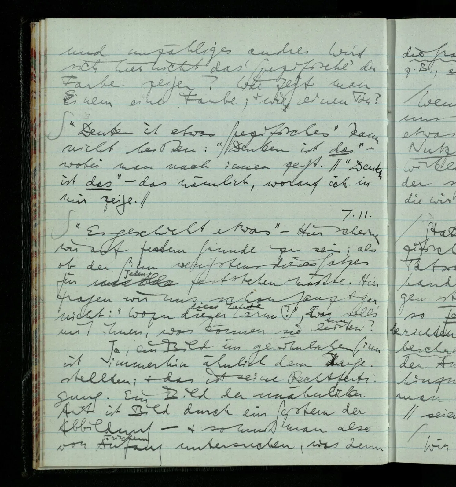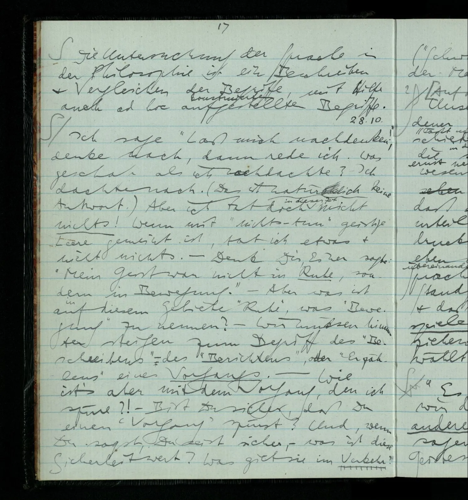 28.10.1946 Ich sage “Laß mich nachdenken!”, denke nach, dann rede ich. Was geschah als ich nachdachte? – Ich dachte nach. (Das ist natürlich keine Antwort.) Aber ich tat doch in dieser Zeit nicht nichts! Wenn mit “nichts tun” geistige Leere gemeint ist, tat ich etwas & nicht nichts. – Denk Dir, Einer sagte: “Mein Geist war nicht in Ruhe, sondern in Bewegung.” – Aber was ist auf diesem Gebiete “Ruhe”, was “Bewegung” zu nennen? – Wir müssen hinunter steigen zum Begriff des “Beschreibens” – des “Berichtens”, oder “Erzählens” eines Vorgangs. – Wie ist’s aber mit dem Vorgang, den ich spüre?! – Bist Du sicher, daß Du einen ‘Vorgang’ spürst? Und, wenn Du sagst, Du seist sicher, – was ist diese Sicherheit wert? Was gilt sie im Verkehr? (“Schwarz, eine Gesichtsempfindung, oder der Mangel einer Gesichtsempfindung?”)