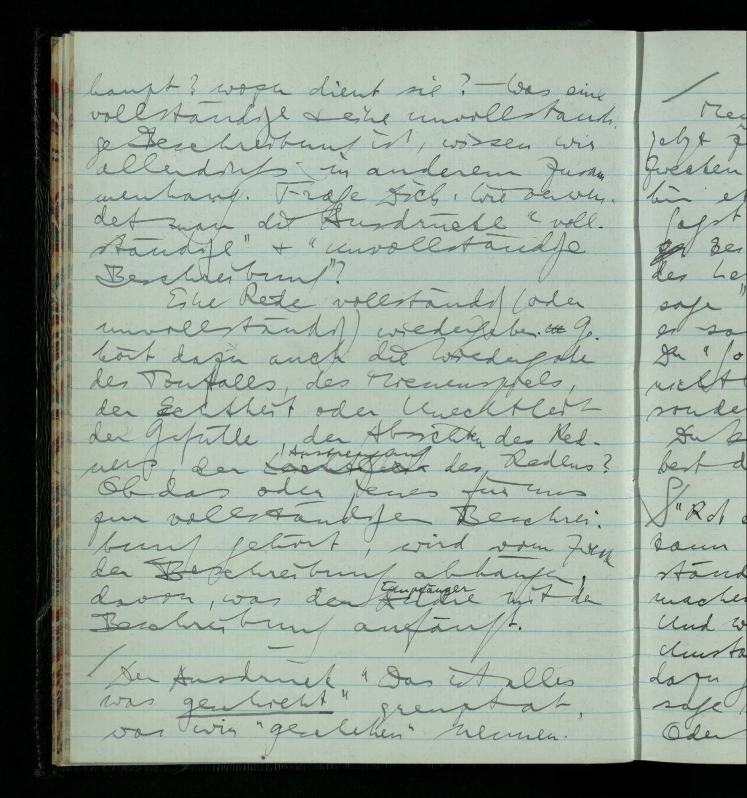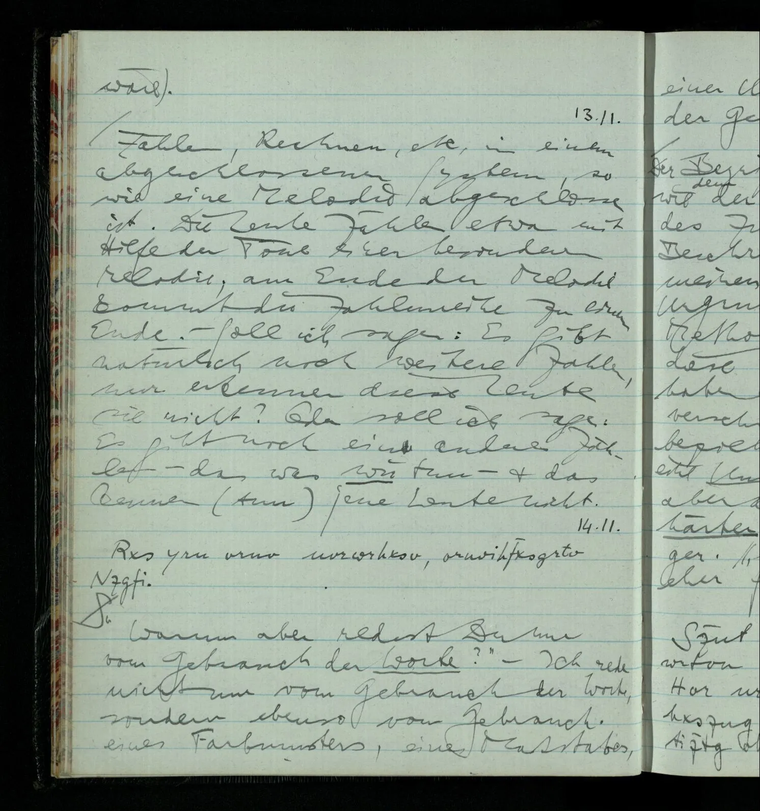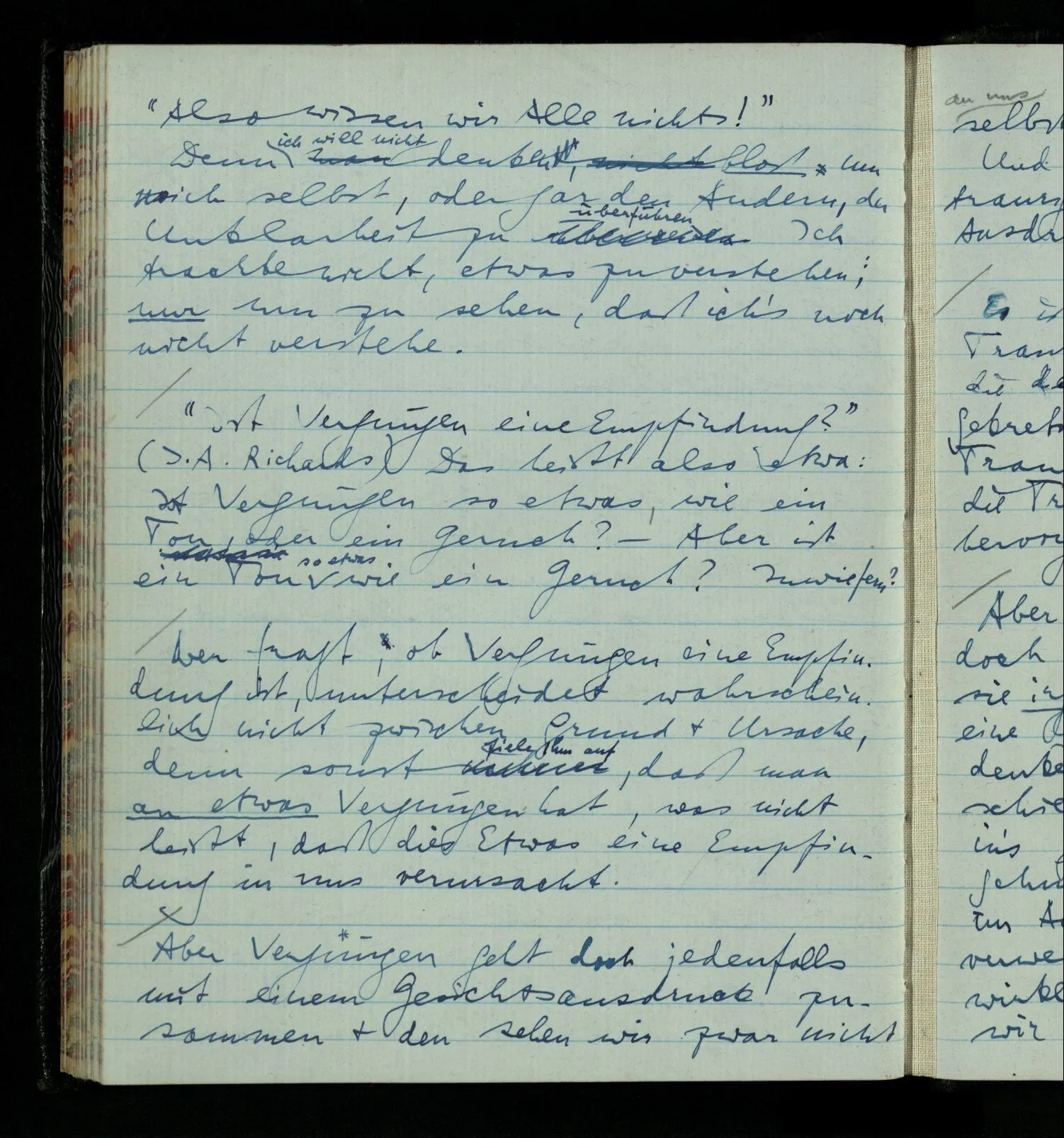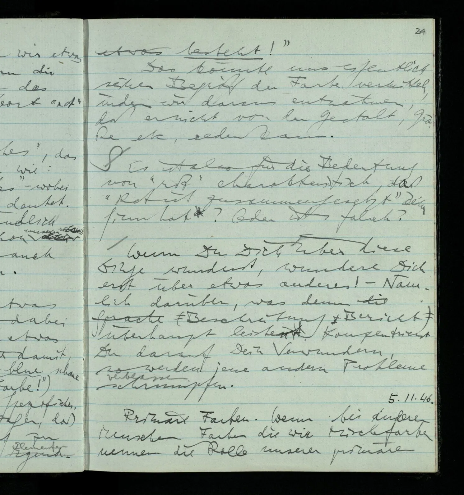 28.10.1946 Ich sage “Laß mich nachdenken!”, denke nach, dann rede ich. Was geschah als ich nachdachte? – Ich dachte nach. (Das ist natürlich keine Antwort.) Aber ich tat doch in dieser Zeit nicht nichts! Wenn mit “nichts tun” geistige Leere gemeint ist, tat ich etwas & nicht nichts. – Denk Dir, Einer sagte: “Mein Geist war nicht in Ruhe, sondern in Bewegung.” – Aber was ist auf diesem Gebiete “Ruhe”, was “Bewegung” zu nennen? – Wir müssen hinunter steigen zum Begriff des “Beschreibens” – des “Berichtens”, oder “Erzählens” eines Vorgangs. – Wie ist’s aber mit dem Vorgang, den ich spüre?! – Bist Du sicher, daß Du einen ‘Vorgang’ spürst? Und, wenn Du sagst, Du seist sicher, – was ist diese Sicherheit wert? Was gilt sie im Verkehr? (“Schwarz, eine Gesichtsempfindung, oder der Mangel einer Gesichtsempfindung?”)