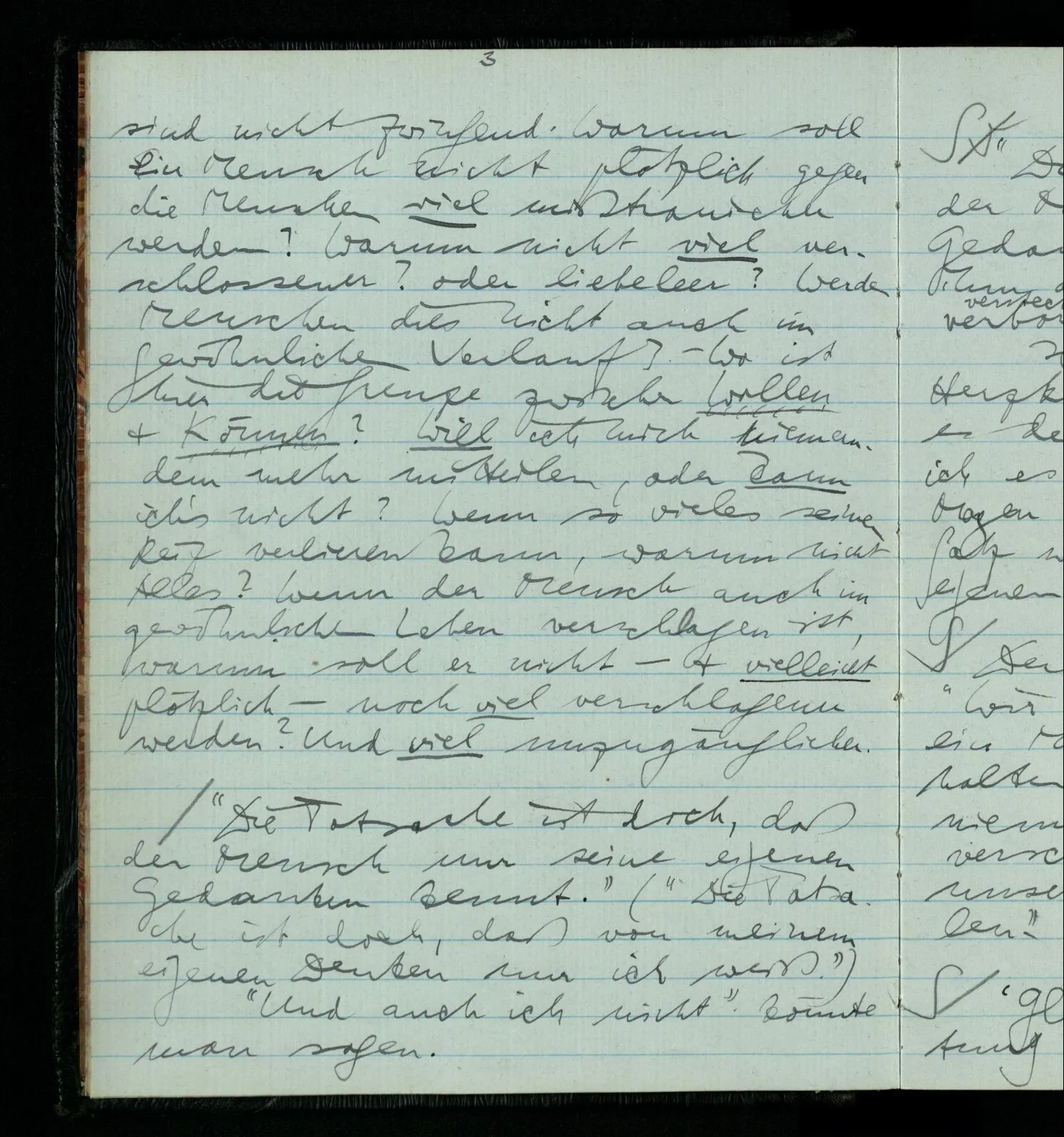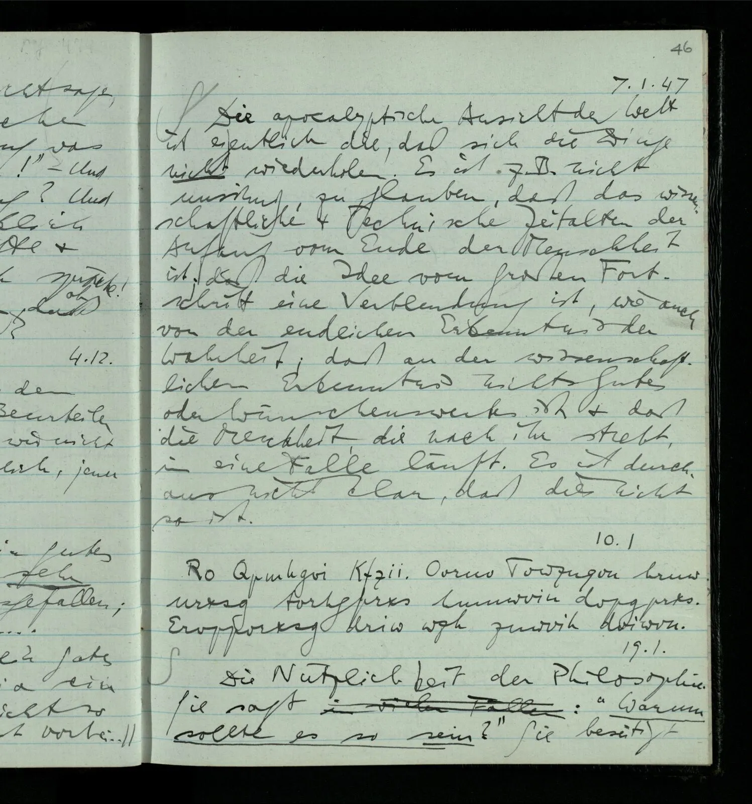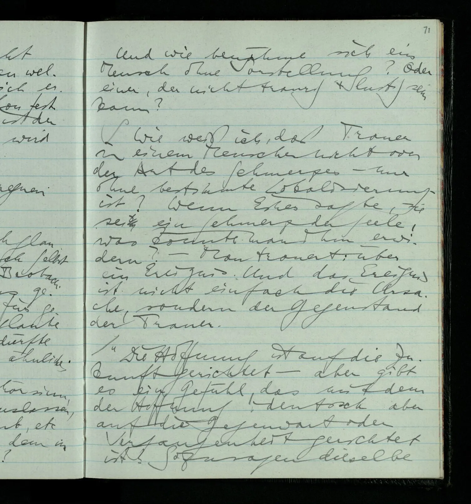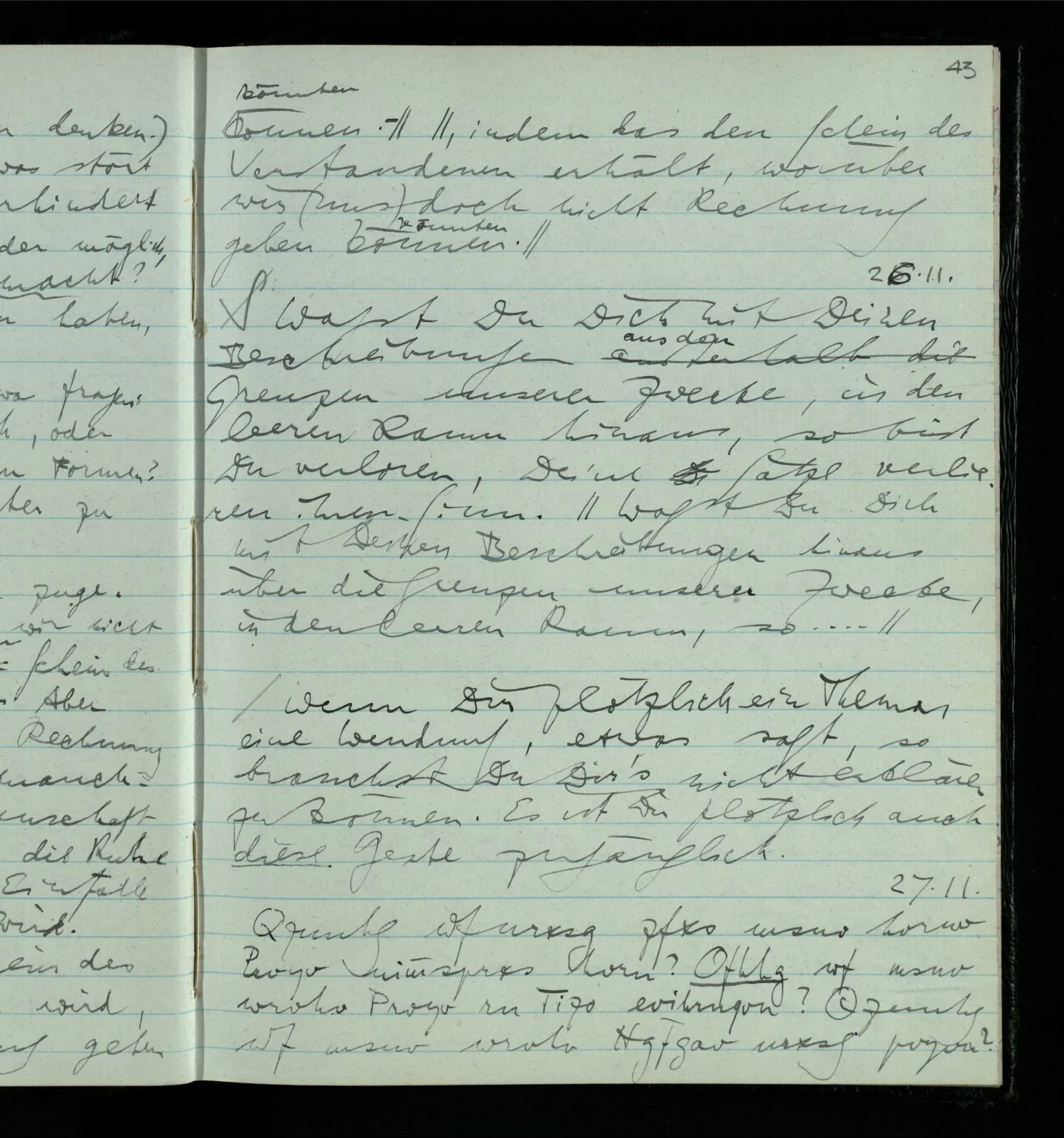 26.10.1946 Die Liebe ist ein Glück. Vielleicht ein Glück mit Schmerzen, aber ein Glück. Fehlt das Glück, oder schrumpft es auf ein kurzes Aufflackern zusammen, so fehlt die Liebe. – In der Liebe muß ich sicher ruhen können. – Aber kannst du ein warmes Herz zurückweisen? Ist es ein Herz, das warm für mich schlägt? – ‘I’ll rather do anything than to hurt the soul of friendship.’ – I must know: he won’t hurt our friendship. Der Mensch kann aus seiner Haut nicht heraus. Ich kann nicht eine Forderung, die tief in mir, mit meinem ganzen Leben verankert, liegt, aufgeben. Denn die Liebe ist mit der Natur verbunden; und würde ich unnatürlich, so müßte die Liebe aufhören. – Kann ich sagen: “Ich werde vernünftig sein, & das nicht mehr verlangen.”? Bei manchem geht es. Es geht vielleicht bei den meisten für eine Zeit. Aber doch nur als Mittel zu einem andern Ende, nicht als Ende. Ich kann sagen: Laß ihn gewähren, – es wird einmal anders werden. – Die Liebe, die ist die Perle von großem Wert, die man am Herzen hält, für die man nichts eintauschen will, die man als das Wertvollste schätzt. Sie zeigt einem überhaupt – wenn man sie hat – was großer Wert ist. Man lernt, was es heißt: den Wert erkennen. Man lernt, was es heißt: ein Edelmetall von allen andern aussondern. Die ungeheure Vorliebe dafür lehrt uns die Idee des einzigartigen Wertes. Die ungeheure Vorliebe führt uns dazu zu sehen: es ist unsere Pflicht das zu verteidigen. Die Vorliebe führt uns zum Ernst. Die Leidenschaft, zum Ernst. – Tut das die Vorliebe nicht, so ist sie nicht Liebe. Das Furchtbare ist die Ungewißheit. Und in der Ungewißheit beschäftigt sich mein Geist immer damit, mir Möglichkeiten, und fast immer schlechte auszumalen. Das ist manchmal recht, meistens aber übel. “Auf Gott vertrauen”. Aber vom Gottvertrauen bin ich weit entfernt. Von da, wo ich bin, zum Gottvertrauen ist ein weiter Weg. Freudevolle Hoffnung und Furcht sind einander verschwistert. Ich kann die eine nicht haben ohne daß sie an die andre grenzt.