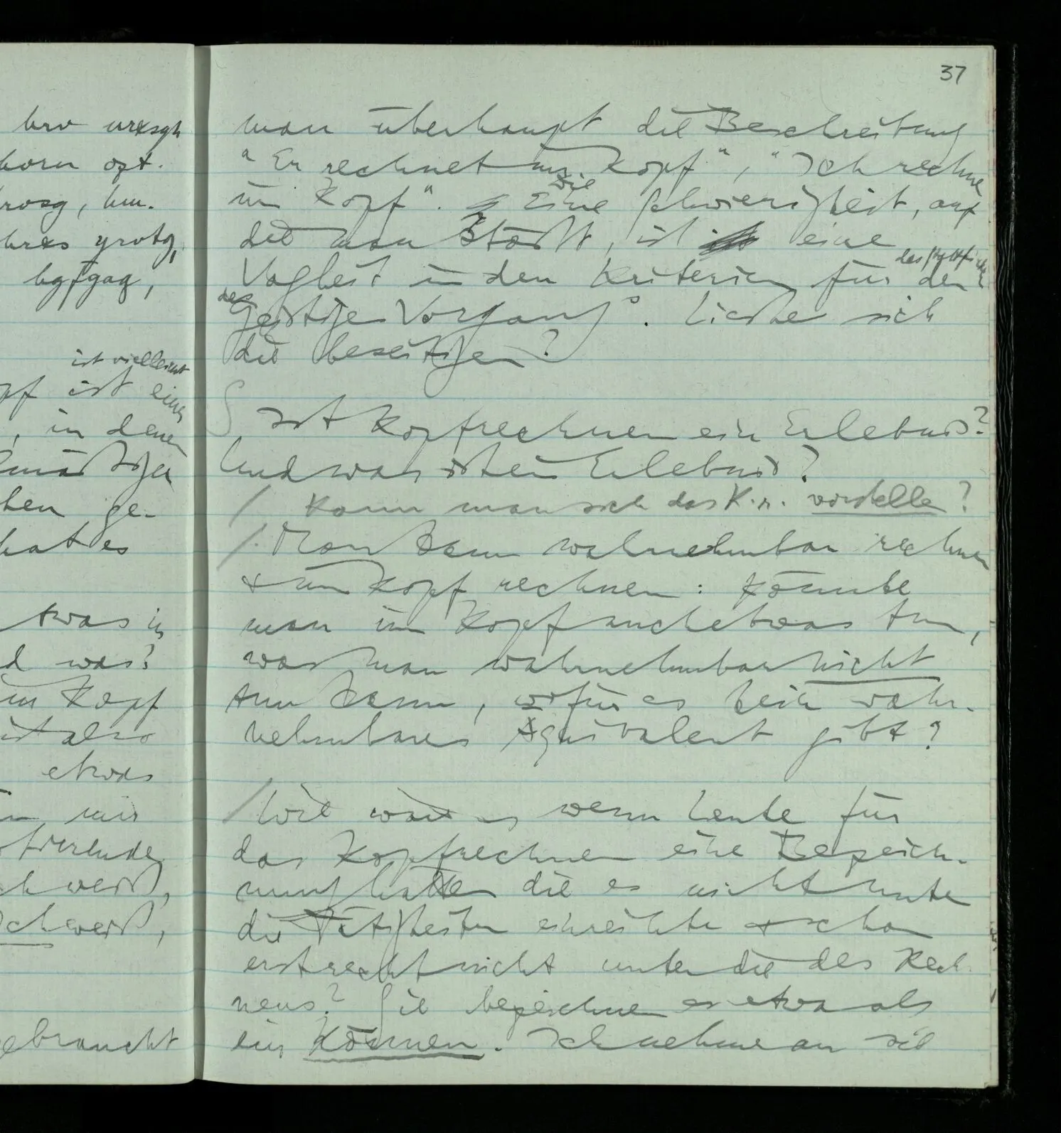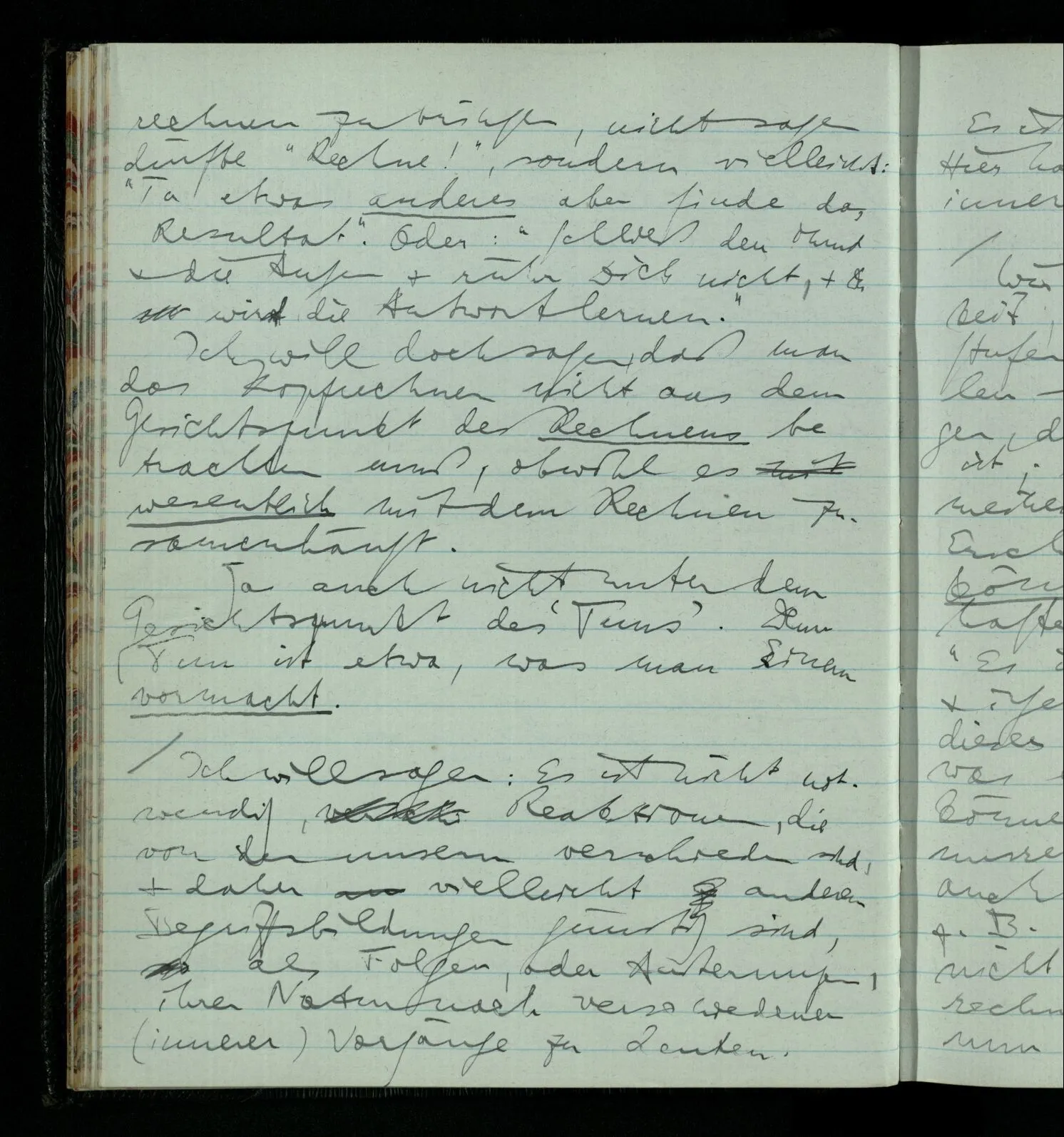 Man kann nicht sagen, das Schreiben in’s Notizbuch, oder das monologische Sprechen, sei dem stummen Denken ‘ähnlich’; wohl aber kann der eine Vorgang den andern (das Kopfrechnen das Rechnen auf dem Papier, z.B.) für gewisse Zwecke ersetzen.