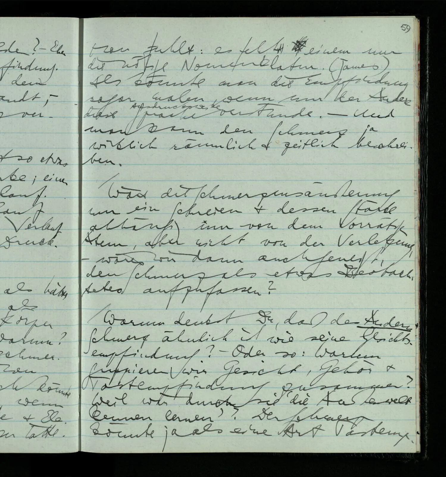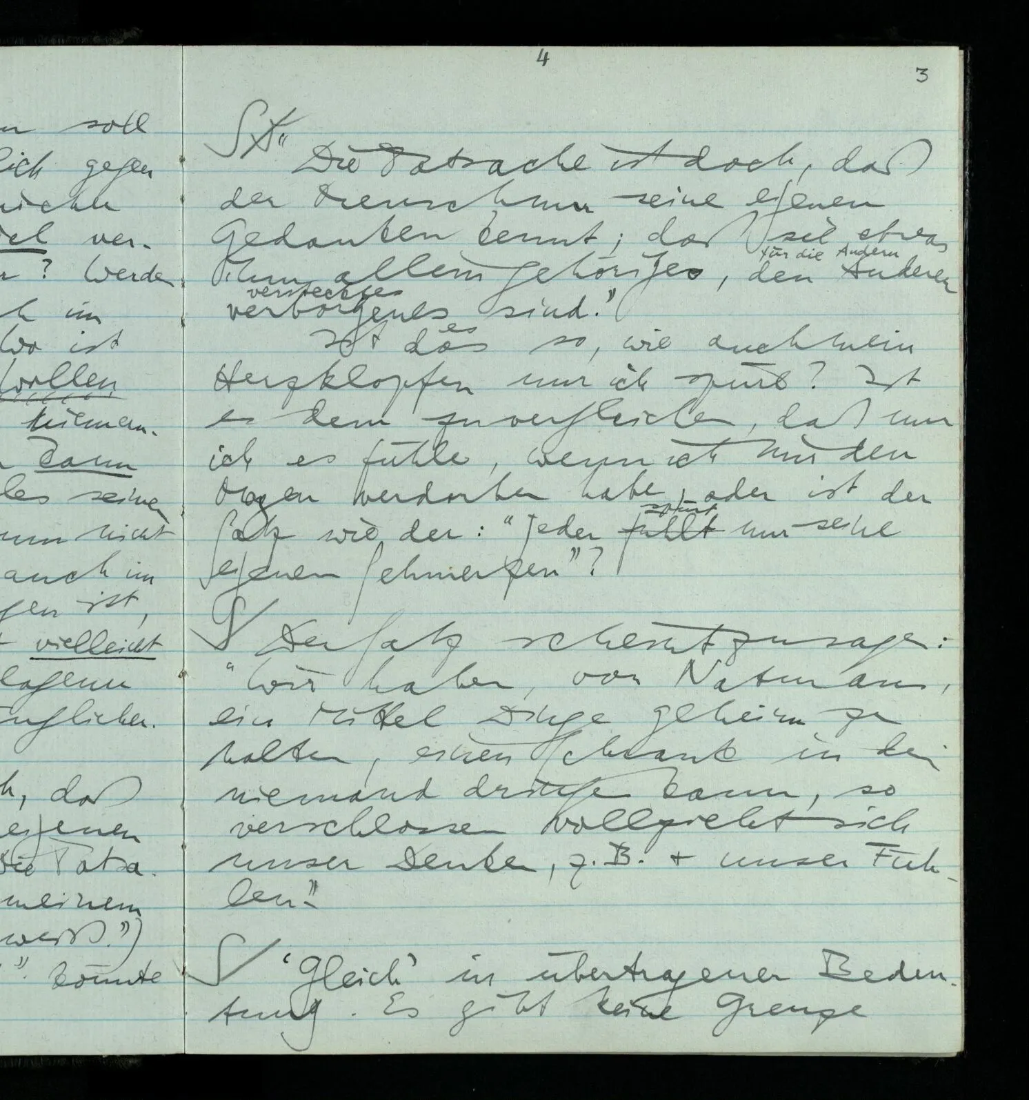 “Die Tatsache ist doch, daß der Mensch nur seine eigenen Gedanken kennt; daß sie etwas ihm allein gehöriges, den Anderen verborgenes sind.” Ist das so, wie auch mein Herzklopfen nur ich spüre? Ist es dem zu vergleichen, daß nur ich es fühle, wenn ich mir den Magen verdorben habe, oder ist der Satz wie der: “Jeder spürt nur seine eigenen Schmerzen”?