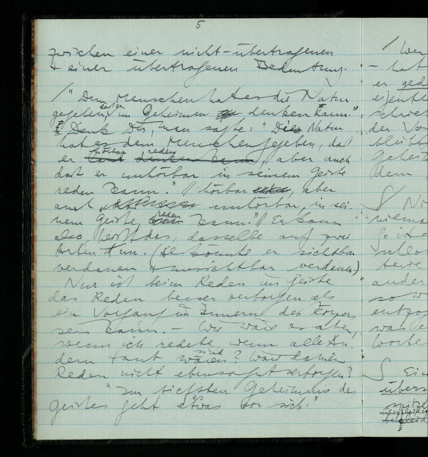 “Dem Menschen hat es die Natur gegeben, daß er im Geheimen denken kann.” Denk Dir, man sagte: “Die Natur hat es dem Menschen gegeben, daß er hörbar reden, aber auch daß er unhörbar in seinem Geiste reden kann.” Er kann also, heißt das, dasselbe auf zwei Arten tun. (Als könnte er sichtbar verdauen und unsichtbar verdauen.) Nur ist beim Reden im Geiste das Reden besser verborgen als ein Vorgang im Innern des Körpers sein kann. – Wie wäre es aber, wenn ich redete, wenn alle Andern taub wären? Wäre da mein Reden nicht ebensogut verborgen? “Im tiefsten Geheimnis des Geistes geht etwas vor sich.”