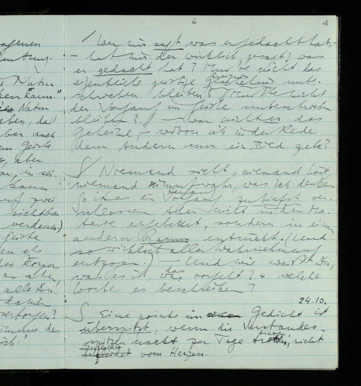 24.10.1946 Eine Pointe im Gedicht ist überspitzt, wenn die Verstandesspitzen nackt zu Tage treten, nicht überkleidet vom Herzen.