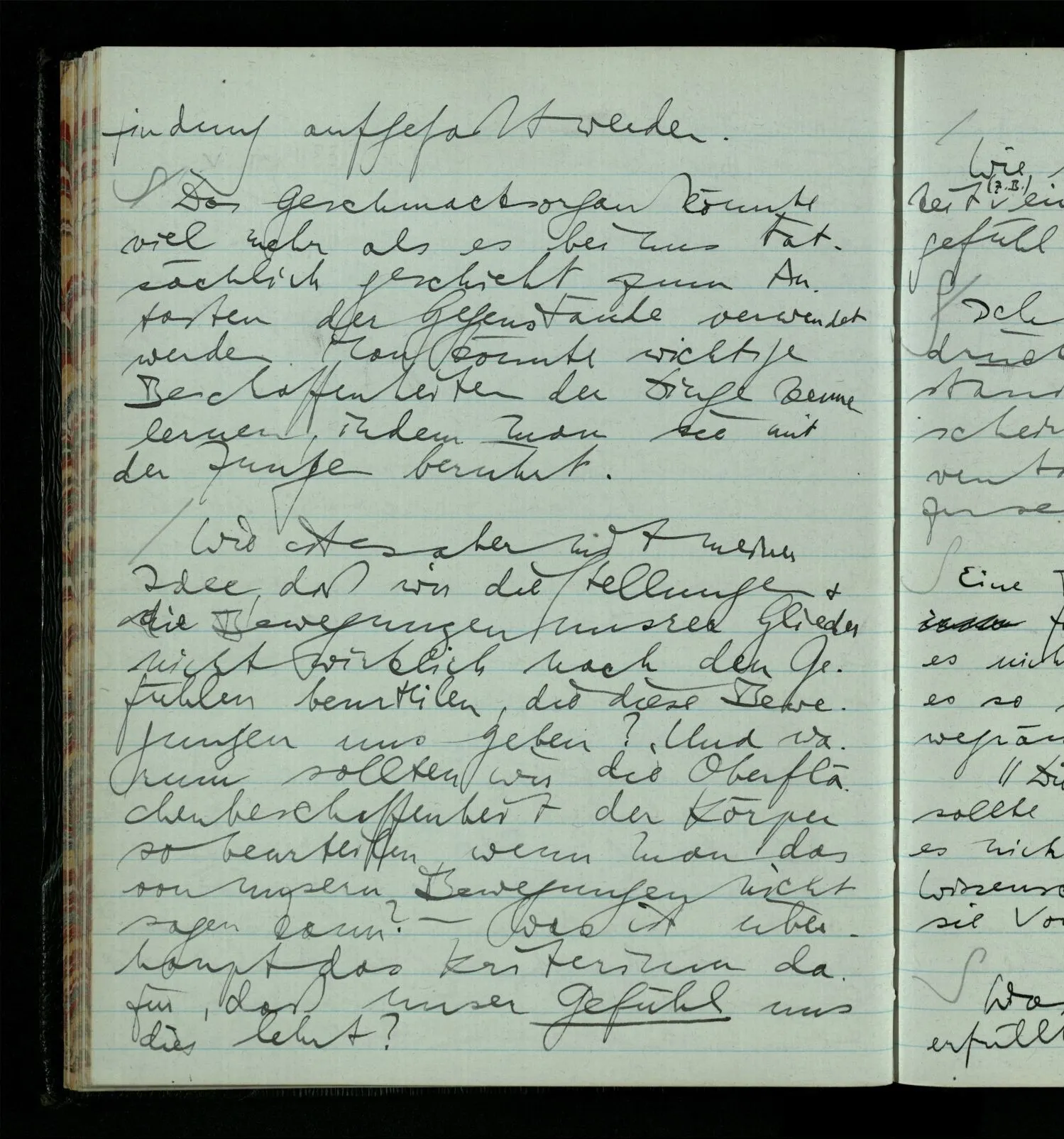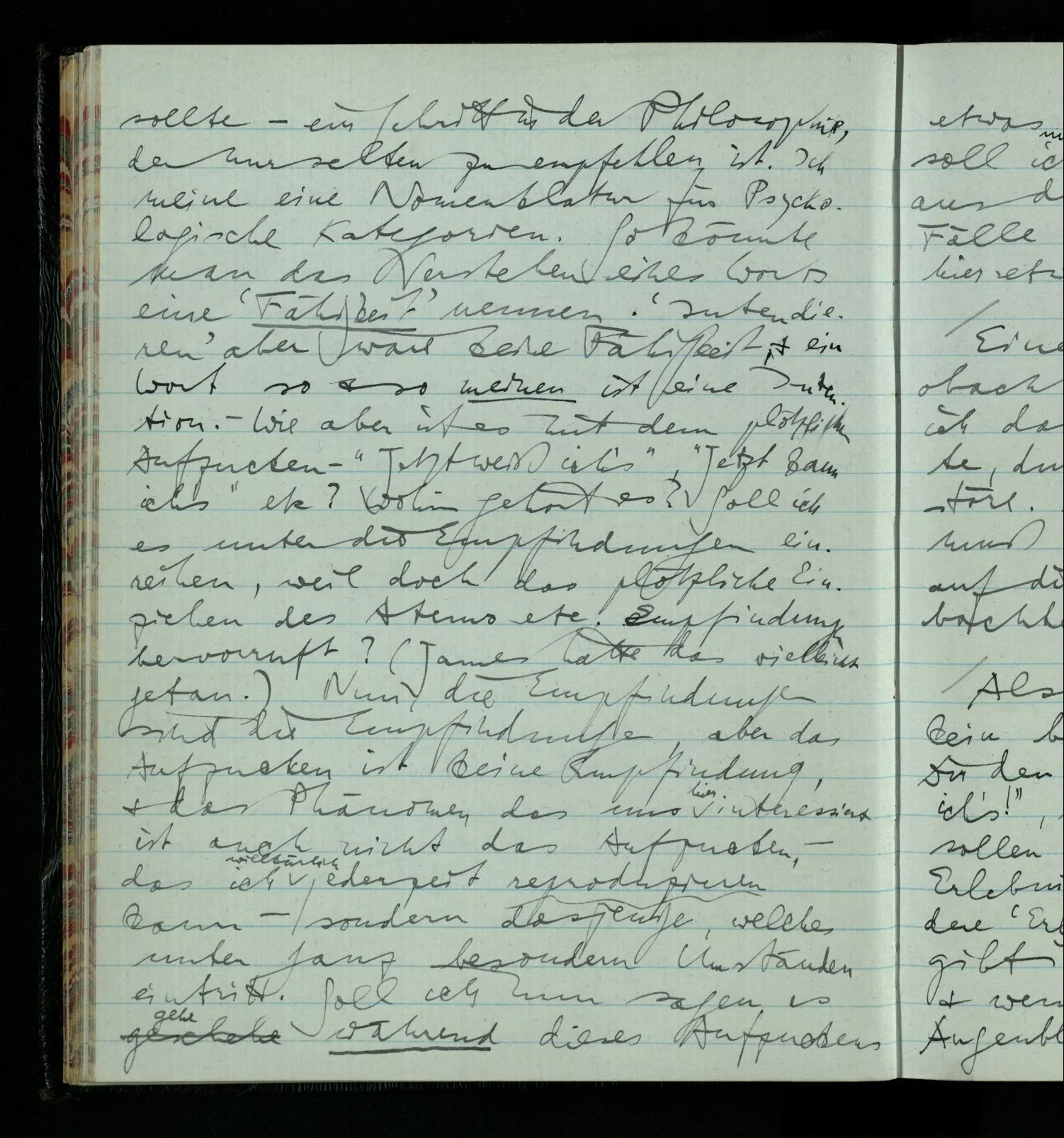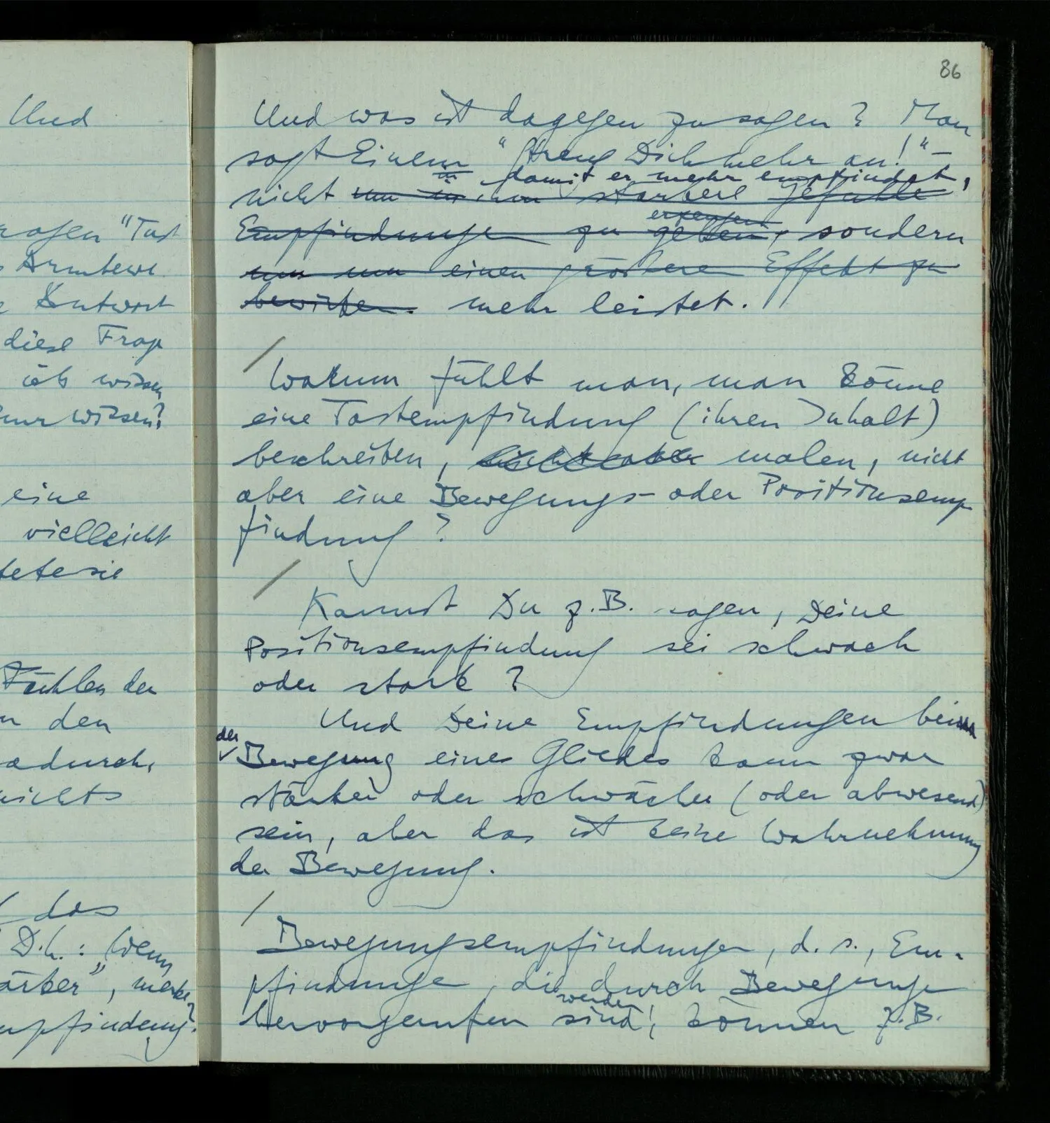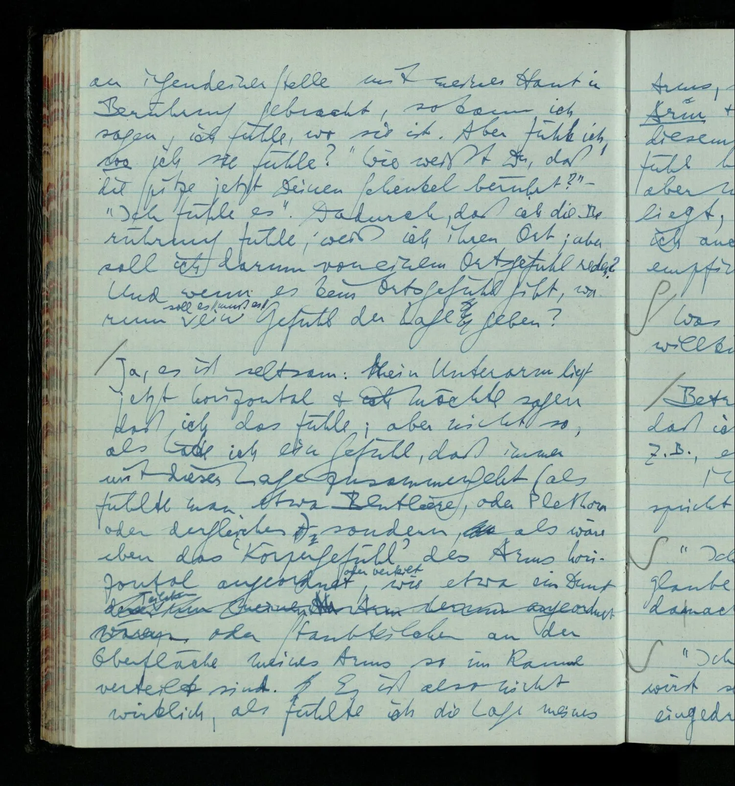 Ja, es ist seltsam: Mein Unterarm liegt jetzt horizontal & ich möchte sagen daß ich das fühle; aber nicht so, als hätte ich ein Gefühl, daß immer mit dieser Lage zusammengeht (als fühlte man etwa Blutleere, oder Plethora oder dergleichen) – sondern, als wäre eben das ‘Körpergefühl’ des Arms horizontal angeordnet oder verteilt, wie etwa ein Dunst oder Staubteilchen an der Oberfläche meines Arms so im Raume verteilt sind. Es ist also nicht wirklich, als fühlte ich die Lage meines Arms, sondern als fühlte ich meinen Arm & fühlte ihn in dieser Lage, in diesem Ort. Das heißt aber nur: ich weiß einfach, wie er liegt, ohne es zu wissen: weil …. Wie ich auch weiß, wo ich den Schmerz empfinde, es aber nicht weiß: weil ….