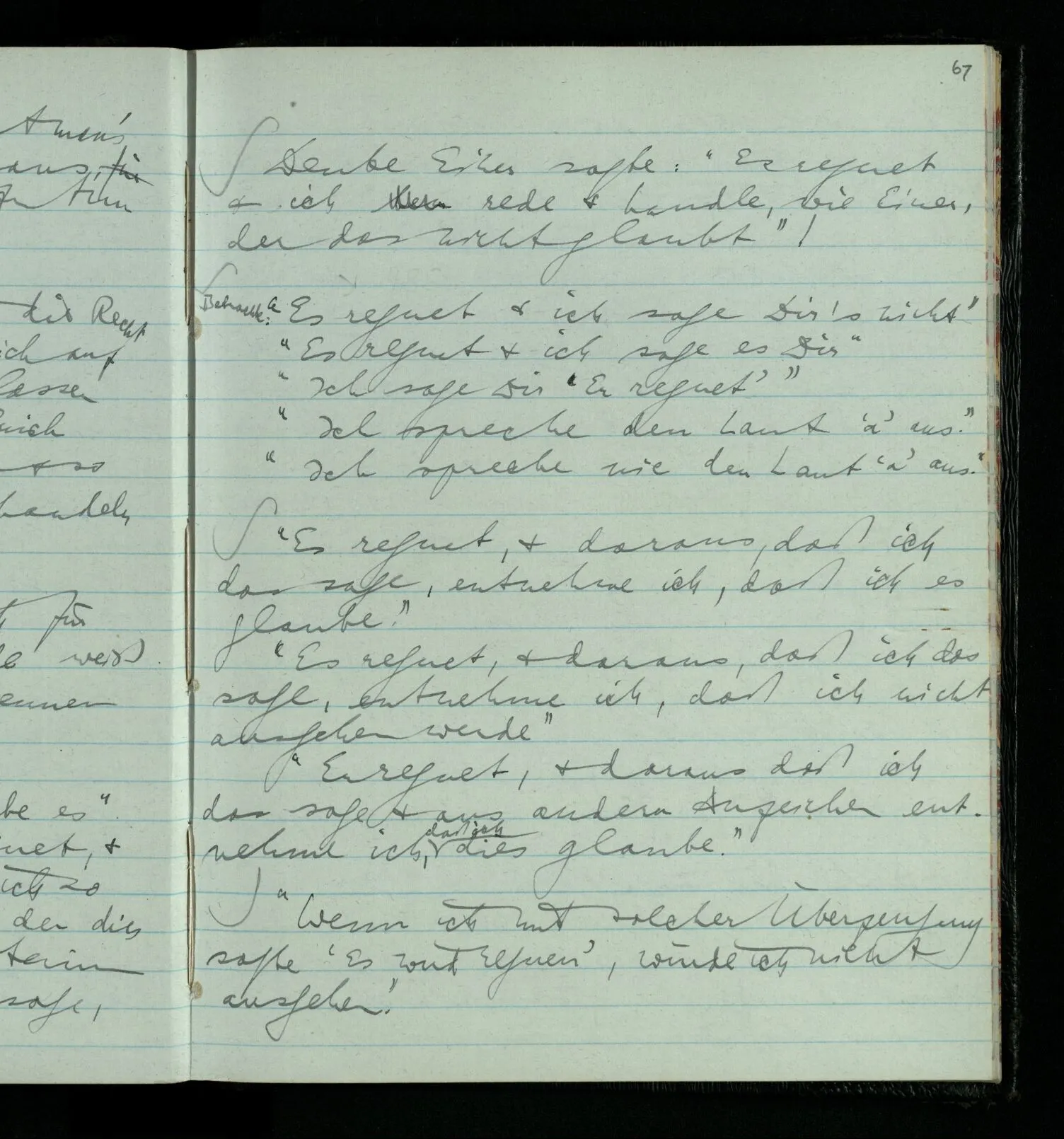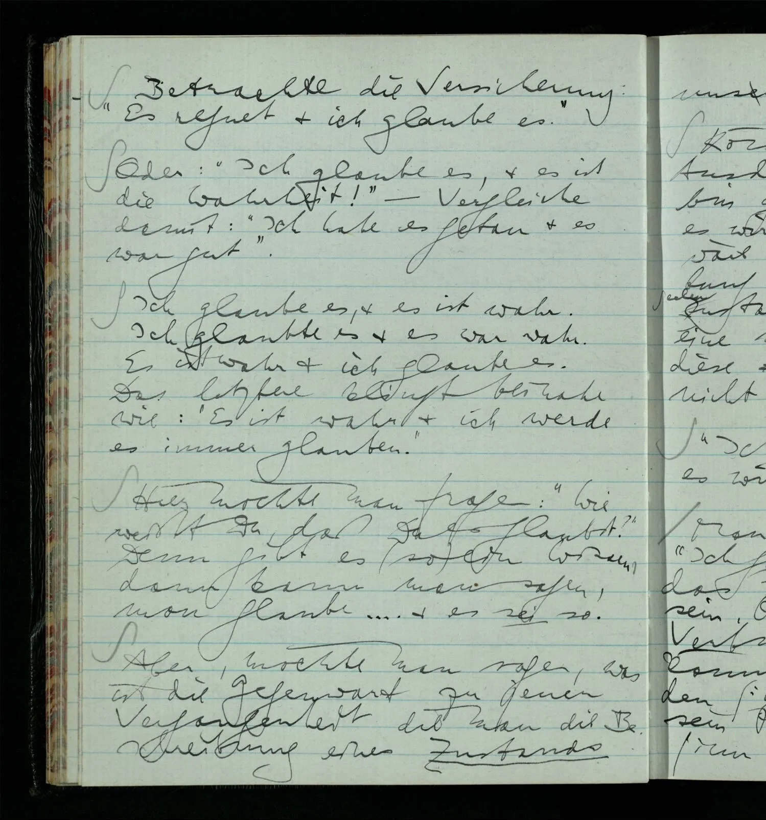 Betrachte: – “Es ist nicht wahr, daß ich immer das Falsche glaube. Z.B., es regnet jetzt, & ich glaube es.” Man könnte von ihm sagen: Er spricht wie zwei Menschen.