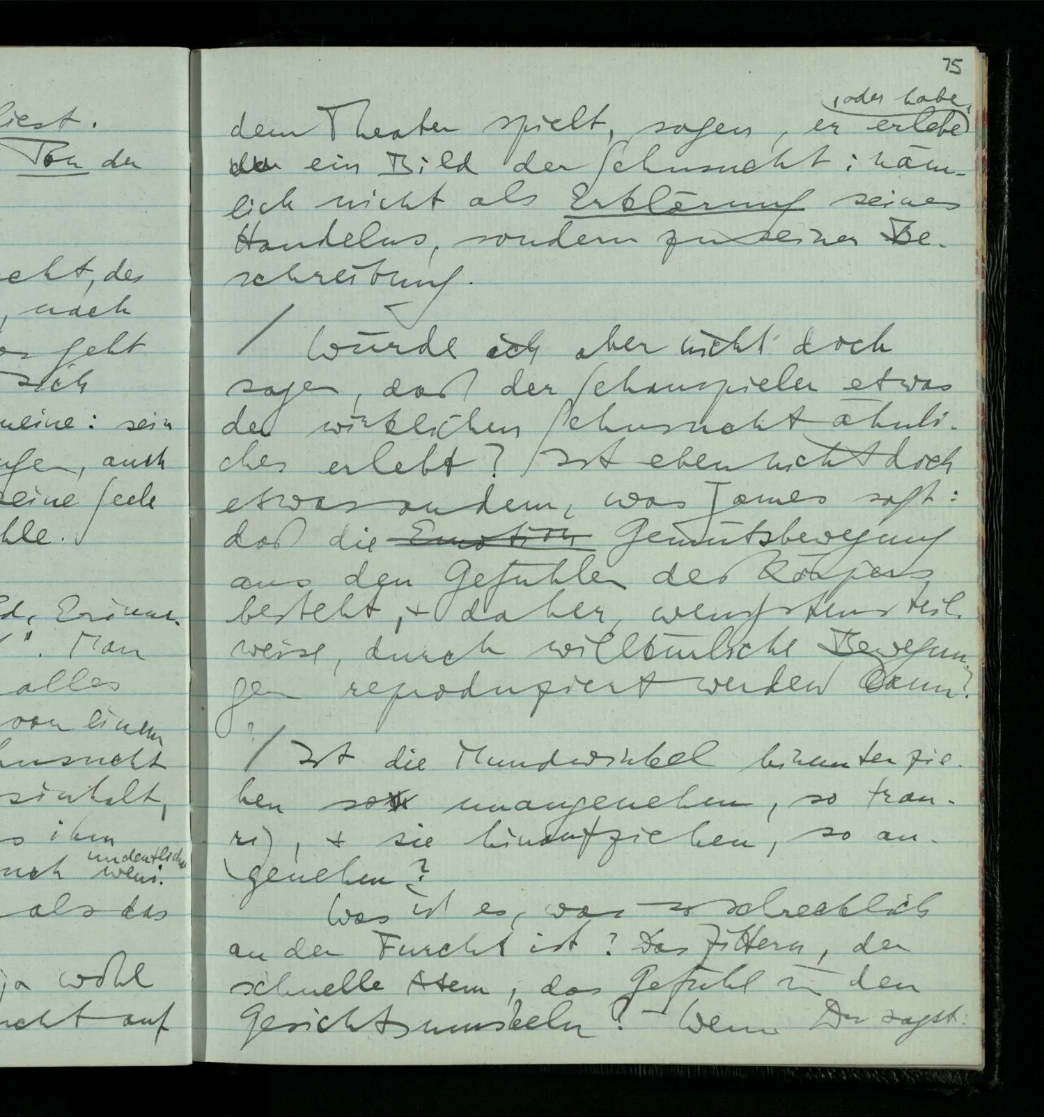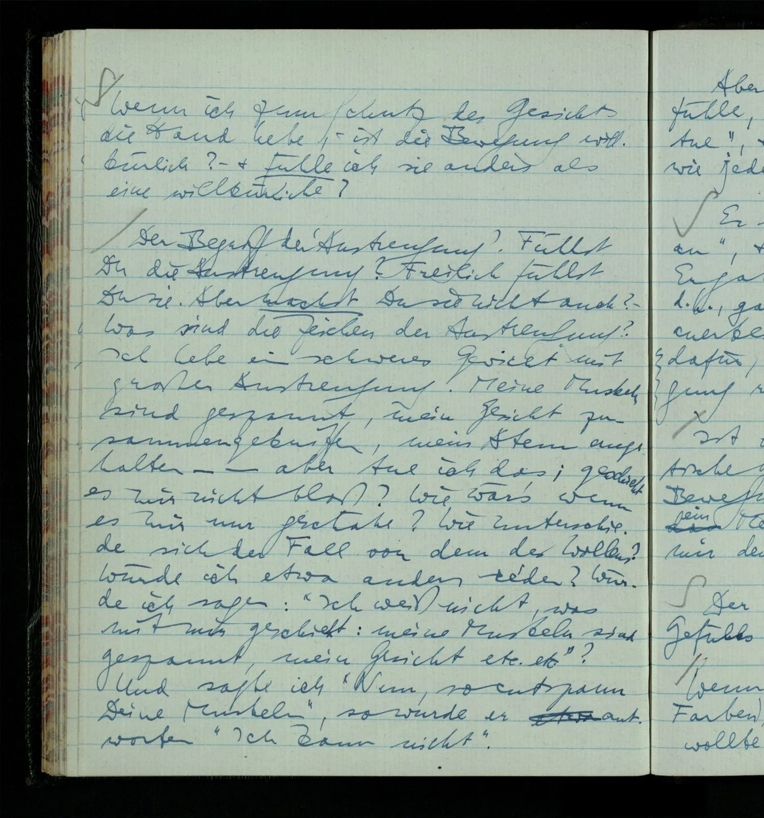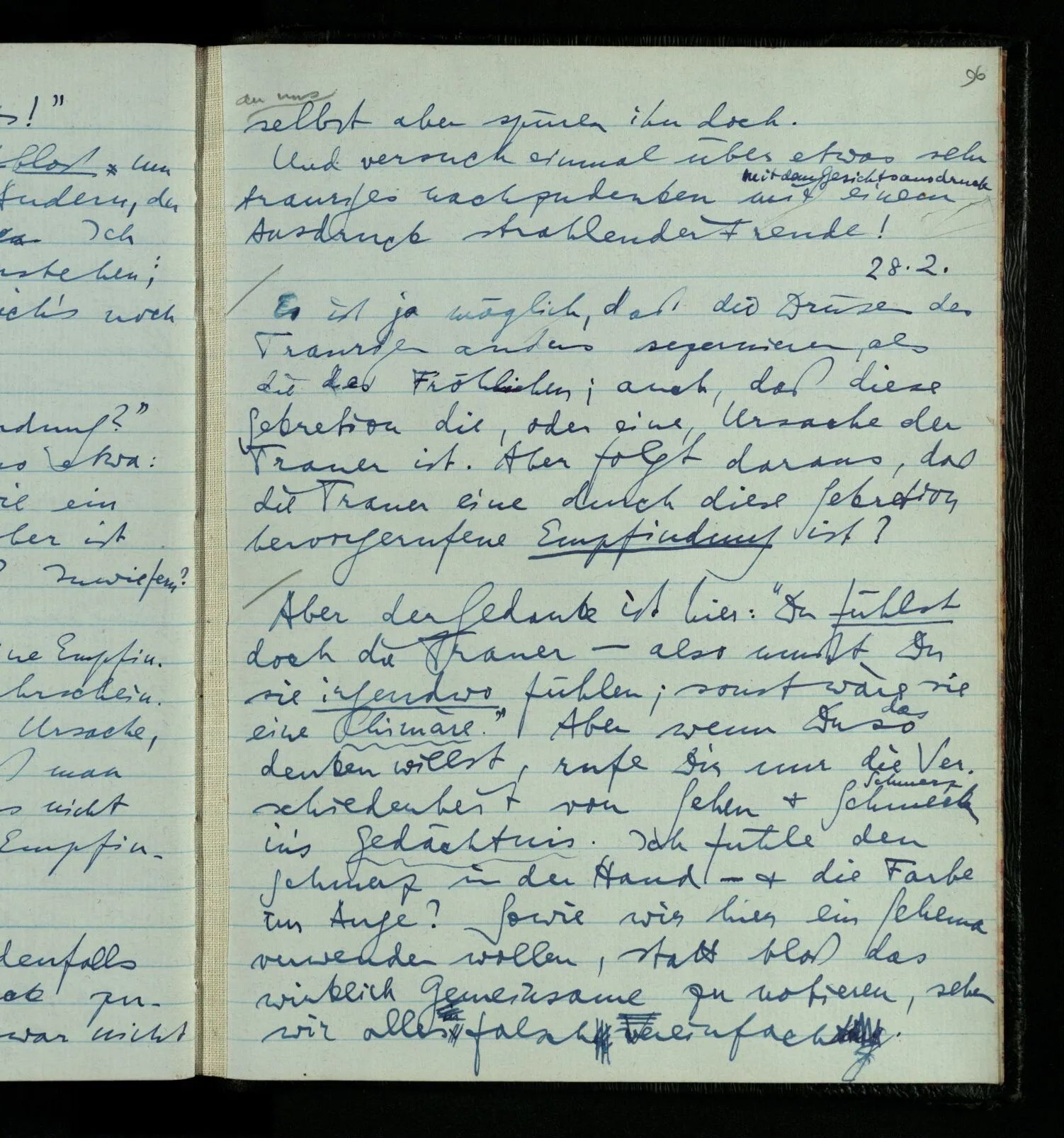 28.02.1947 Es ist ja möglich, daß die Drüsen des Traurigen anders sezernieren, als die des Fröhlichen; auch, daß diese Sekretion die, oder eine, Ursache der Trauer ist. Aber folgt daraus, daß die Trauer eine durch diese Sekretion hervorgerufene Empfindung ist?
