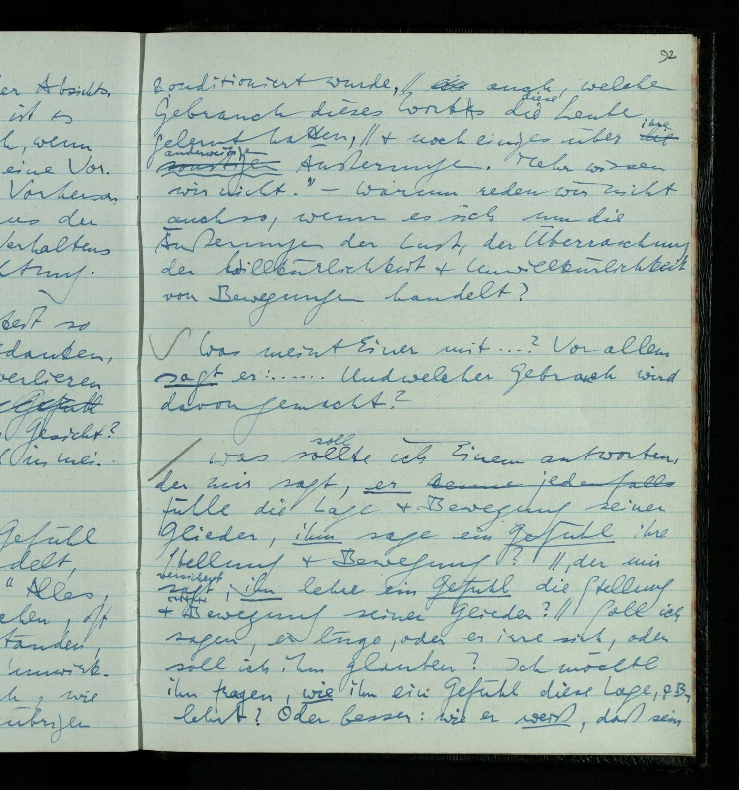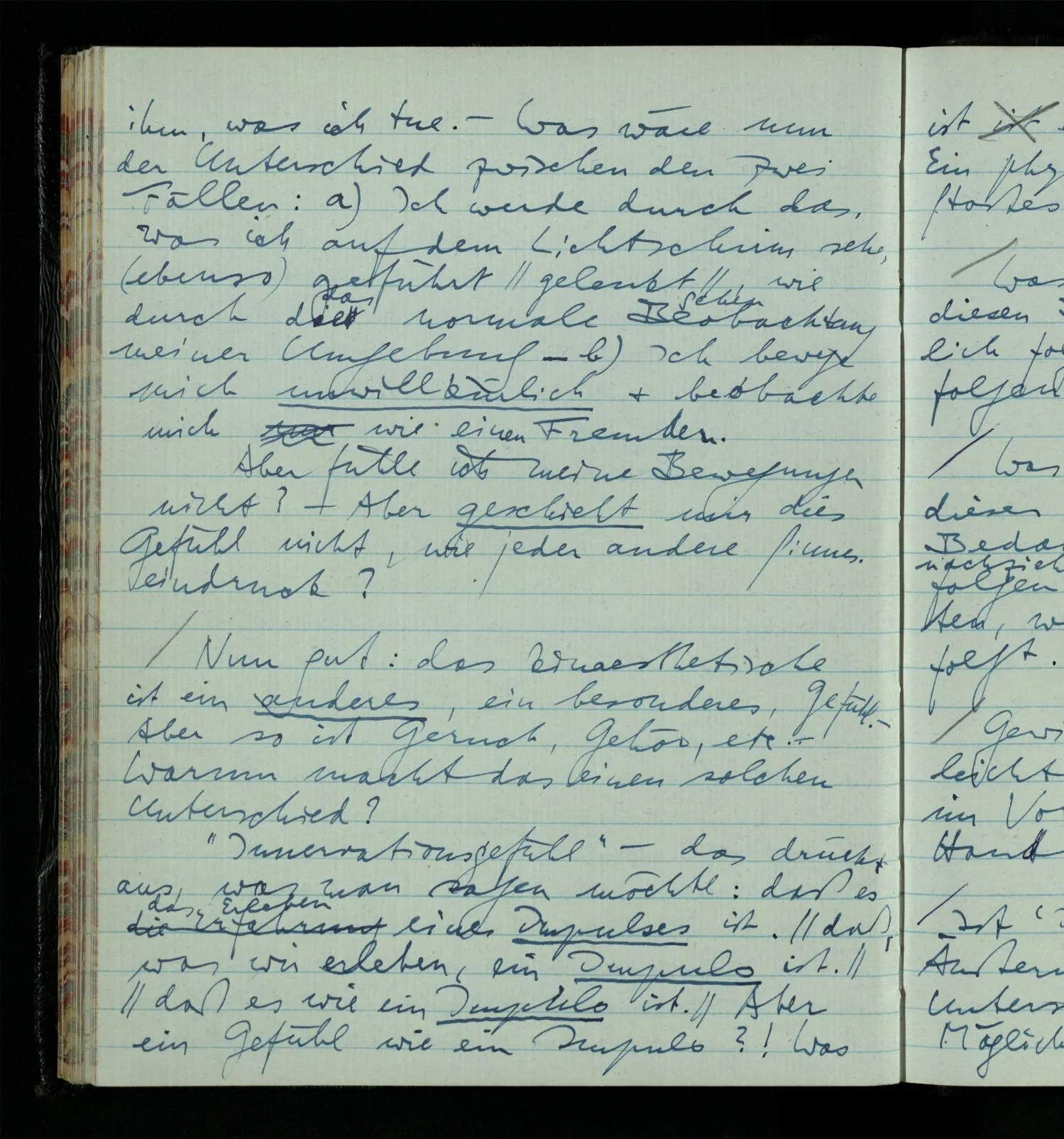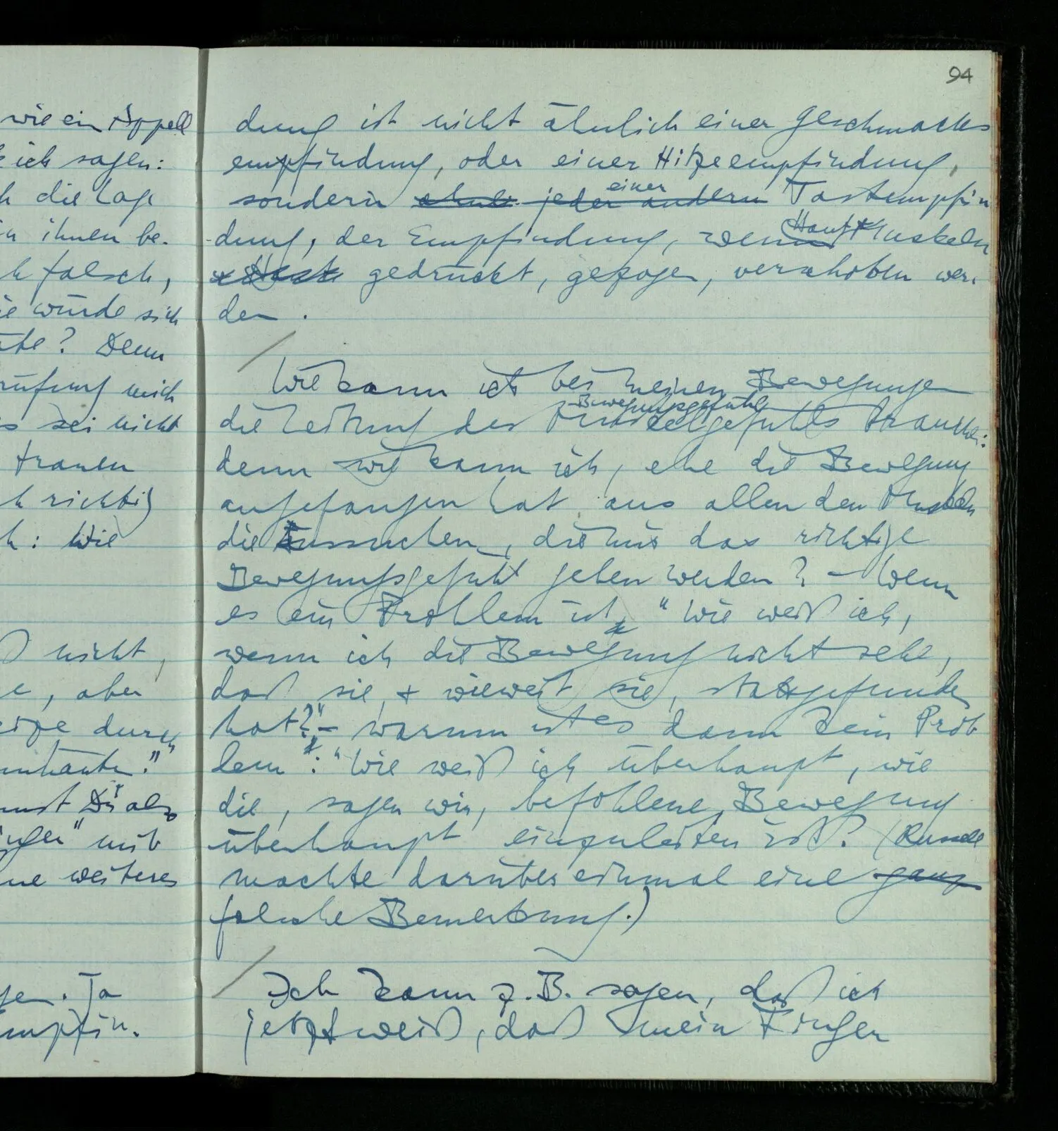 Wie kann ich bei meinen Bewegungen die Leitung des Muskelgefühls brauchen: denn wie kann ich, ehe die Bewegung angefangen hat aus allen den Muskeln die aussuchen, die mir das richtige Bewegungsgefühl geben werden? – Wenn es ein Problem ist “Wie weiß ich, wenn ich die Bewegung nicht sehe, daß sie, & wieweit sie, stattgefunden hat?” – warum ist es dann kein Problem: “Wie weiß ich überhaupt, wie die, sagen wir, befohlene Bewegung überhaupt einzuleiten ist? (Russell machte darüber einmal eine falsche Bemerkung.)