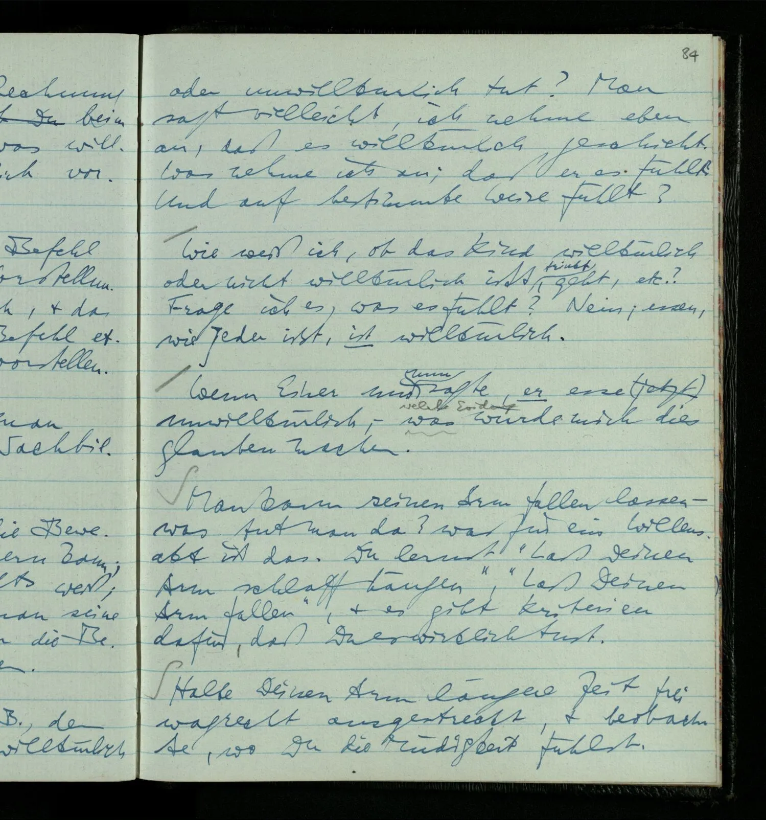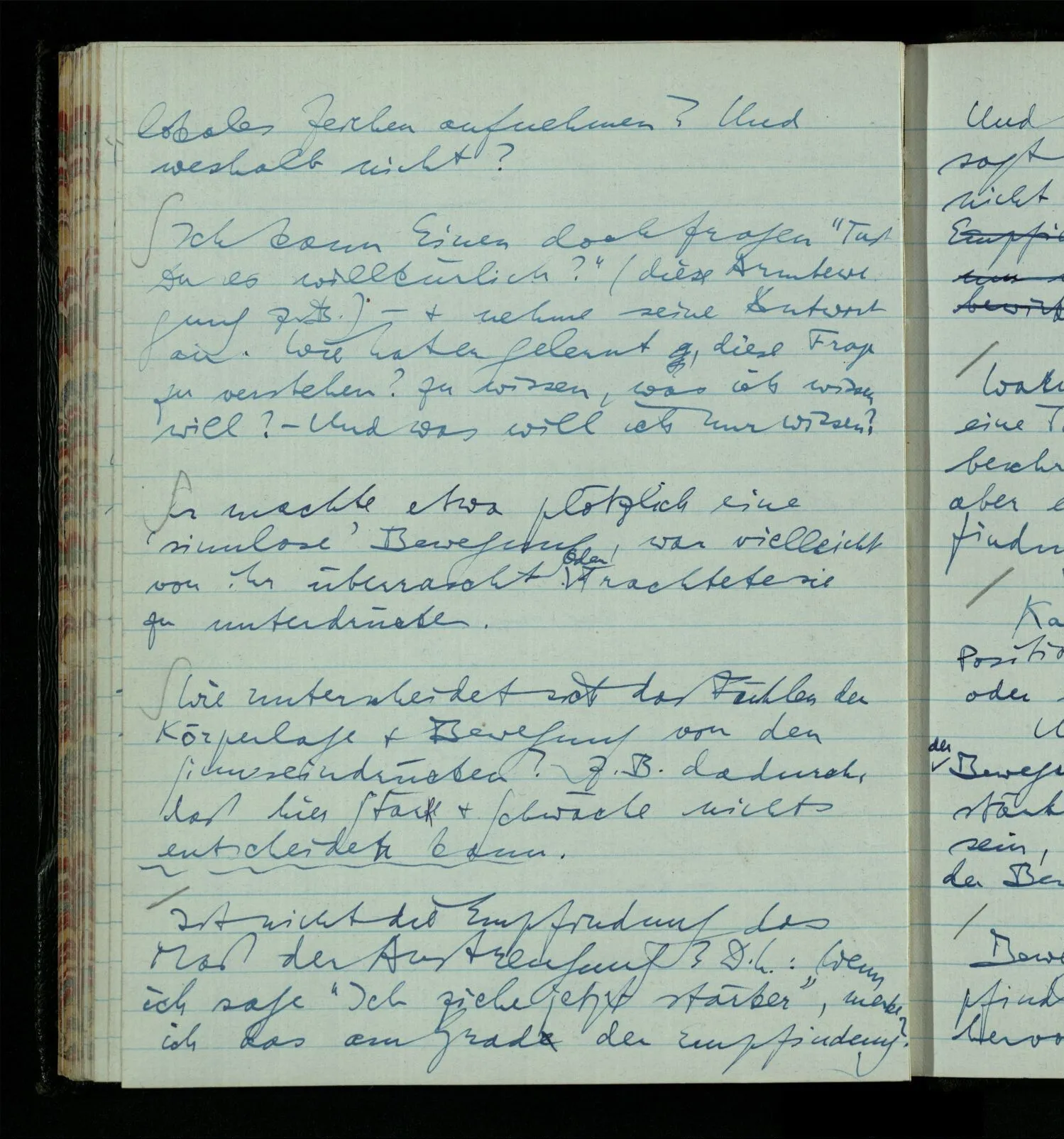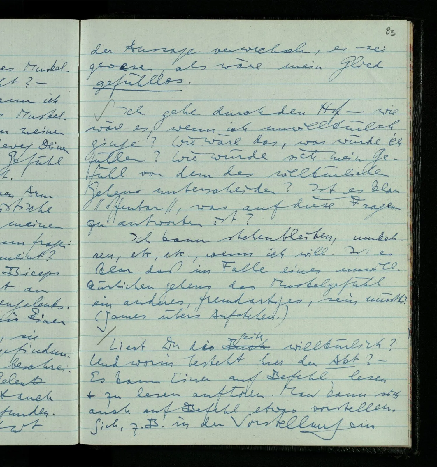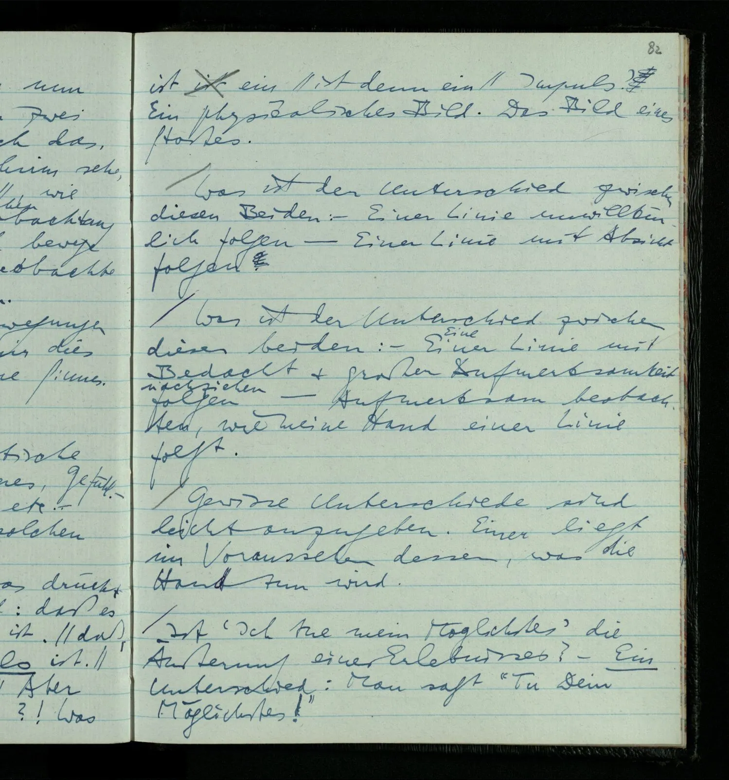 Wie kann ich bei meinen Bewegungen die Leitung des Muskelgefühls brauchen: denn wie kann ich, ehe die Bewegung angefangen hat aus allen den Muskeln die aussuchen, die mir das richtige Bewegungsgefühl geben werden? – Wenn es ein Problem ist “Wie weiß ich, wenn ich die Bewegung nicht sehe, daß sie, & wieweit sie, stattgefunden hat?” – warum ist es dann kein Problem: “Wie weiß ich überhaupt, wie die, sagen wir, befohlene Bewegung überhaupt einzuleiten ist? (Russell machte darüber einmal eine falsche Bemerkung.)