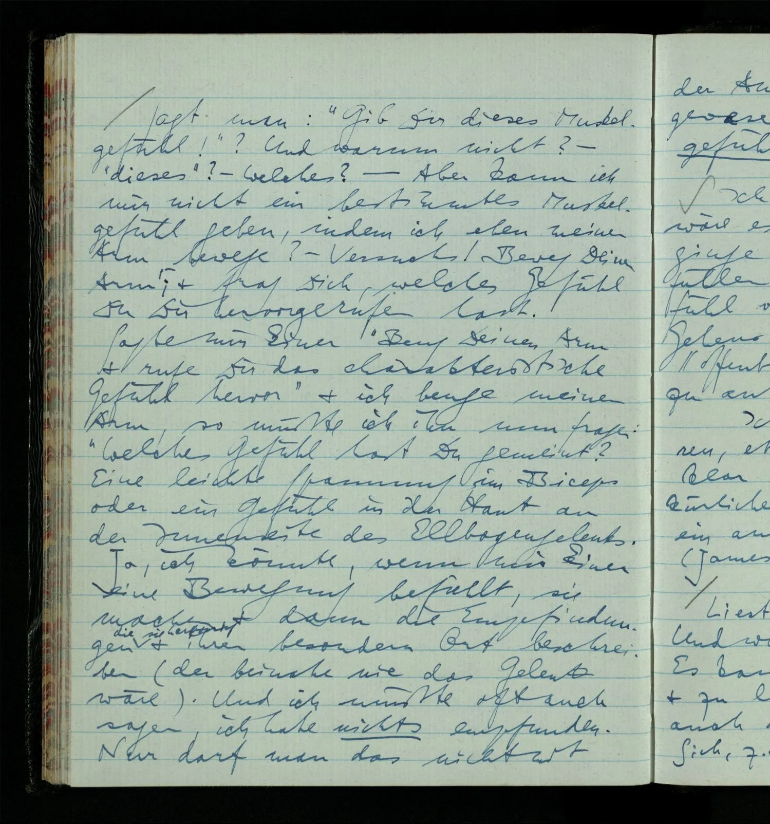 Ich fühle meinen Arm &, seltsamerweise, möchte ich nun sagen: ich fühle ihn im Raum in bestimmter Lage; als wäre nämlich das Körpergefühl in einem Raum in der Form des Arms verteilt, so daß ich, um es darzustellen den Arm, z.B. in Gips, in seiner richtigen Lage darstellen müßte.