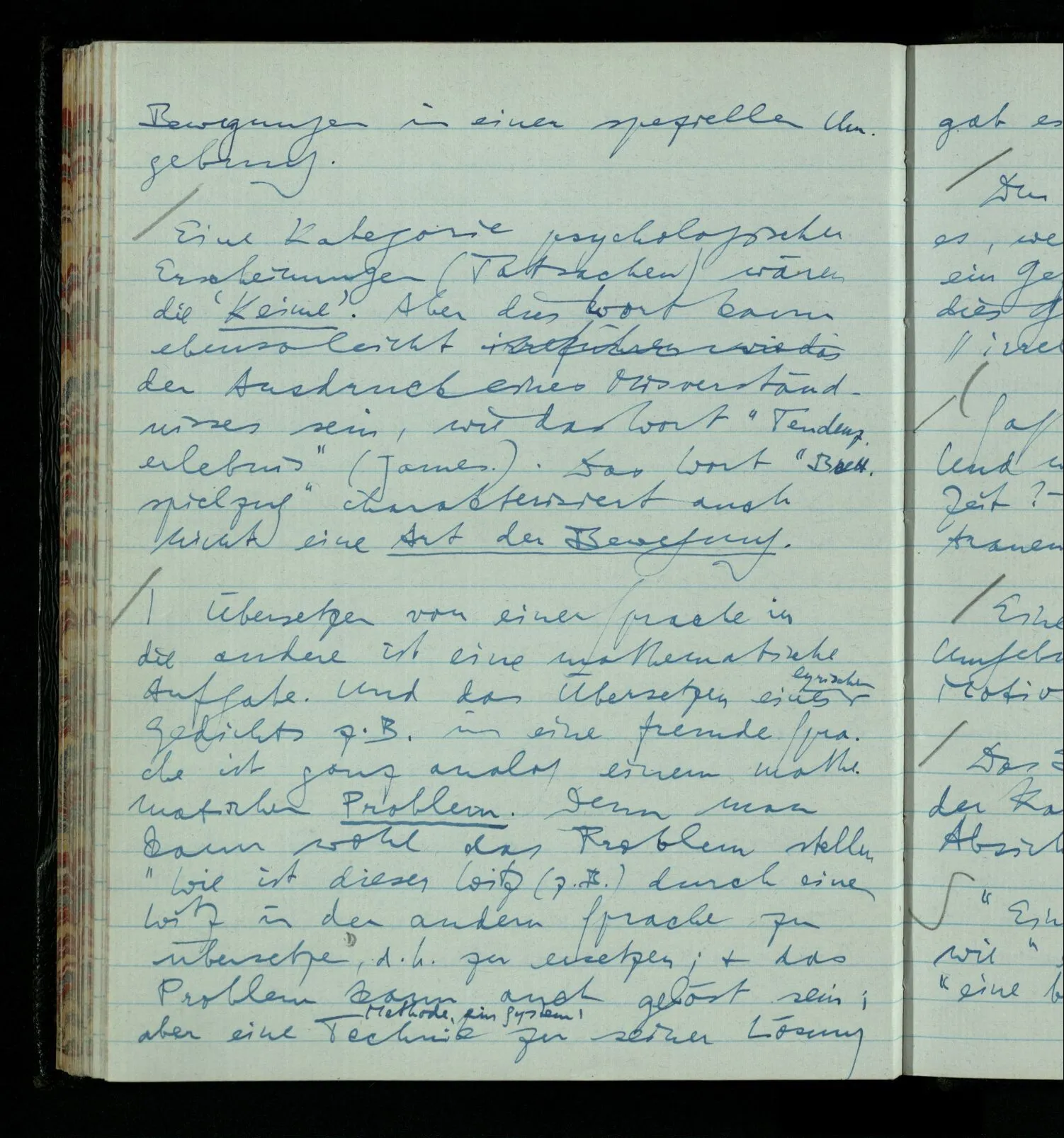 Übersetzen von einer Sprache in die andere ist eine mathematische Aufgabe. Und das Übersetzen eines lyrischen Gedichts z.B. in eine fremde Sprache ist ganz analog einem mathematischen Problem. Denn man kann wohl das Problem stellen “Wie ist dieser Witz (z.B.) durch einen Witz in der andern Sprache zu übersetzen”, d.h. zu ersetzen; & das Problem kann auch gelöst sein; aber eine Technik zu seiner Lösung gab es nicht.