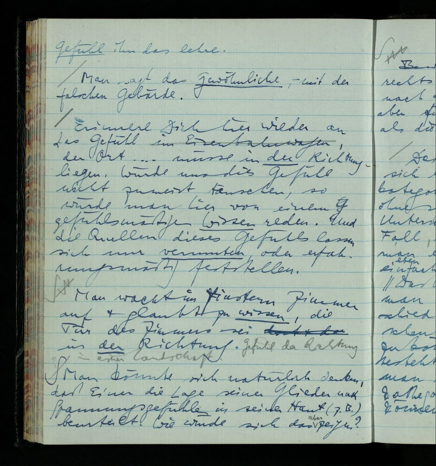 Denk Dir eine Bleistiftspitze würde an irgendeiner Stelle mit meiner Haut in Berührung gebracht, so kann ich sagen, ich fühle, wo sie ist. Aber fühl ich, wo ich sie fühle? “Wie weißt Du, daß die Spitze jetzt Deinen Schenkel berührt?” – “Ich fühle es”. Dadurch, daß ich die Berührung fühle, weiß ich ihren Ort; aber soll ich darum von einem Ortsgefühl reden? Und wenn es kein Ortsgefühl gibt, warum soll es ein Gefühl der Lage geben?