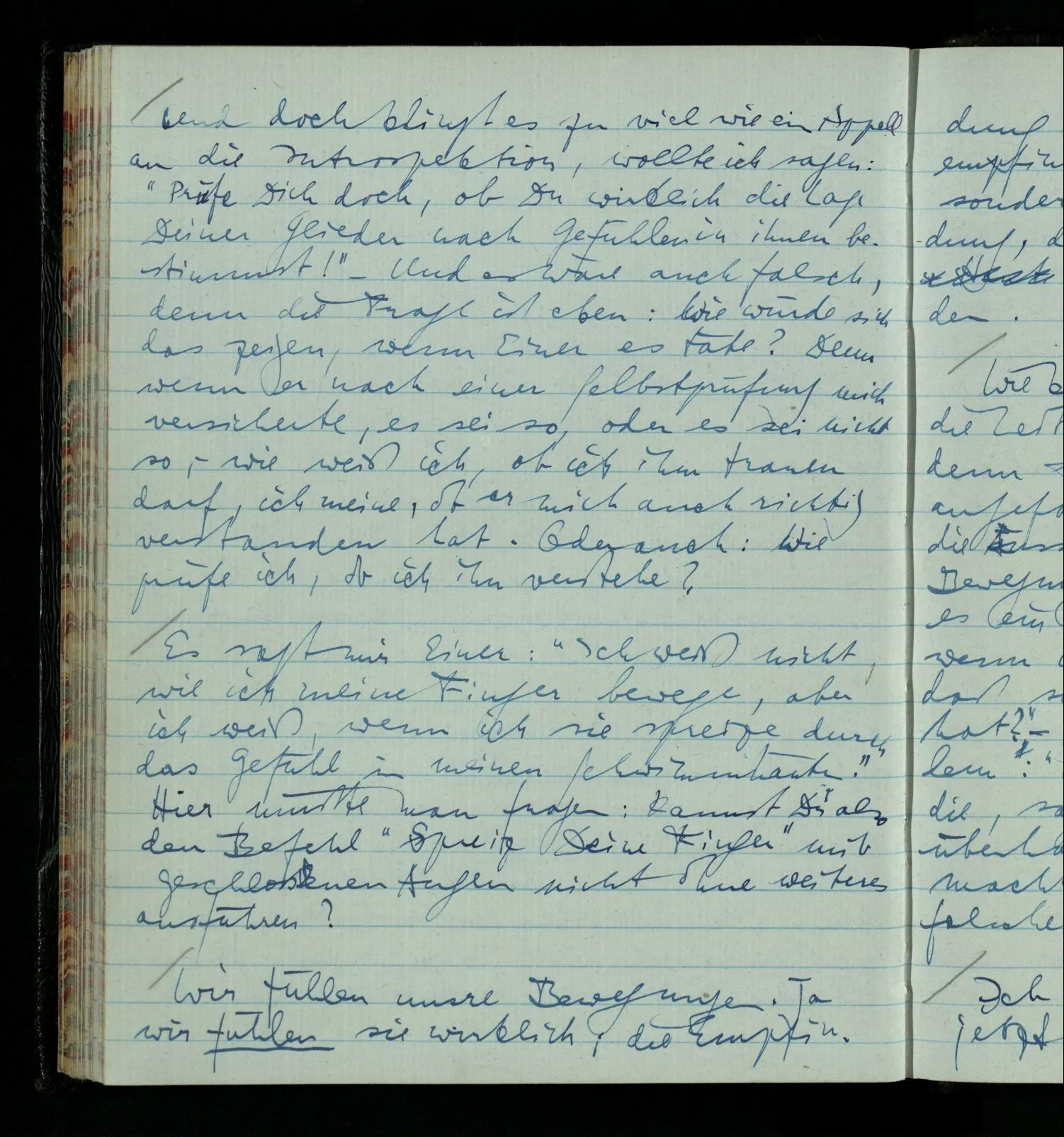Und doch klingt es zuviel wie ein Appell an die Introspektion, wollte ich sagen: “Prüfe Dich doch, ob Du wirklich die Lage Deiner Glieder nach Gefühlen in ihnen bestimmst!” – Und es wäre auch falsch, denn die Frage ist eben: Wie würde sich das zeigen, wenn Einer es täte? Denn wenn er nach einer Selbstprüfung mich versicherte, es sei so, oder es sei nicht so, – wie weiß ich, ob ich ihm trauen darf, ich meine, ob er mich auch richtig verstanden hat. Oder auch: Wie prüfe ich, ob ich ihn verstehe?