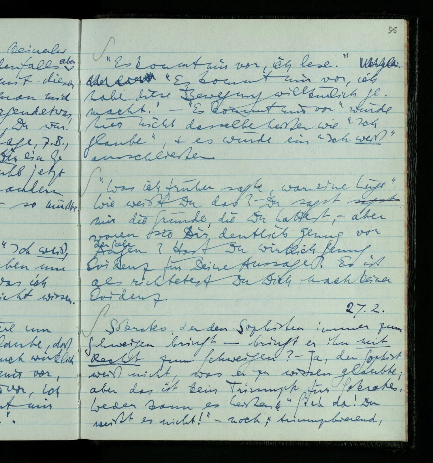 27.02.1947 Sokrates, der den Sophisten immer zum Schweigen bringt – bringt er ihn mit Recht zum Schweigen? – Ja, der Sophist weiß nicht, was er zu wissen glaubte; aber das ist kein Triumph für Sokrates. Weder kann es heißen “Sieh da! Du weißt es nicht!” – noch, triumphierend, “Also wissen wir Alle nichts!” Denn ich will nicht denken, bloß um mich selbst, oder gar den Andern, der Unklarheit zu überführen. Ich trachte nicht, etwas zu verstehen, nur um zu sehen, daß ich’s noch nicht verstehe.