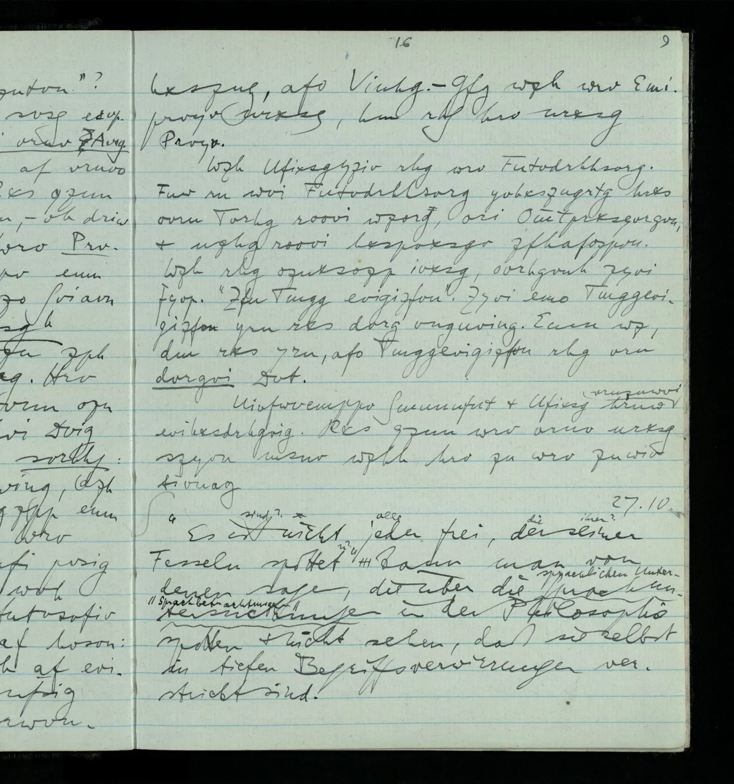 27.10.1946 Es ist nicht jeder frei, der seiner Fesseln spottet kann man von denen sagen, die über die Sprachuntersuchungen in der Philosophie spotten & nicht sehen, daß sie selbst in tiefen Begriffsverwirrungen verstrickt sind.