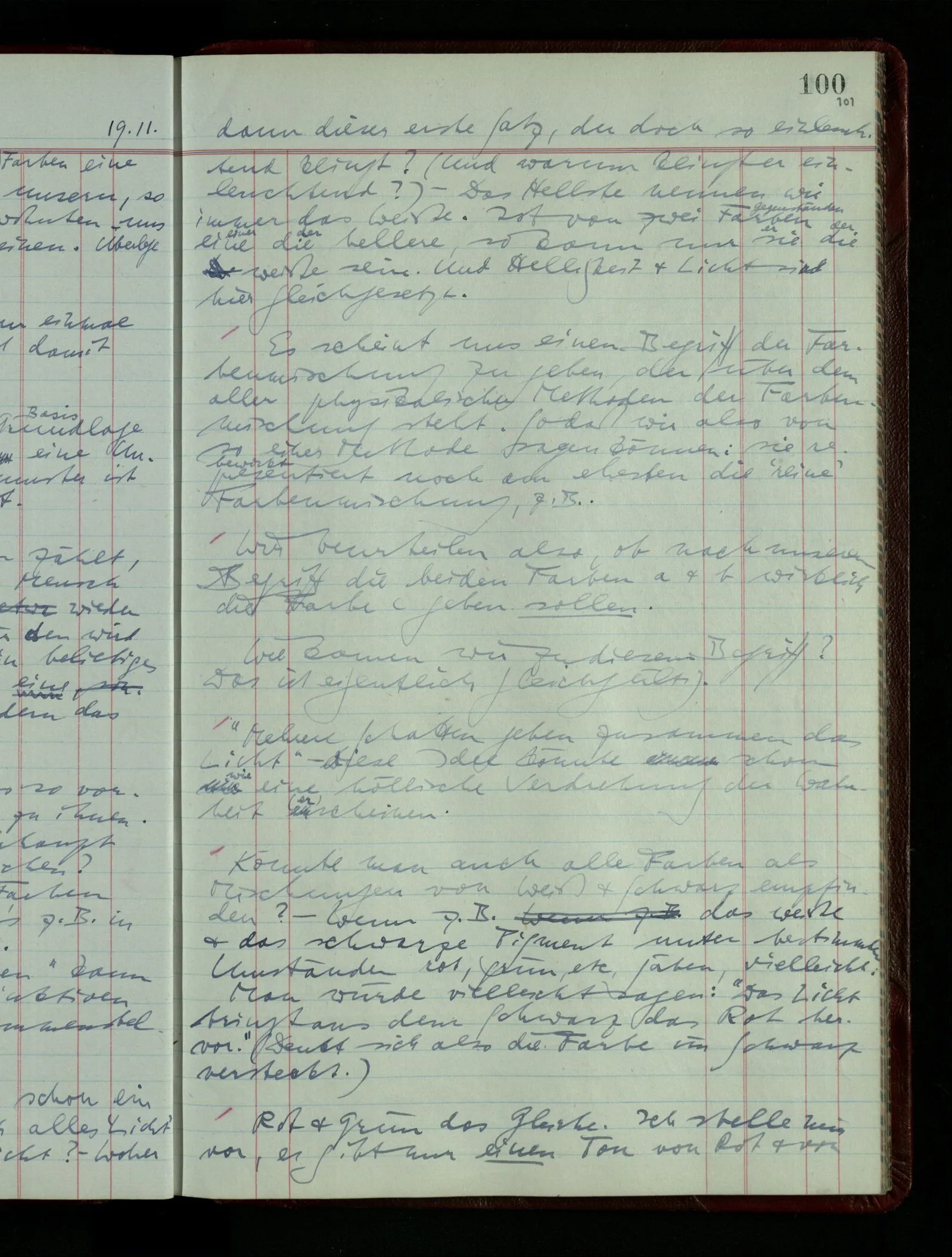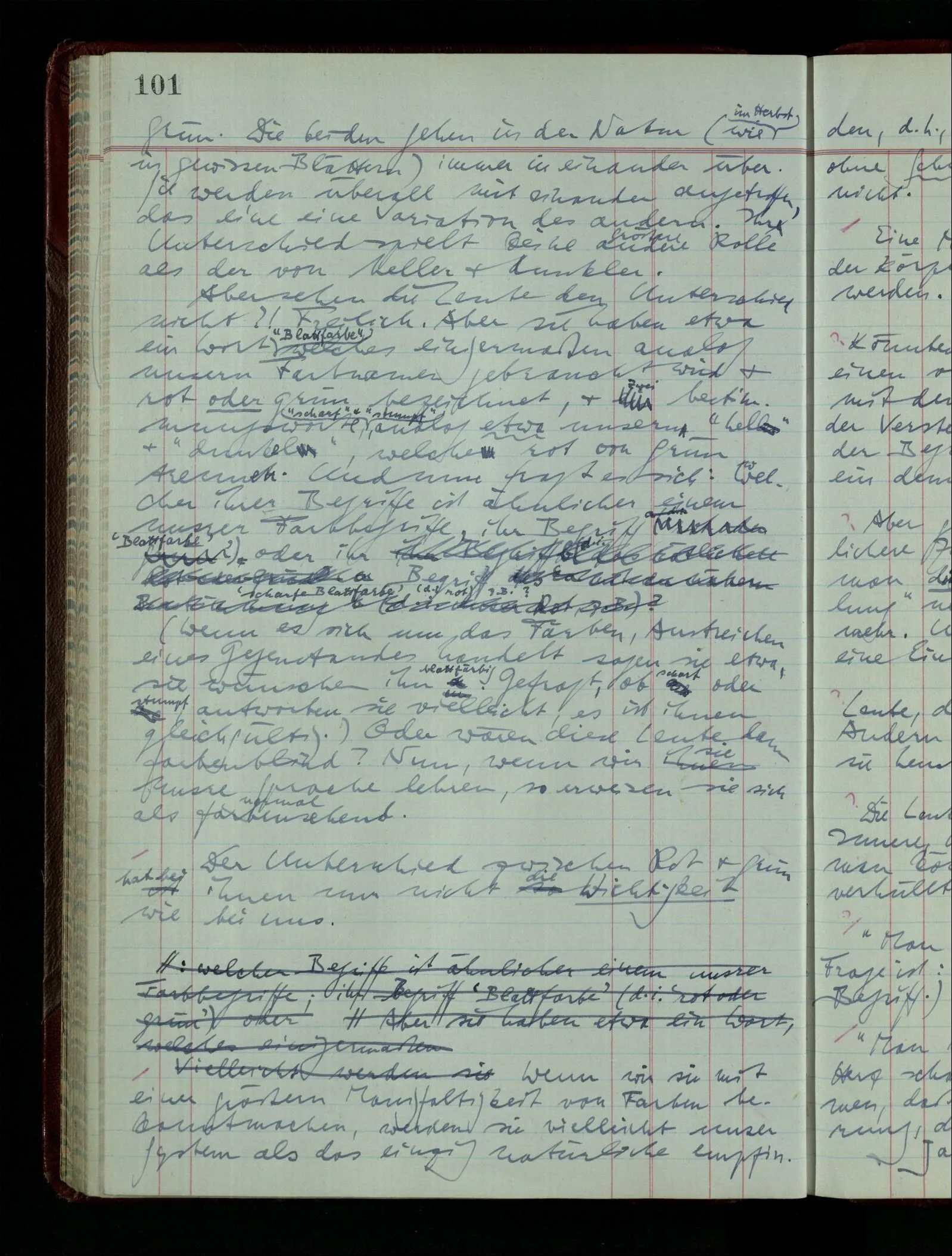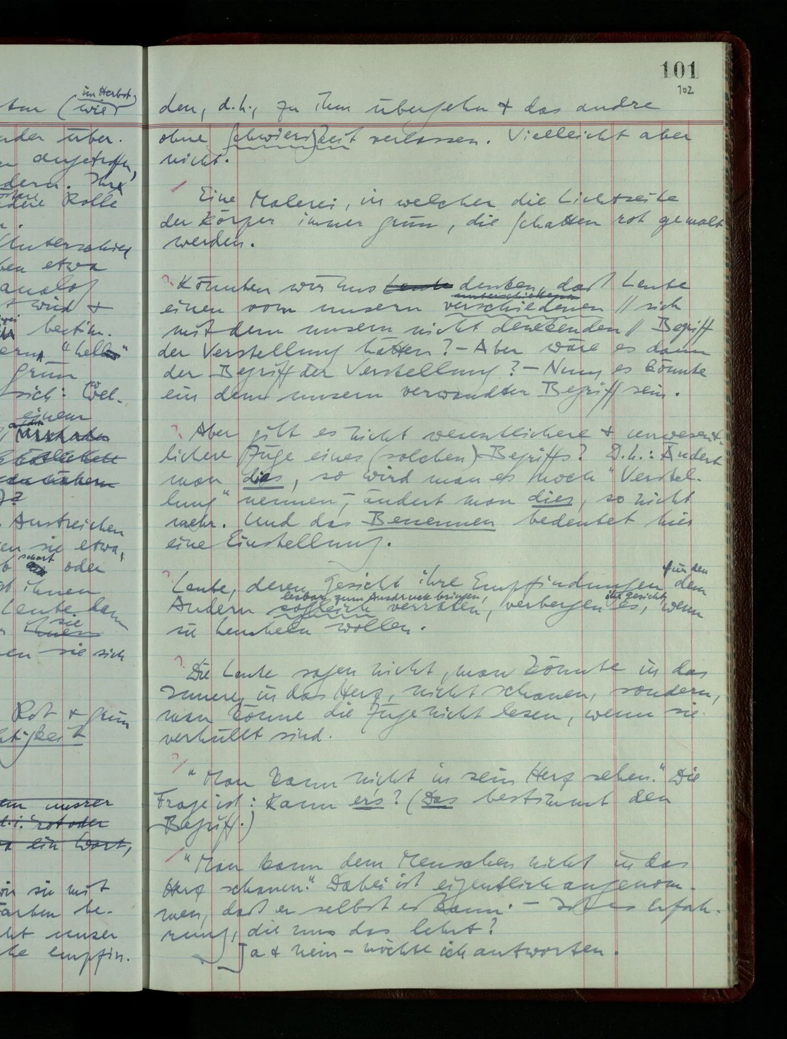 Vielleicht erklärt Einer: “Ich kann mir unter bläulich-gelb nichts vorstellen, es handelt sich also hier um eine Tatsache der Psychologie.” Und es ist daran etwas Wahres. Grün könnte man ja “bläulich-gelb” nennen; & wenn Dir das, sei es durch Deine besondere Erziehung, sei es aus irgendwelchen andern Ursachen, unnatürlich erscheint, so ist dies eine wichtige Tatsache.