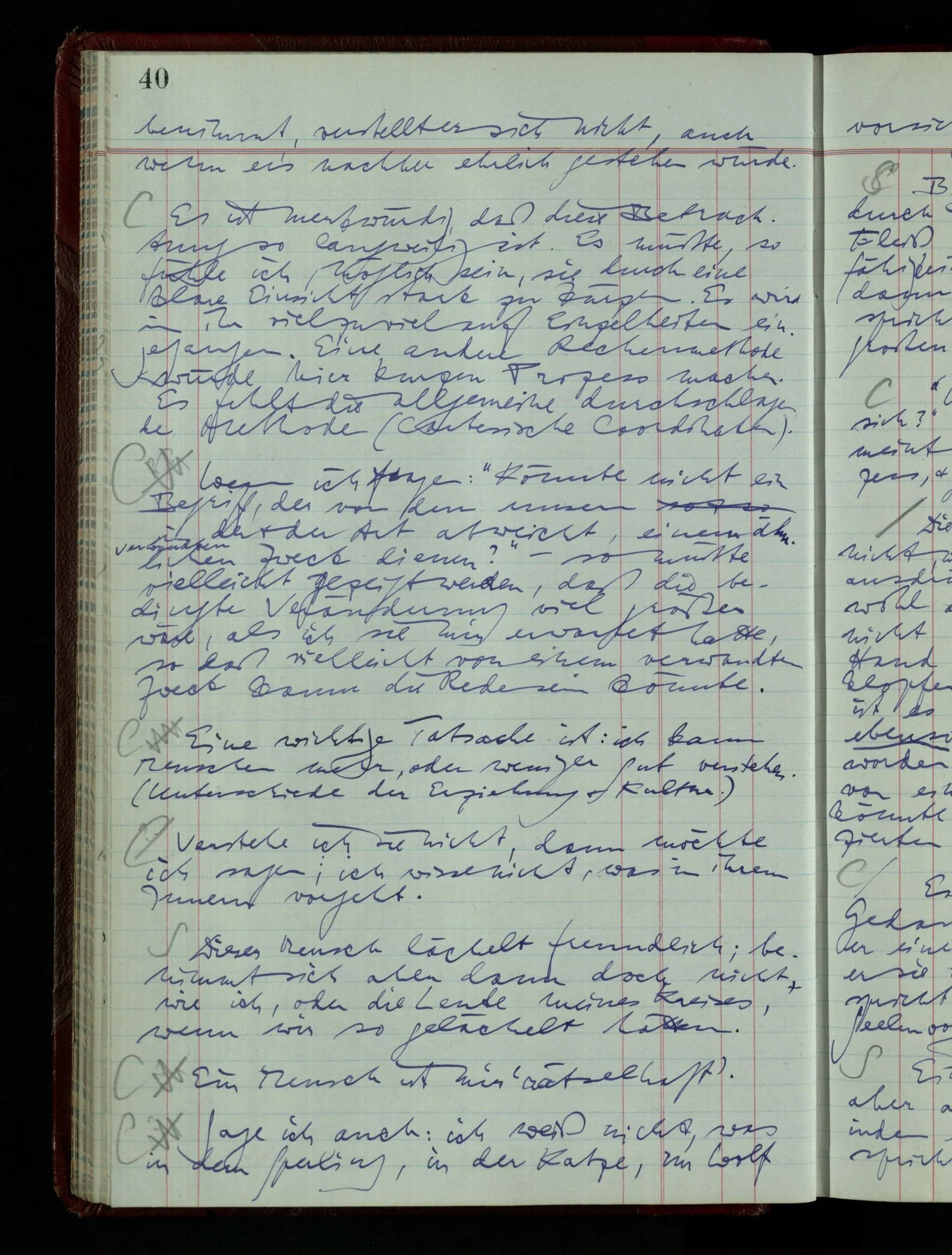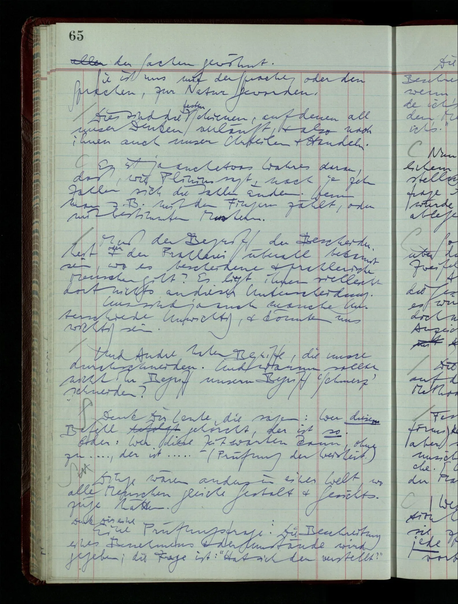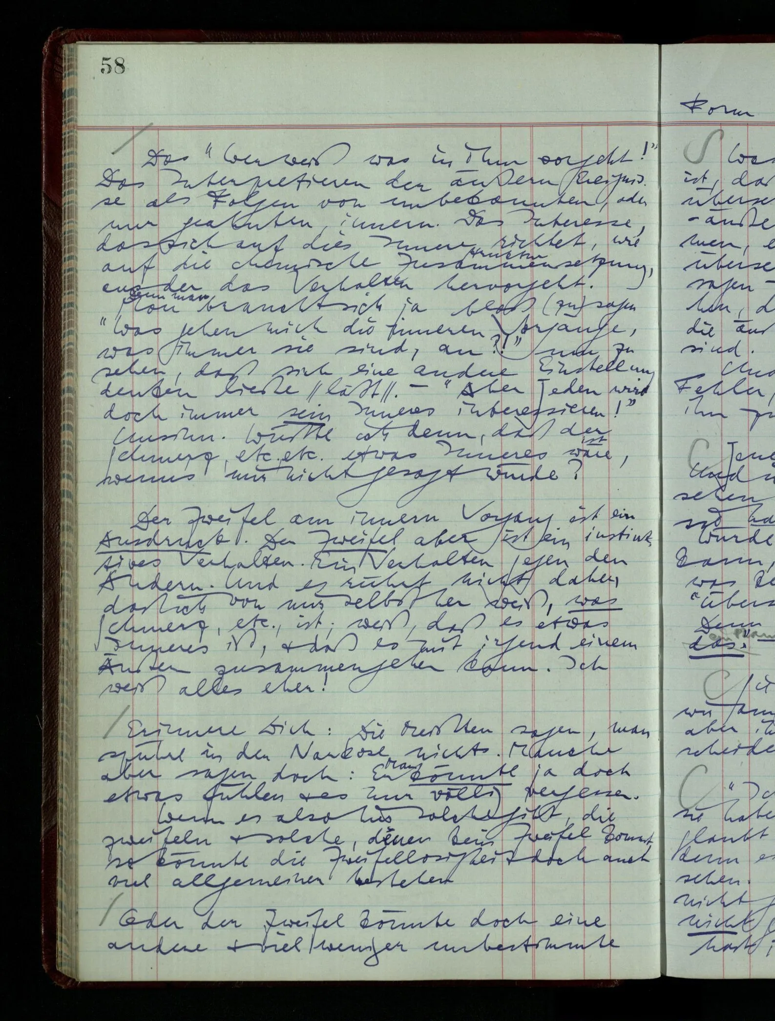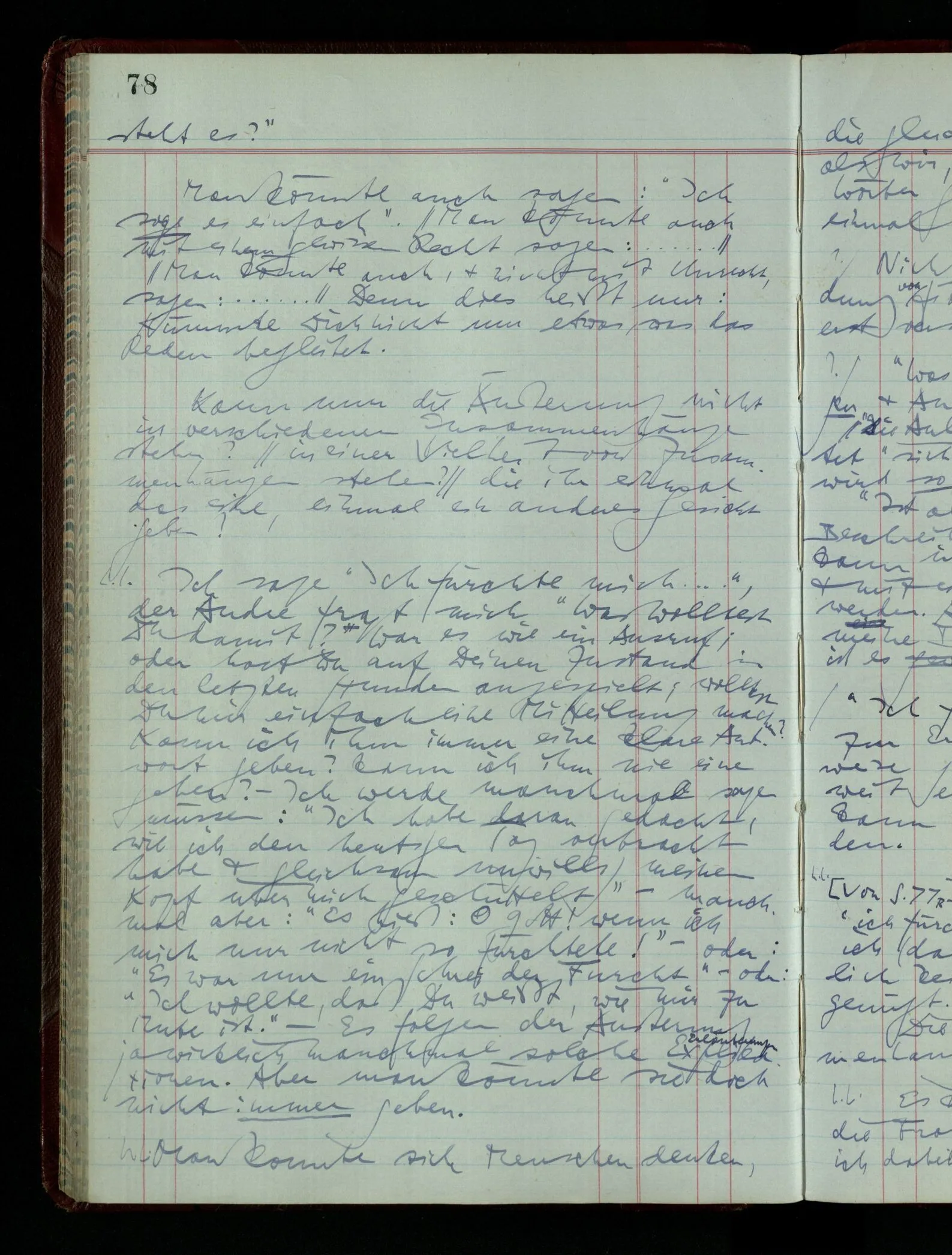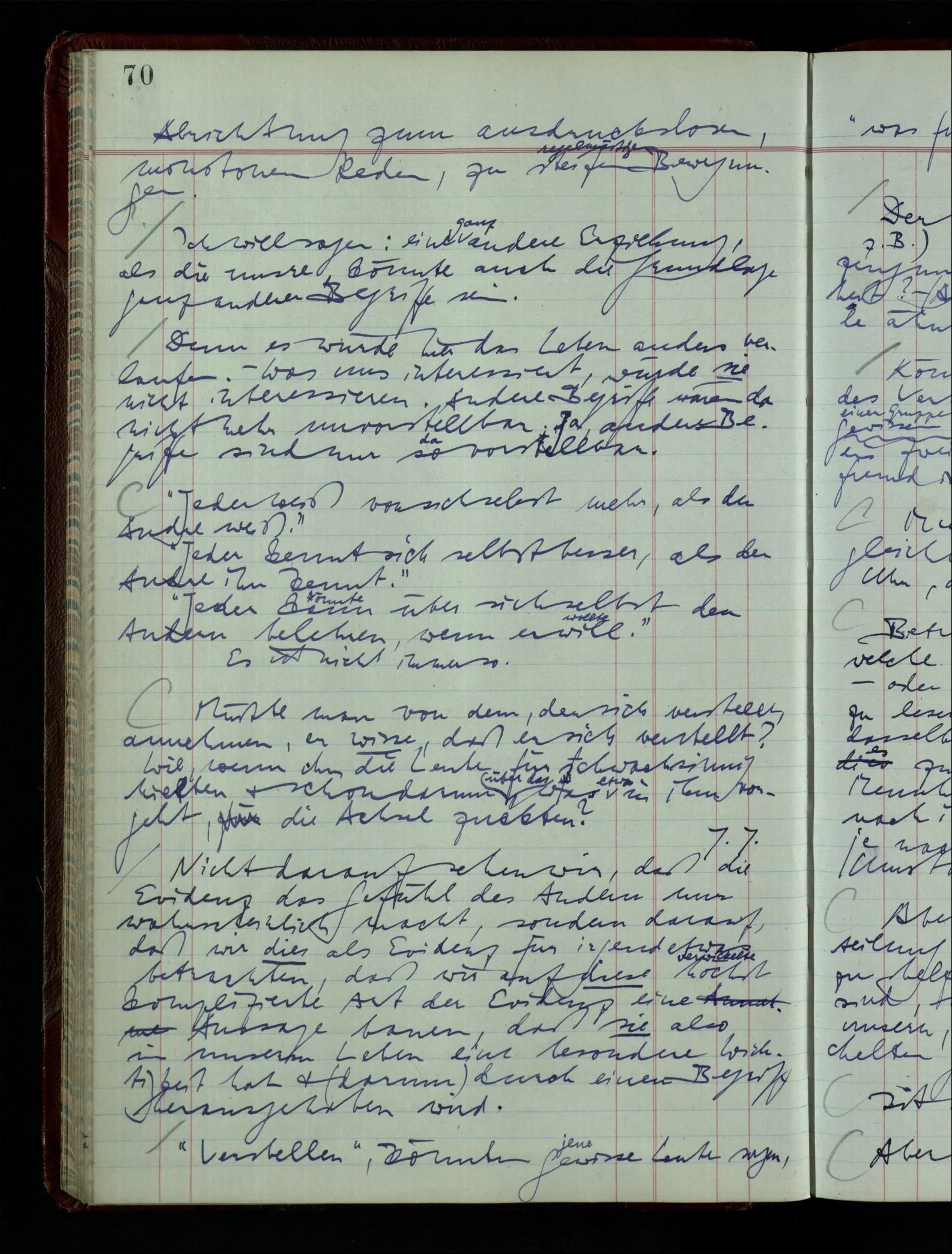 Denk dir eine Sitte, nach welcher man ein Recht nur hat, über den eigenen Zustand etwas auszusagen. Alles andere gilt als Vermessenheit. Die Leute leben aber, in praktischer Hinsicht, doch so wie wir.