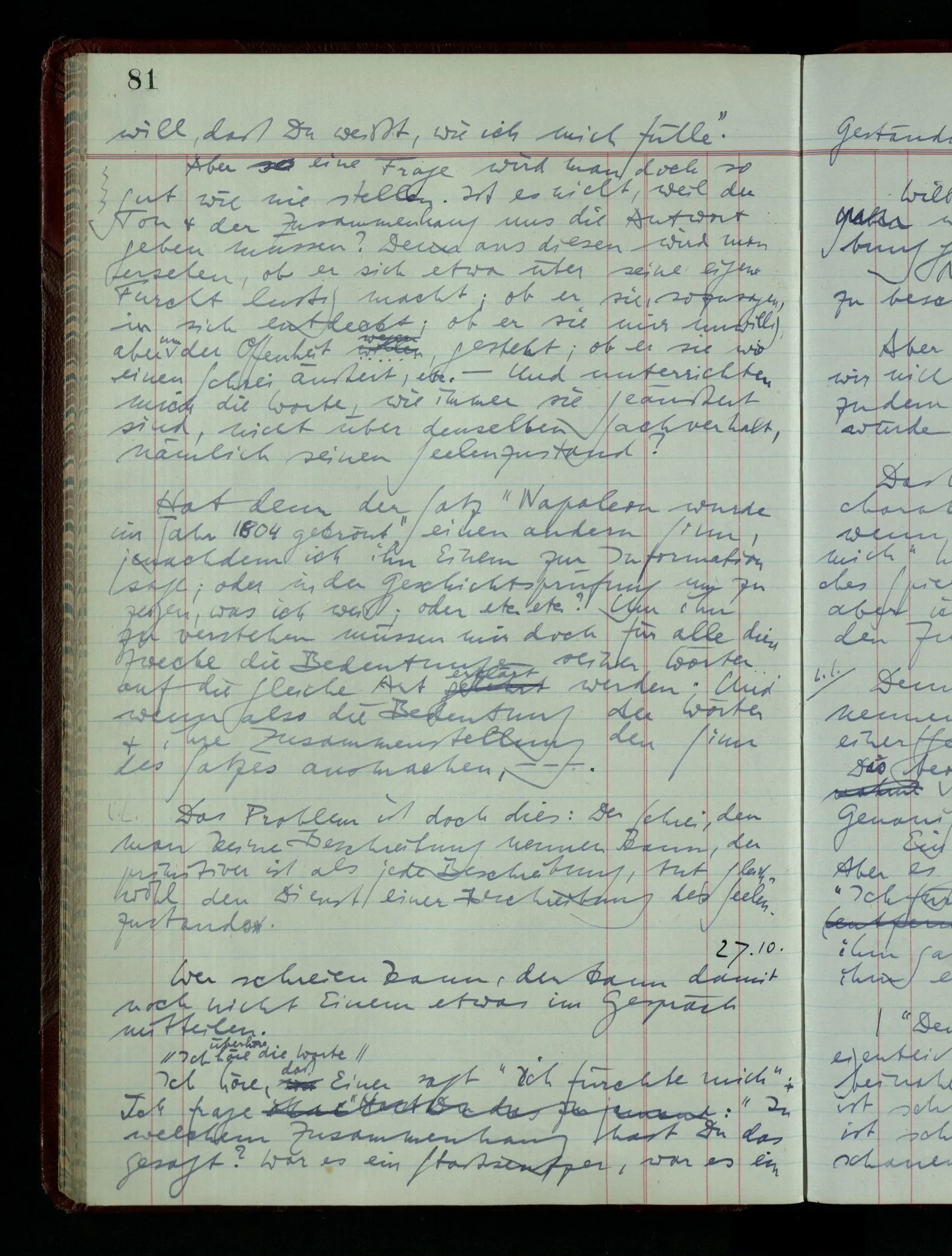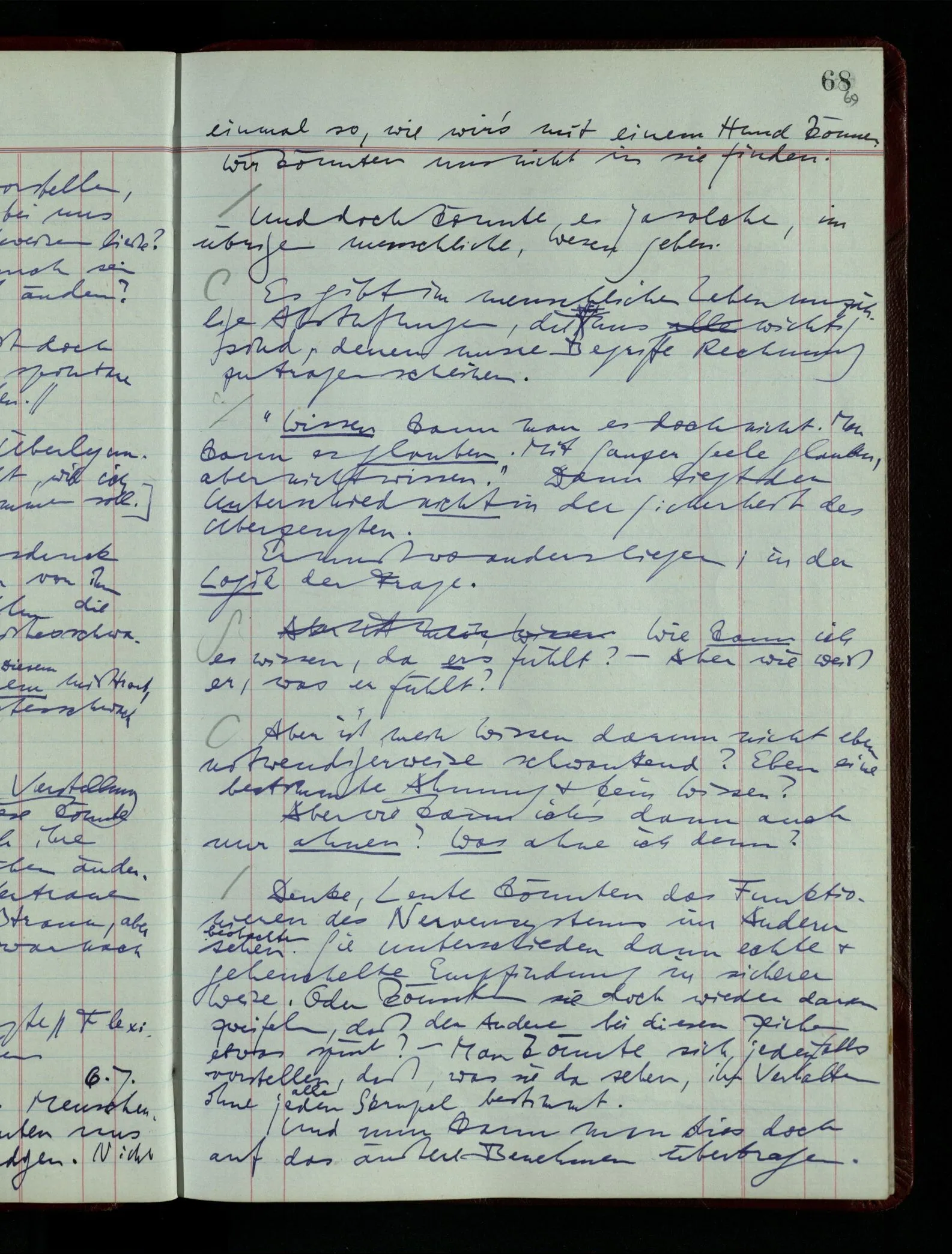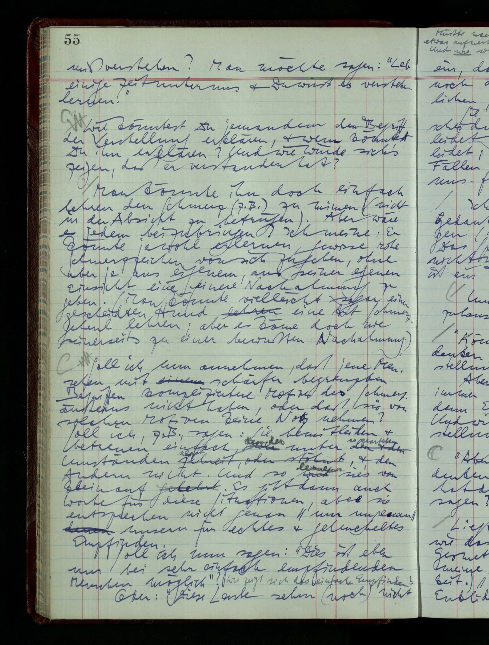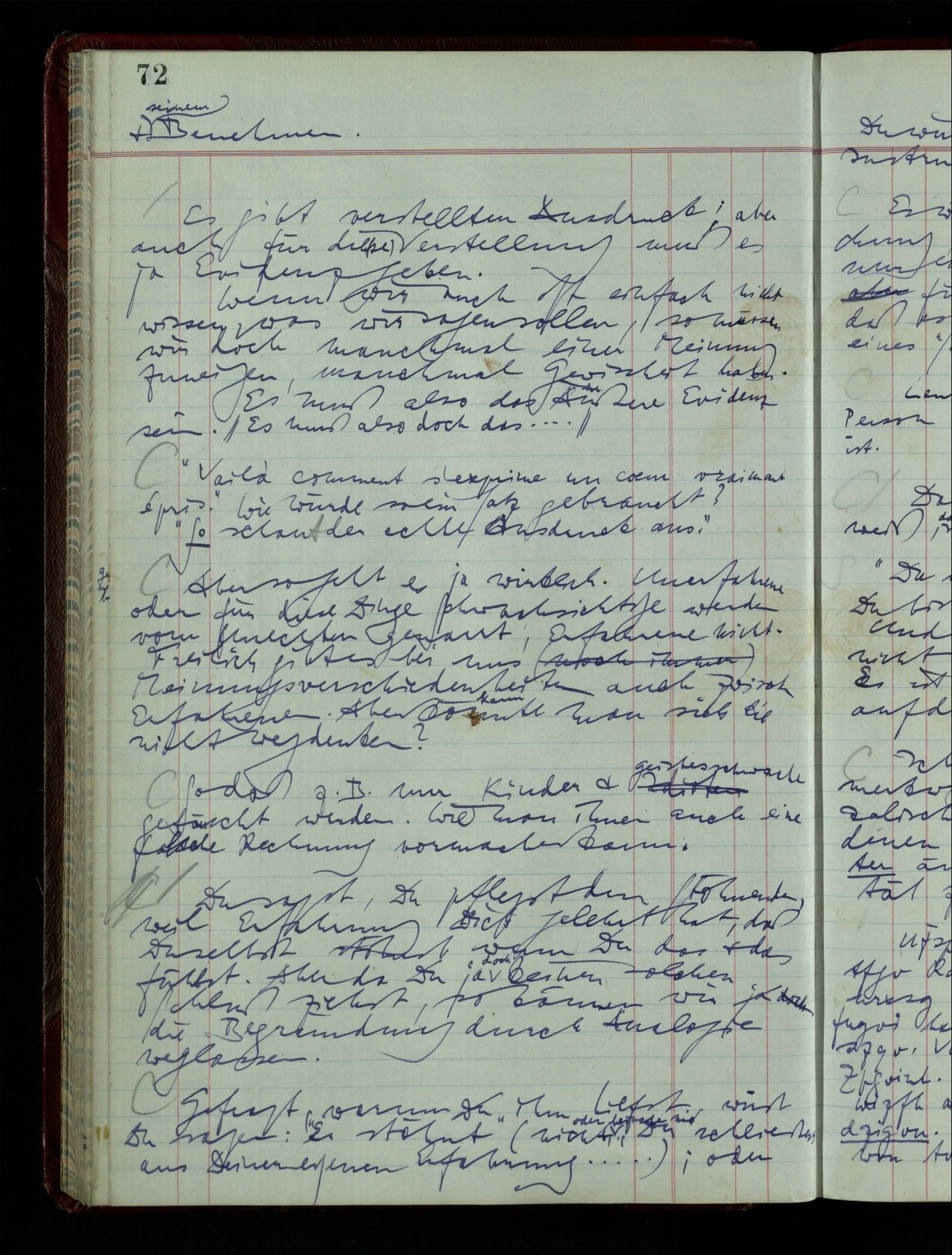 Denk dir eine Sitte, nach welcher man ein Recht nur hat, über den eigenen Zustand etwas auszusagen. Alles andere gilt als Vermessenheit. Die Leute leben aber, in praktischer Hinsicht, doch so wie wir.