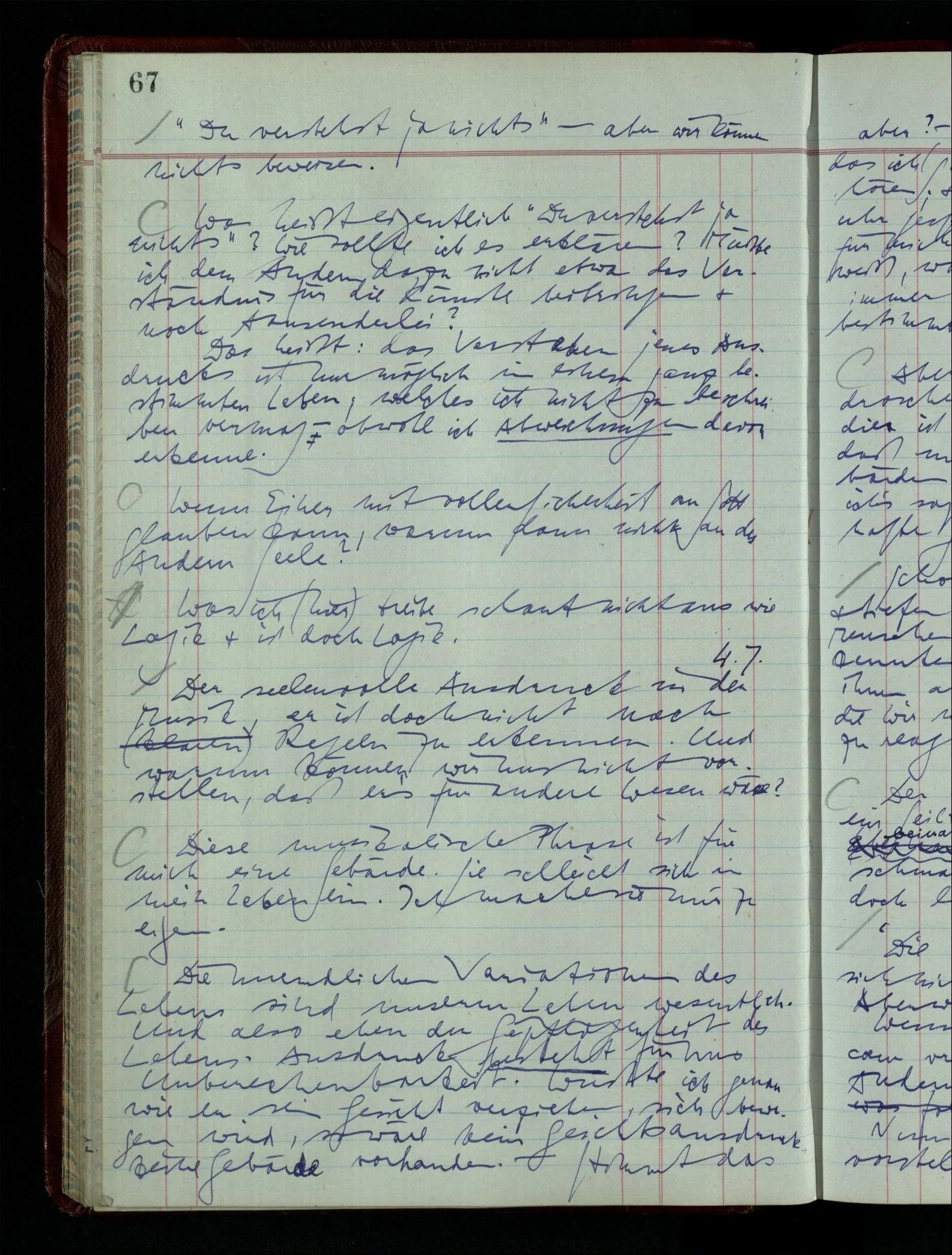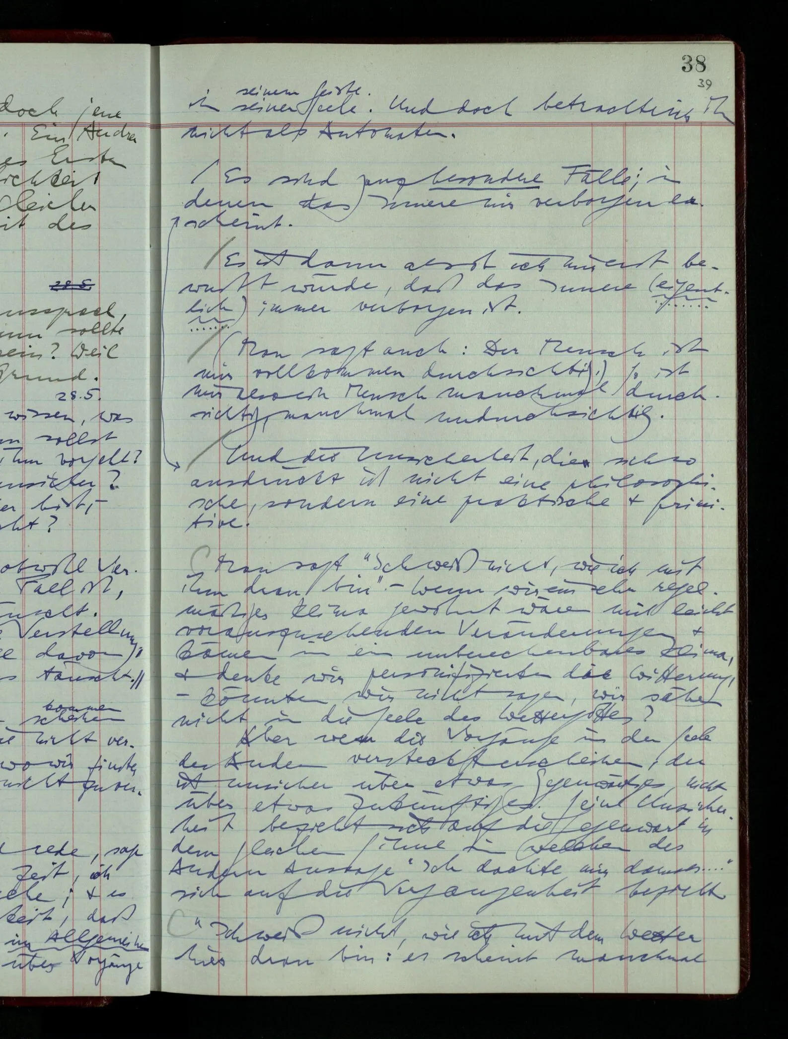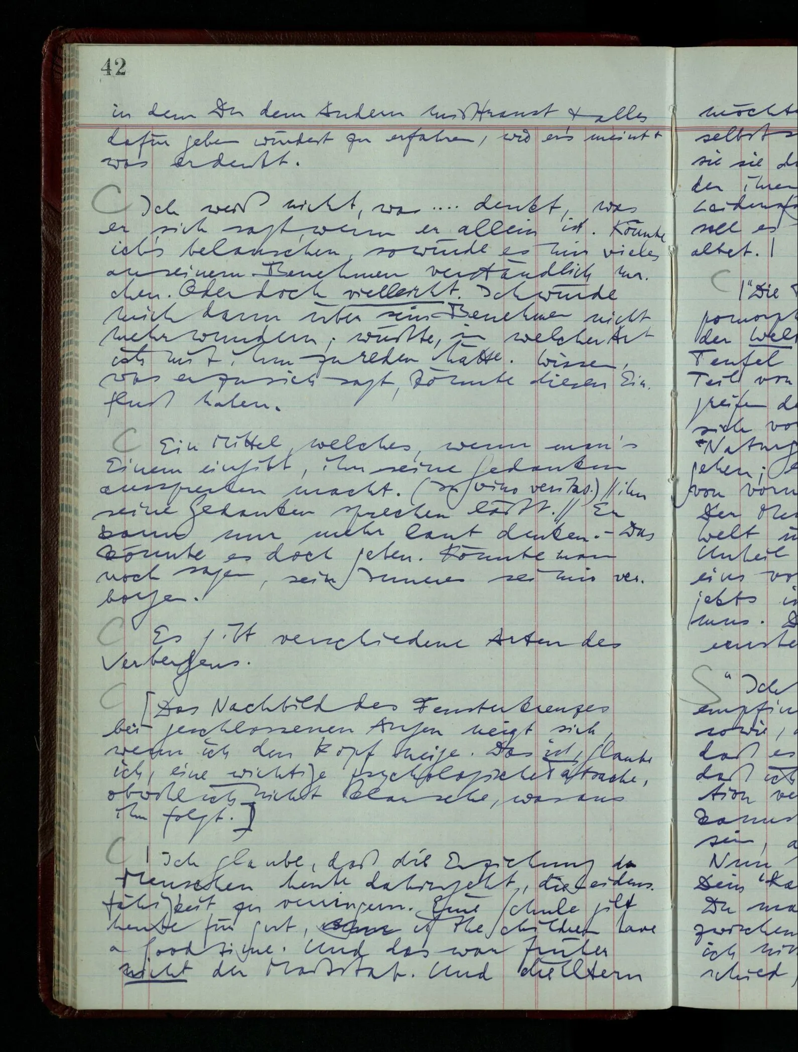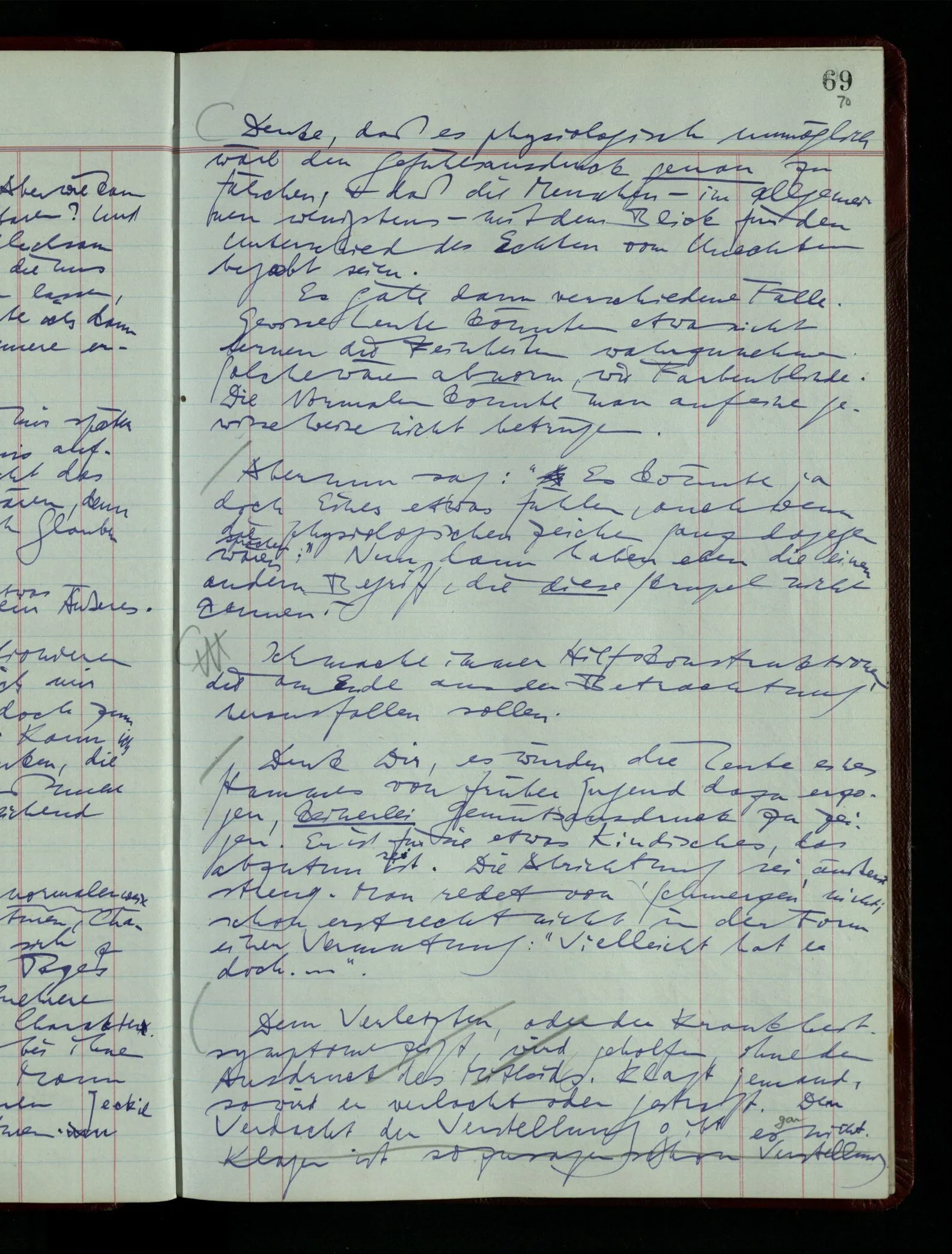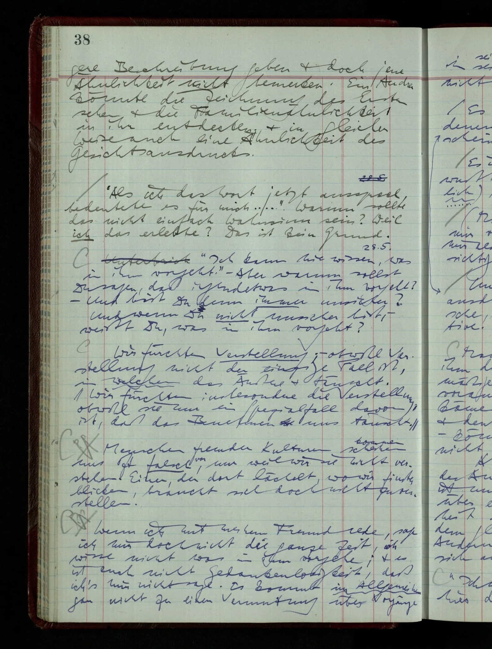 Denk dir eine Sitte, nach welcher man ein Recht nur hat, über den eigenen Zustand etwas auszusagen. Alles andere gilt als Vermessenheit. Die Leute leben aber, in praktischer Hinsicht, doch so wie wir.