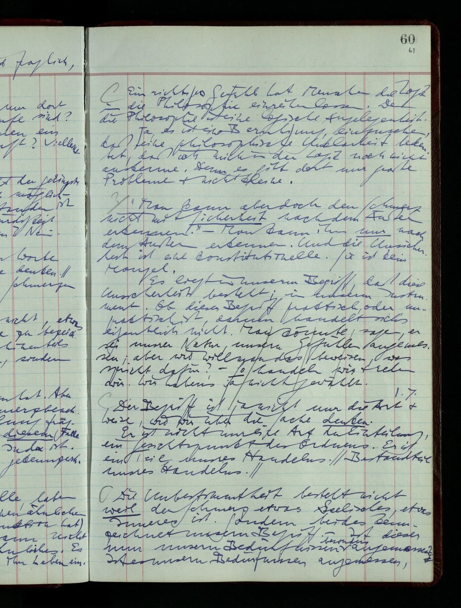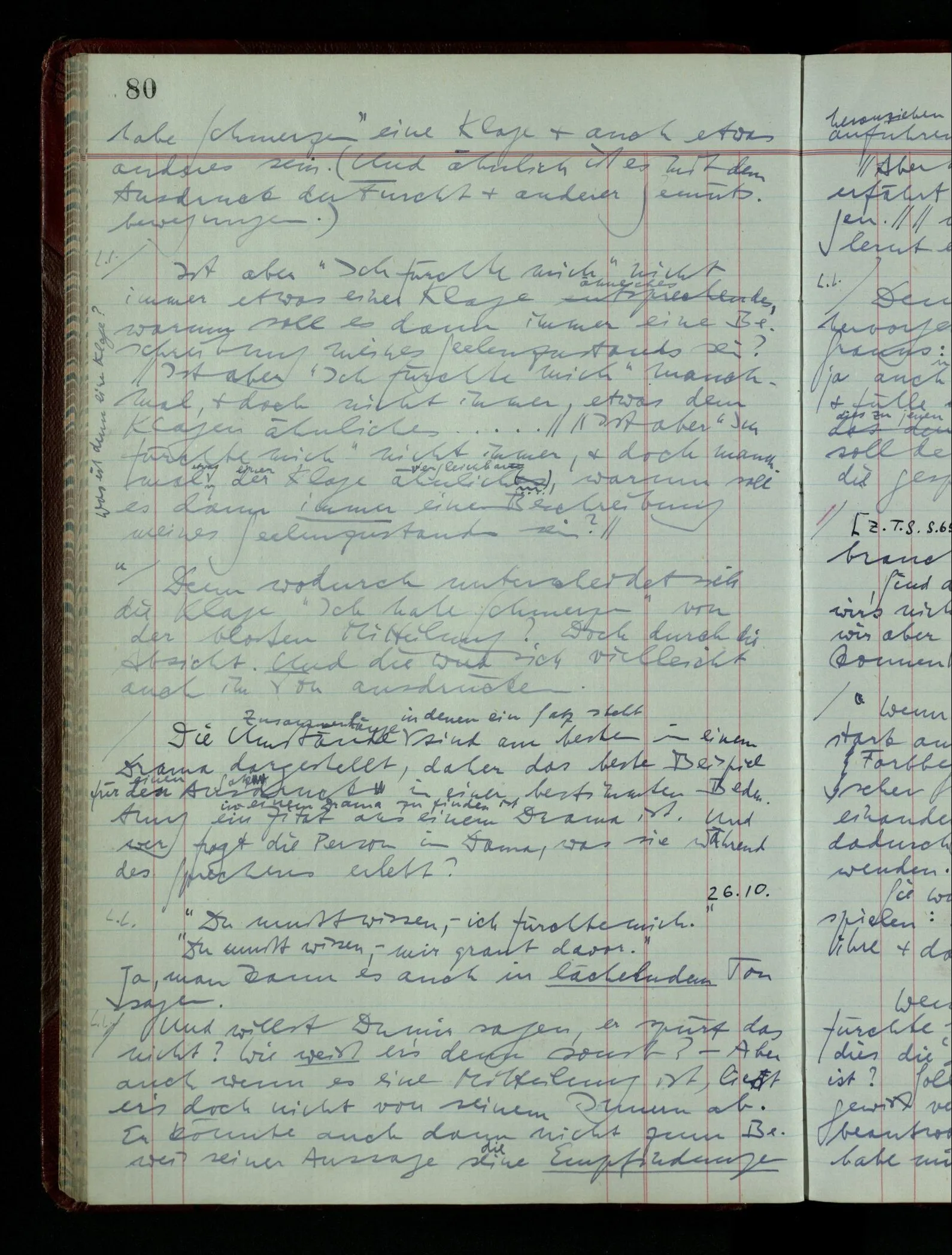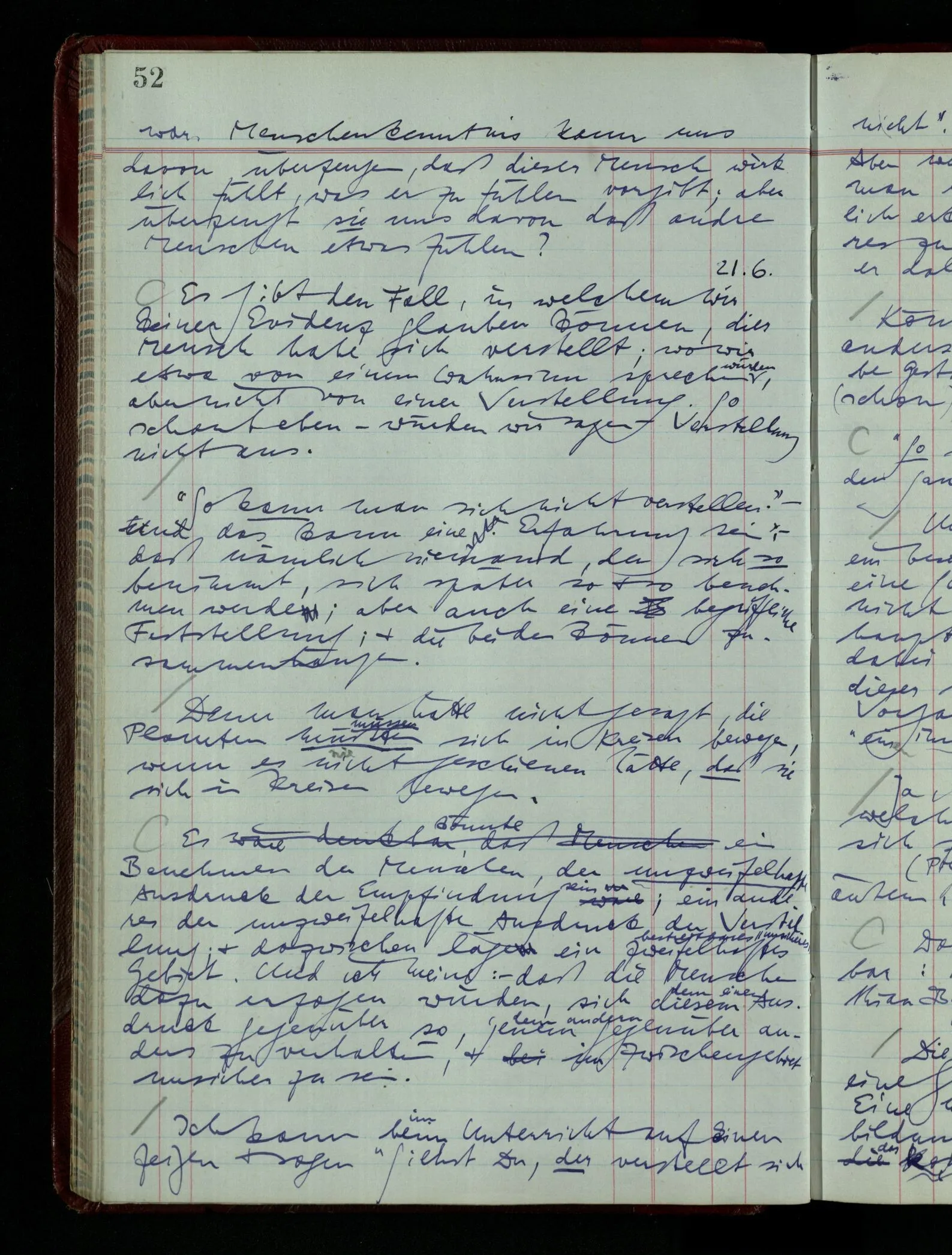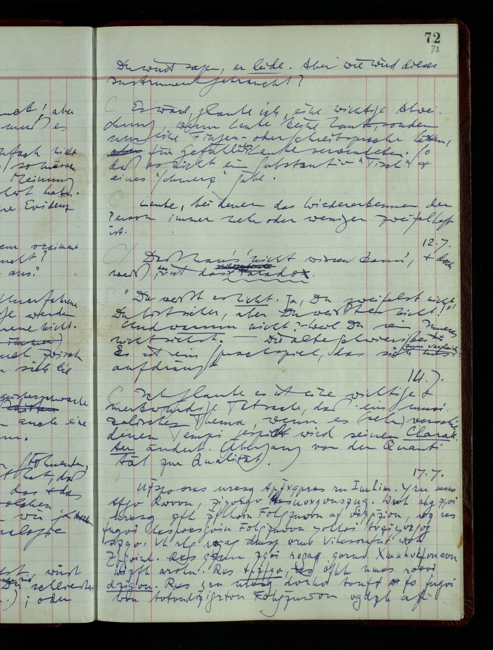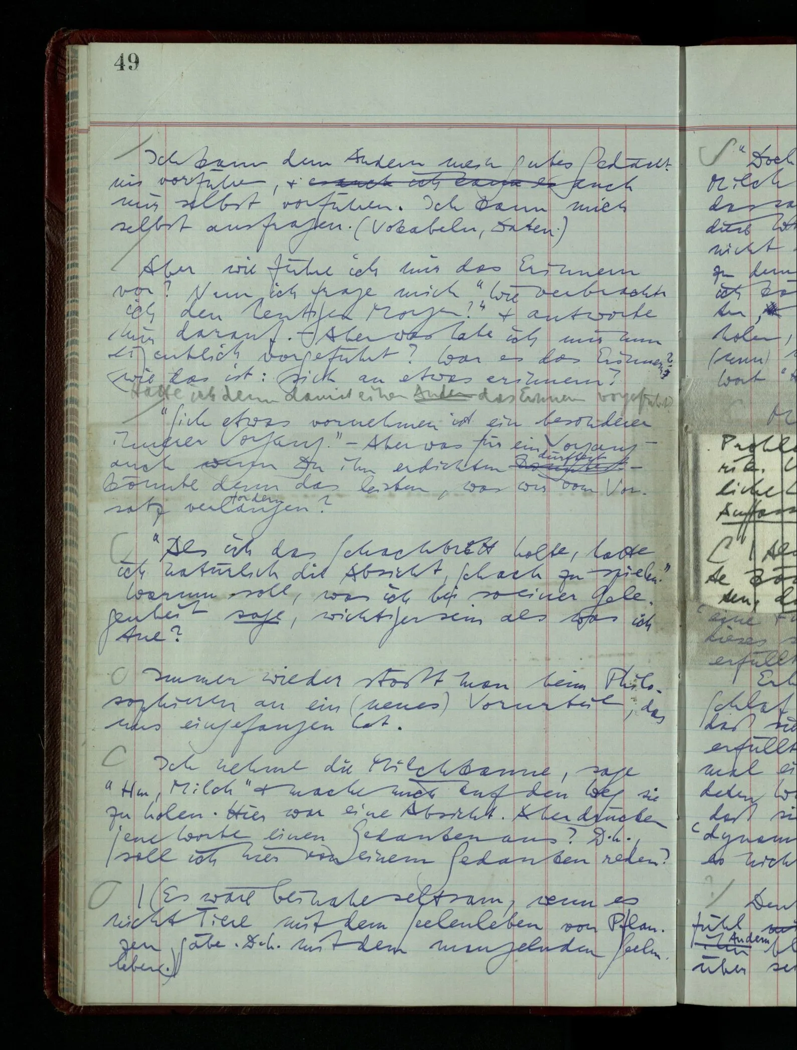 Denk dir eine Sitte, nach welcher man ein Recht nur hat, über den eigenen Zustand etwas auszusagen. Alles andere gilt als Vermessenheit. Die Leute leben aber, in praktischer Hinsicht, doch so wie wir.