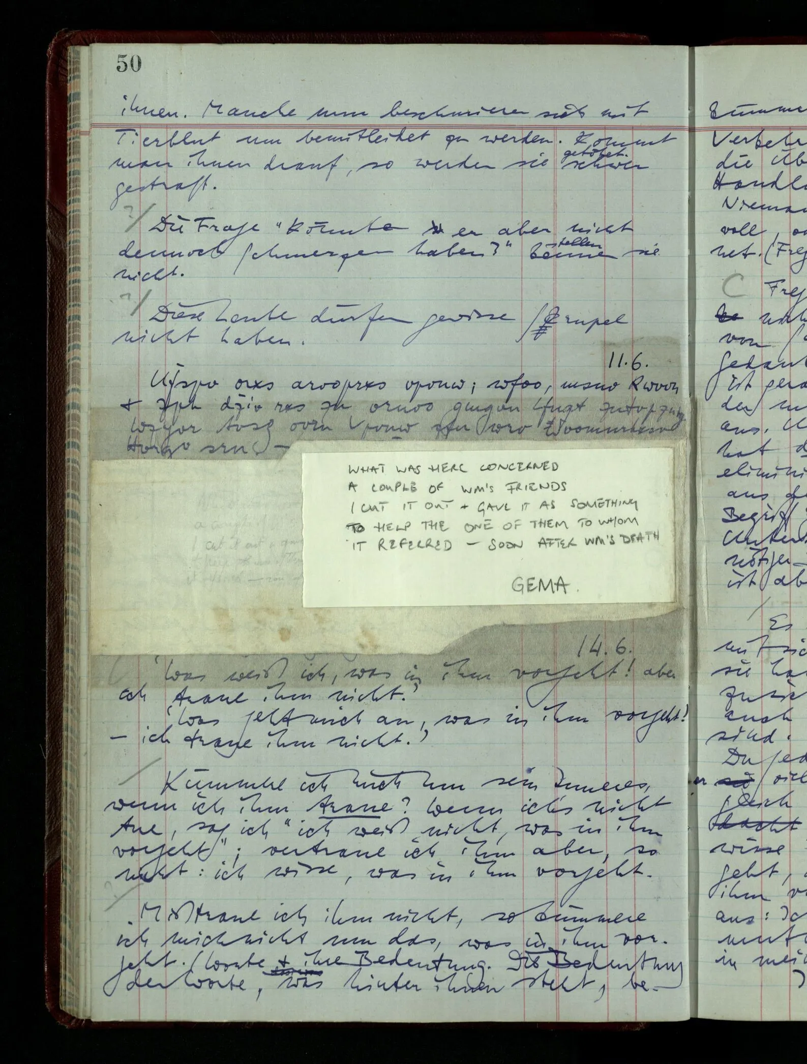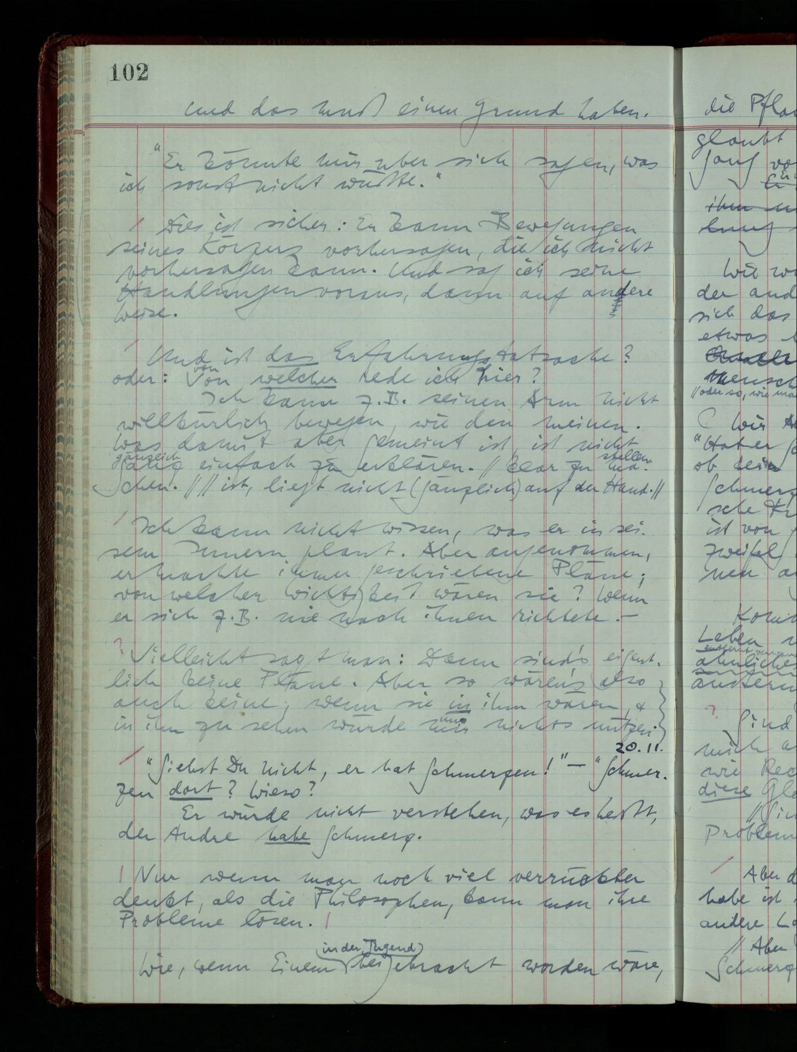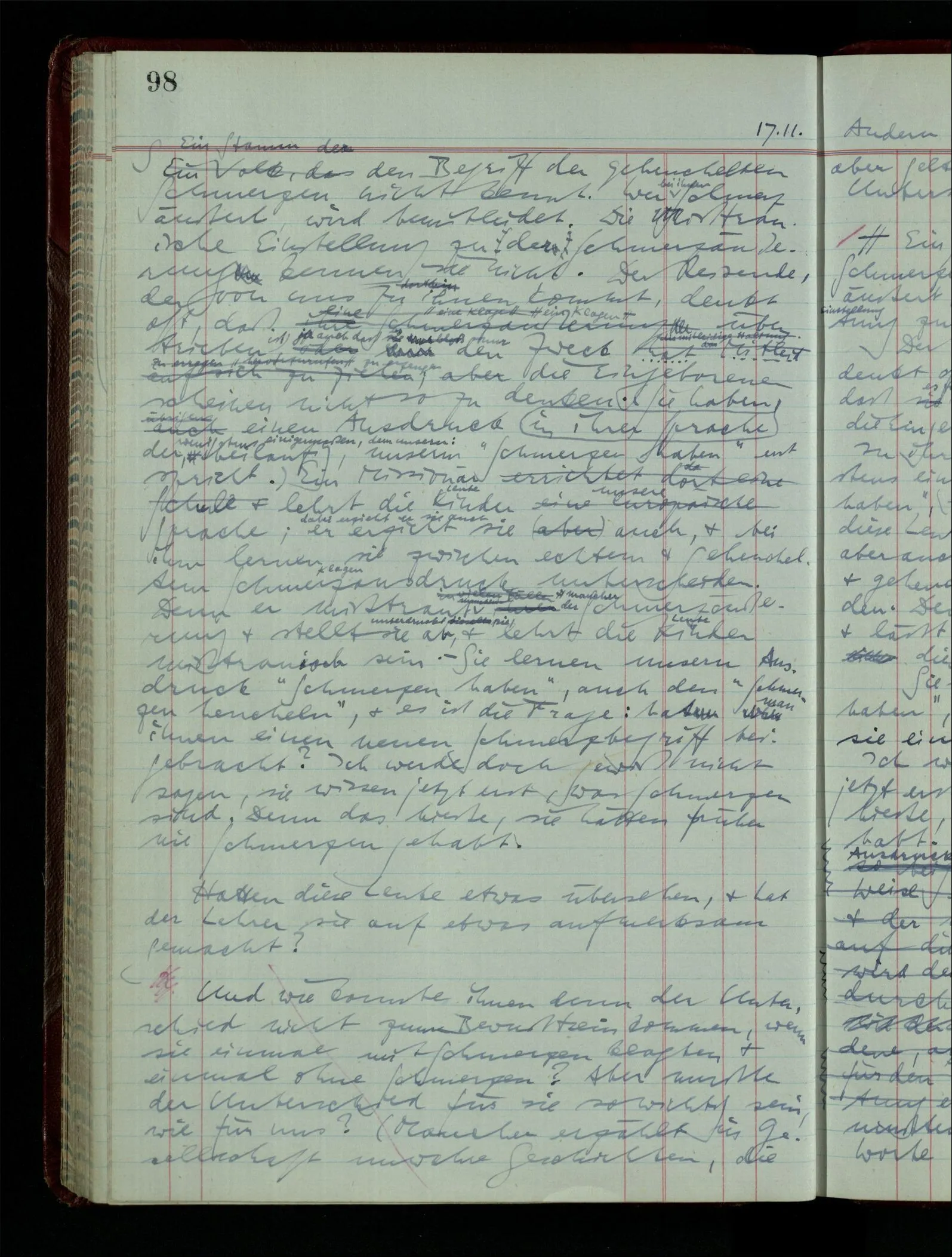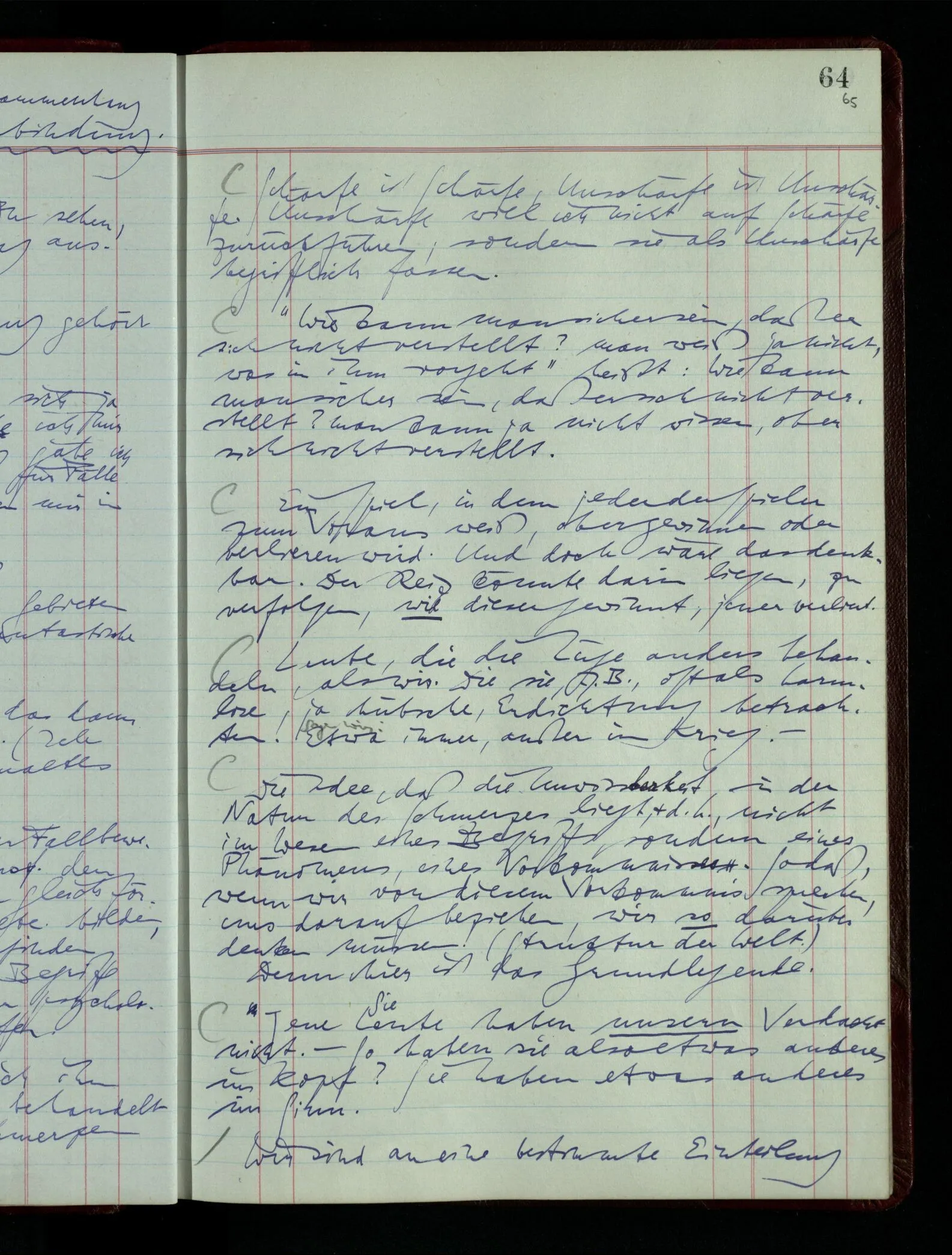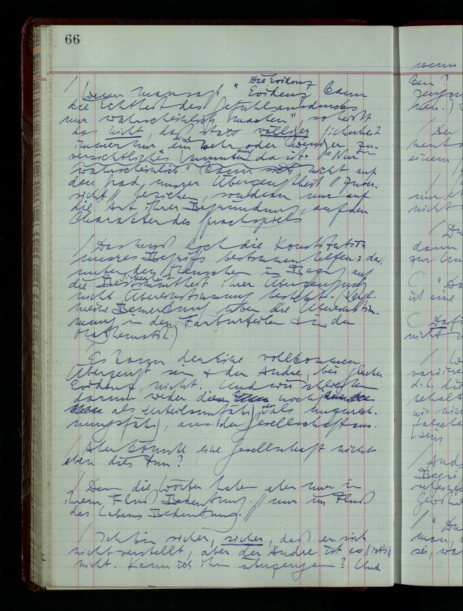 Denk dir eine Sitte, nach welcher man ein Recht nur hat, über den eigenen Zustand etwas auszusagen. Alles andere gilt als Vermessenheit. Die Leute leben aber, in praktischer Hinsicht, doch so wie wir.