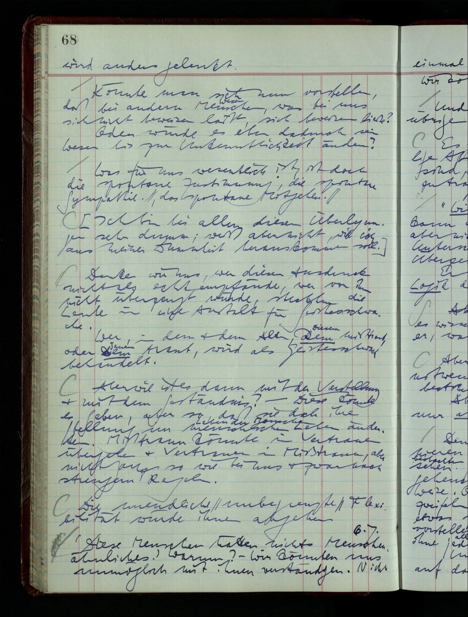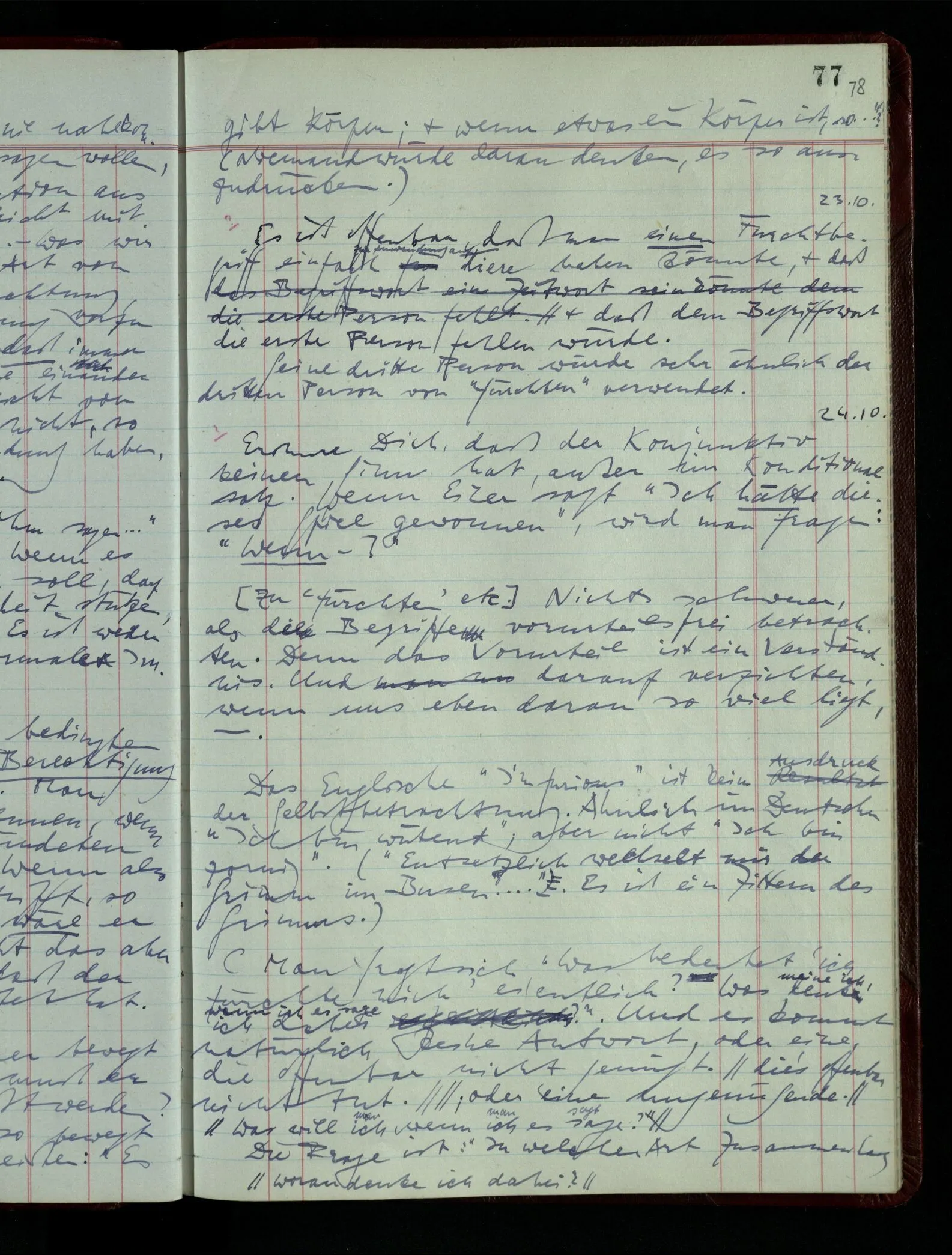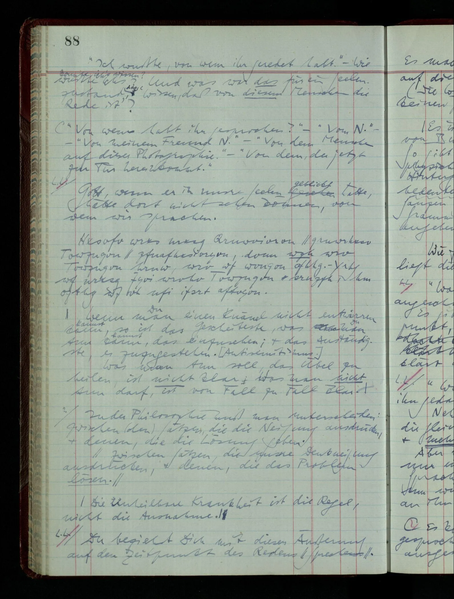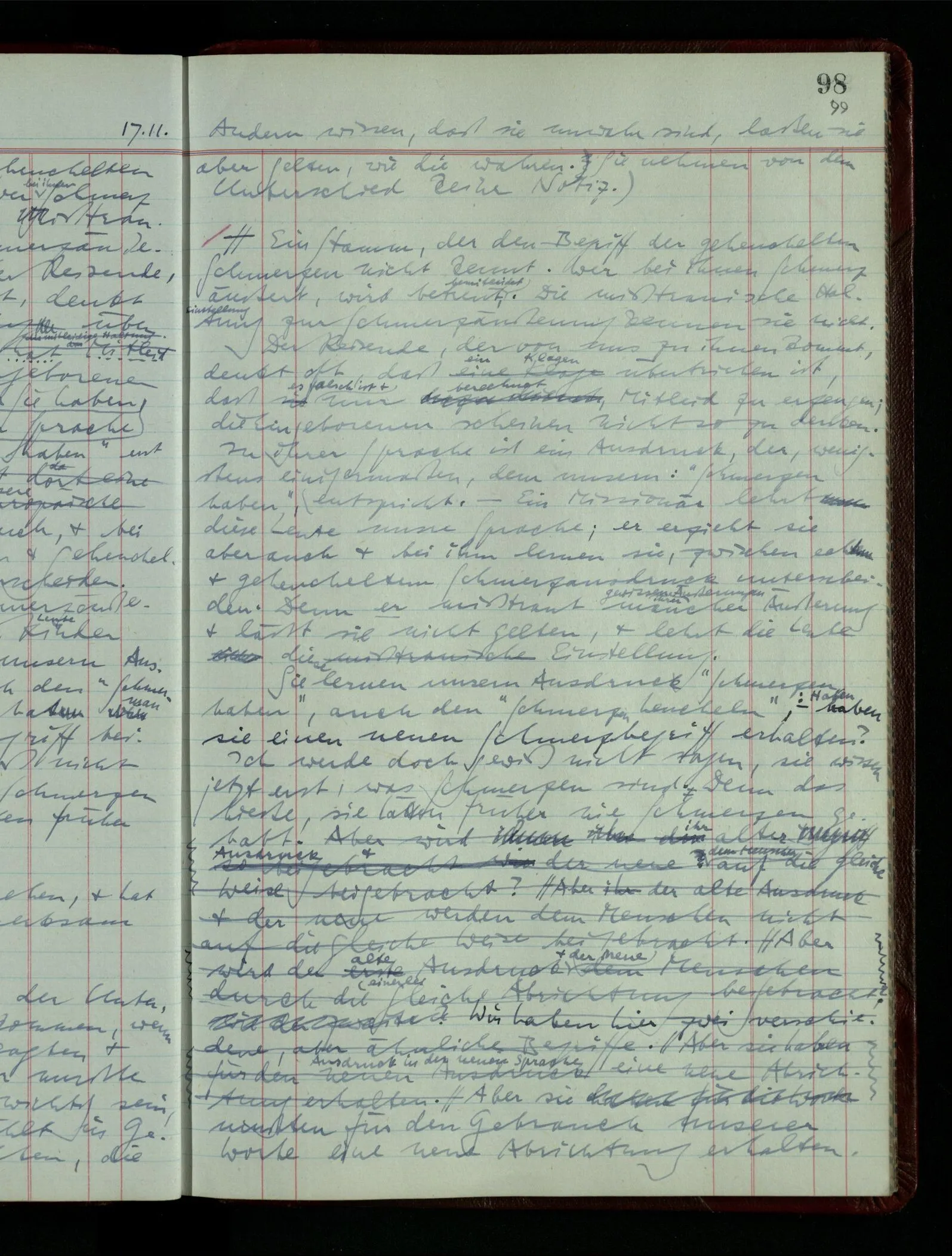 Denk dir eine Sitte, nach welcher man ein Recht nur hat, über den eigenen Zustand etwas auszusagen. Alles andere gilt als Vermessenheit. Die Leute leben aber, in praktischer Hinsicht, doch so wie wir.