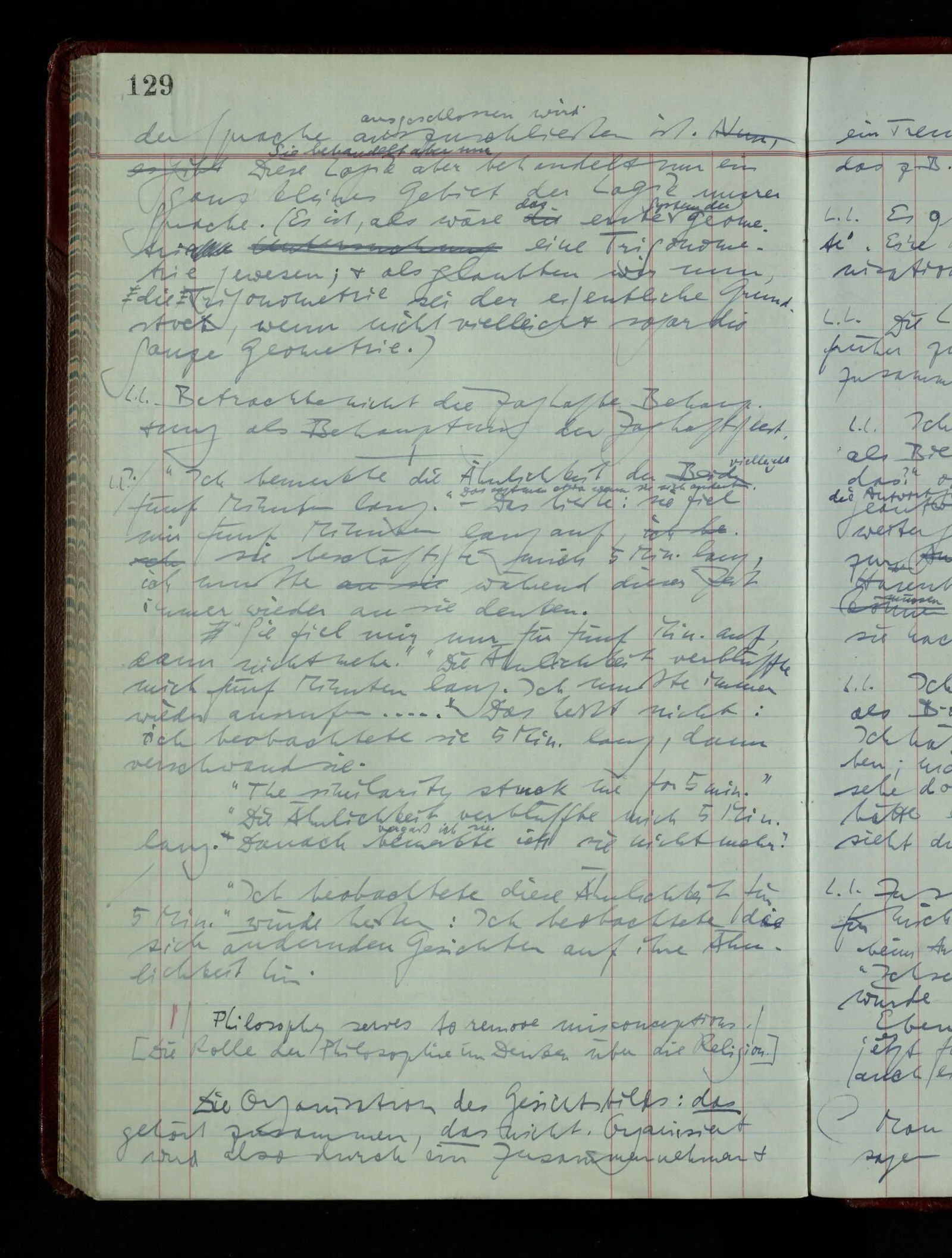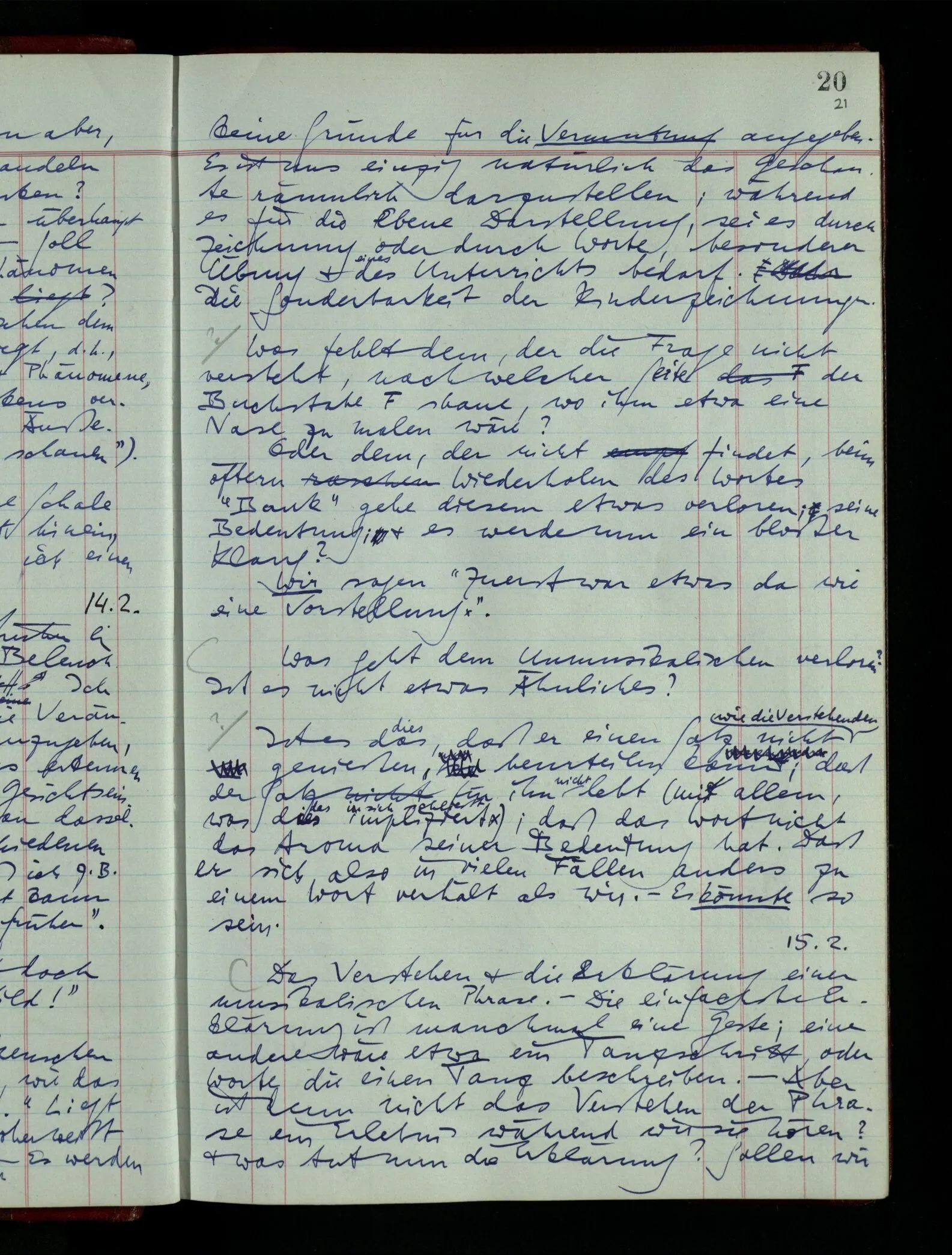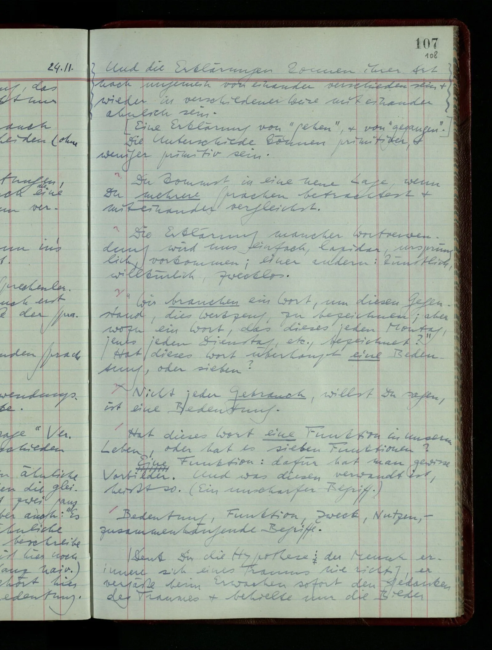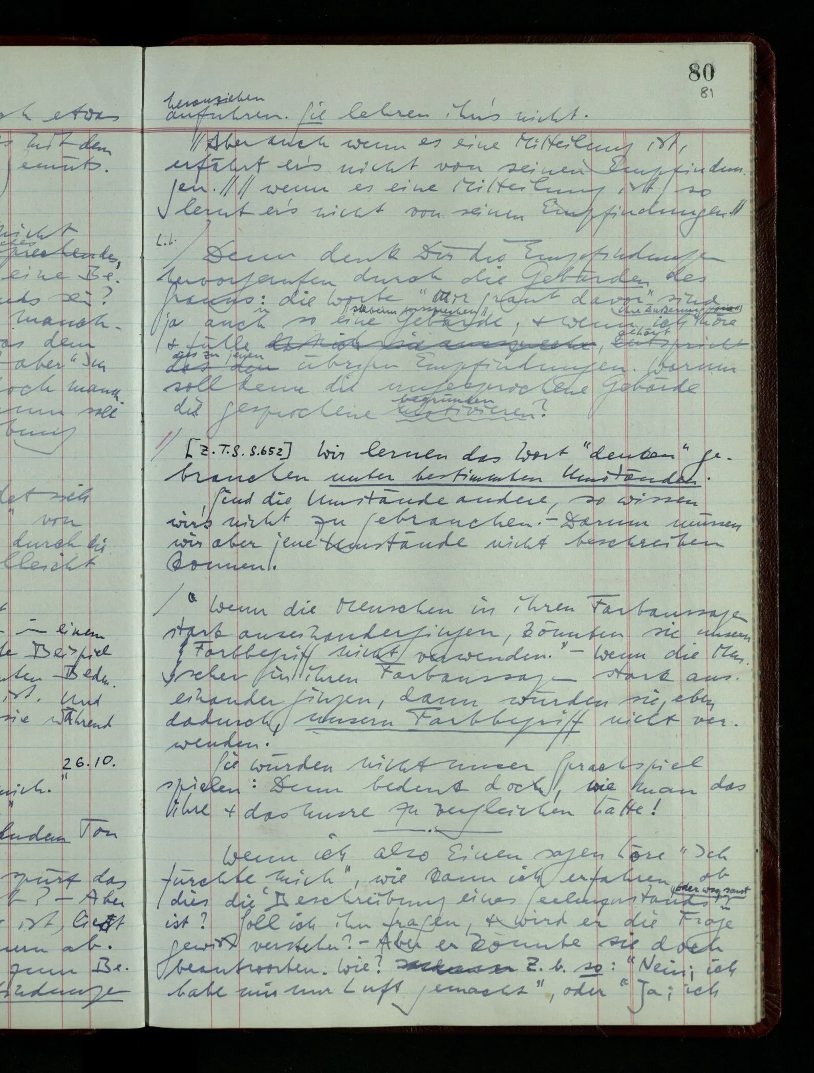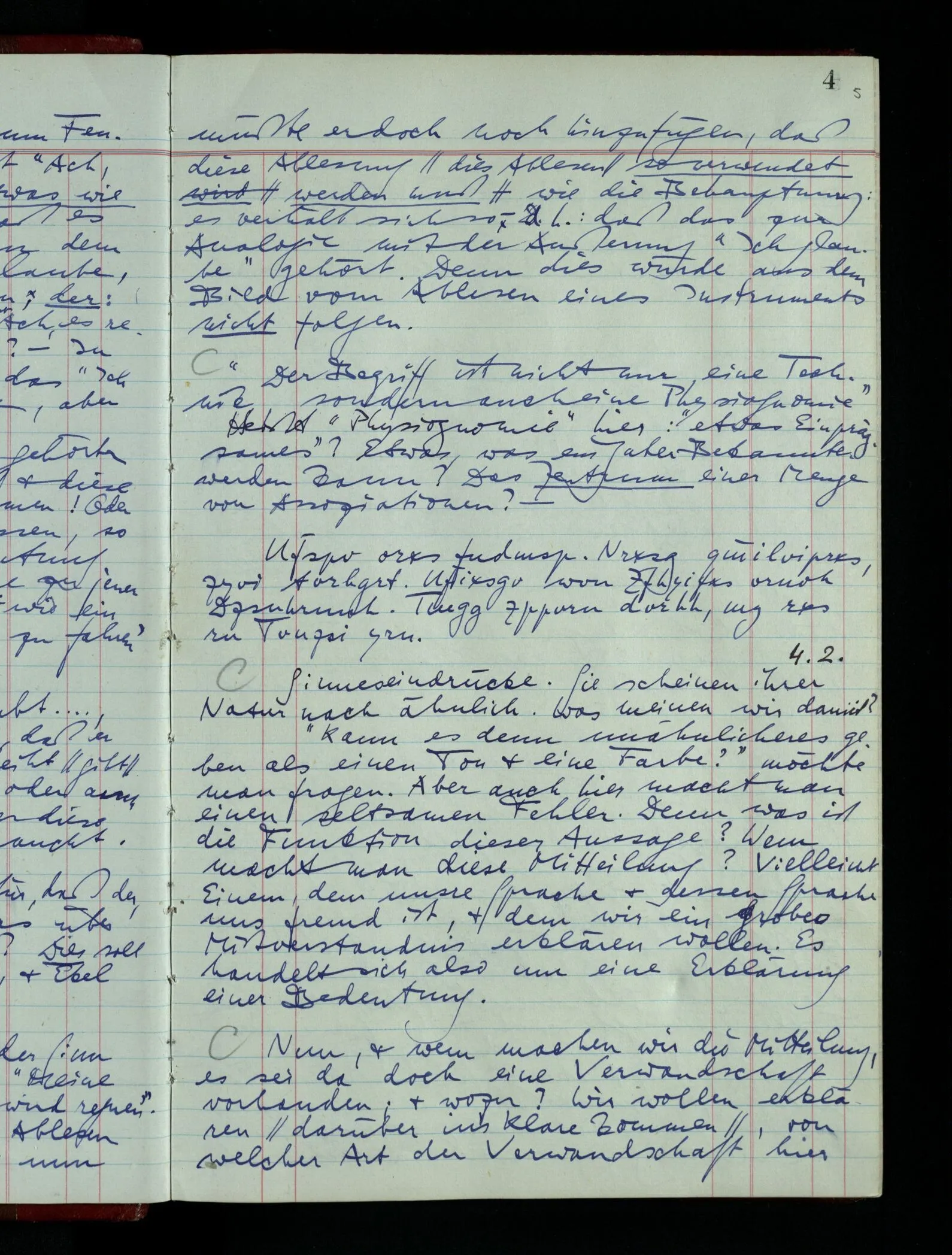 04.02.1948 Sinneseindrücke. Sie scheinen ihrer Natur nach ähnlich. Was meinen wir damit? “Kann es denn Unähnlicheres geben als einen Ton & eine Farbe?” möchte man fragen. Aber auch hier macht man einen seltsamen Fehler. Denn was ist die Funktion dieser Aussage? Wem macht man diese Mitteilung? Vielleicht Einem, dem unsre Sprache & dessen Sprache uns fremd ist, & dem wir ein großes Mißverständnis erklären wollen. Es handelt sich also um eine Erklärung einer Bedeutung.