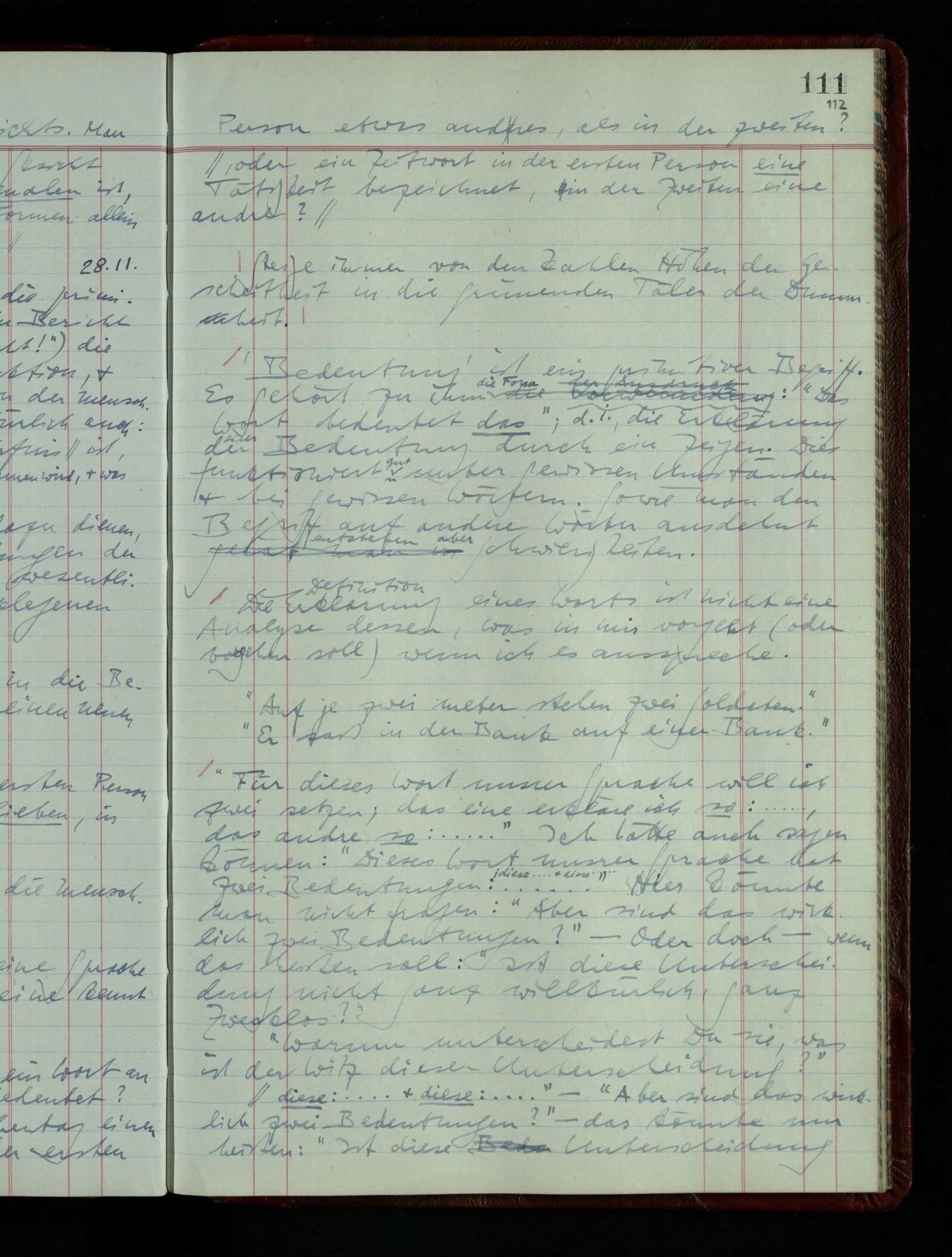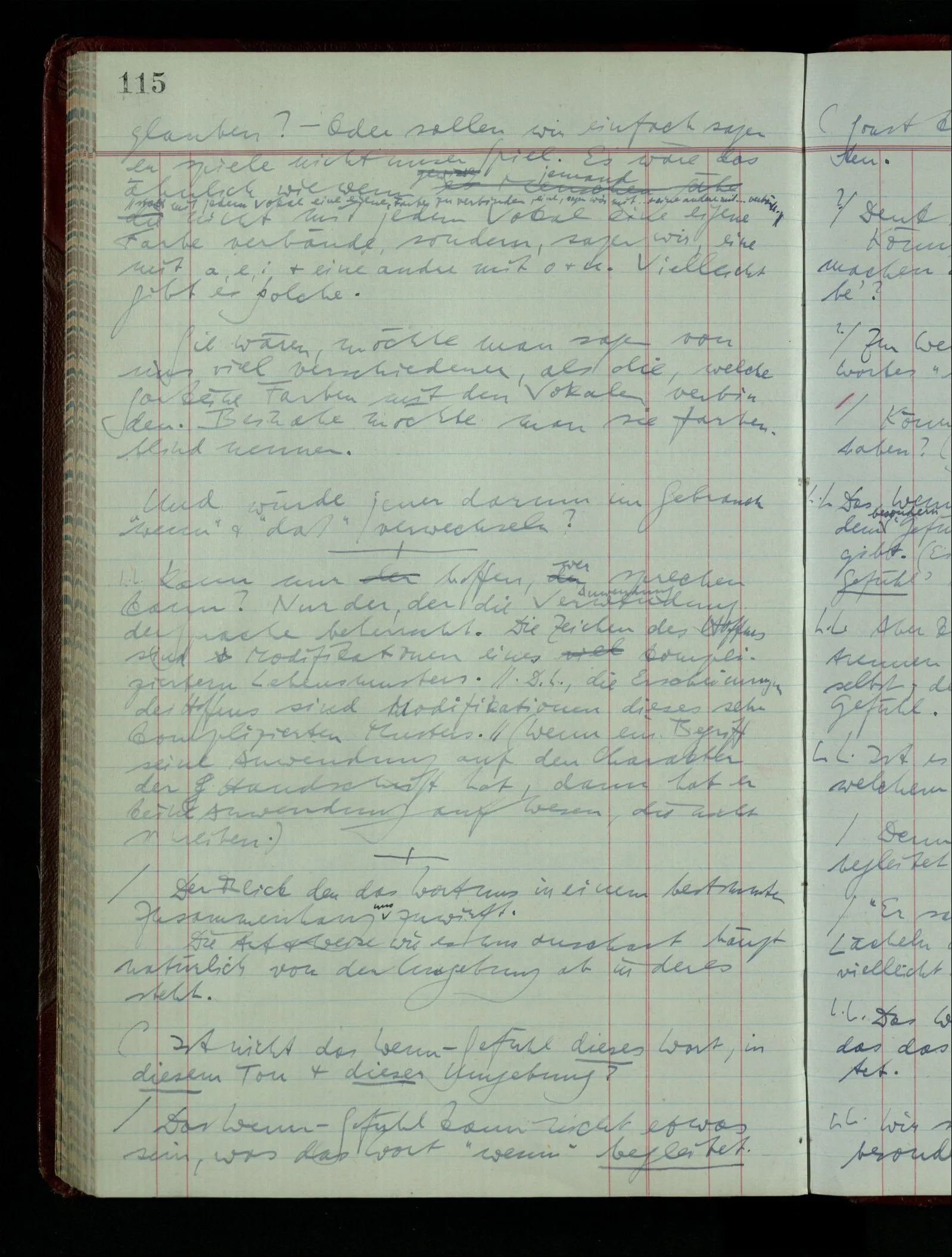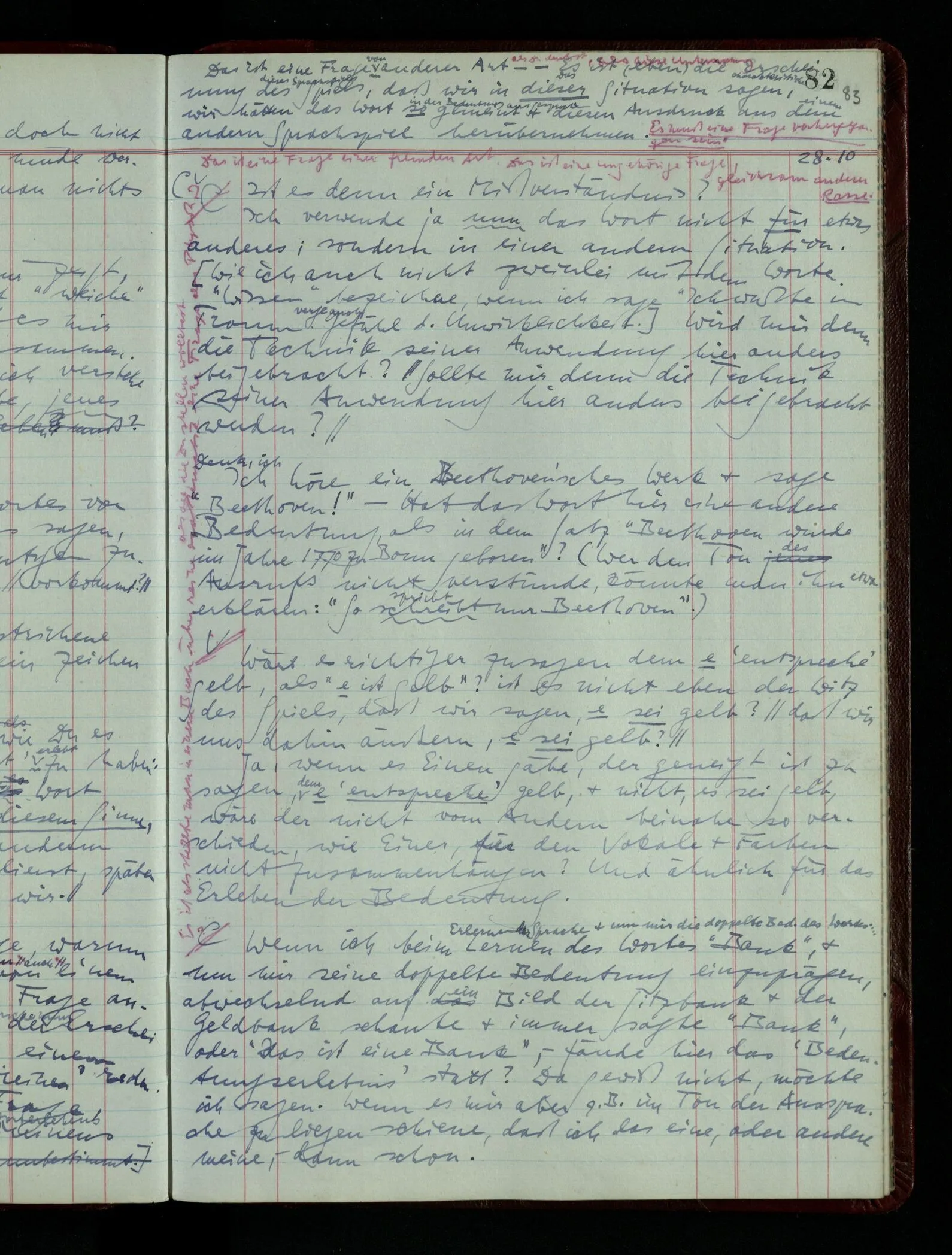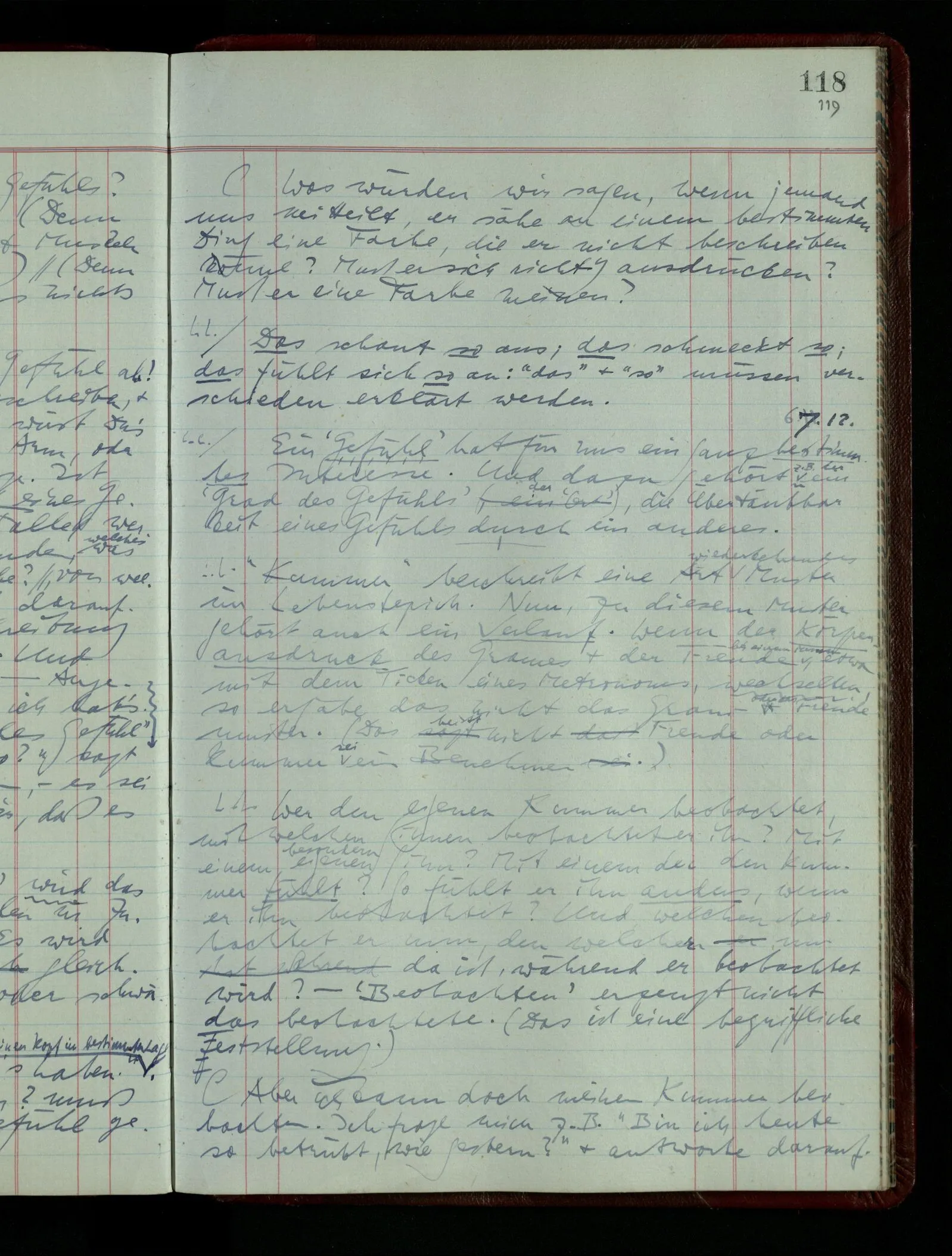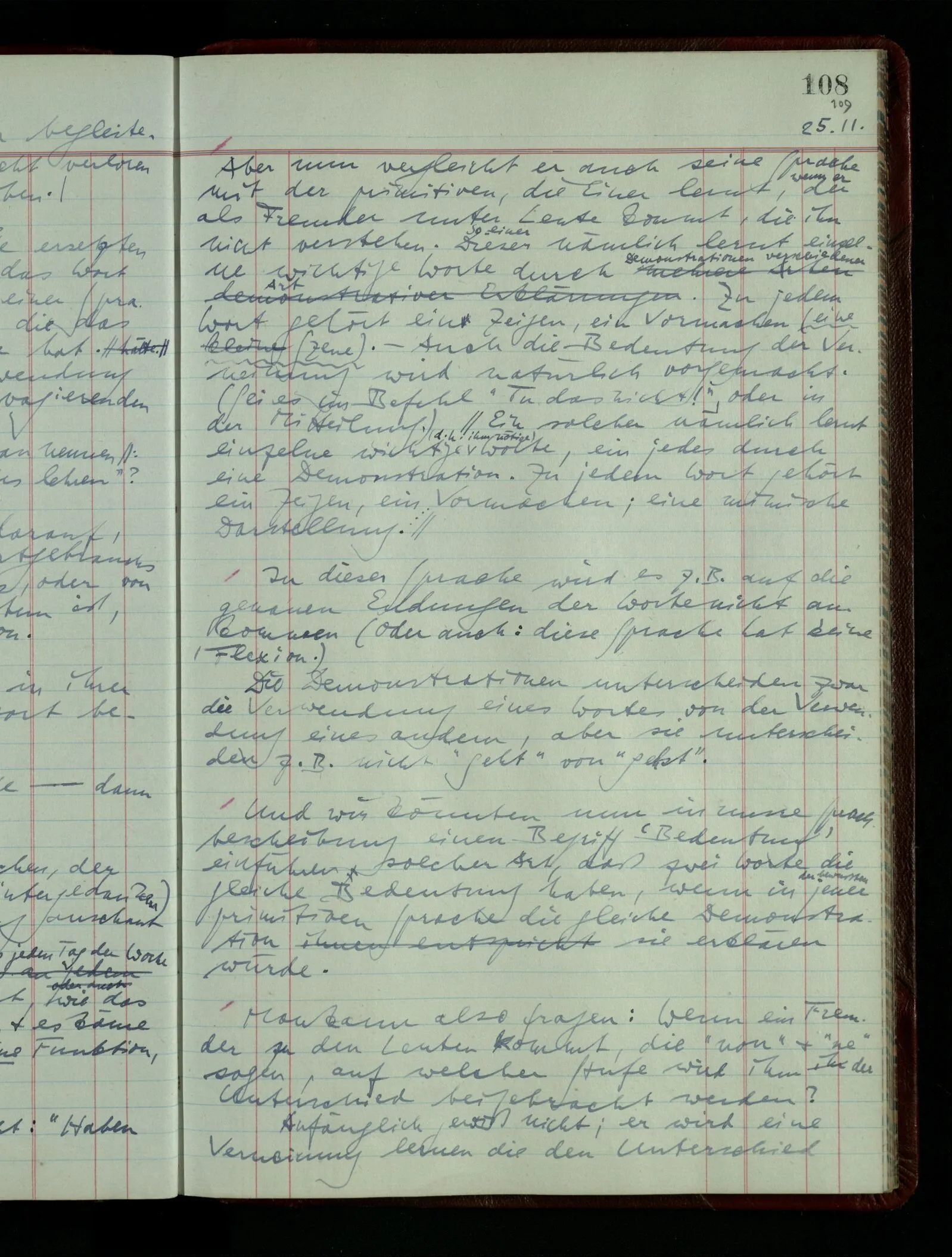04.02.1948 Sinneseindrücke. Sie scheinen ihrer Natur nach ähnlich. Was meinen wir damit? “Kann es denn Unähnlicheres geben als einen Ton & eine Farbe?” möchte man fragen. Aber auch hier macht man einen seltsamen Fehler. Denn was ist die Funktion dieser Aussage? Wem macht man diese Mitteilung? Vielleicht Einem, dem unsre Sprache & dessen Sprache uns fremd ist, & dem wir ein großes Mißverständnis erklären wollen. Es handelt sich also um eine Erklärung einer Bedeutung.