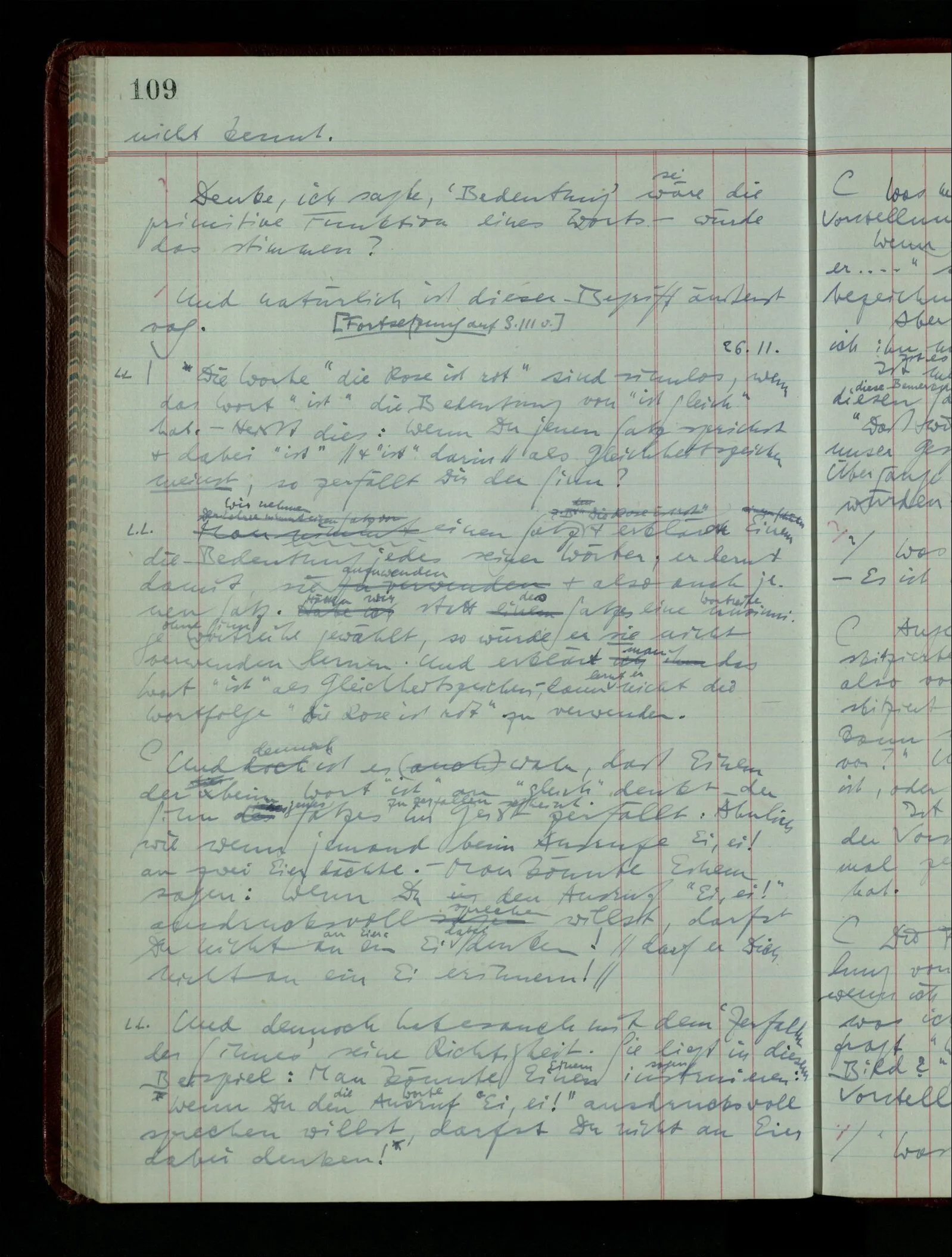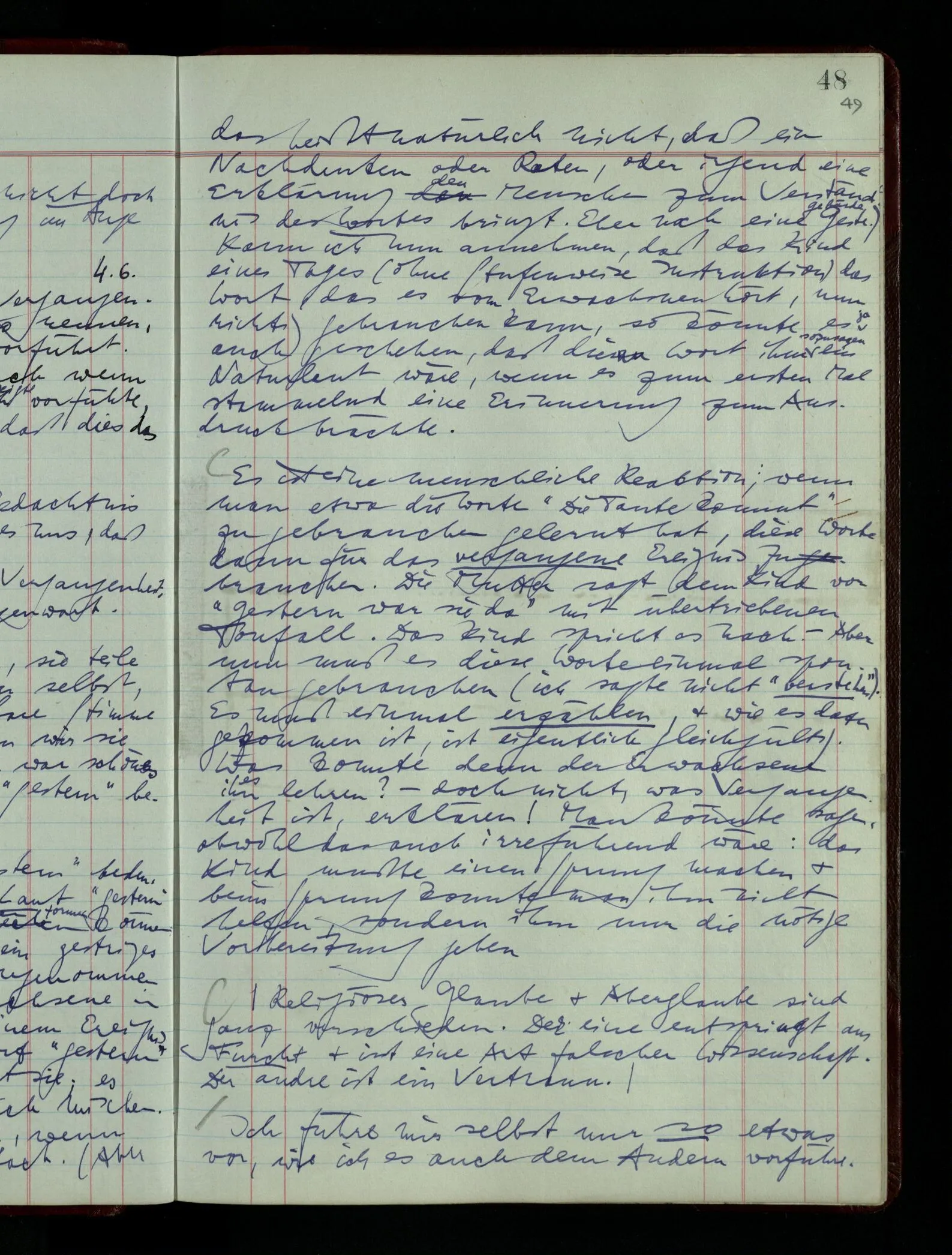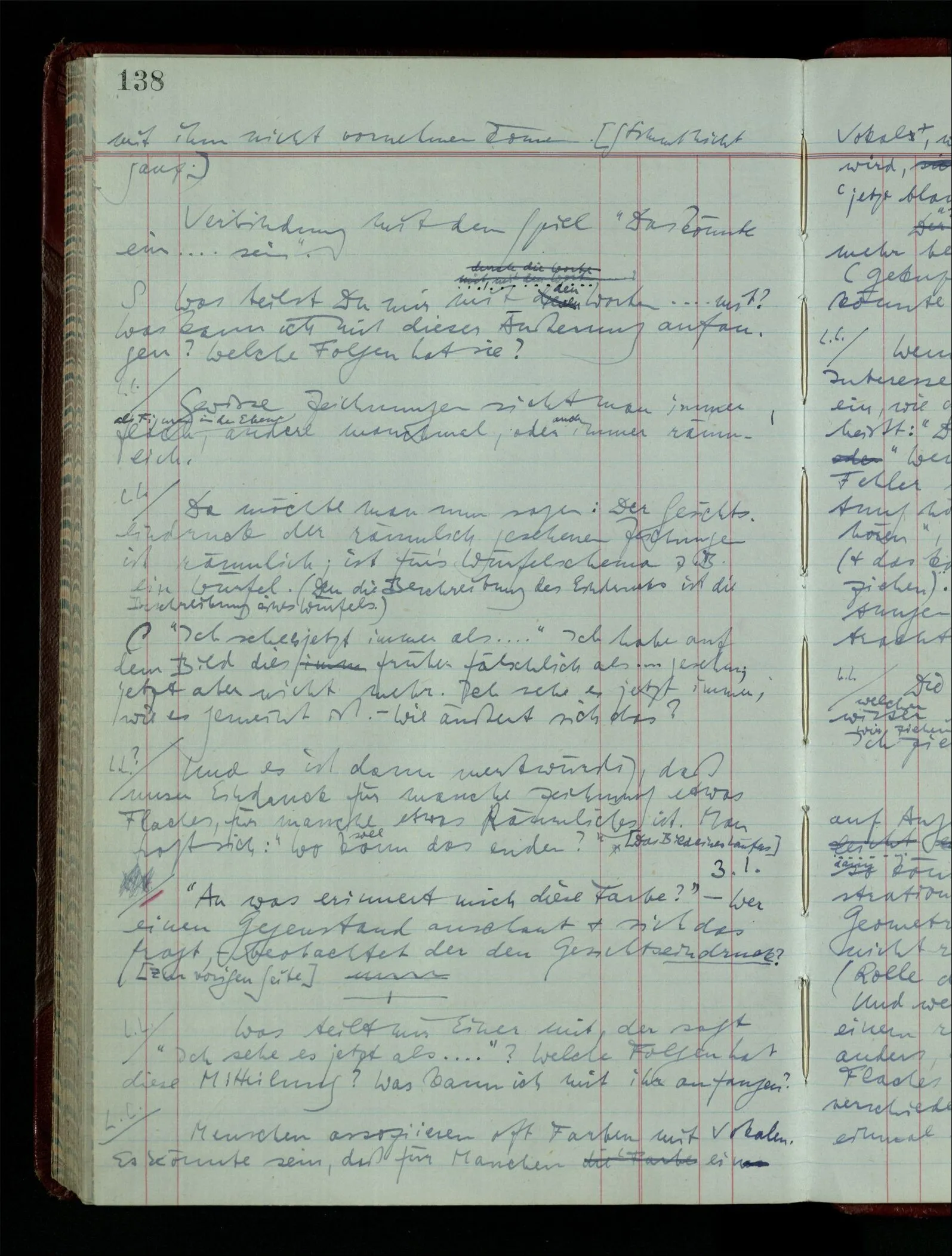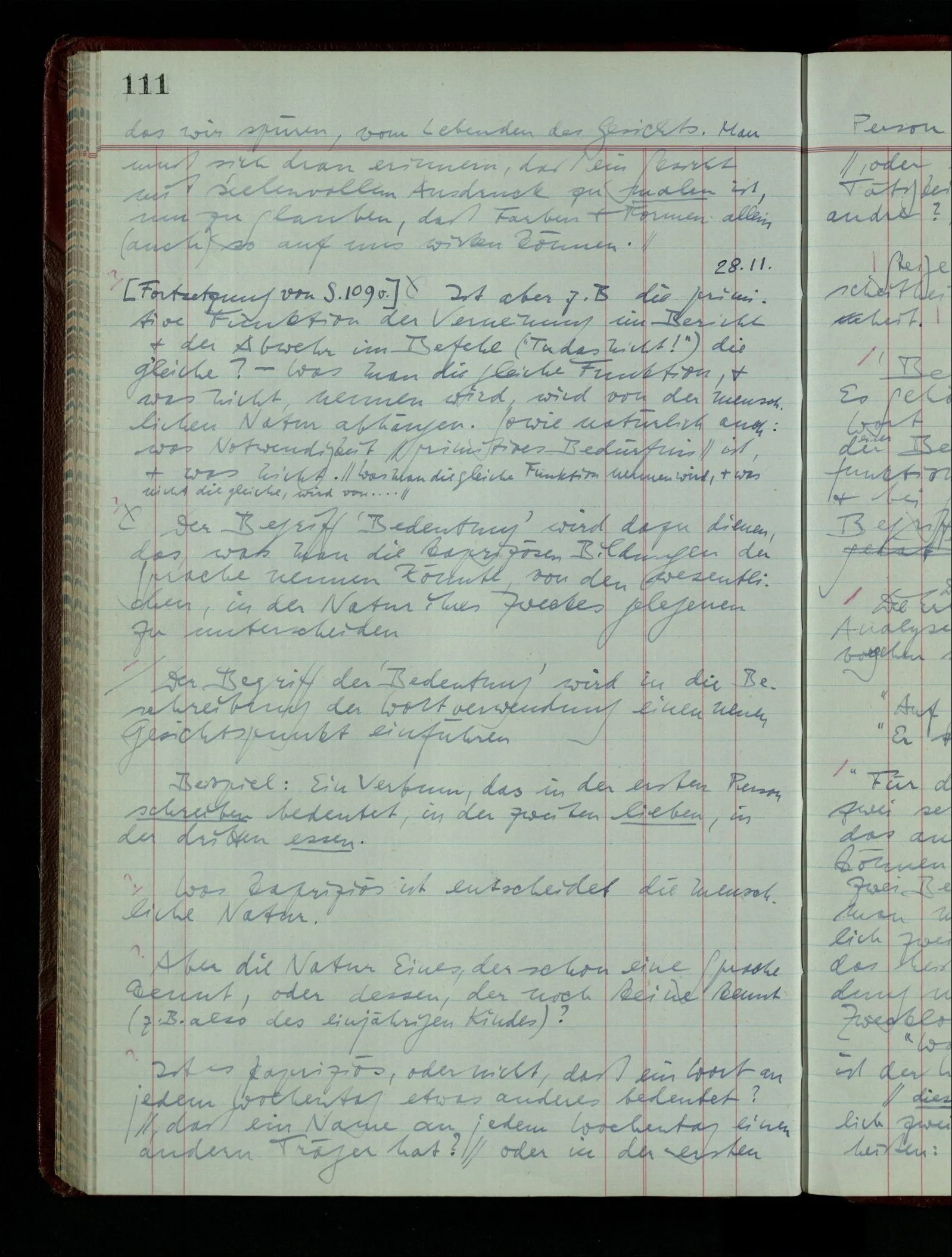 04.02.1948 Sinneseindrücke. Sie scheinen ihrer Natur nach ähnlich. Was meinen wir damit? “Kann es denn Unähnlicheres geben als einen Ton & eine Farbe?” möchte man fragen. Aber auch hier macht man einen seltsamen Fehler. Denn was ist die Funktion dieser Aussage? Wem macht man diese Mitteilung? Vielleicht Einem, dem unsre Sprache & dessen Sprache uns fremd ist, & dem wir ein großes Mißverständnis erklären wollen. Es handelt sich also um eine Erklärung einer Bedeutung.