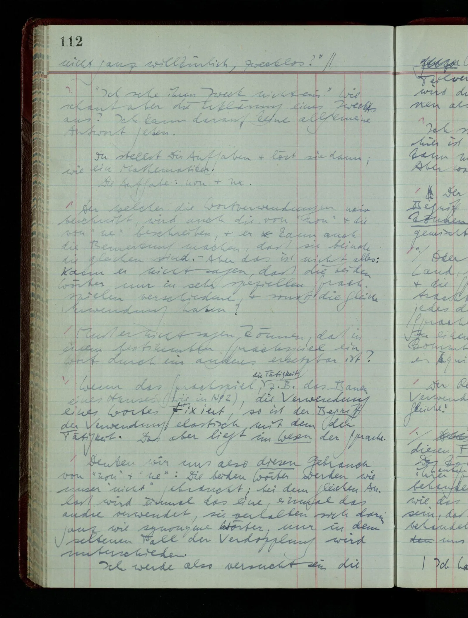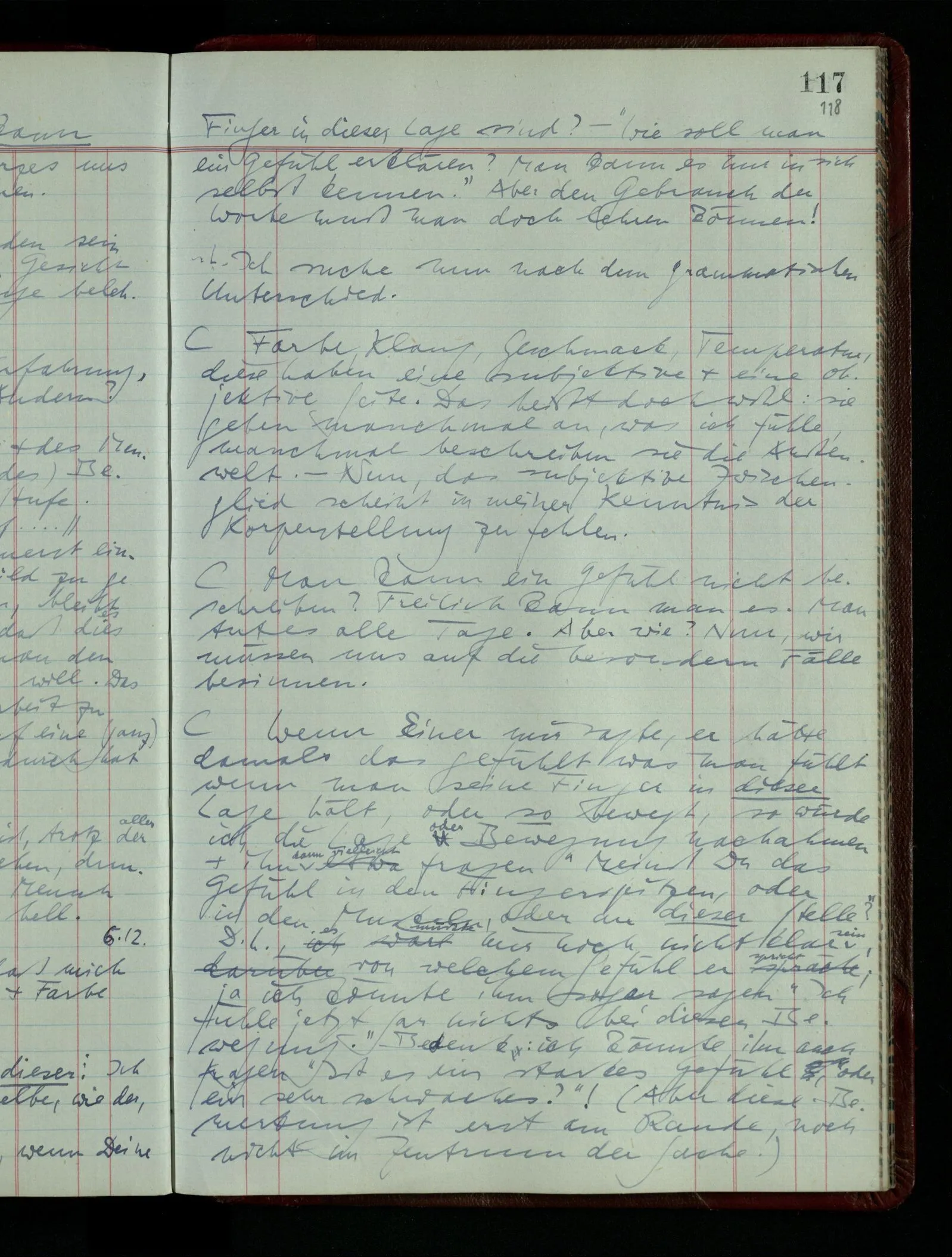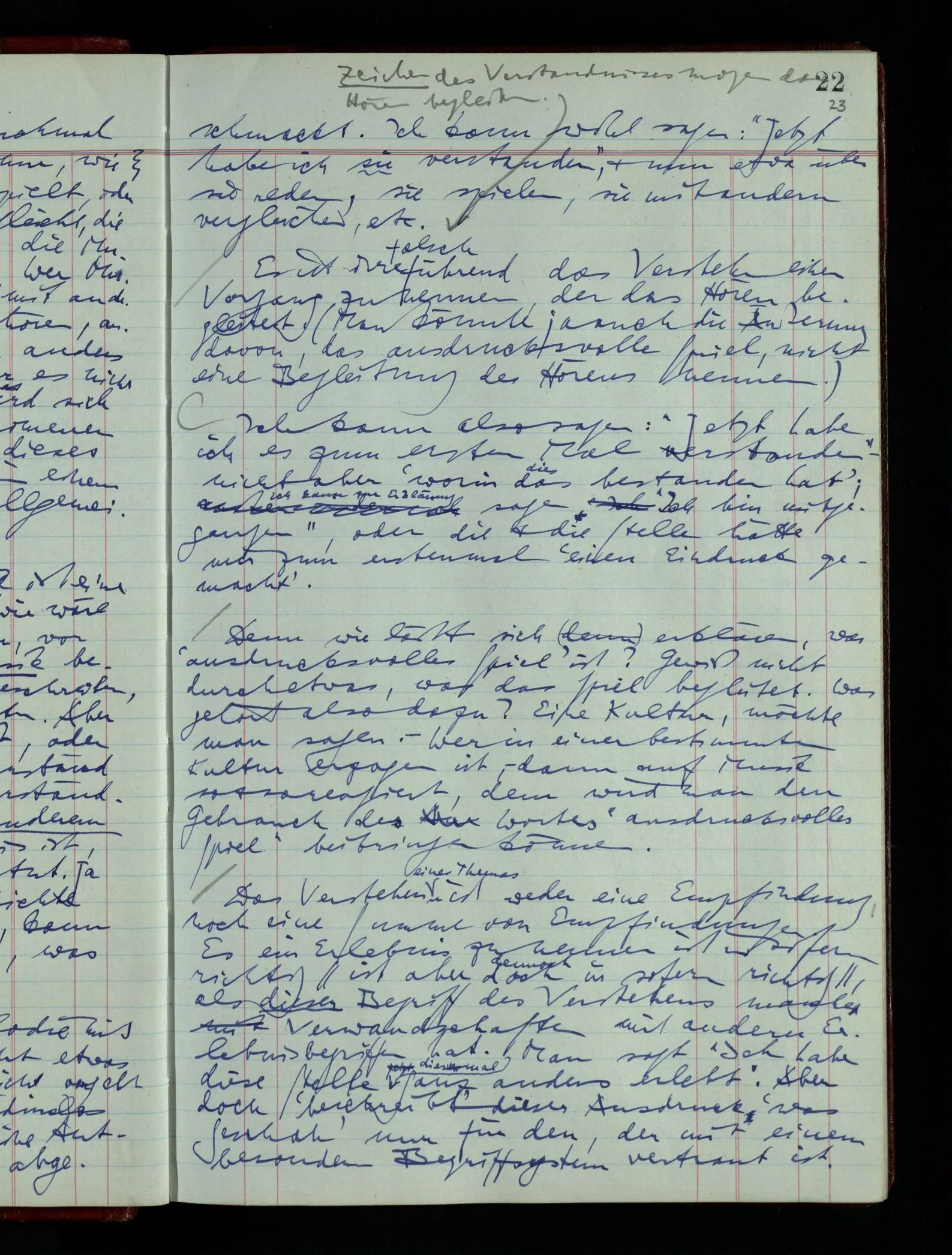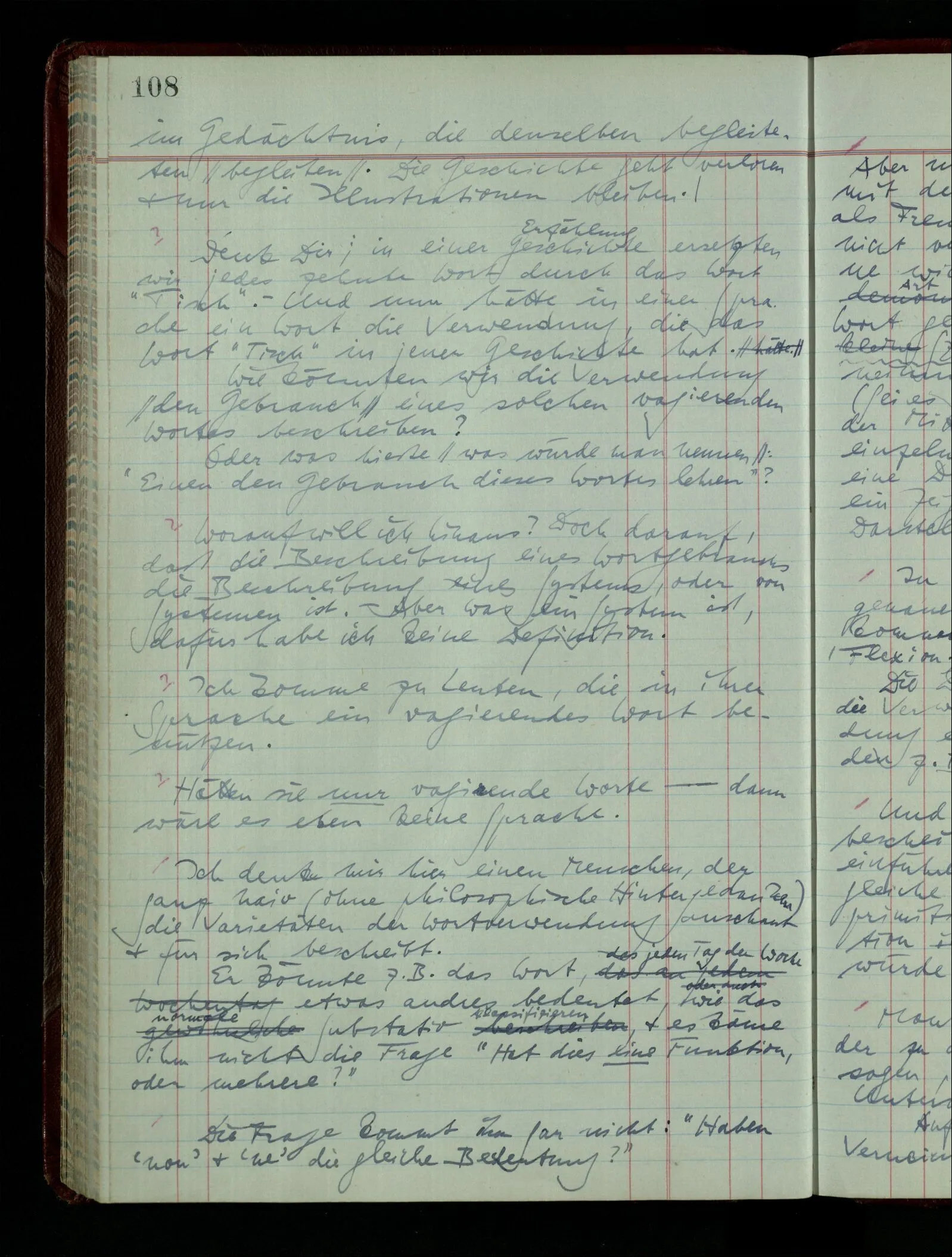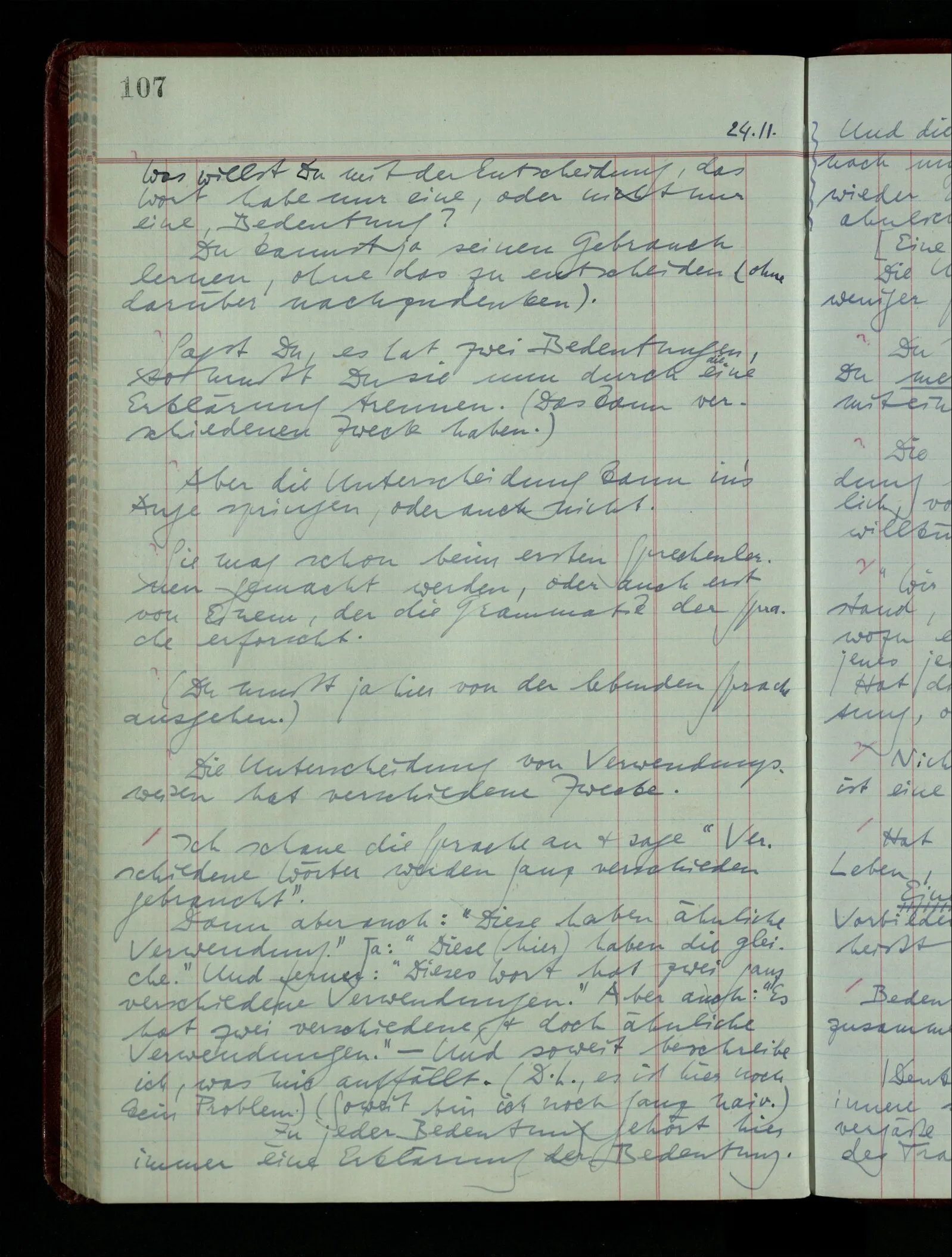 04.02.1948 Sinneseindrücke. Sie scheinen ihrer Natur nach ähnlich. Was meinen wir damit? “Kann es denn Unähnlicheres geben als einen Ton & eine Farbe?” möchte man fragen. Aber auch hier macht man einen seltsamen Fehler. Denn was ist die Funktion dieser Aussage? Wem macht man diese Mitteilung? Vielleicht Einem, dem unsre Sprache & dessen Sprache uns fremd ist, & dem wir ein großes Mißverständnis erklären wollen. Es handelt sich also um eine Erklärung einer Bedeutung.