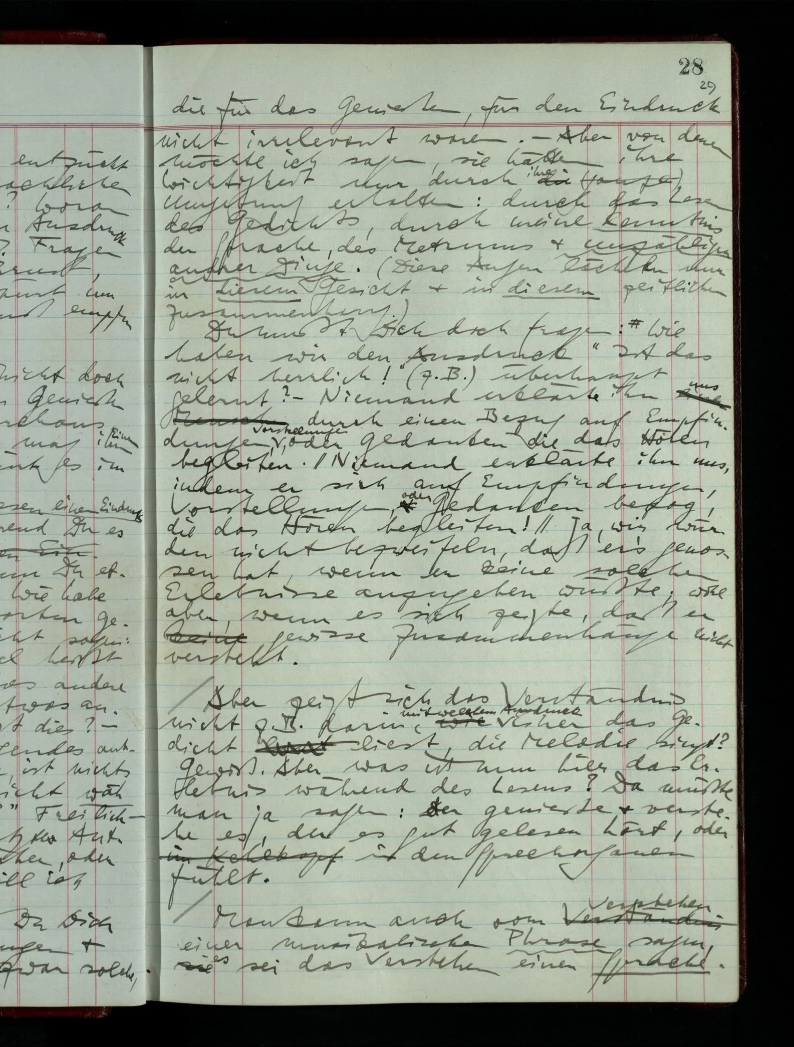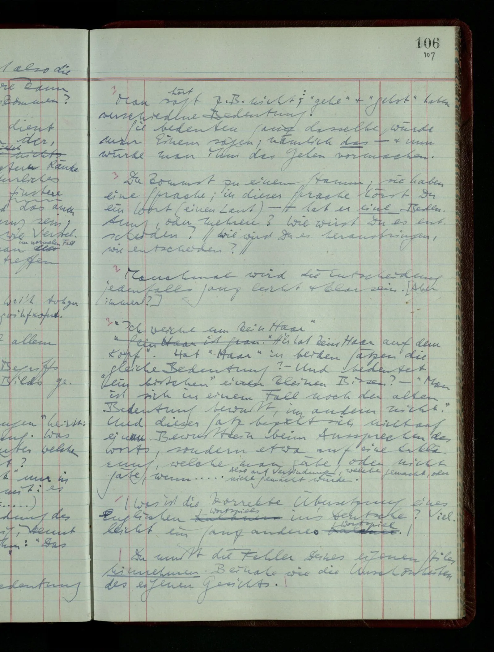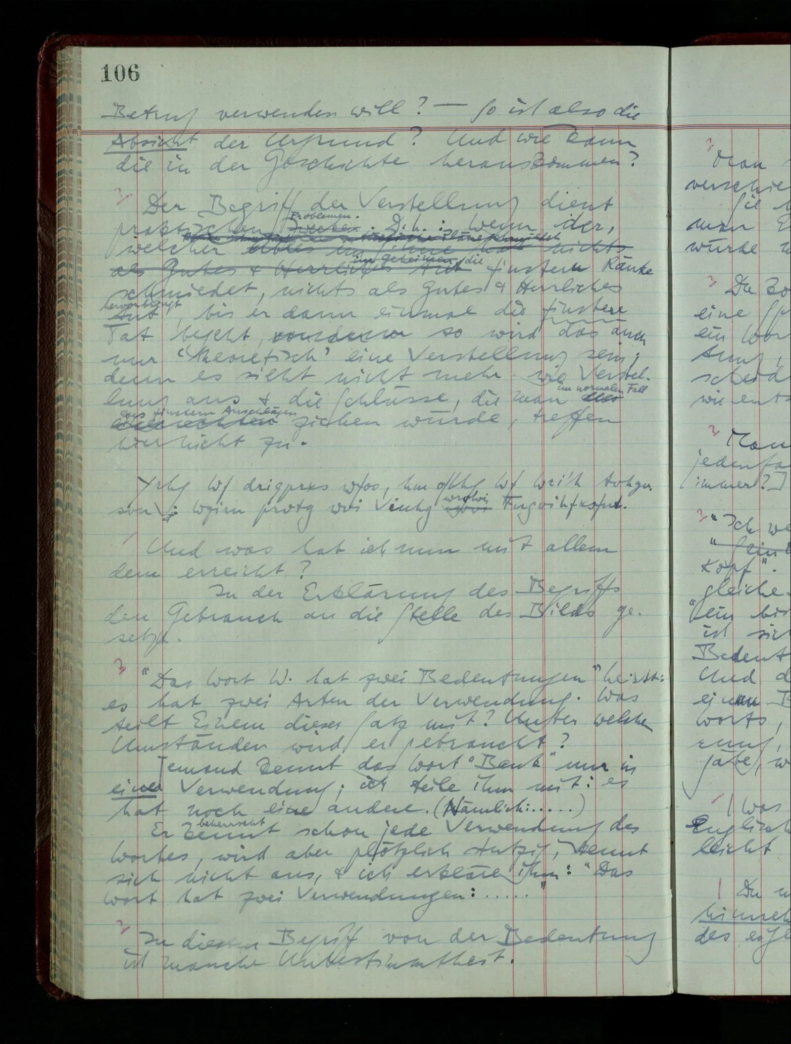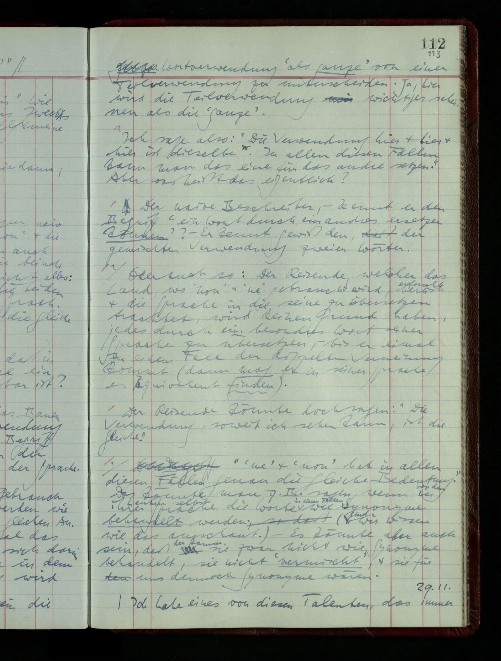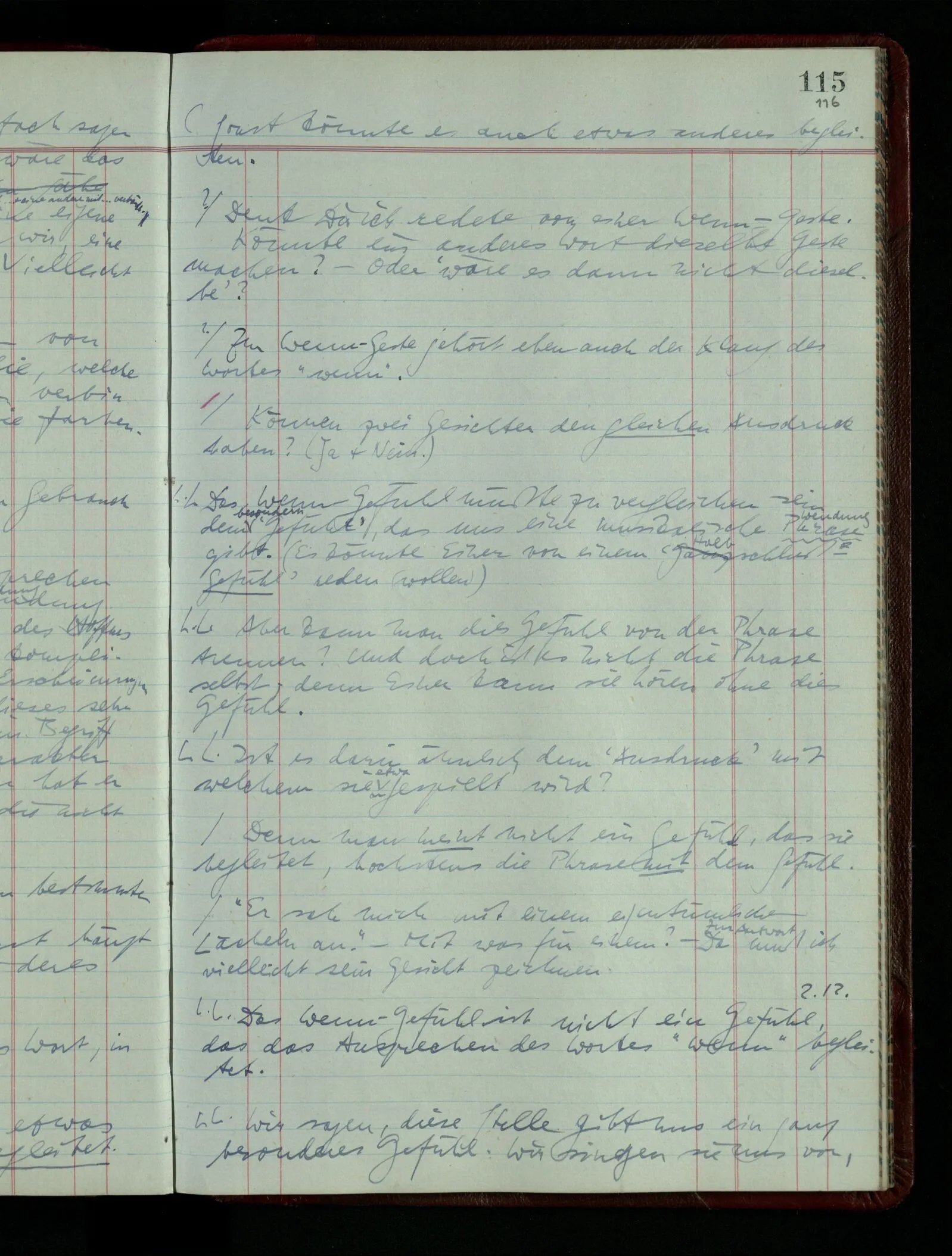 04.02.1948 Sinneseindrücke. Sie scheinen ihrer Natur nach ähnlich. Was meinen wir damit? “Kann es denn Unähnlicheres geben als einen Ton & eine Farbe?” möchte man fragen. Aber auch hier macht man einen seltsamen Fehler. Denn was ist die Funktion dieser Aussage? Wem macht man diese Mitteilung? Vielleicht Einem, dem unsre Sprache & dessen Sprache uns fremd ist, & dem wir ein großes Mißverständnis erklären wollen. Es handelt sich also um eine Erklärung einer Bedeutung.