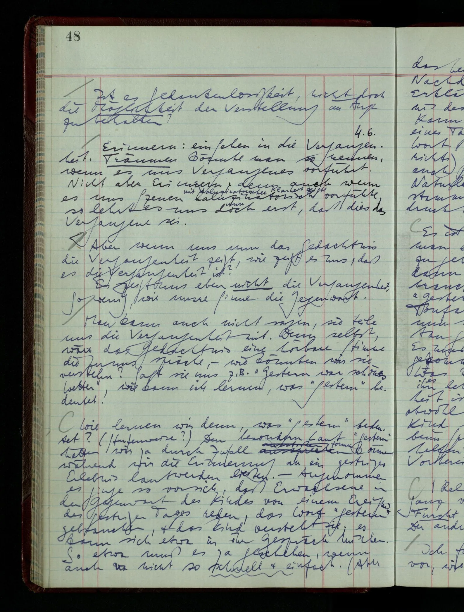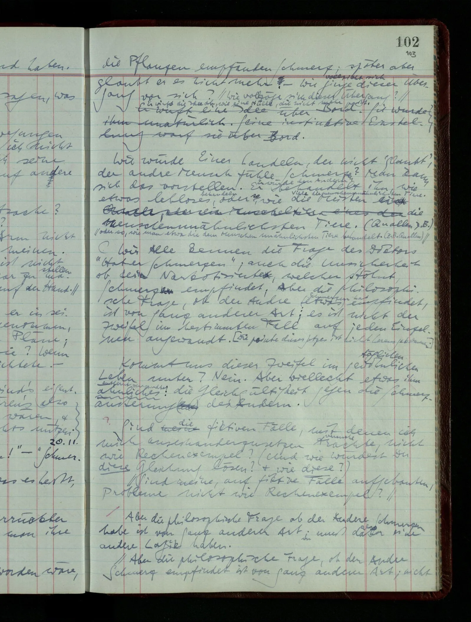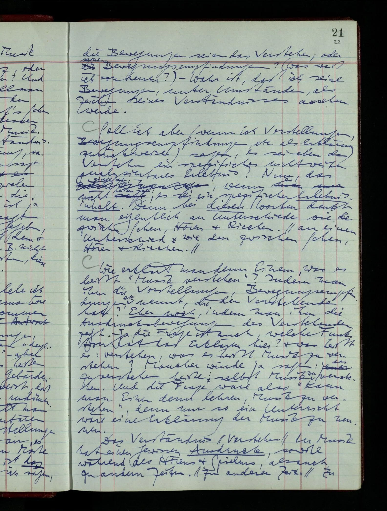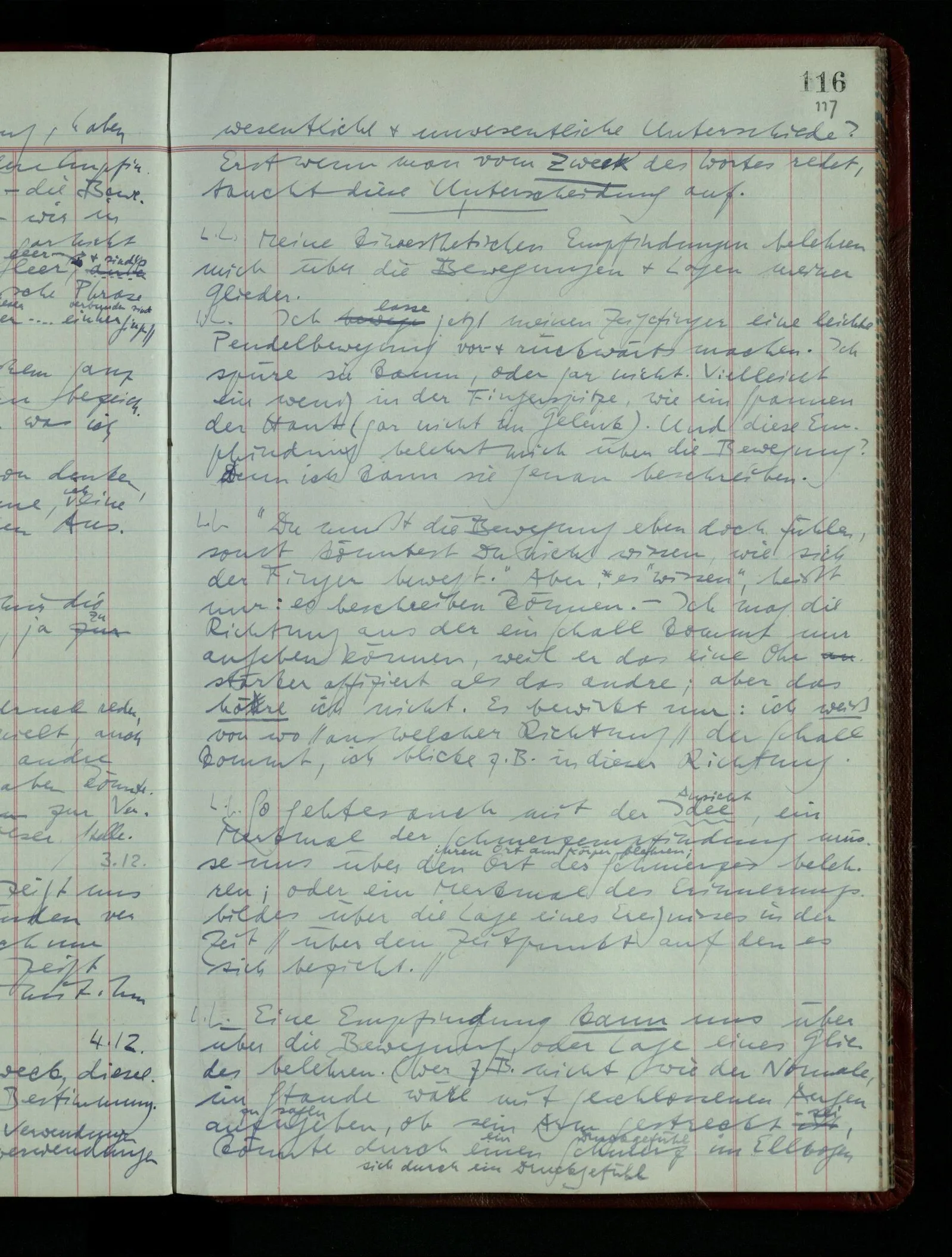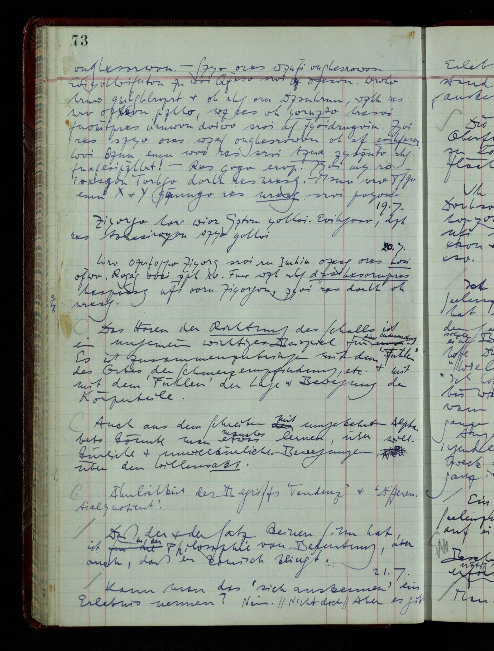 04.02.1948 Sinneseindrücke. Sie scheinen ihrer Natur nach ähnlich. Was meinen wir damit? “Kann es denn Unähnlicheres geben als einen Ton & eine Farbe?” möchte man fragen. Aber auch hier macht man einen seltsamen Fehler. Denn was ist die Funktion dieser Aussage? Wem macht man diese Mitteilung? Vielleicht Einem, dem unsre Sprache & dessen Sprache uns fremd ist, & dem wir ein großes Mißverständnis erklären wollen. Es handelt sich also um eine Erklärung einer Bedeutung.