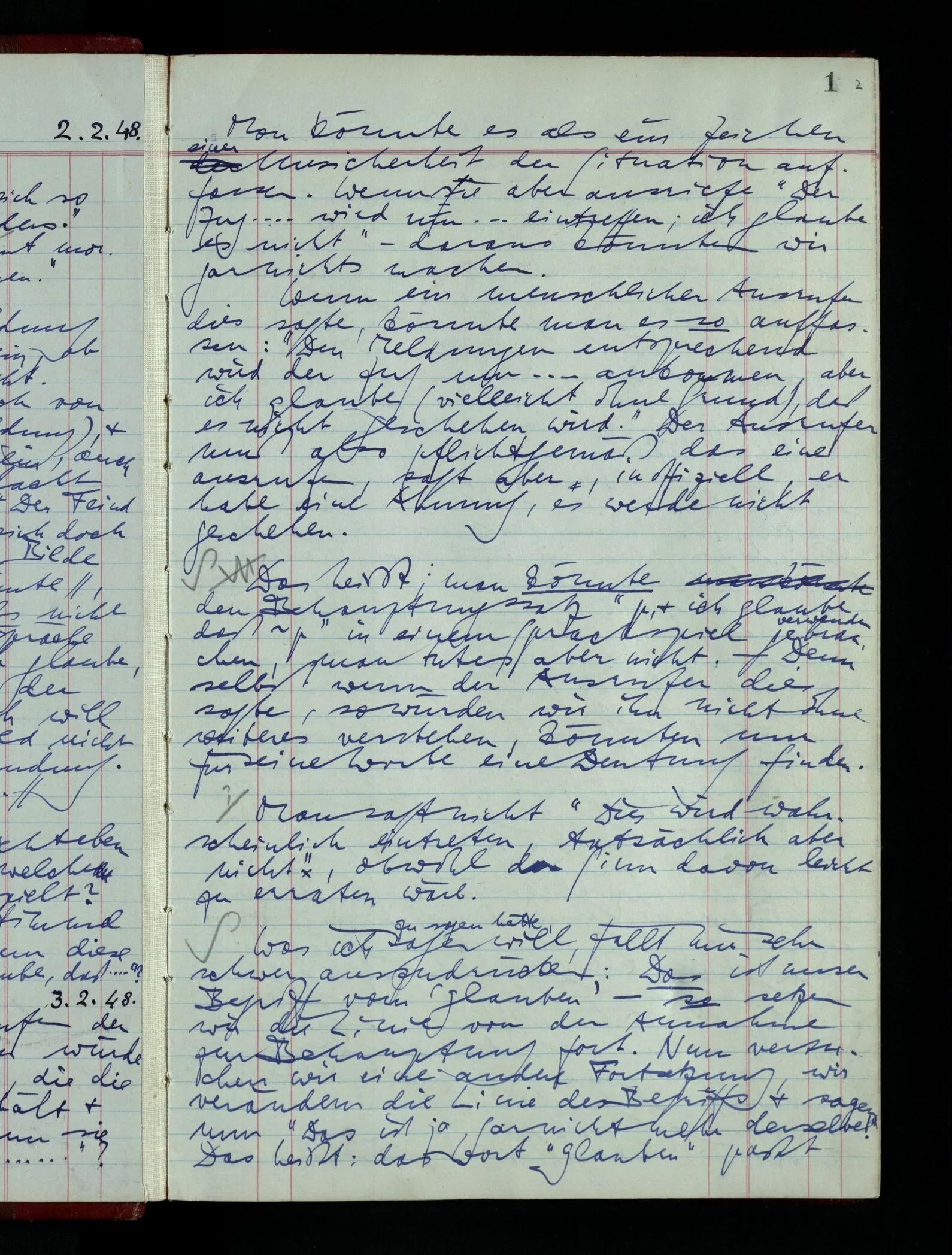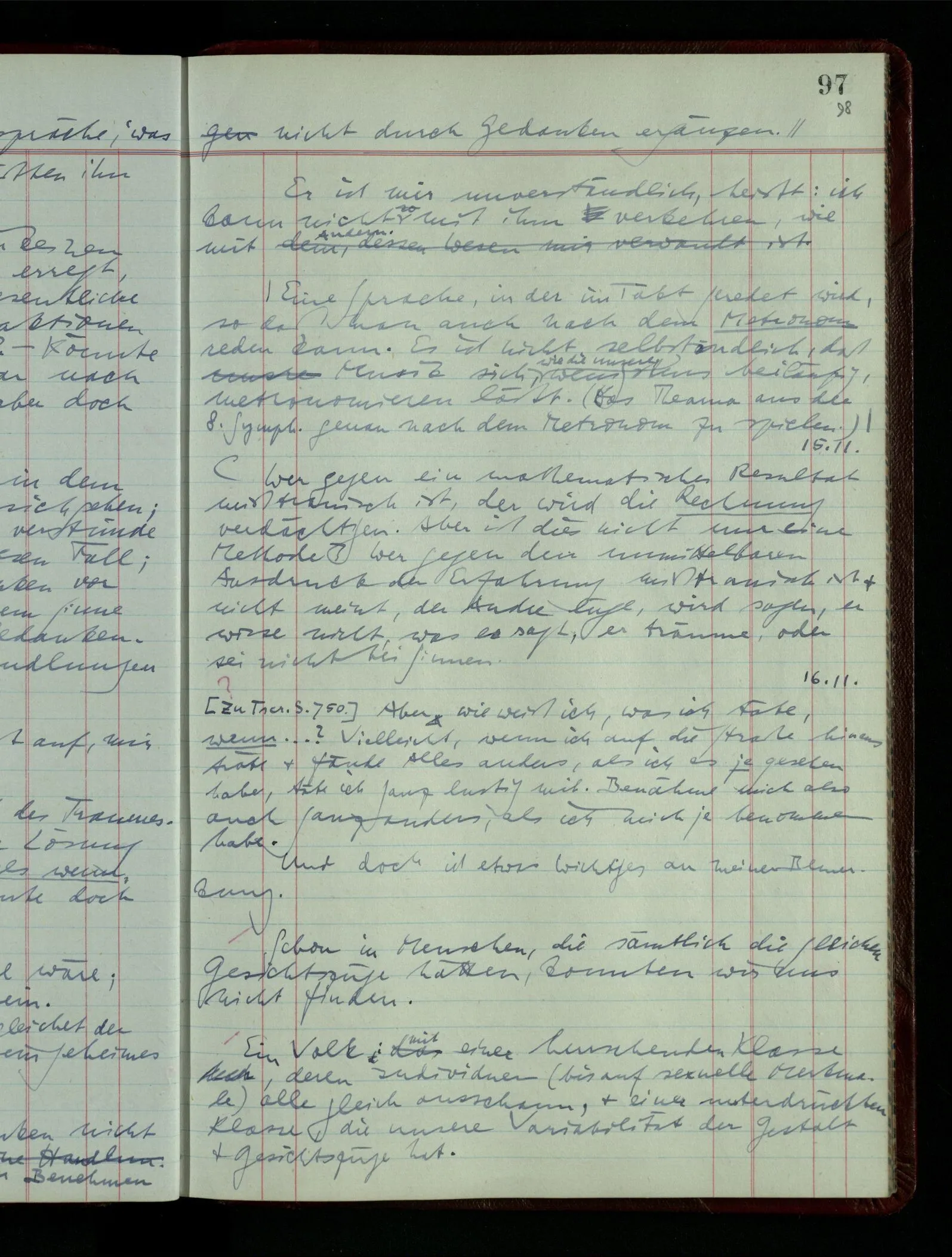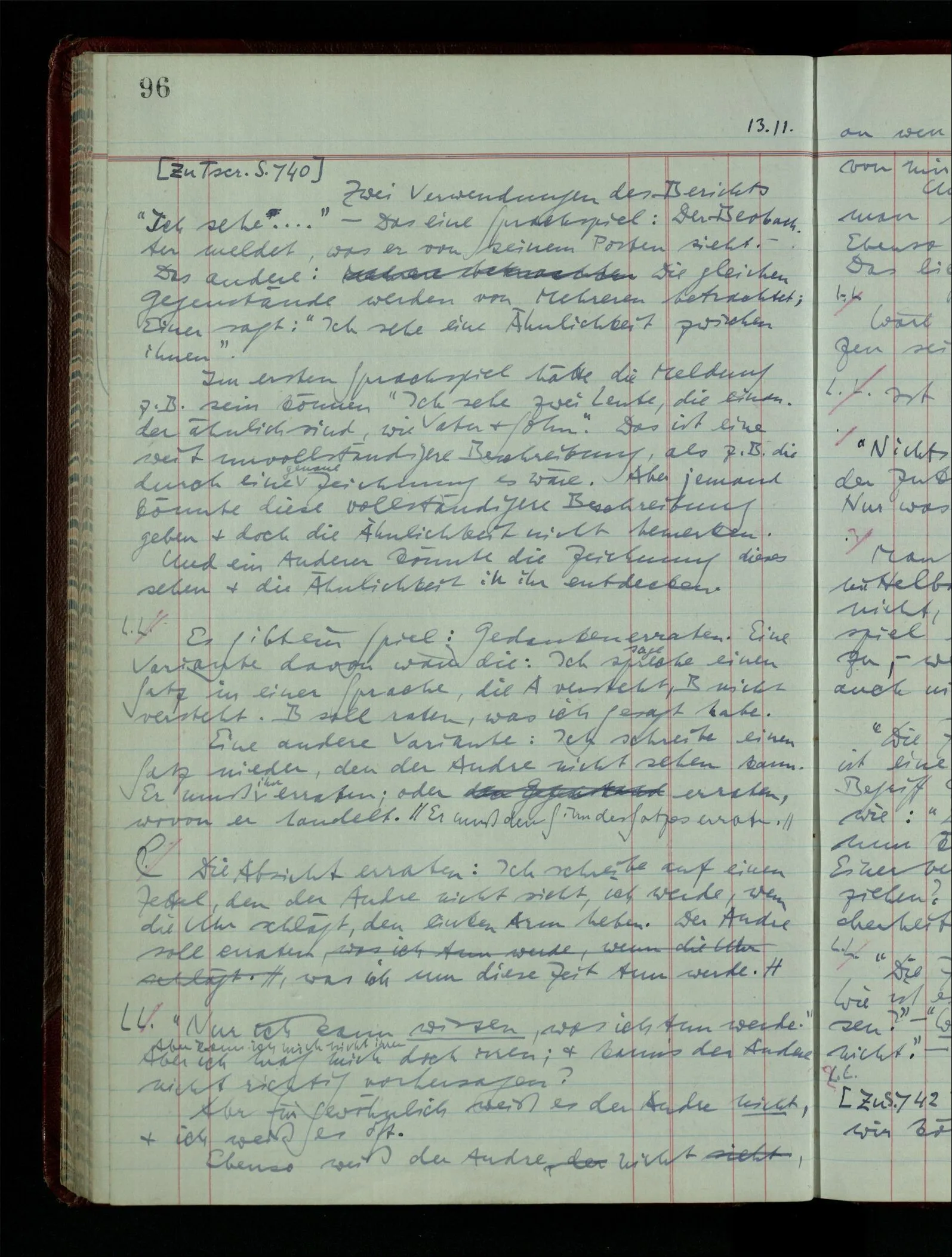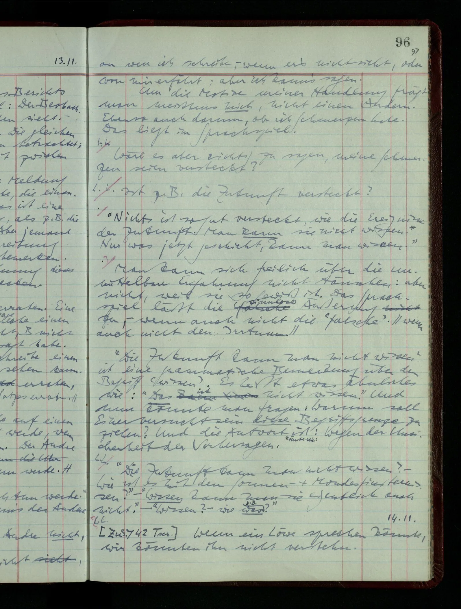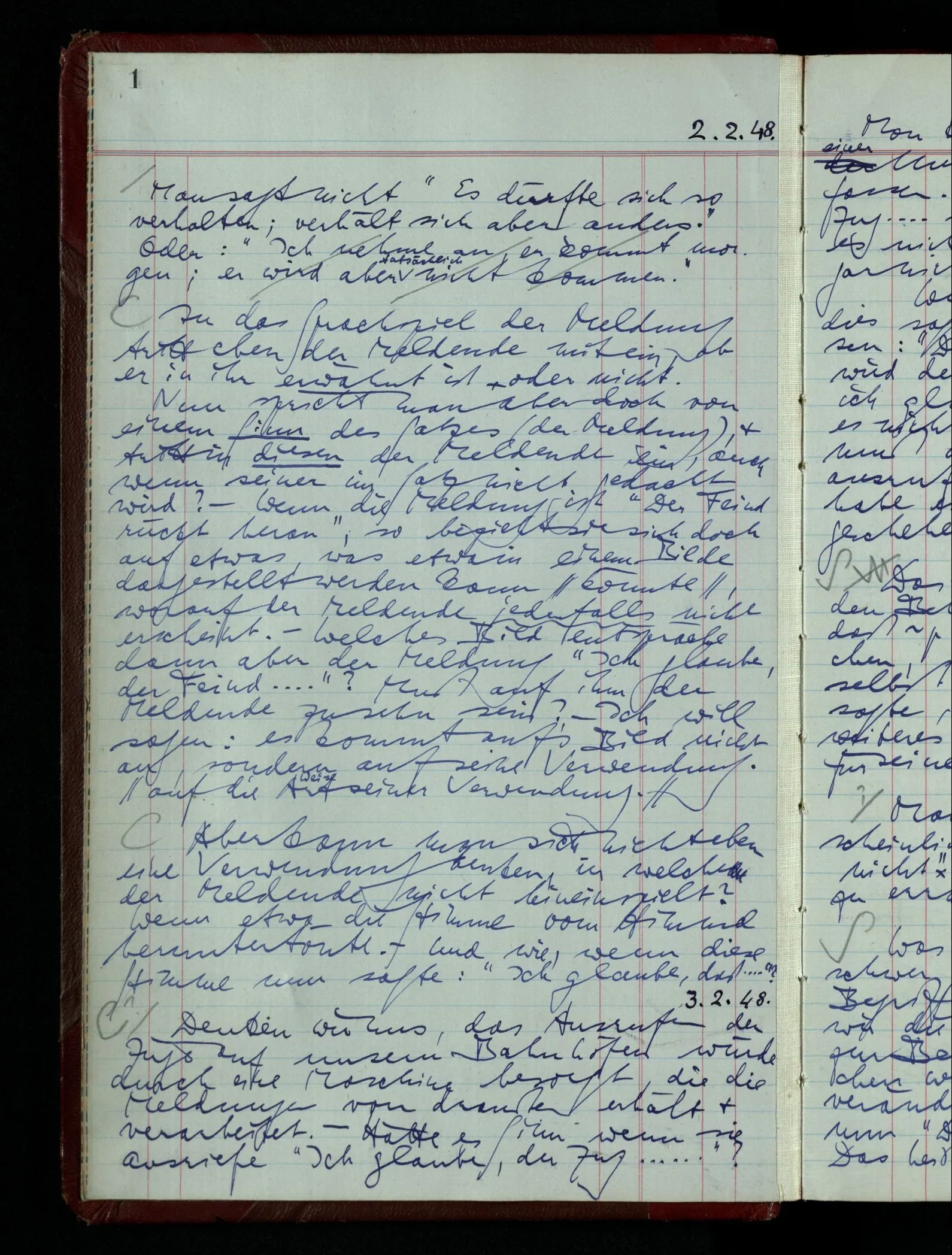 03.02.1948 Denken wir uns, das Ausrufen der Züge auf unsern Bahnhöfen würde durch eine Maschine besorgt, die die Meldungen von draußen erhält & verarbeitet. – Hätte es Sinn wenn sie ausriefe “Ich glaube, der Zug ‥‥‥”? Man könnte es als ein Zeichen einer Unsicherheit der Situation auffassen. Wenn sie aber ausriefe “Der Zug ‥․ wird nun … eintreffen; ich glaube es nicht” – daraus könnten wir gar nichts machen. Wenn ein menschlicher Ausrufer dies sagte, könnte man es so auffassen: “Den Meldungen entsprechend wird der Zug um ‥‥ ankommen, aber ich glaube (vielleicht ohne Grund), daß es nicht geschehen wird.” Der Ausrufer muß also pflichtgemäß das eine ausrufen, sagt aber, inoffiziell, er habe eine Ahnung, es werde nicht geschehen.