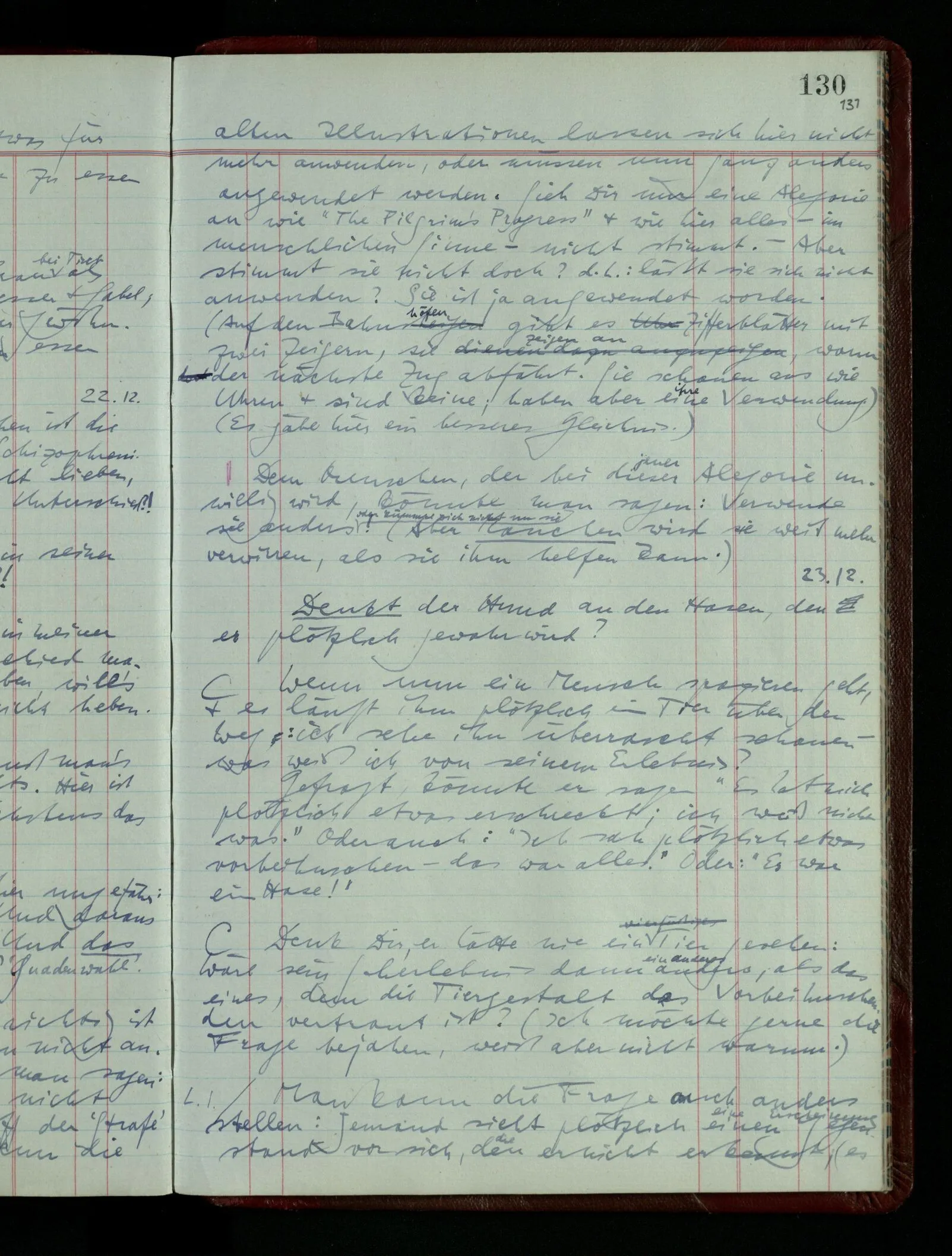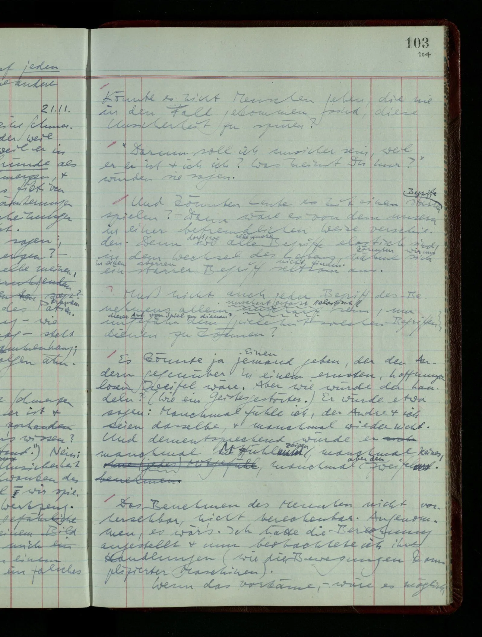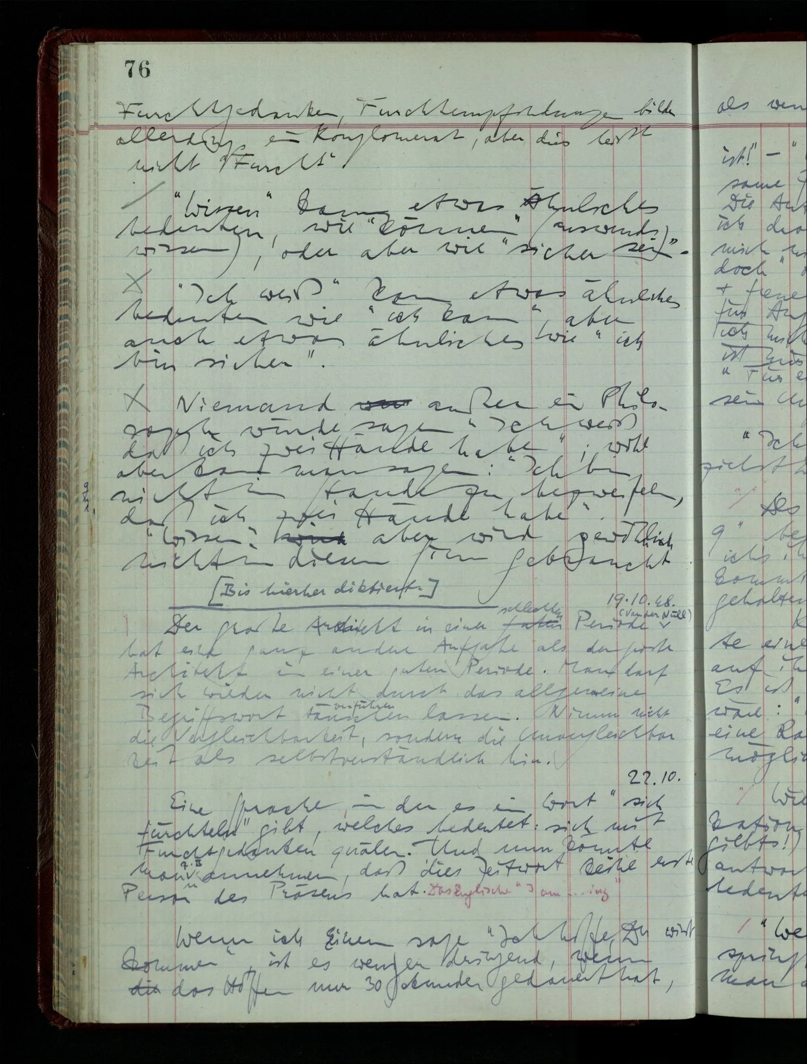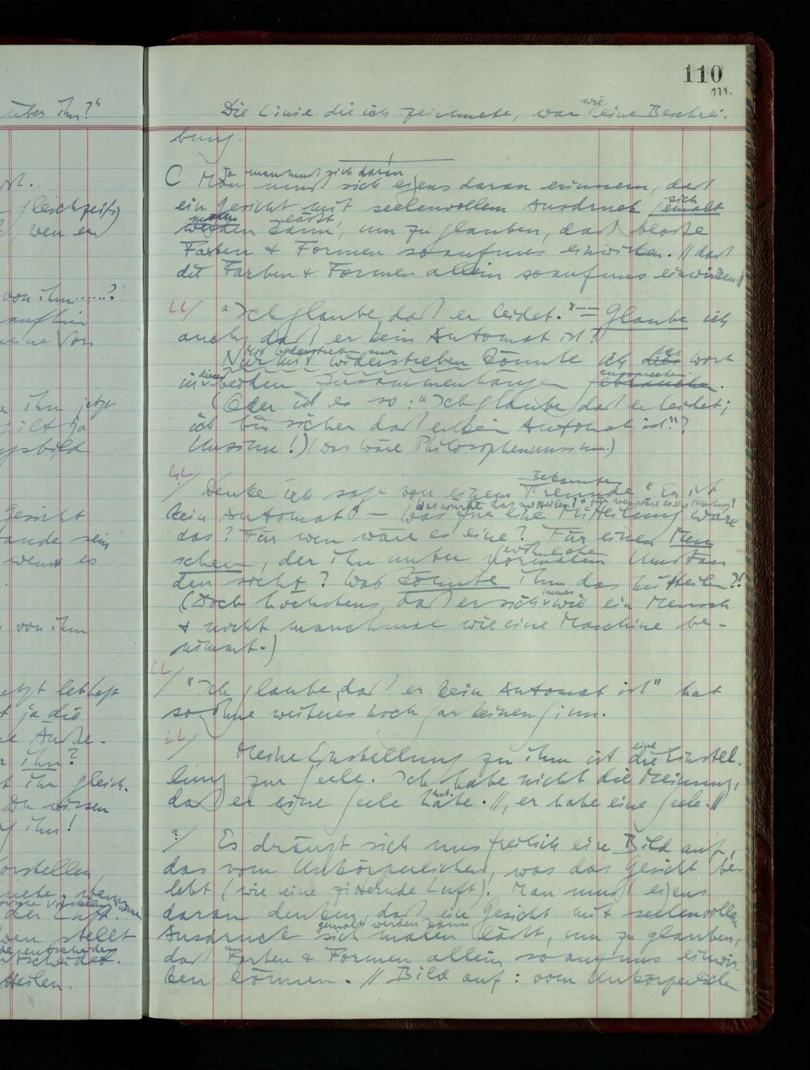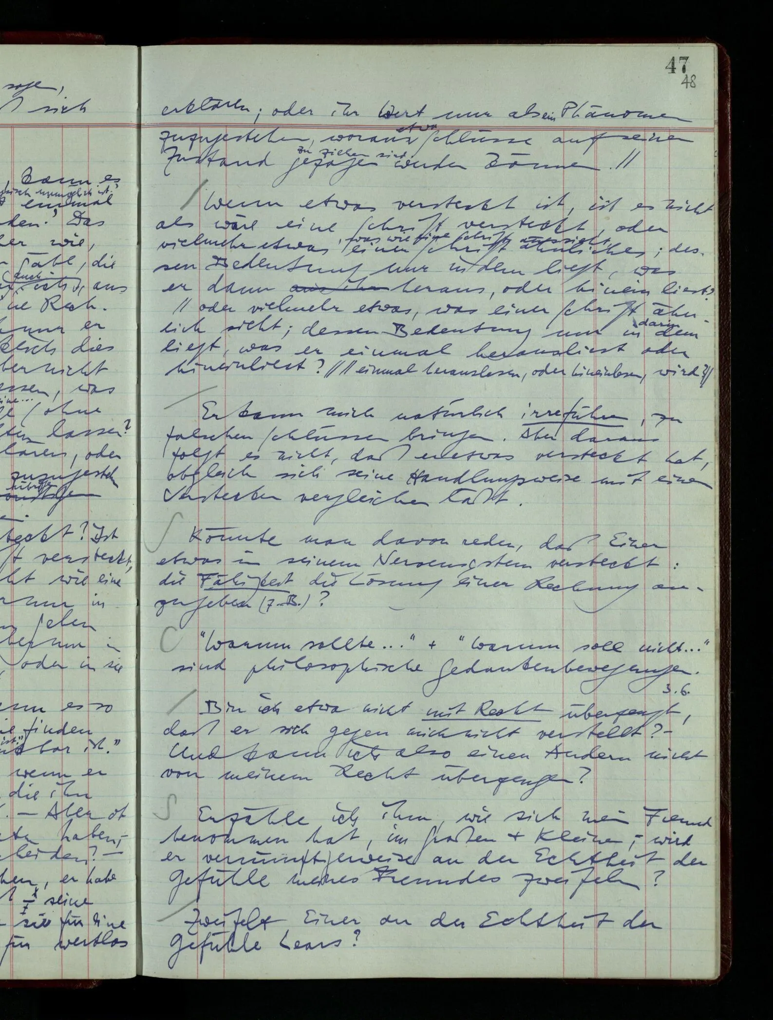 03.02.1948 Denken wir uns, das Ausrufen der Züge auf unsern Bahnhöfen würde durch eine Maschine besorgt, die die Meldungen von draußen erhält & verarbeitet. – Hätte es Sinn wenn sie ausriefe “Ich glaube, der Zug ‥‥‥”? Man könnte es als ein Zeichen einer Unsicherheit der Situation auffassen. Wenn sie aber ausriefe “Der Zug ‥․ wird nun … eintreffen; ich glaube es nicht” – daraus könnten wir gar nichts machen. Wenn ein menschlicher Ausrufer dies sagte, könnte man es so auffassen: “Den Meldungen entsprechend wird der Zug um ‥‥ ankommen, aber ich glaube (vielleicht ohne Grund), daß es nicht geschehen wird.” Der Ausrufer muß also pflichtgemäß das eine ausrufen, sagt aber, inoffiziell, er habe eine Ahnung, es werde nicht geschehen.