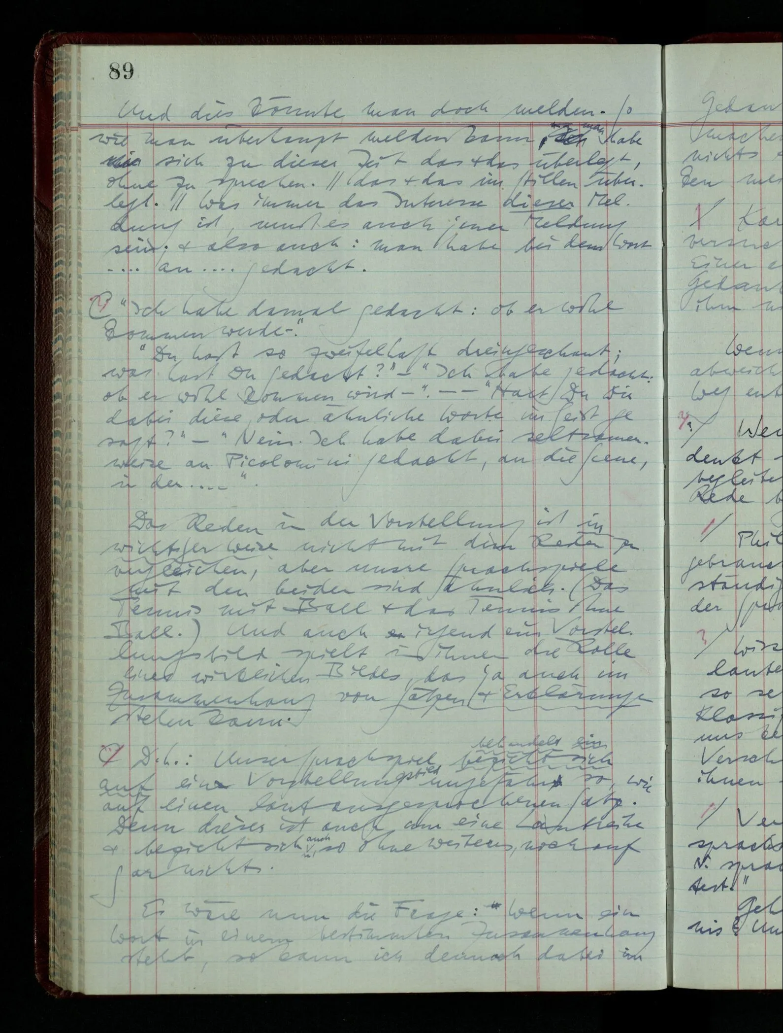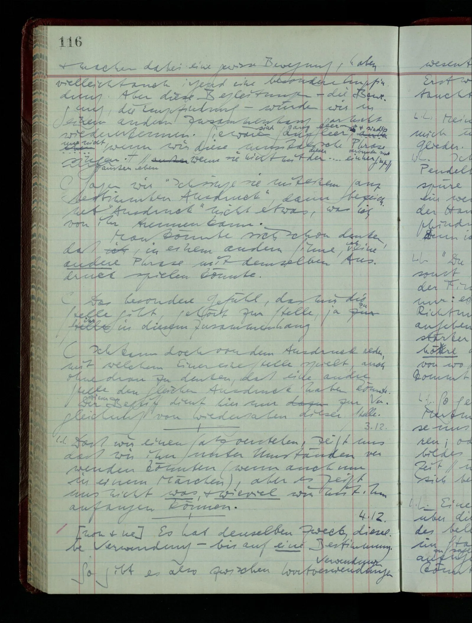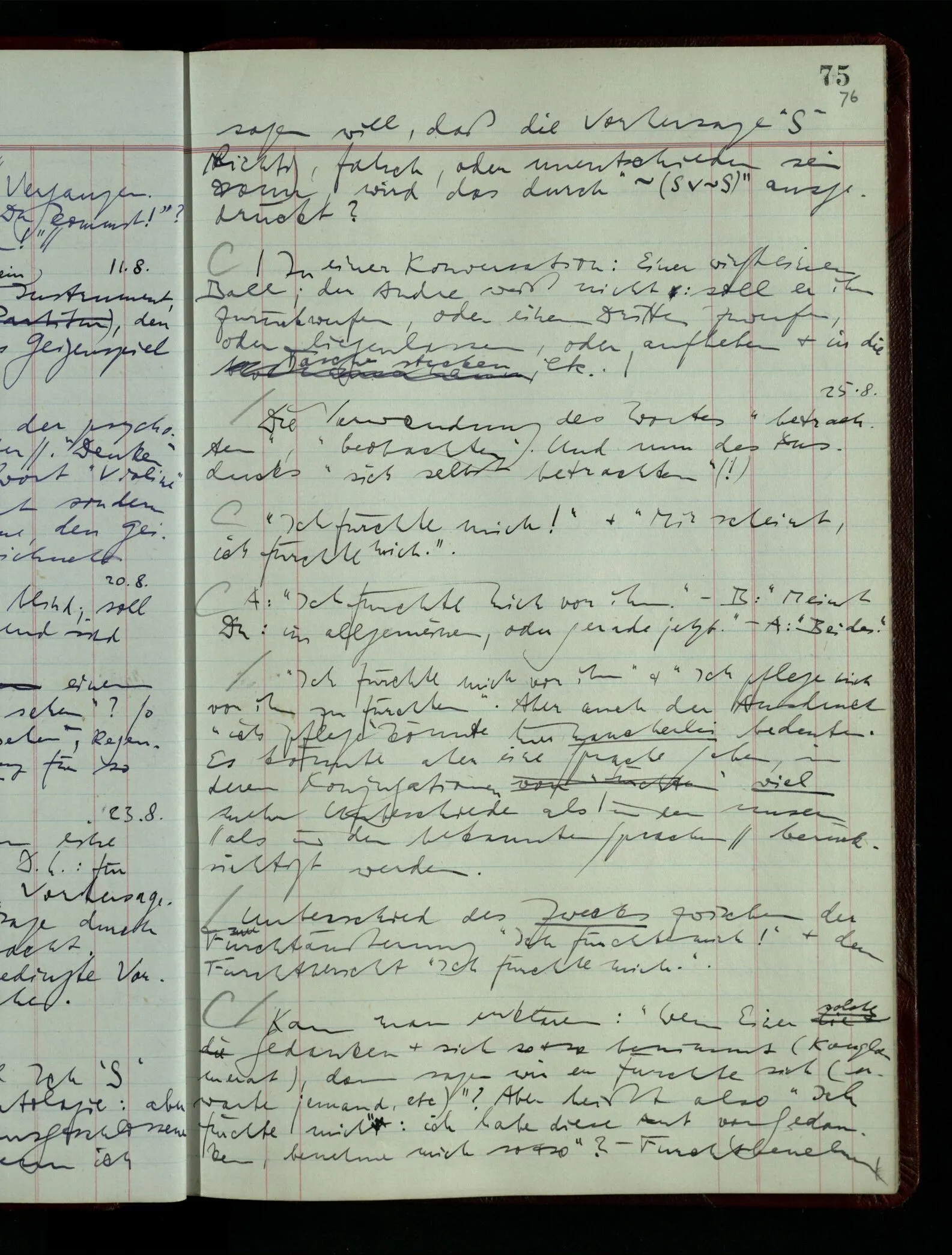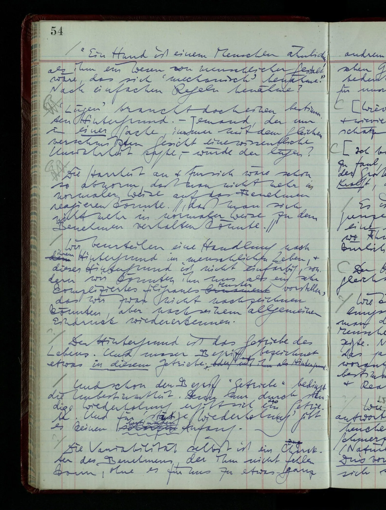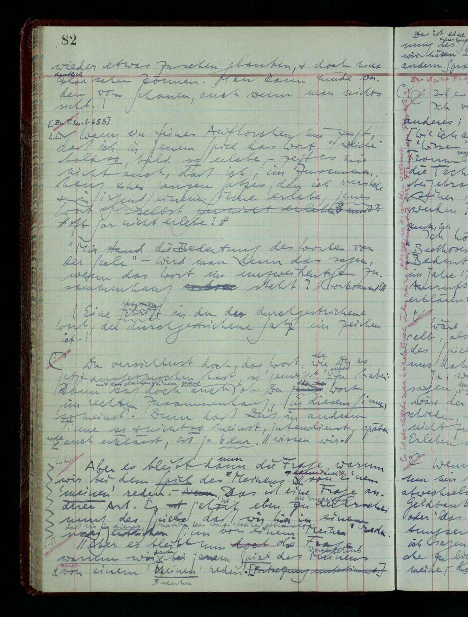 03.02.1948 Denken wir uns, das Ausrufen der Züge auf unsern Bahnhöfen würde durch eine Maschine besorgt, die die Meldungen von draußen erhält & verarbeitet. – Hätte es Sinn wenn sie ausriefe “Ich glaube, der Zug ‥‥‥”? Man könnte es als ein Zeichen einer Unsicherheit der Situation auffassen. Wenn sie aber ausriefe “Der Zug ‥․ wird nun … eintreffen; ich glaube es nicht” – daraus könnten wir gar nichts machen. Wenn ein menschlicher Ausrufer dies sagte, könnte man es so auffassen: “Den Meldungen entsprechend wird der Zug um ‥‥ ankommen, aber ich glaube (vielleicht ohne Grund), daß es nicht geschehen wird.” Der Ausrufer muß also pflichtgemäß das eine ausrufen, sagt aber, inoffiziell, er habe eine Ahnung, es werde nicht geschehen.