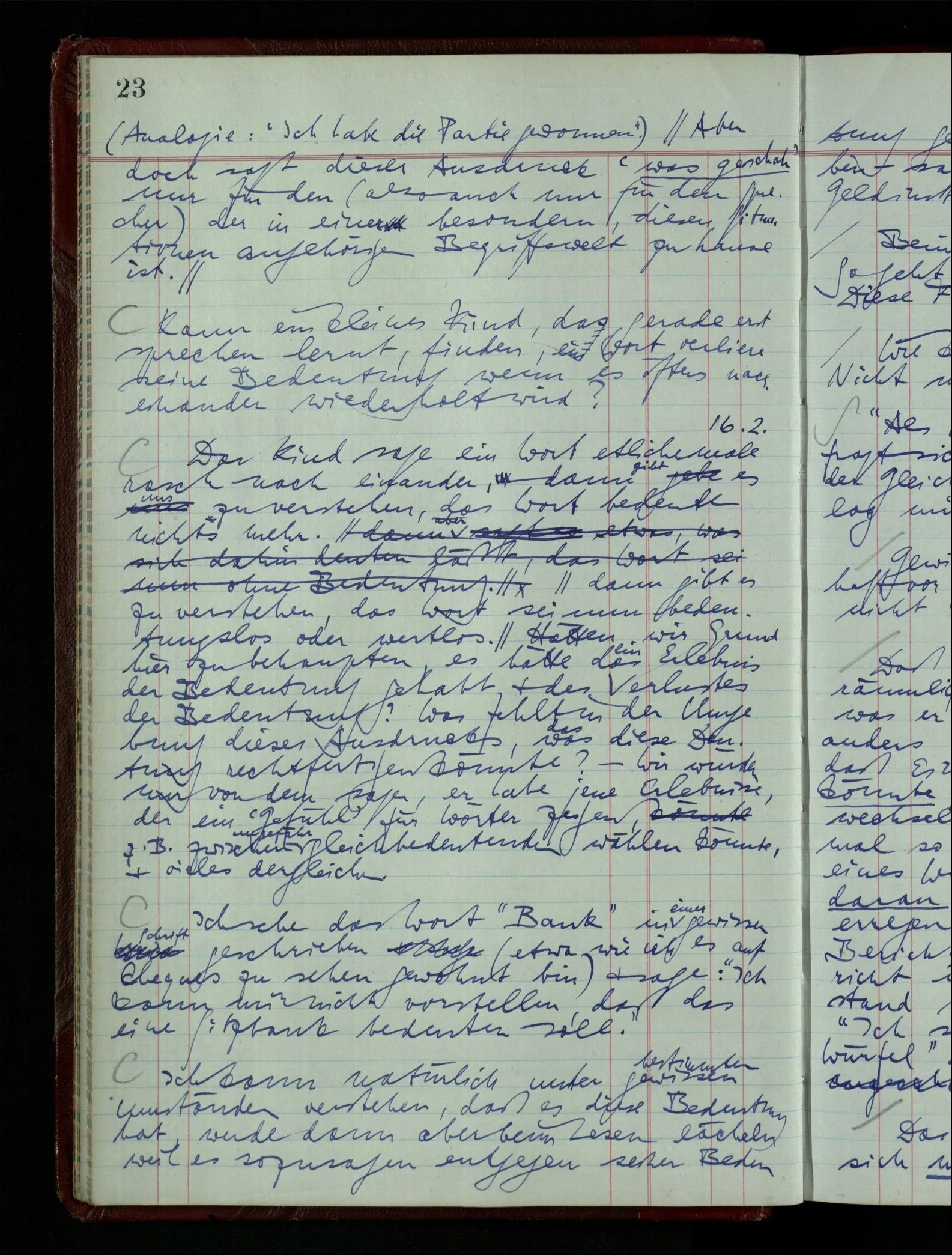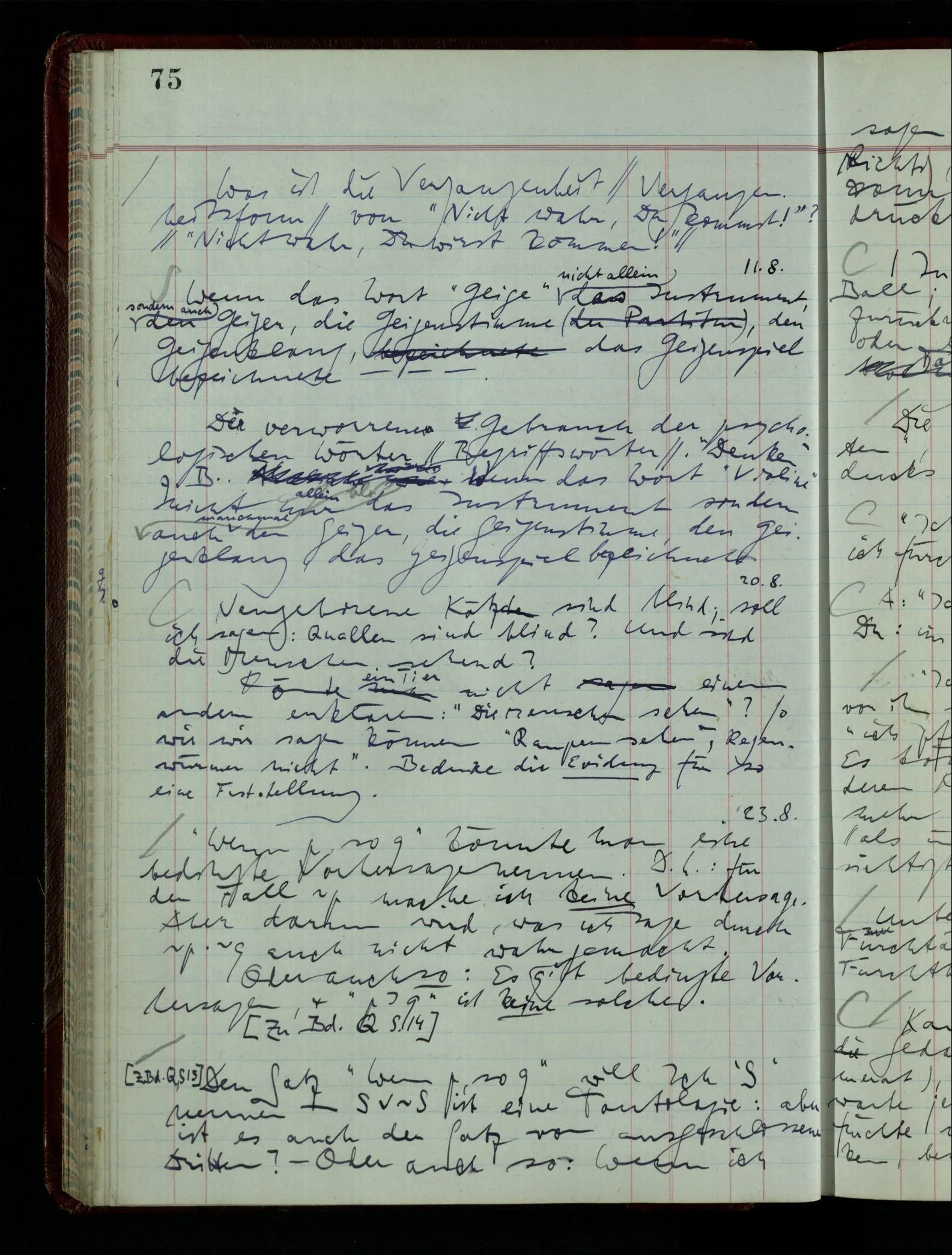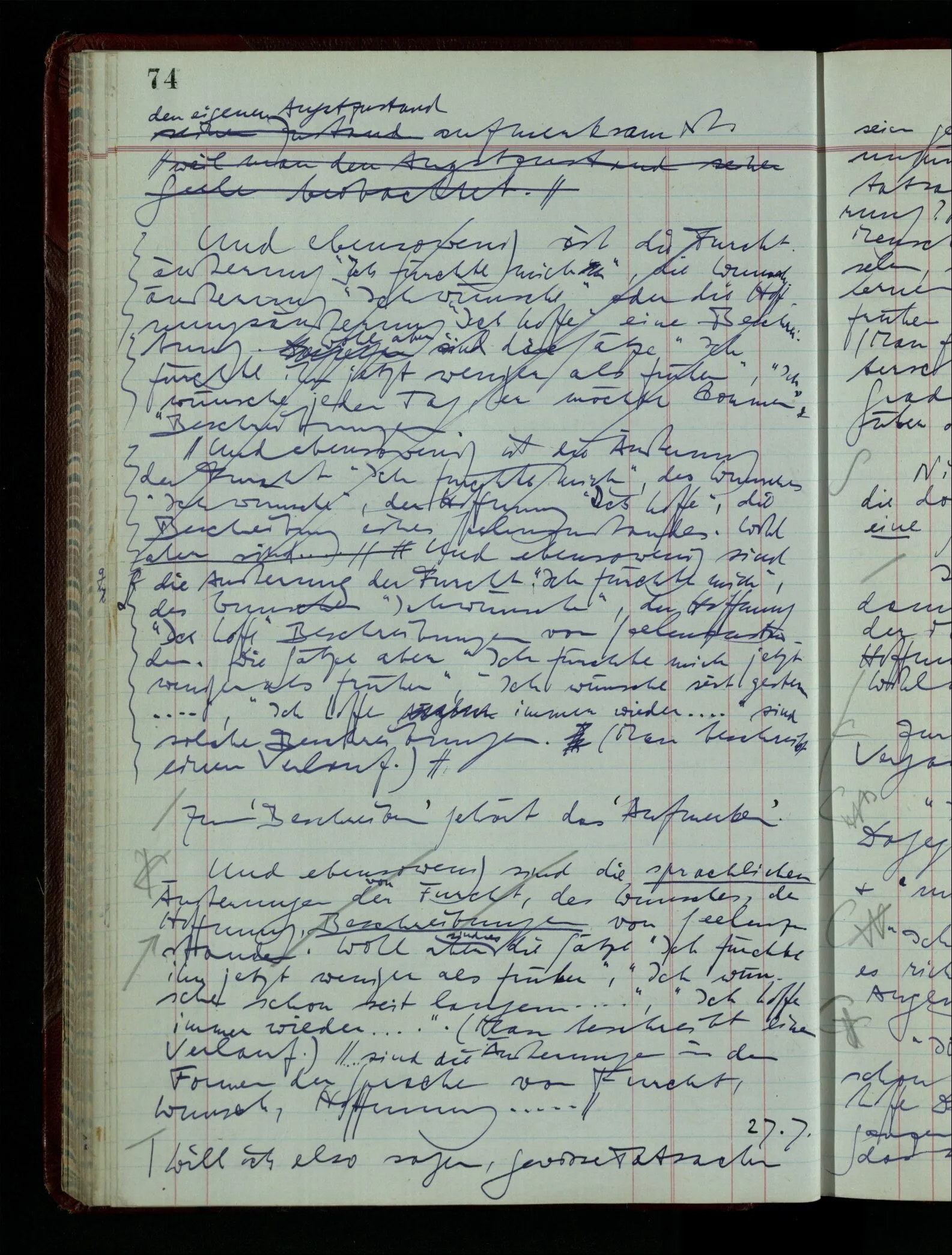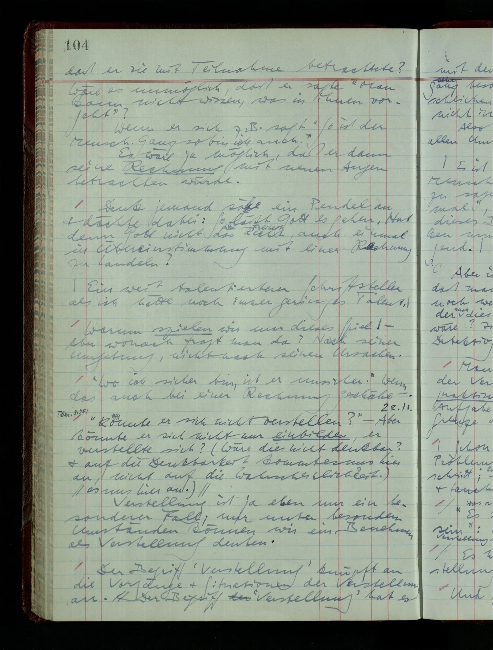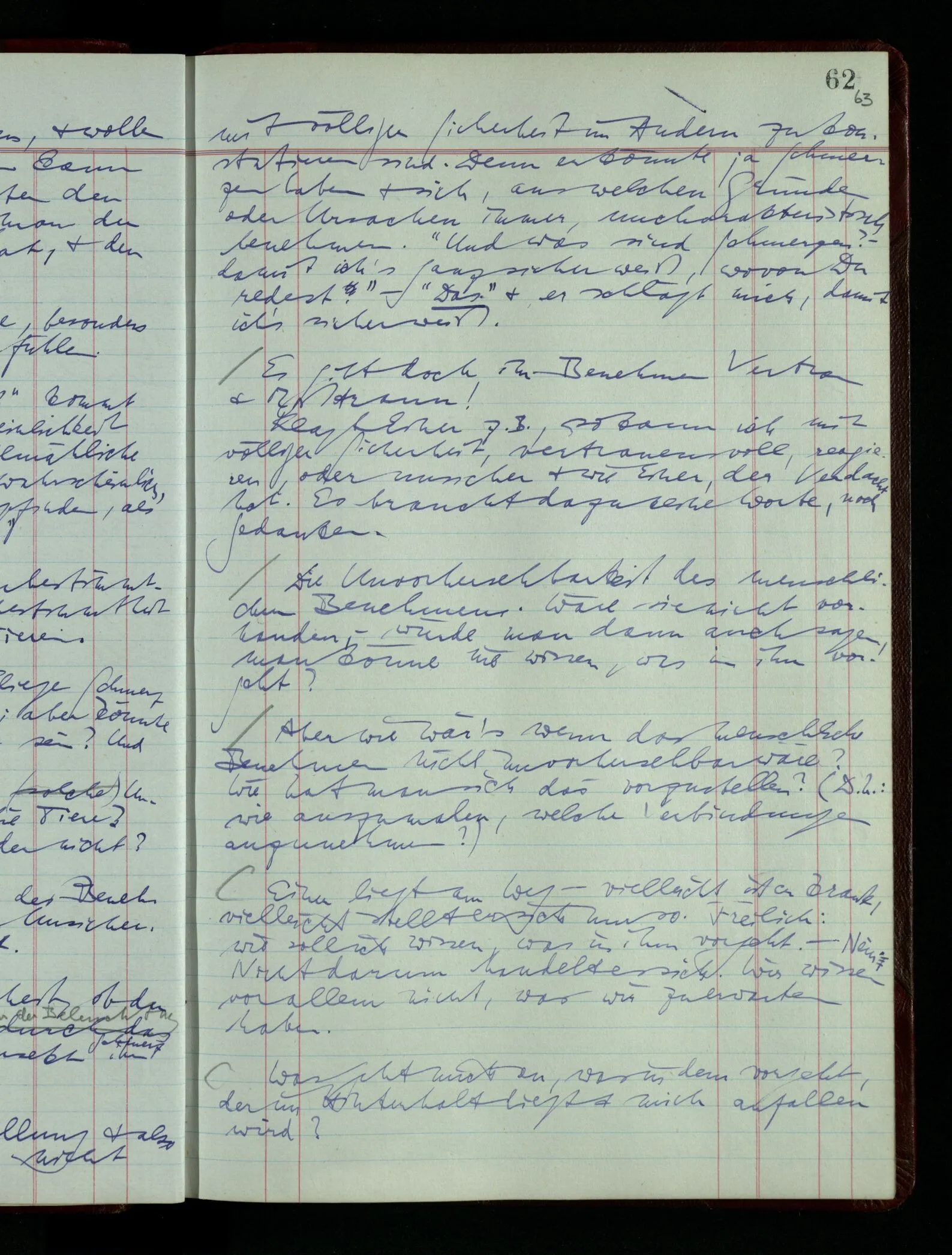03.02.1948 Denken wir uns, das Ausrufen der Züge auf unsern Bahnhöfen würde durch eine Maschine besorgt, die die Meldungen von draußen erhält & verarbeitet. – Hätte es Sinn wenn sie ausriefe “Ich glaube, der Zug ‥‥‥”? Man könnte es als ein Zeichen einer Unsicherheit der Situation auffassen. Wenn sie aber ausriefe “Der Zug ‥․ wird nun … eintreffen; ich glaube es nicht” – daraus könnten wir gar nichts machen. Wenn ein menschlicher Ausrufer dies sagte, könnte man es so auffassen: “Den Meldungen entsprechend wird der Zug um ‥‥ ankommen, aber ich glaube (vielleicht ohne Grund), daß es nicht geschehen wird.” Der Ausrufer muß also pflichtgemäß das eine ausrufen, sagt aber, inoffiziell, er habe eine Ahnung, es werde nicht geschehen.