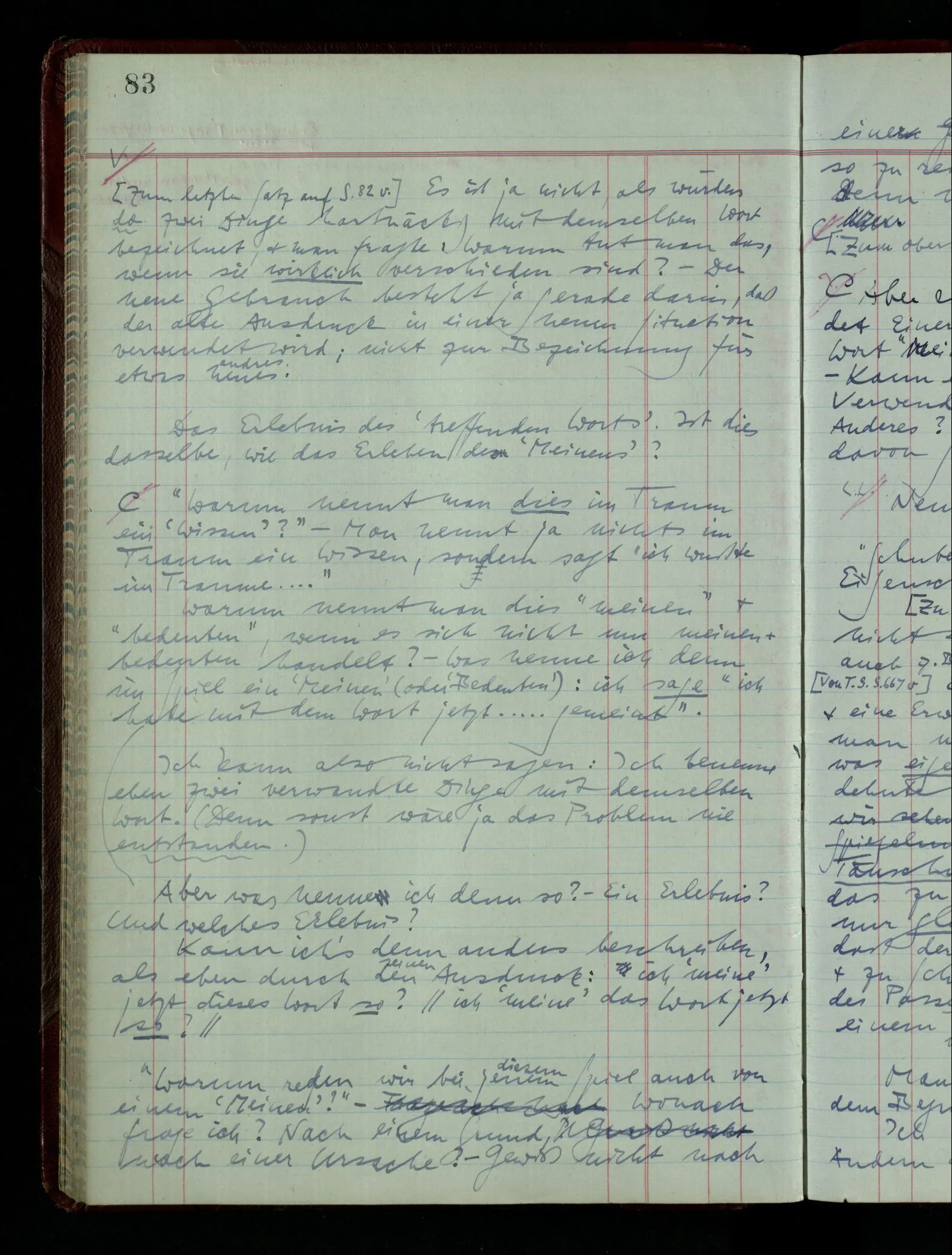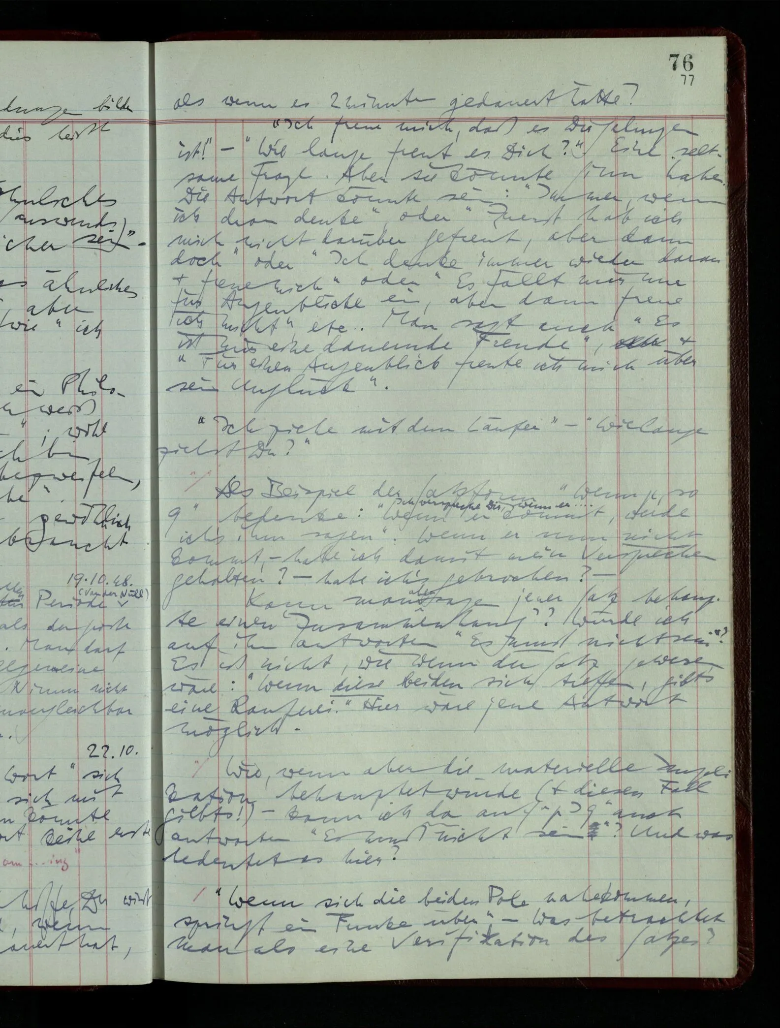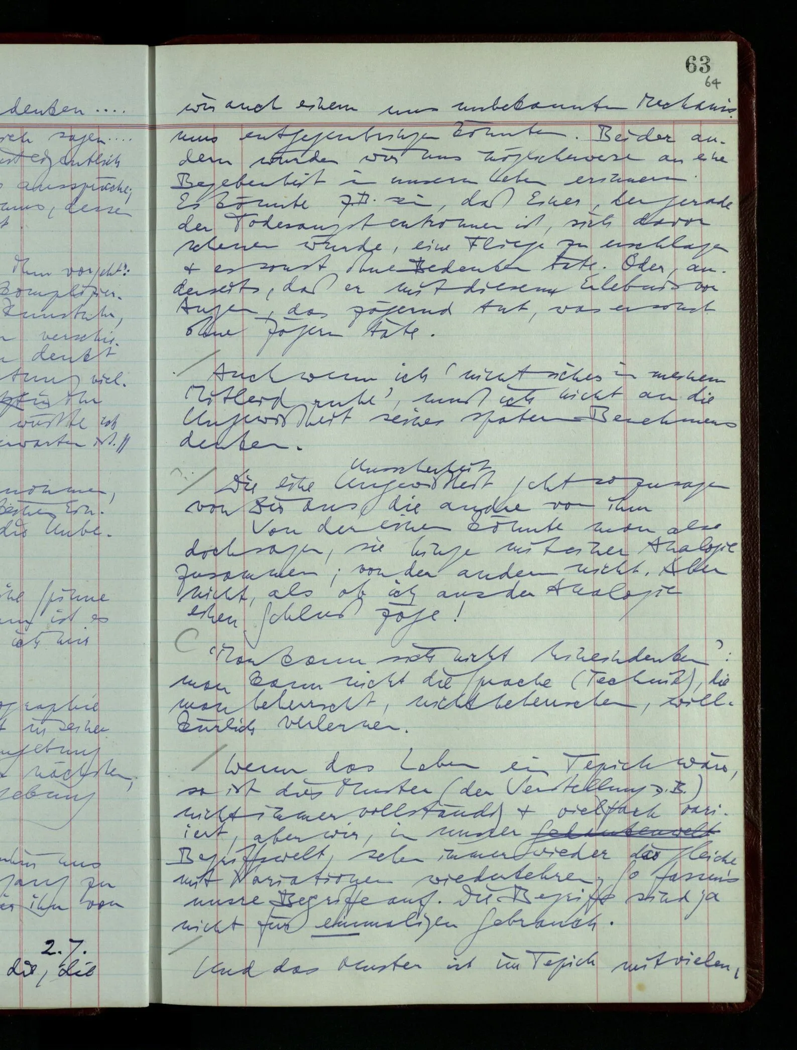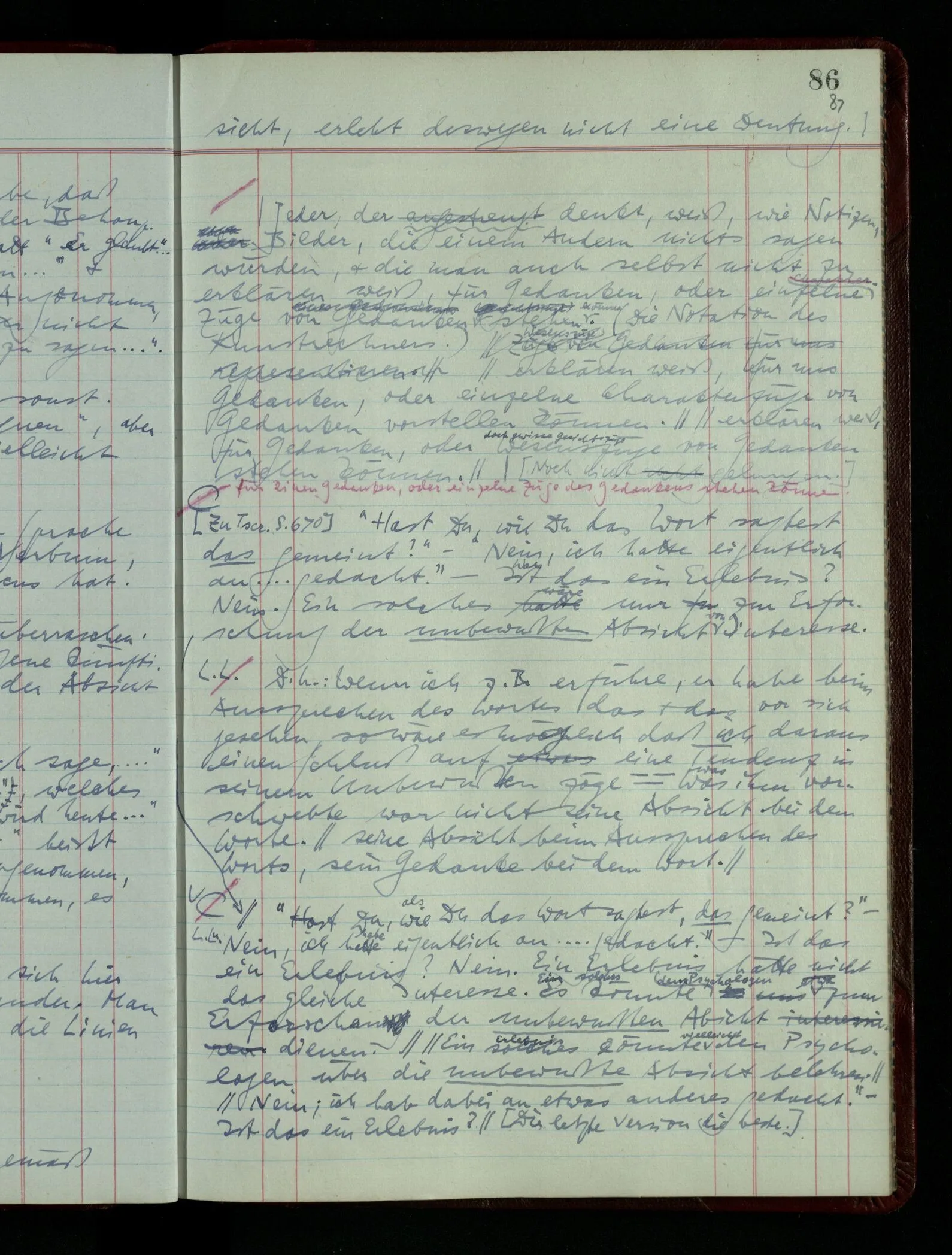 03.02.1948 Denken wir uns, das Ausrufen der Züge auf unsern Bahnhöfen würde durch eine Maschine besorgt, die die Meldungen von draußen erhält & verarbeitet. – Hätte es Sinn wenn sie ausriefe “Ich glaube, der Zug ‥‥‥”? Man könnte es als ein Zeichen einer Unsicherheit der Situation auffassen. Wenn sie aber ausriefe “Der Zug ‥․ wird nun … eintreffen; ich glaube es nicht” – daraus könnten wir gar nichts machen. Wenn ein menschlicher Ausrufer dies sagte, könnte man es so auffassen: “Den Meldungen entsprechend wird der Zug um ‥‥ ankommen, aber ich glaube (vielleicht ohne Grund), daß es nicht geschehen wird.” Der Ausrufer muß also pflichtgemäß das eine ausrufen, sagt aber, inoffiziell, er habe eine Ahnung, es werde nicht geschehen.